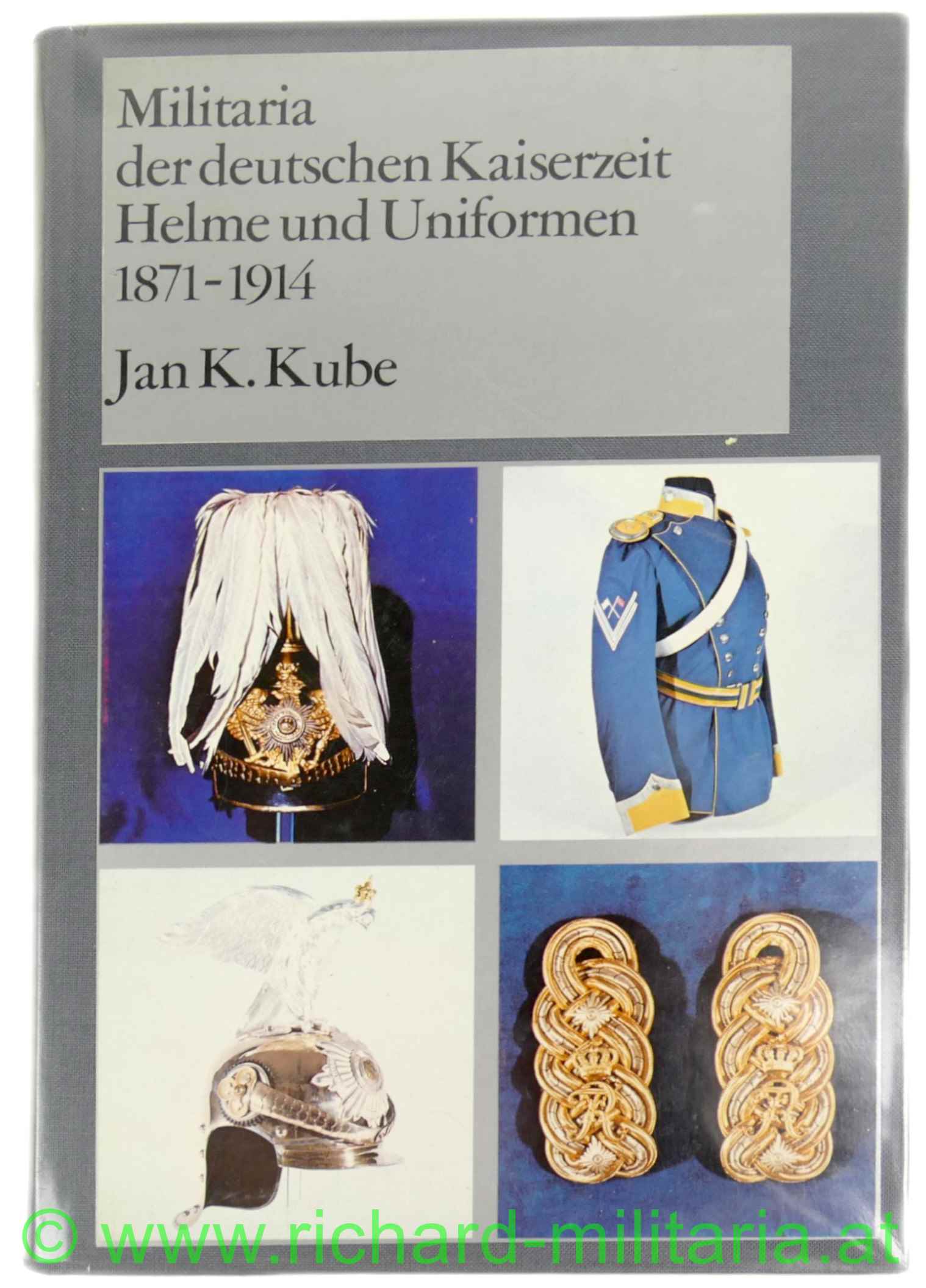 Militaria der deutschen Kaiserzeit - Helme u. Uniformen 1871-1914 - Buch von Jan Kube, 1. Auflage, ISBN: 3-87405-101-3; München 1977, vollständig mit Schutzumschlag; mit Klarsichtfolie eingebunden;