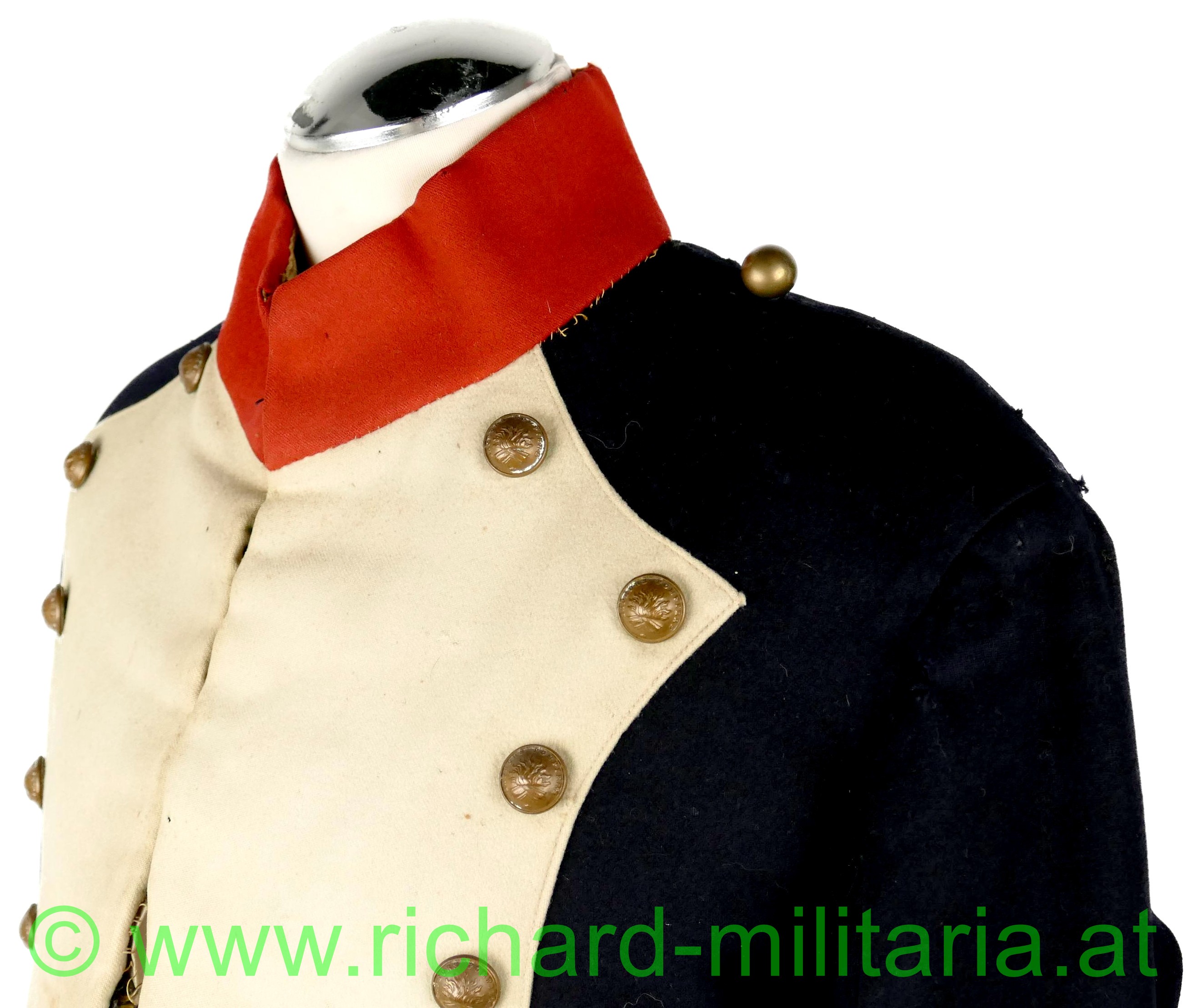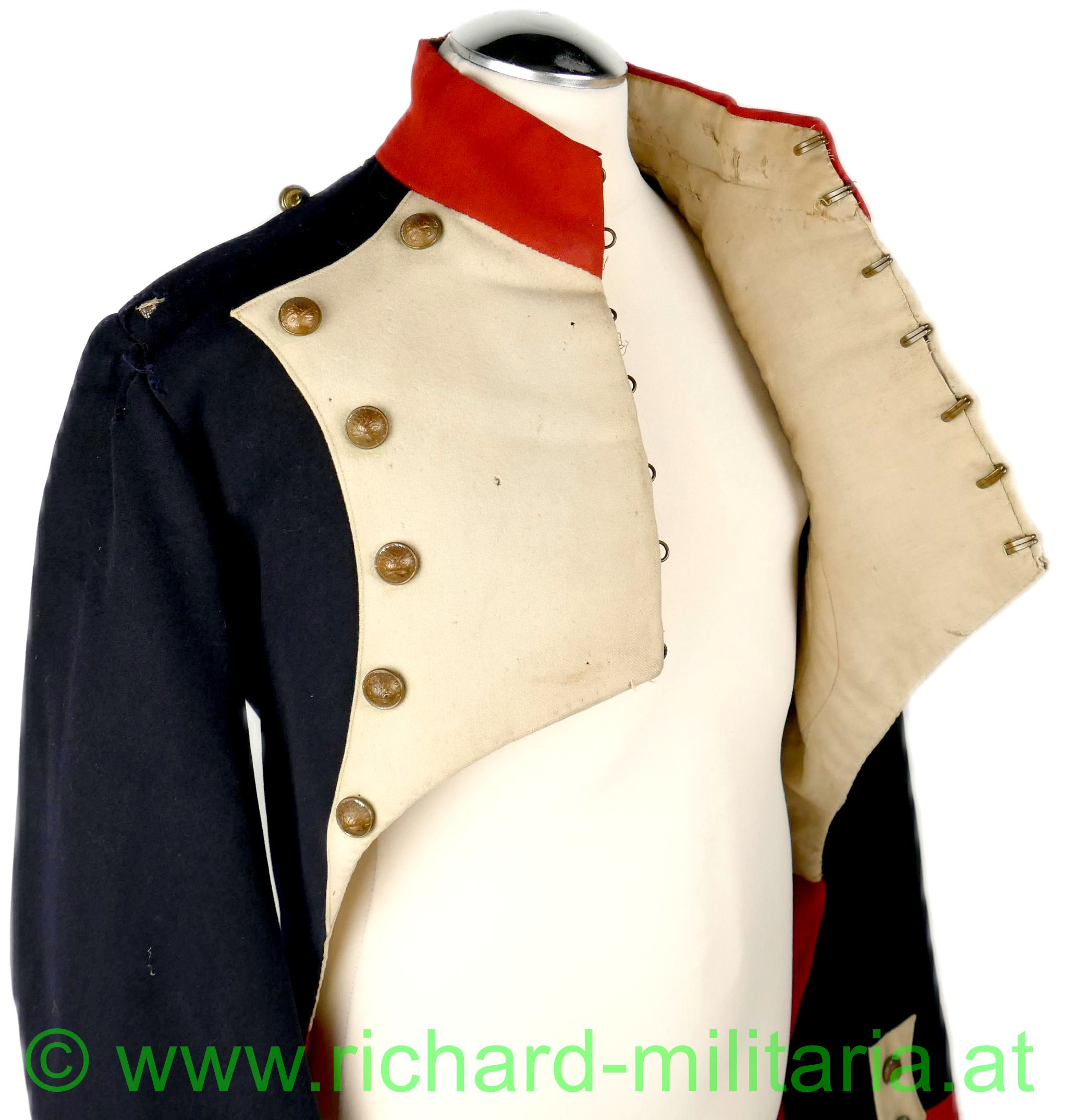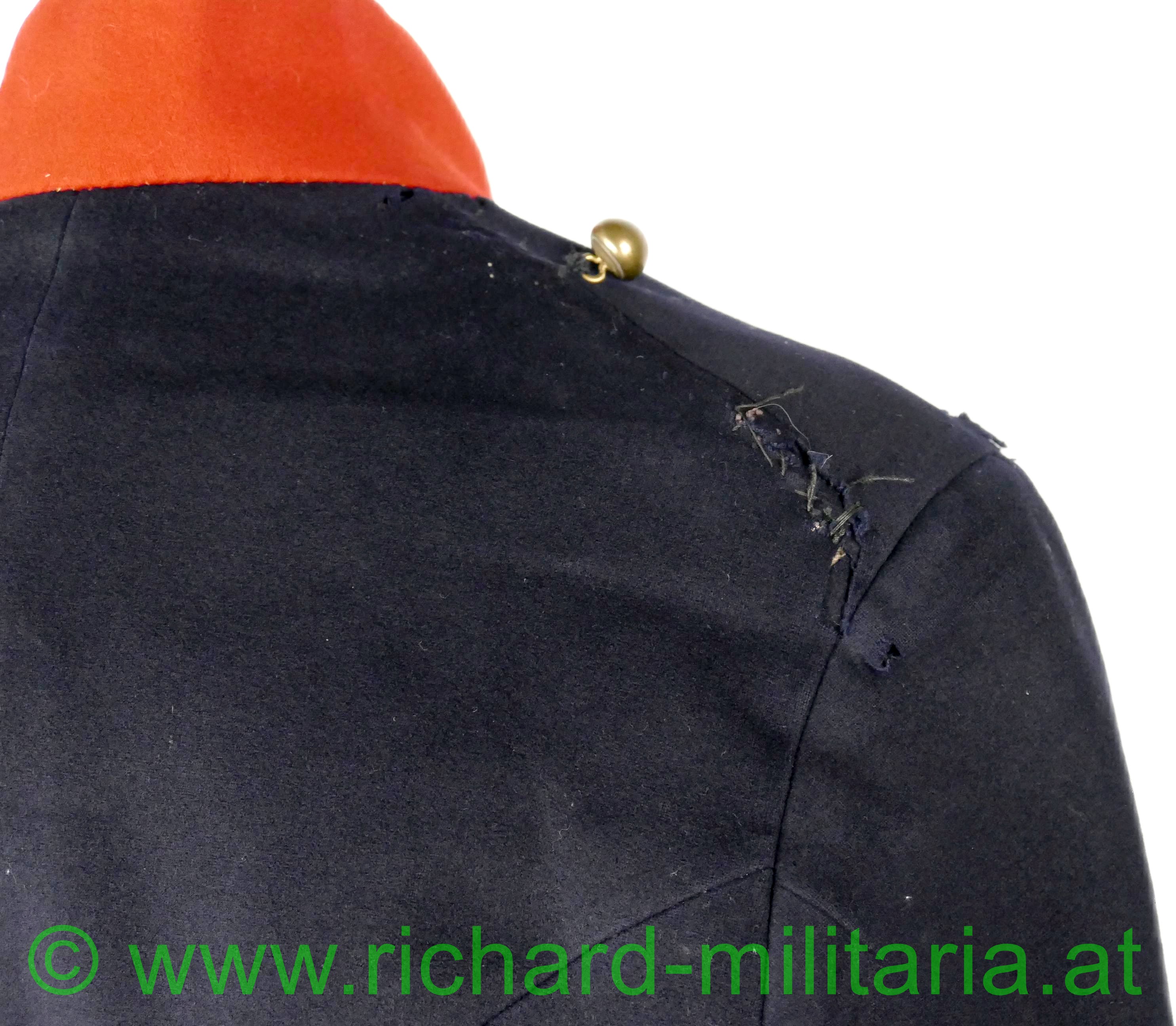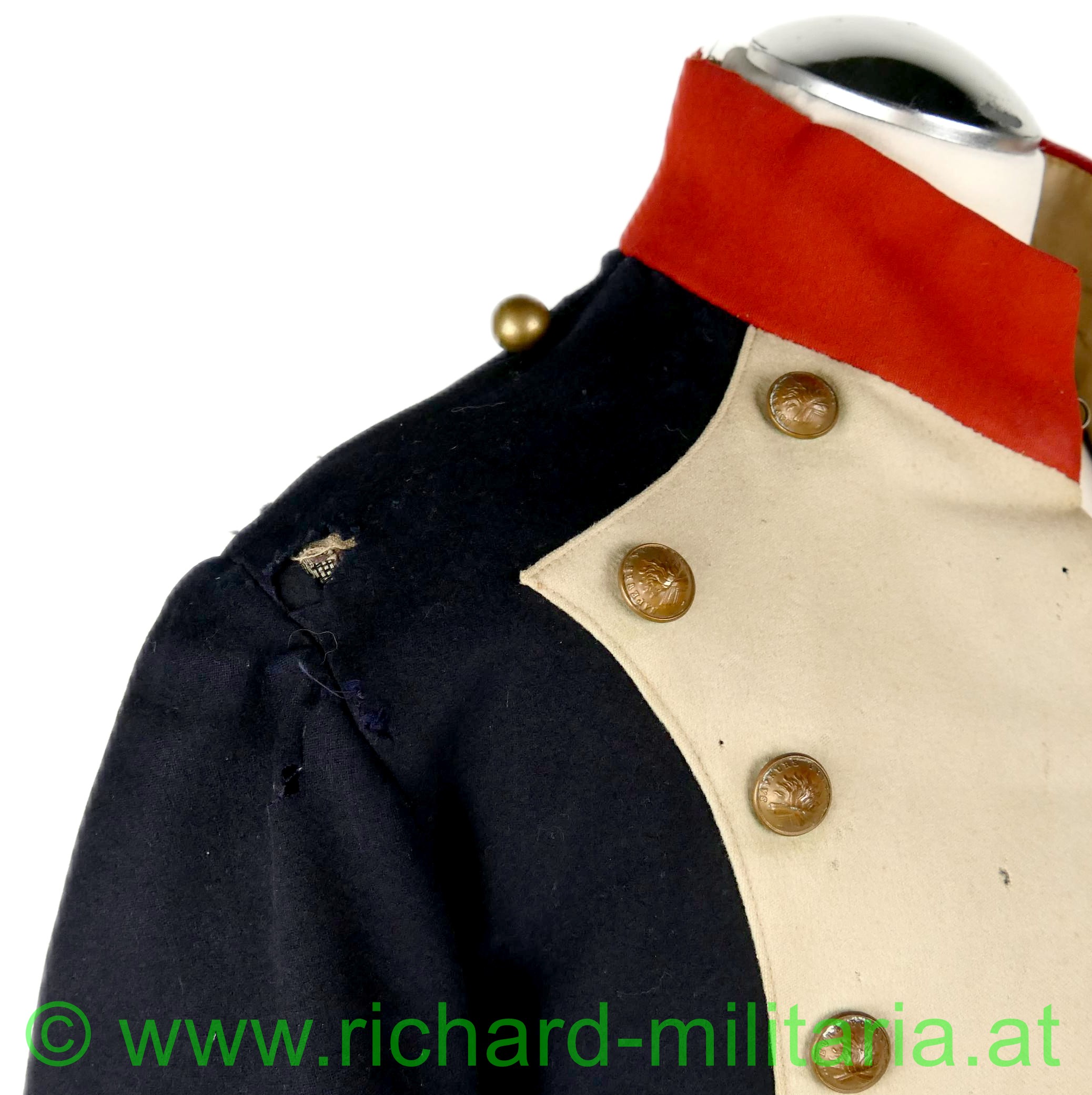 Napoleonischer Frack eines Pioniers "Sapeurs Pompiers"; aus blauem und roten Stoff; im Brustbereich sowie an den Ärmeln beiger Stoff mit bronzierten Knöpfen aus Tombak; Knöpfe mit der Aufschrift "Sapeurs Pompiers; innen mit beigem Stoff ausgelegt; beide Schwalbenschwänze mit je 3 Knöpfen besetzt; an den Ansätzen je ein Knopf; auf den Schultern je ein halbrunder Knopf; Frack außen mit einigen ausgebesserten Stellen sowie kleineren Löchern; auf der Innenseite tragebedingte Aufrauungen;