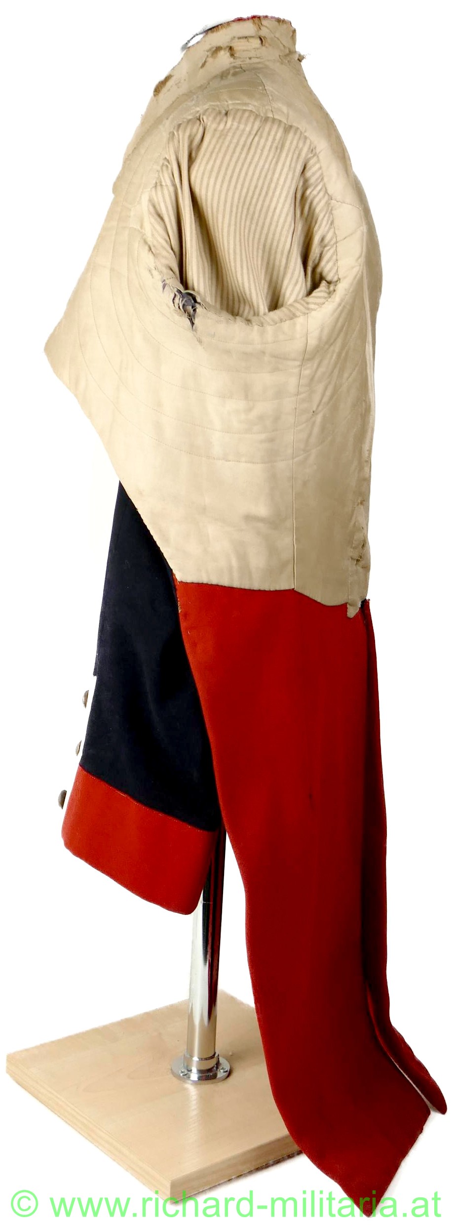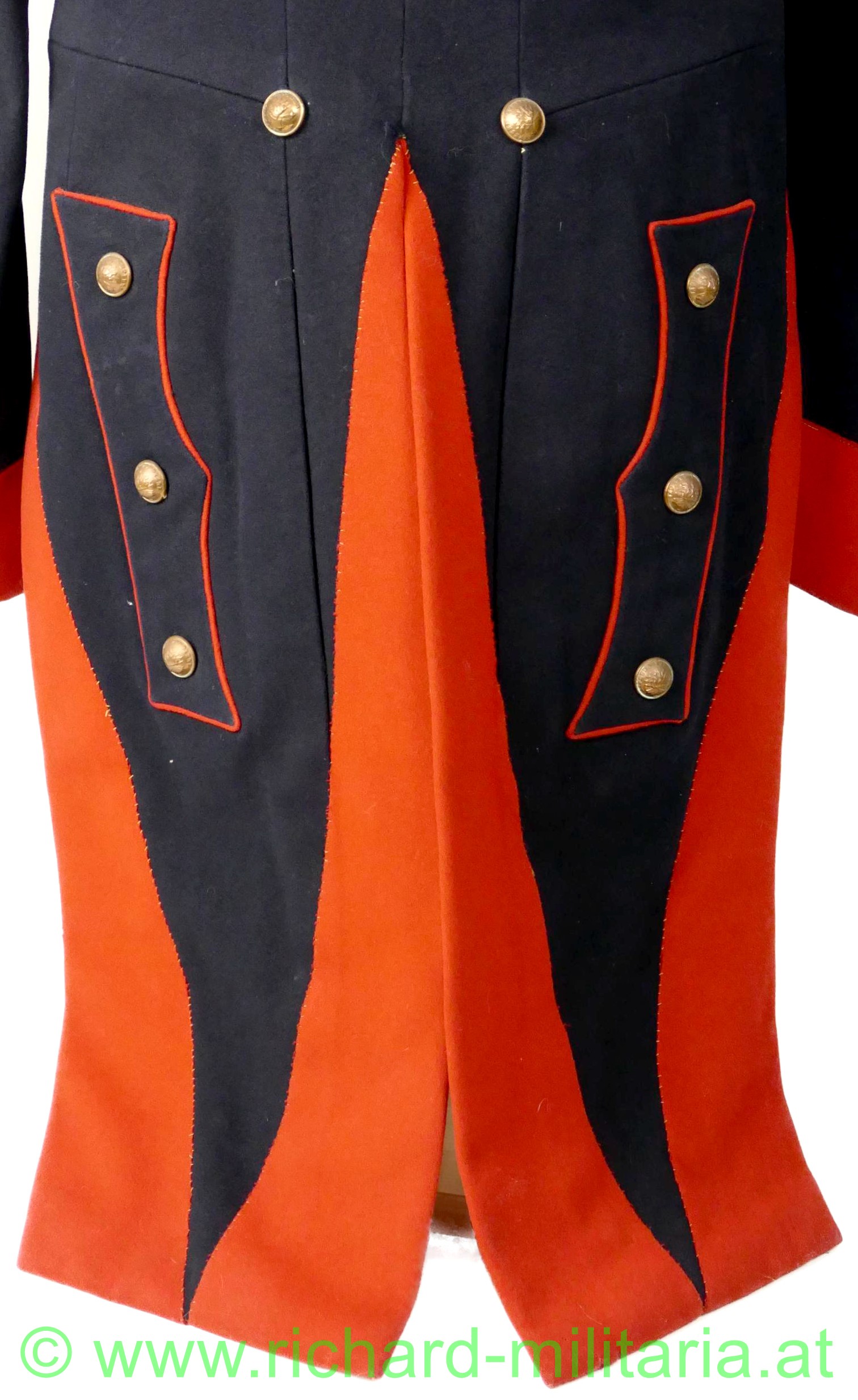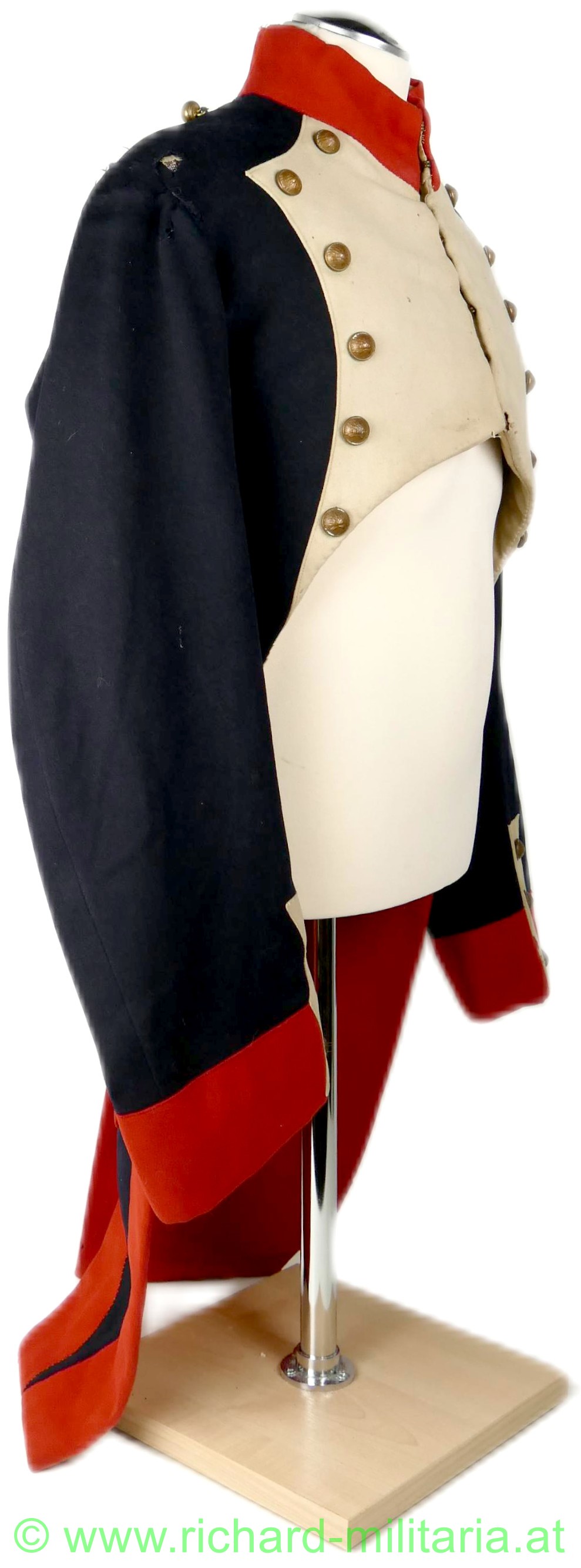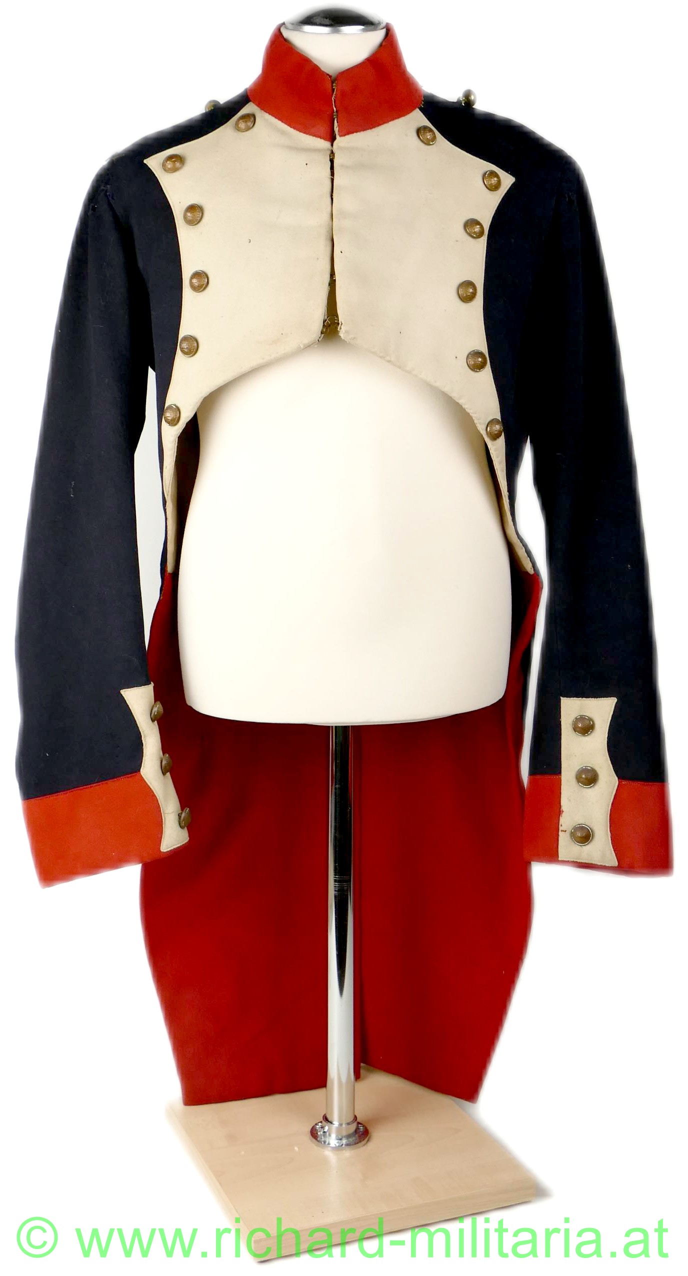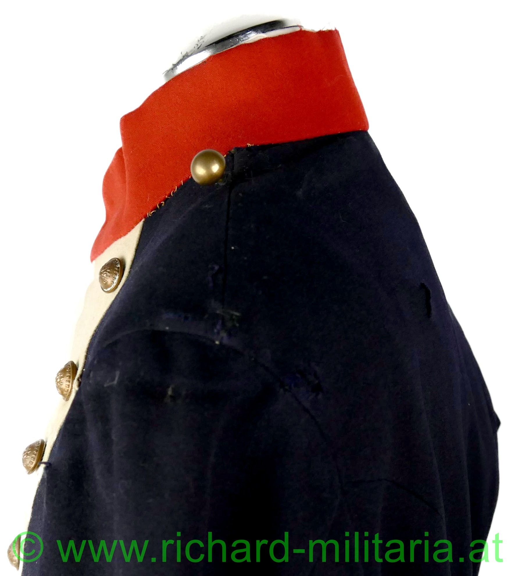 Napoleonischer Frack eines Pioniers "Sapeurs Pompiers"; aus blauem und roten Stoff; im Brustbereich sowie an den Ärmeln beiger Stoff mit bronzierten Knöpfen aus Tombak; Knöpfe mit der Aufschrift "Sapeurs Pompiers; innen mit beigem Stoff ausgelegt; beide Schwalbenschwänze mit je 3 Knöpfen besetzt; an den Ansätzen je ein Knopf; auf den Schultern je ein halbrunder Knopf; Frack außen mit einigen ausgebesserten Stellen sowie kleineren Löchern; auf der Innenseite tragebedingte Aufrauungen;