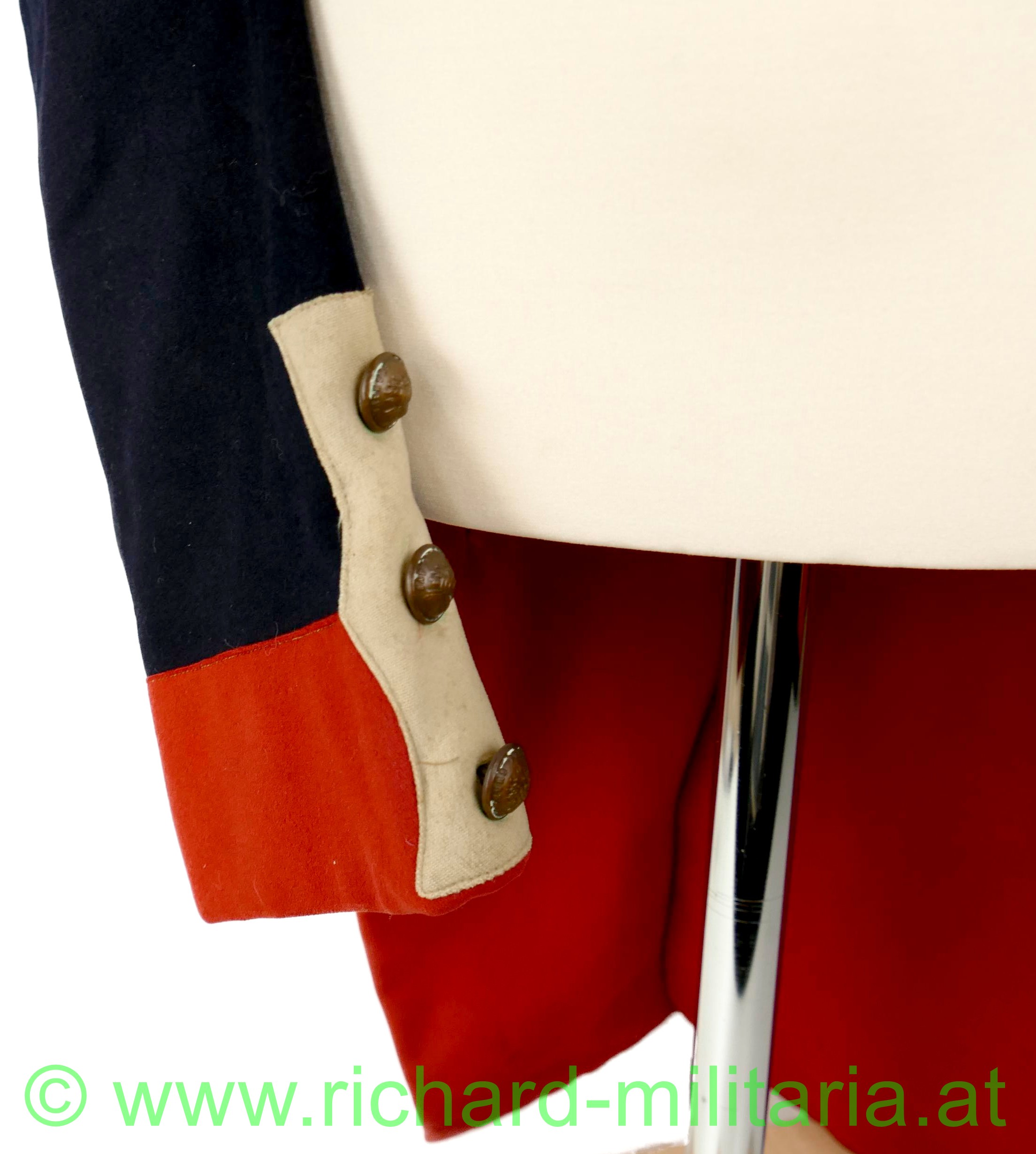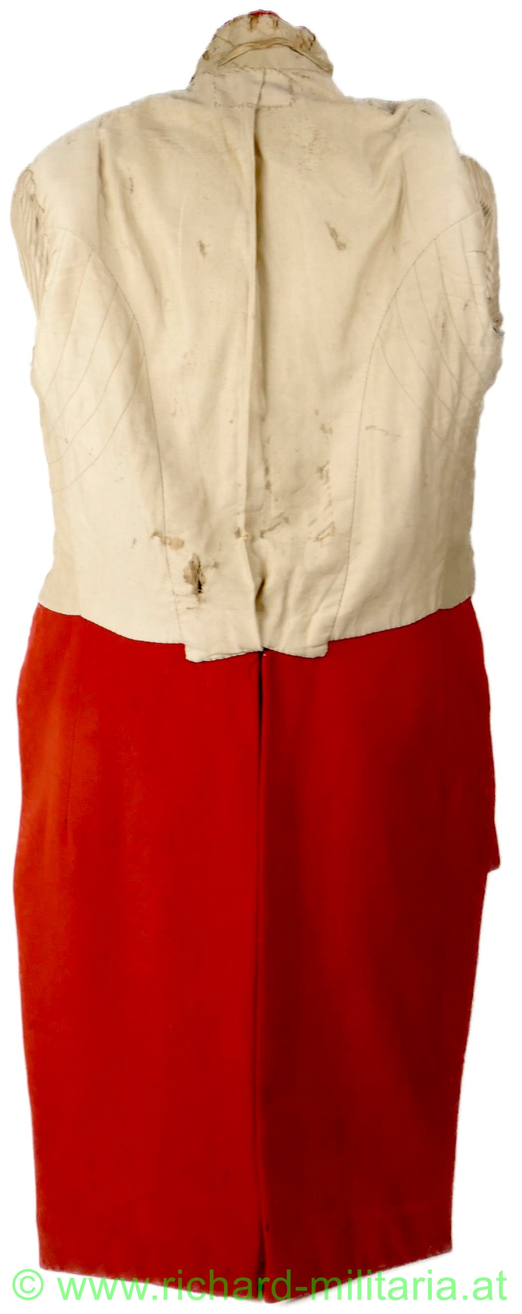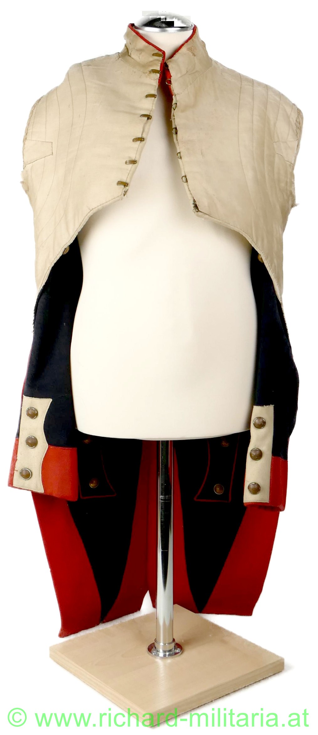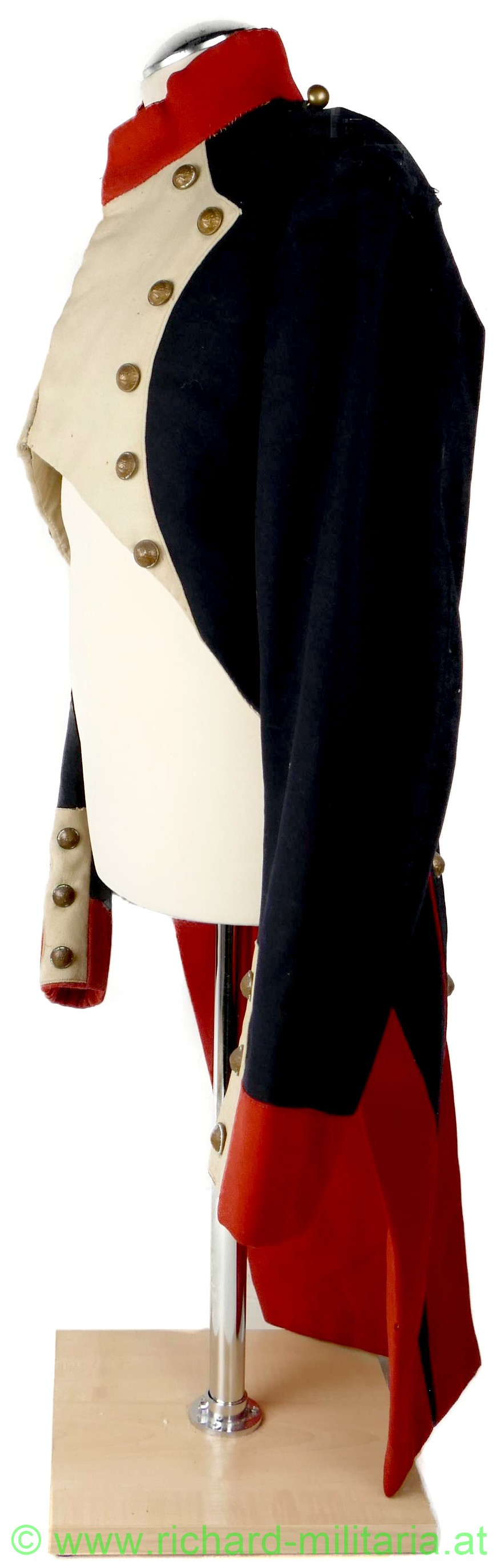 Napoleonischer Frack eines Pioniers "Sapeurs Pompiers"; aus blauem und roten Stoff; im Brustbereich sowie an den Ärmeln beiger Stoff mit bronzierten Knöpfen aus Tombak; Knöpfe mit der Aufschrift "Sapeurs Pompiers; innen mit beigem Stoff ausgelegt; beide Schwalbenschwänze mit je 3 Knöpfen besetzt; an den Ansätzen je ein Knopf; auf den Schultern je ein halbrunder Knopf; Frack außen mit einigen ausgebesserten Stellen sowie kleineren Löchern; auf der Innenseite tragebedingte Aufrauungen;