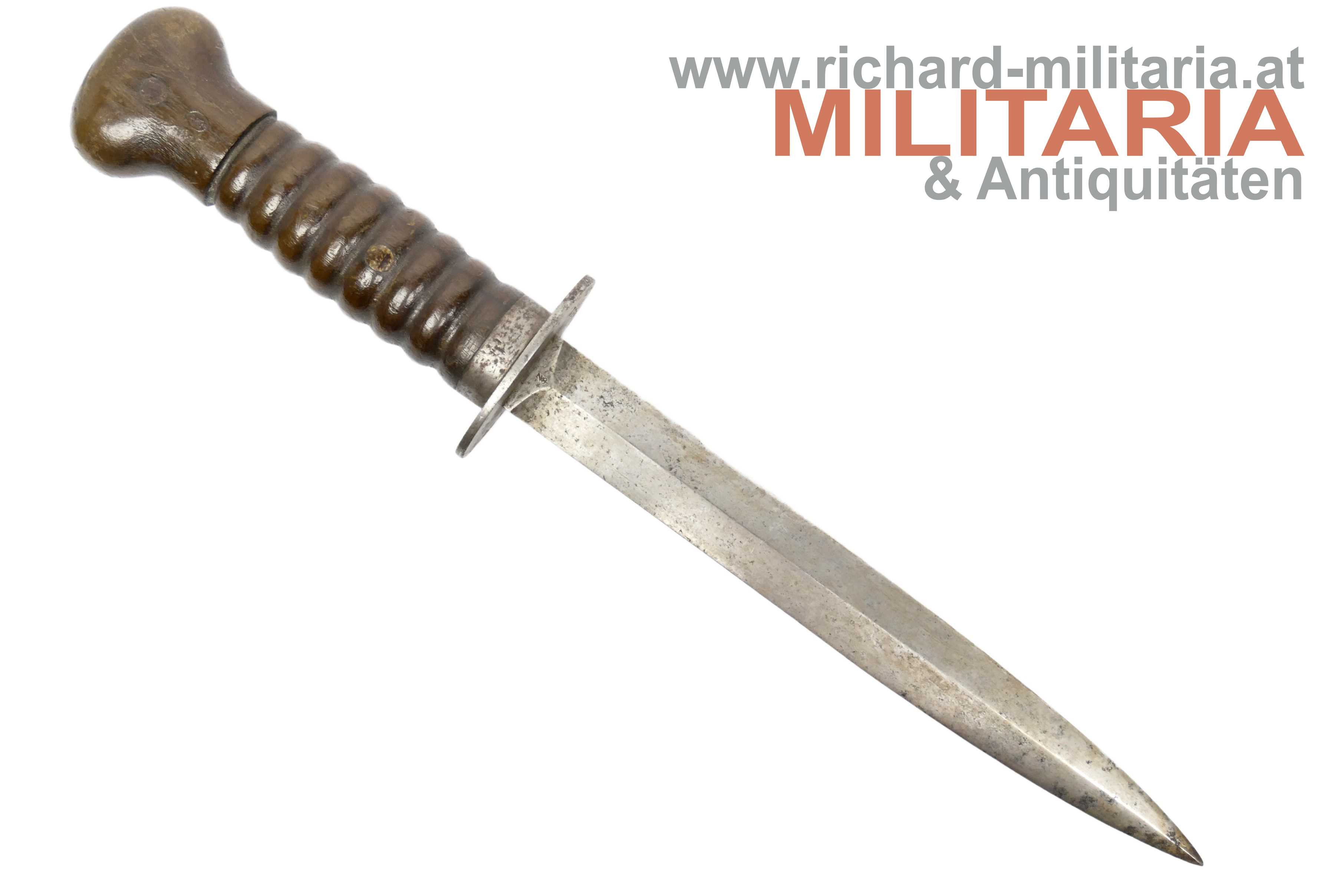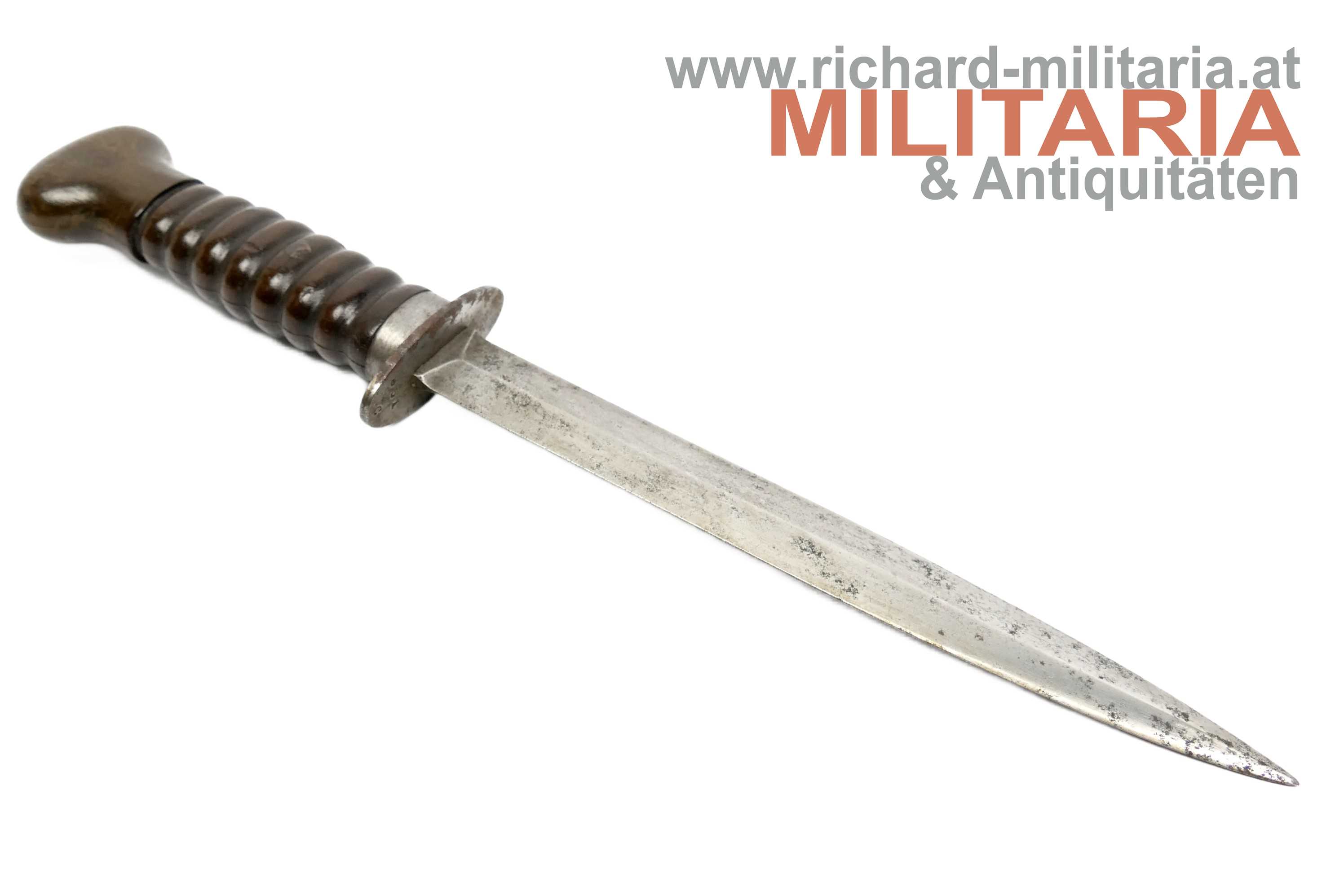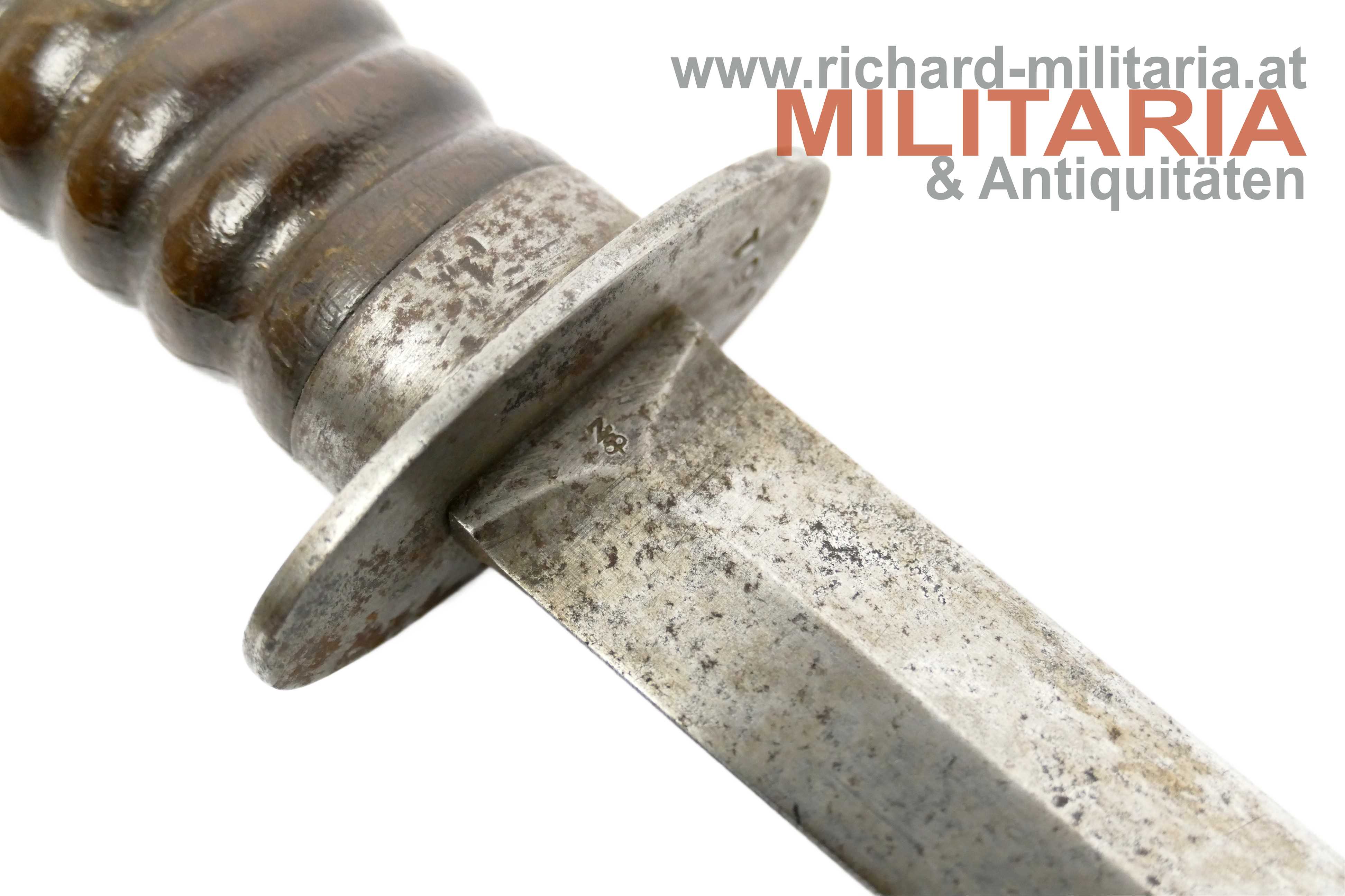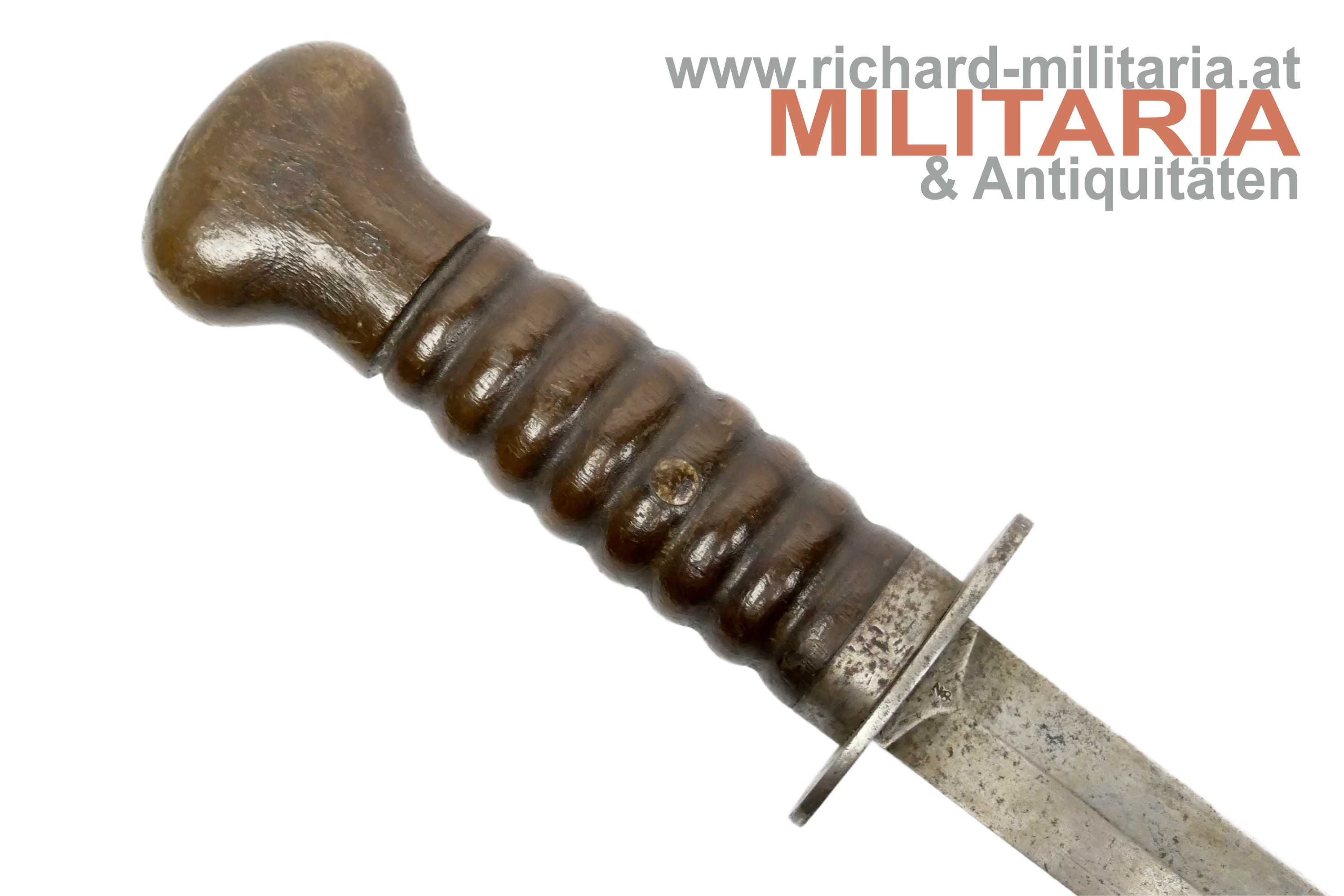 Niederlande - Storm Dolch - frühes Modell M1917; seltenes frühes Modell in gutem Zustand; am sehr schönen dunkelbraunen Holzgriff noch schwach die Markierung erkennbar; auf der Parierstange eingeschlagenen Nummer "651 C"; fleckige Klinge mit eingeschlagener Abnahme; ohne Scheide