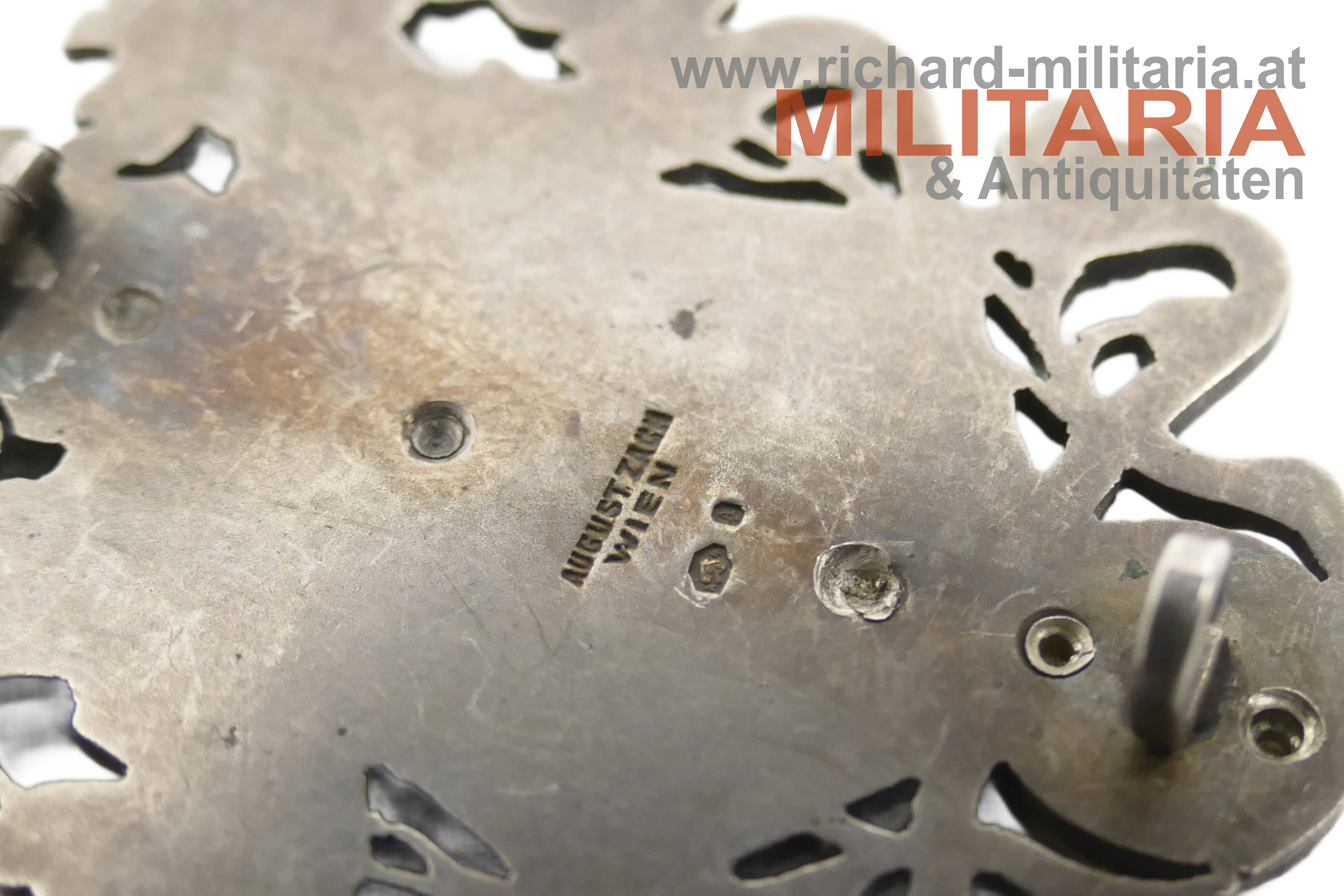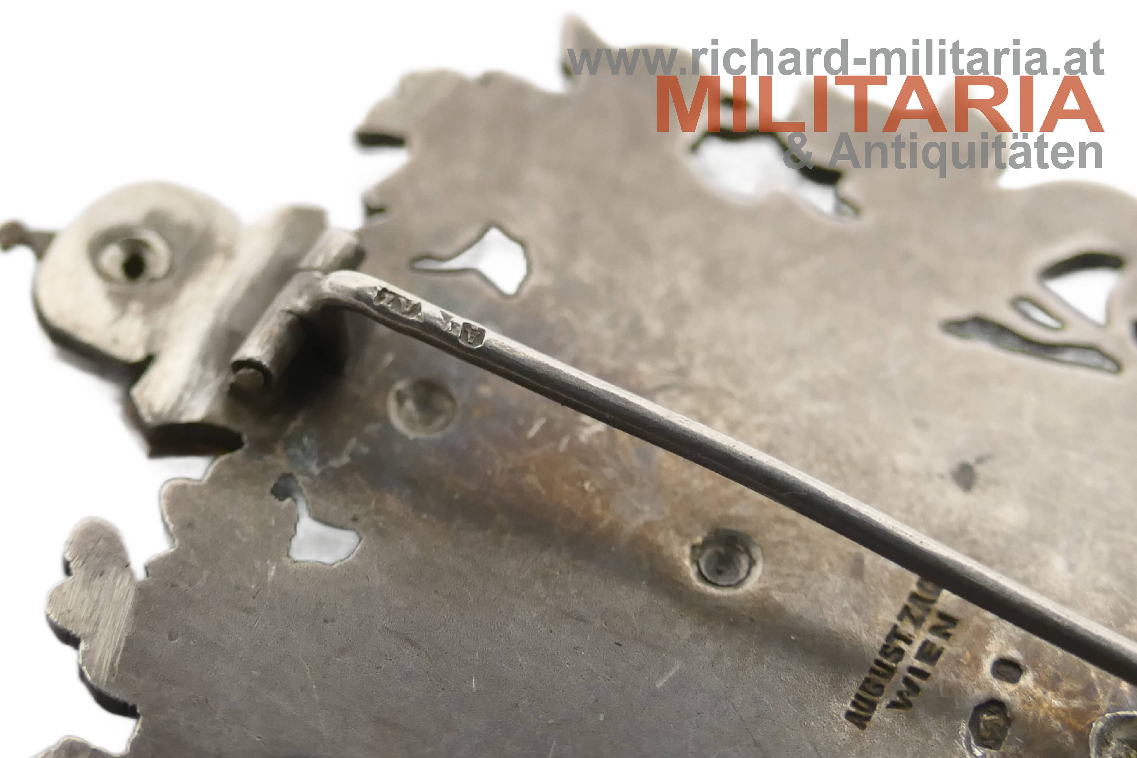 niederösterreichisches Meisterschützenabzeichen; Silber teilweise emailliert; revers Herstellermarkierung "August Zach Wien", Silberpunzierung und Kontrollamtspunze "A"; originales Nadelsystem; Nadel ebenfalls punziert mit Herstellerpunze "AZ" und Kontrollamtspunze "A"; Emaillierung auf der Krone und am niederösterreichischen Wappen beschädigt;
