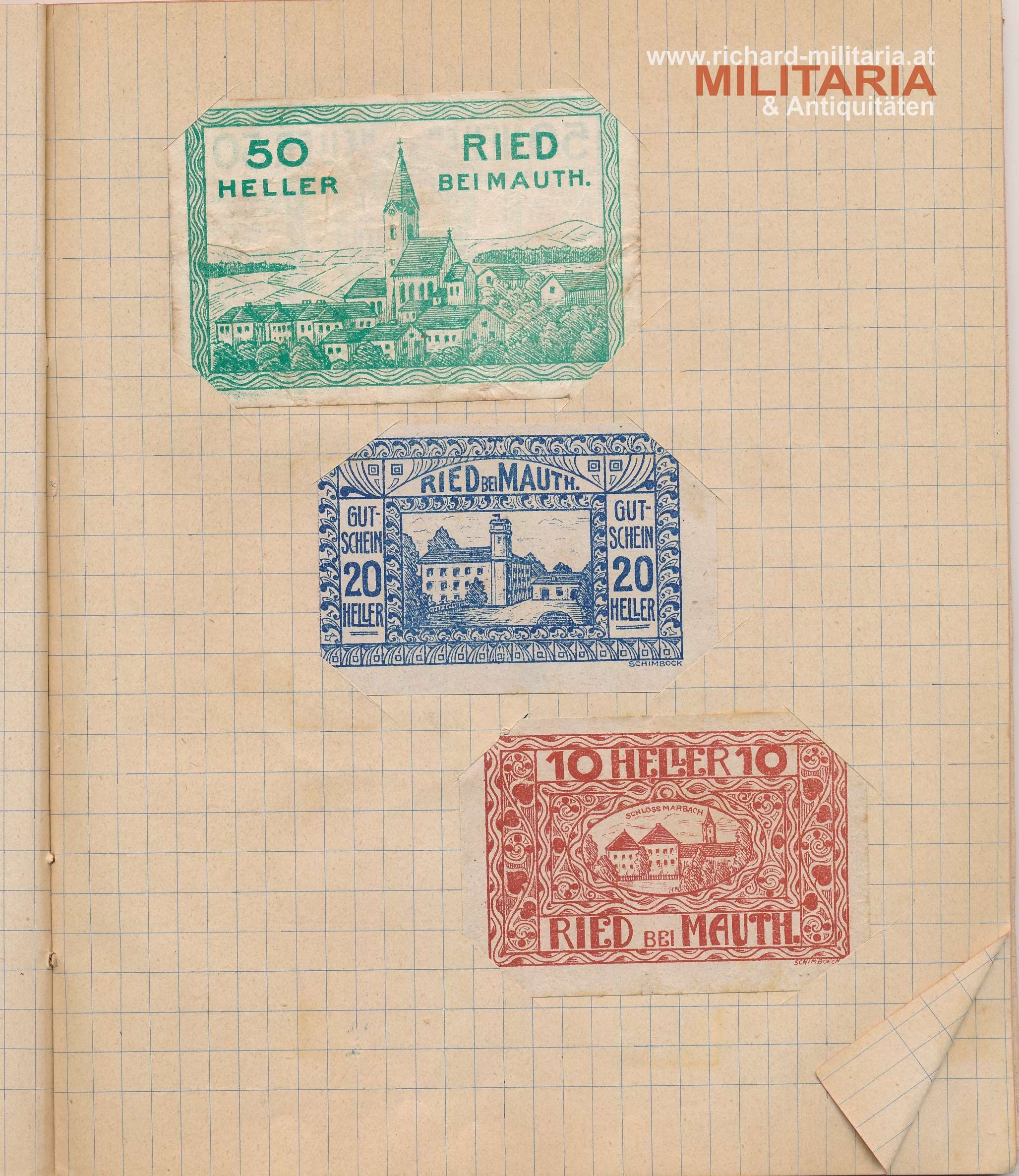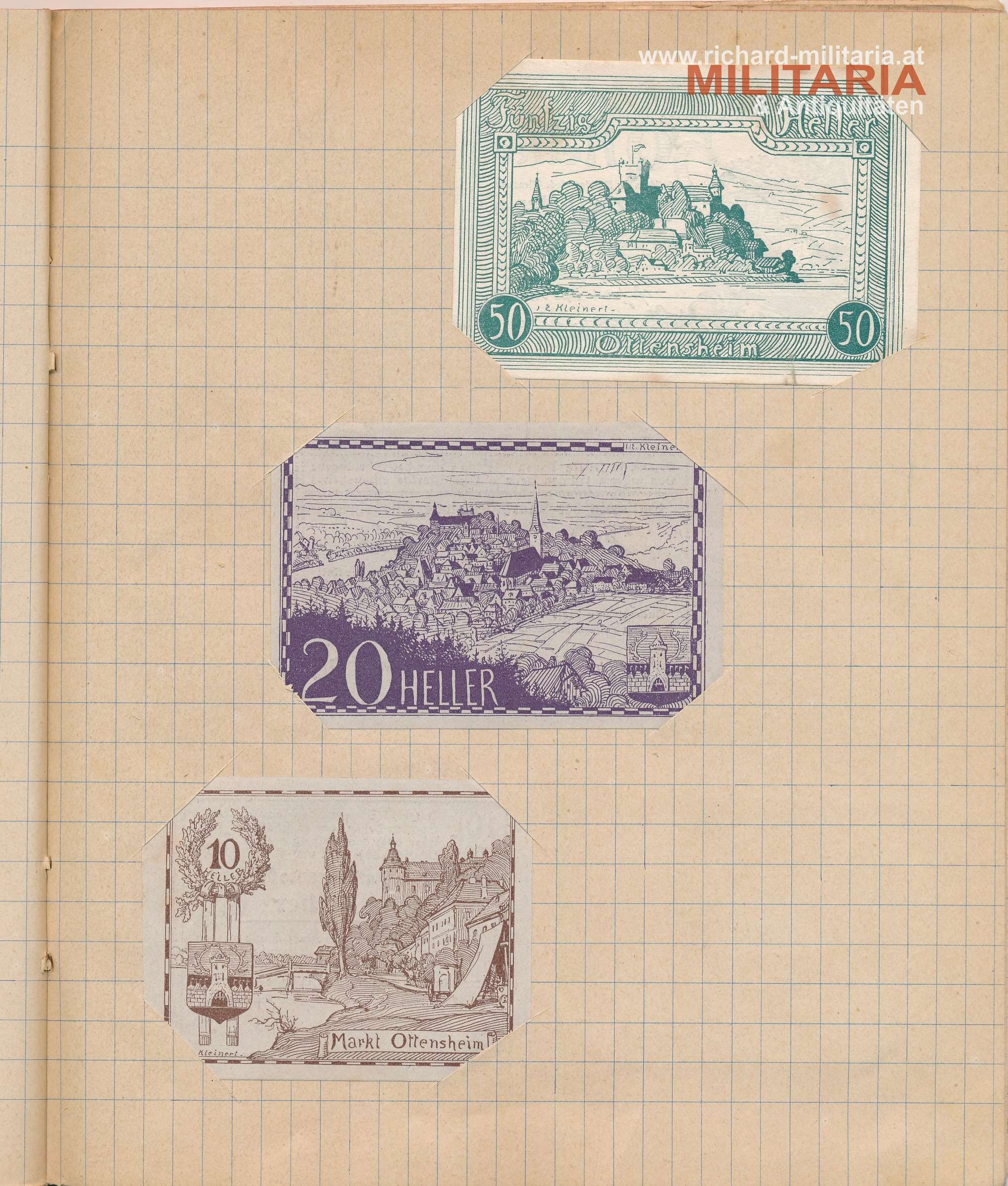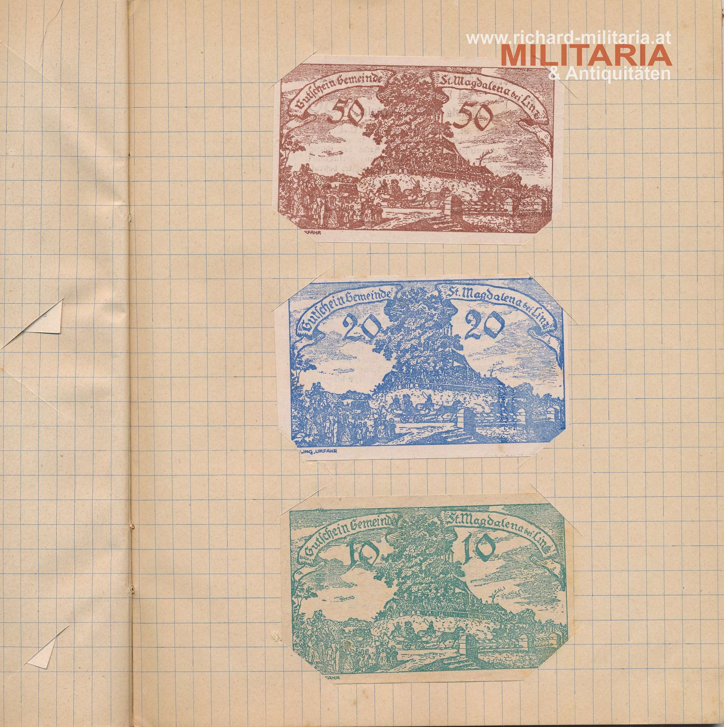 Kleine Sammlung Notgeld Österreich (50 Stück) - in altem Rechenbuch eingelegt (nicht eingeklebt!), guter Zustand mit zahlreichen kleinen Ortschaften - Oberösterreich - Niederösterreich - Tirol - Vorarlberg, etc.... - unterschiedliche Formate;