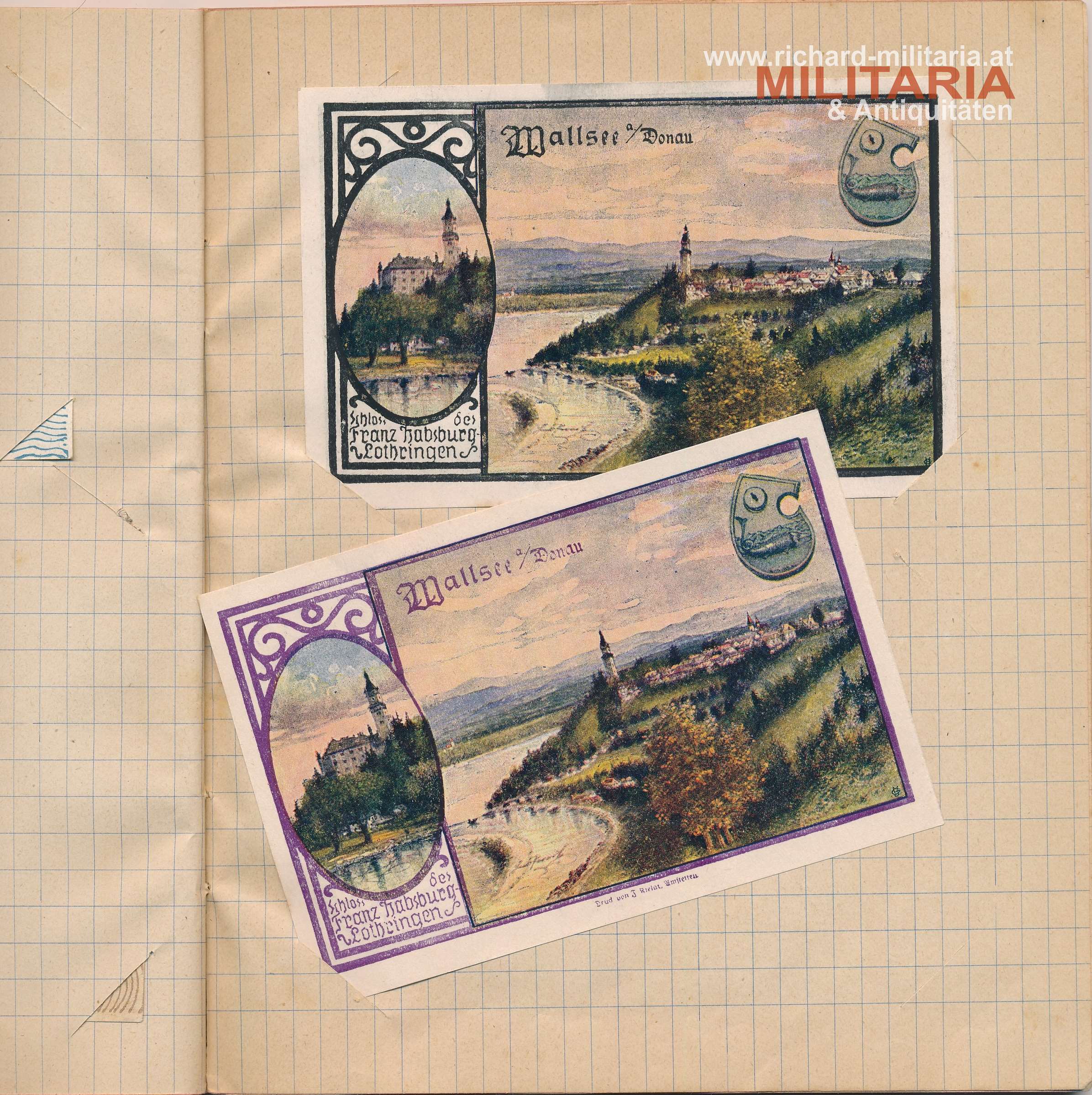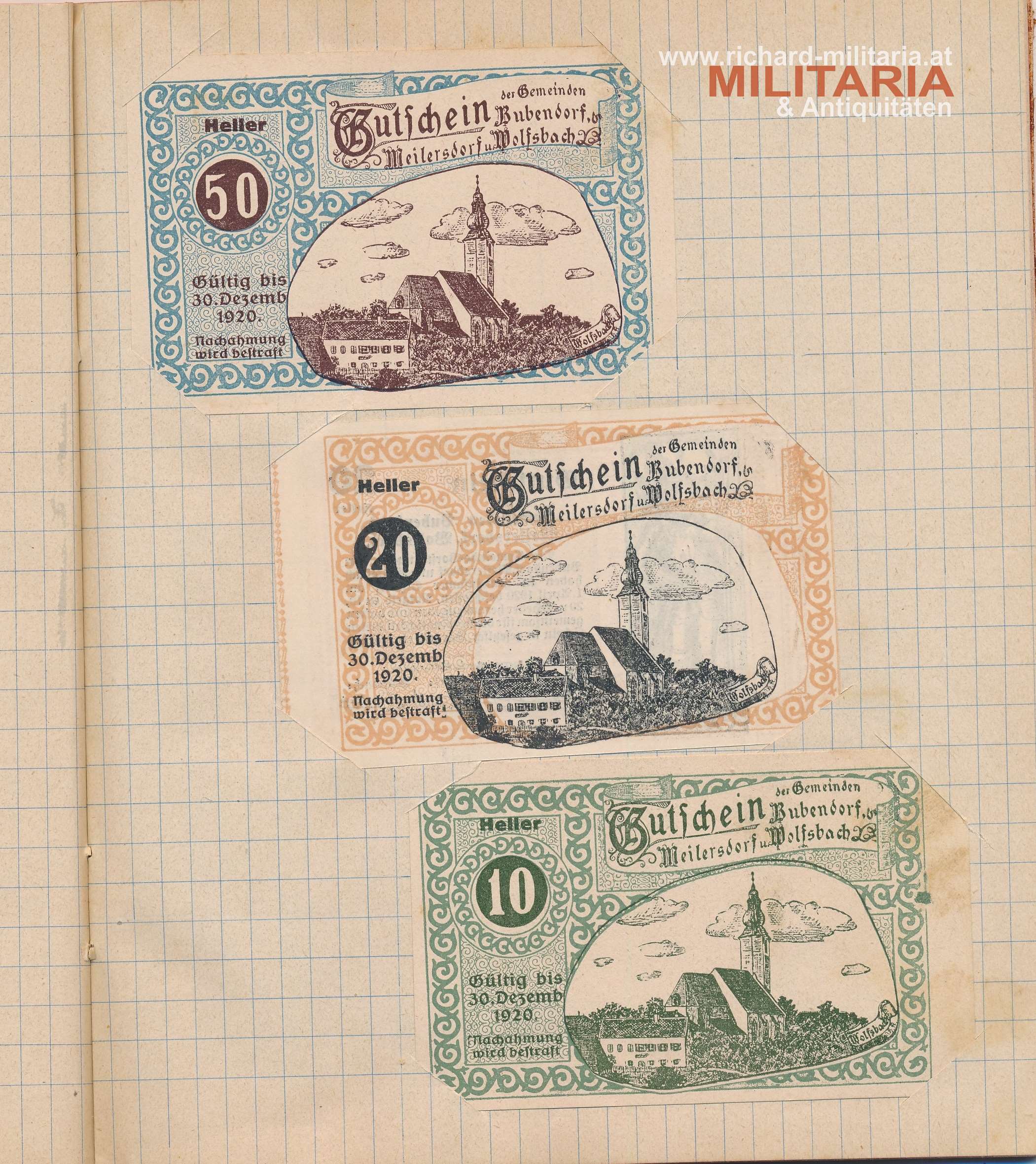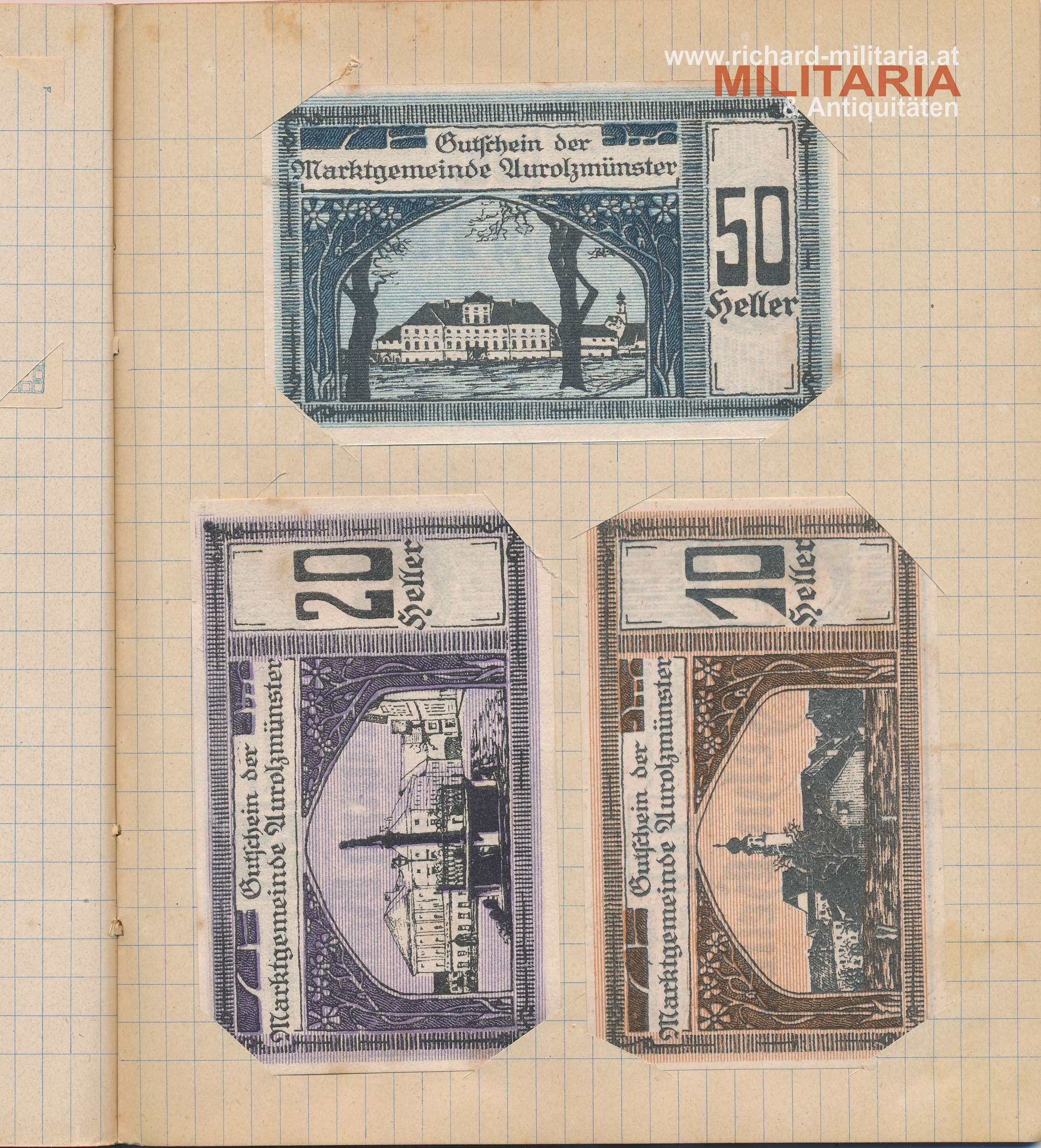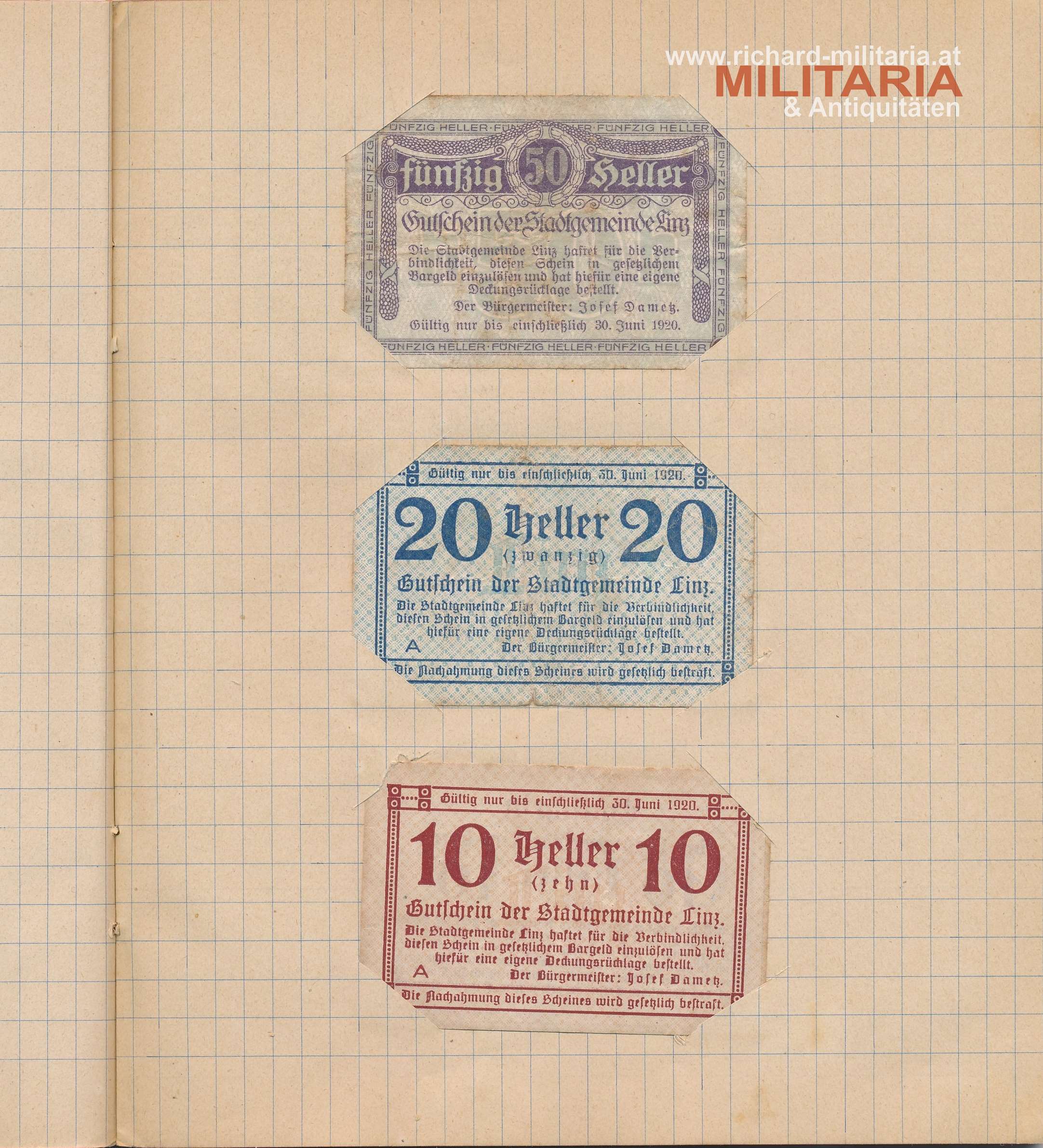 Kleine Sammlung Notgeld Österreich (50 Stück) - in altem Rechenbuch eingelegt (nicht eingeklebt!), guter Zustand mit zahlreichen kleinen Ortschaften - Oberösterreich - Niederösterreich - Tirol - Vorarlberg, etc.... - unterschiedliche Formate;
