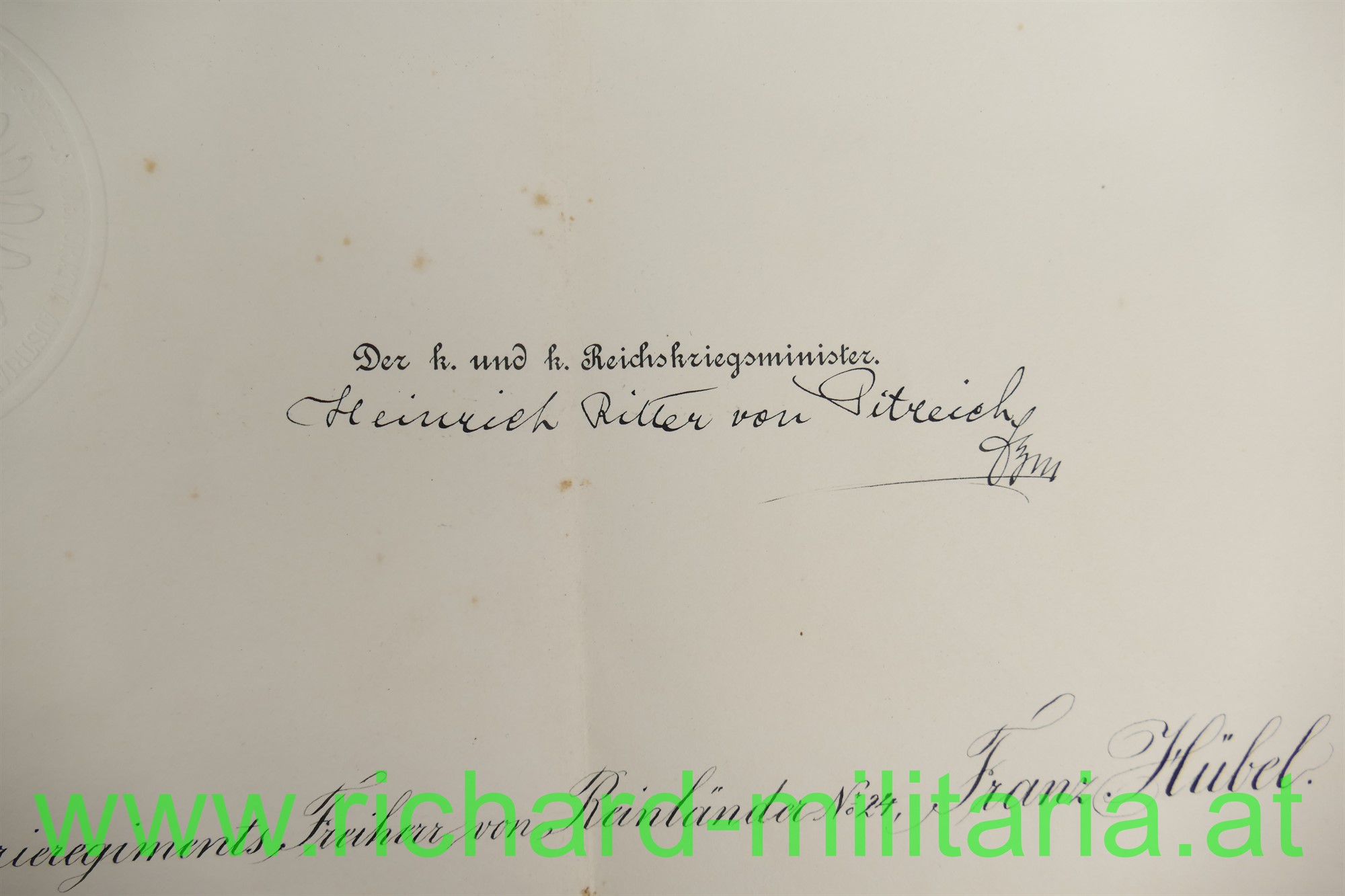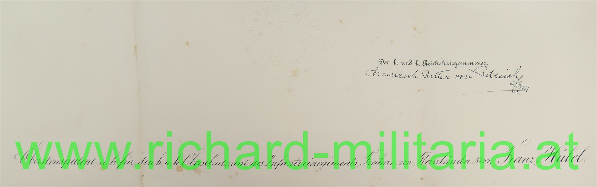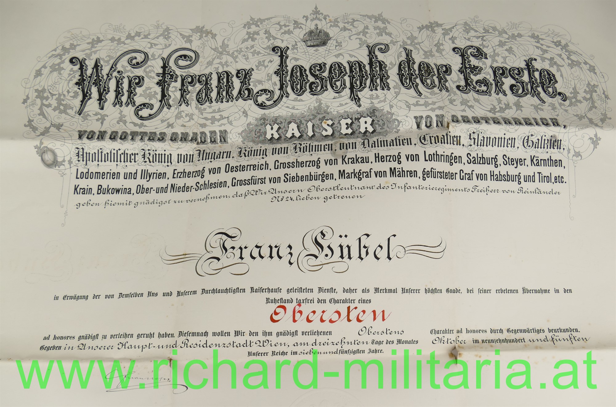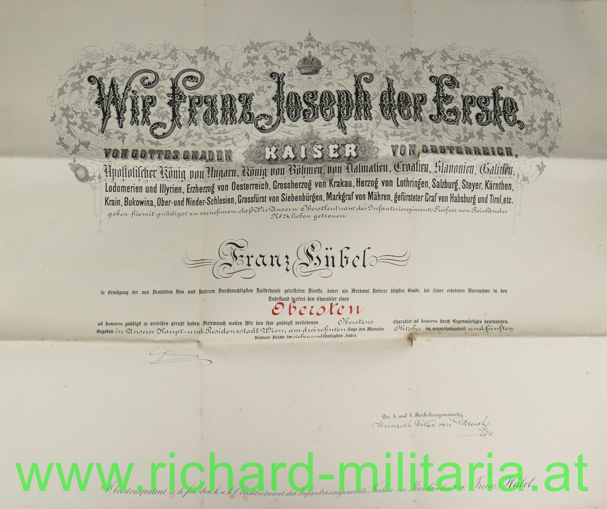Oberstenpatent des Franz Hübel beim Infanterie-Regiment Freiherr v. Reinländer Nr. 24, ausgestellt 1905 mit OU von Kaiser Franz Josef, großformatig gefaltet, an den Faltstellen eingerissen