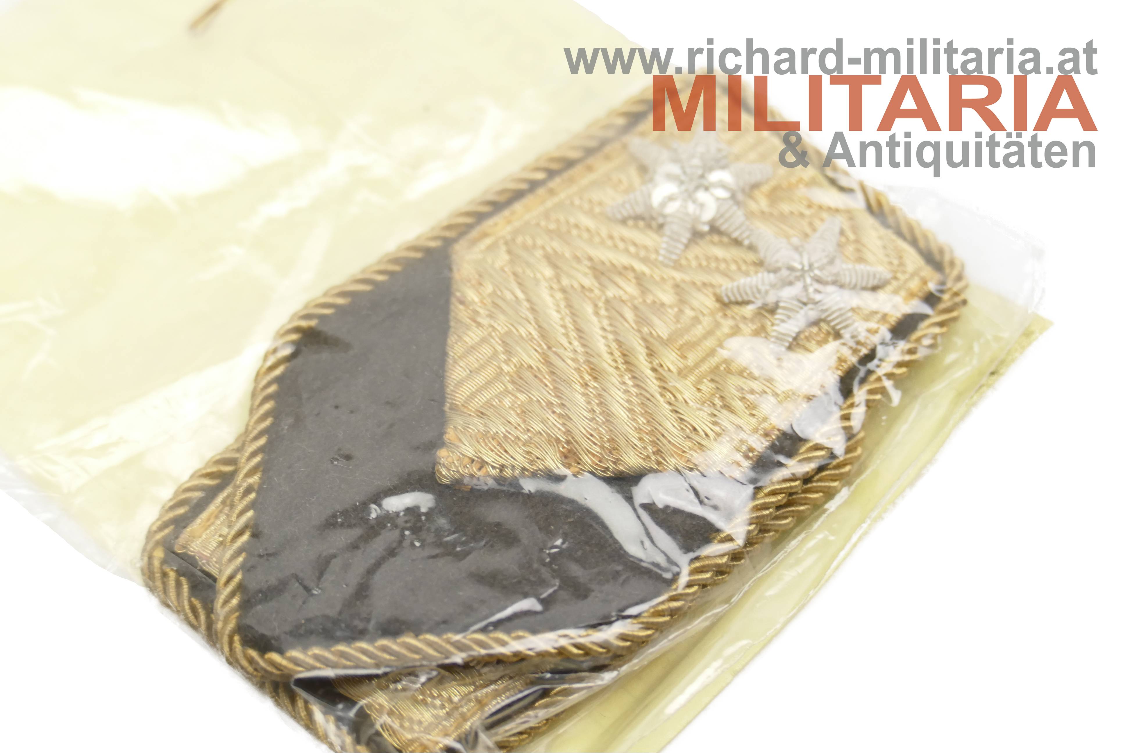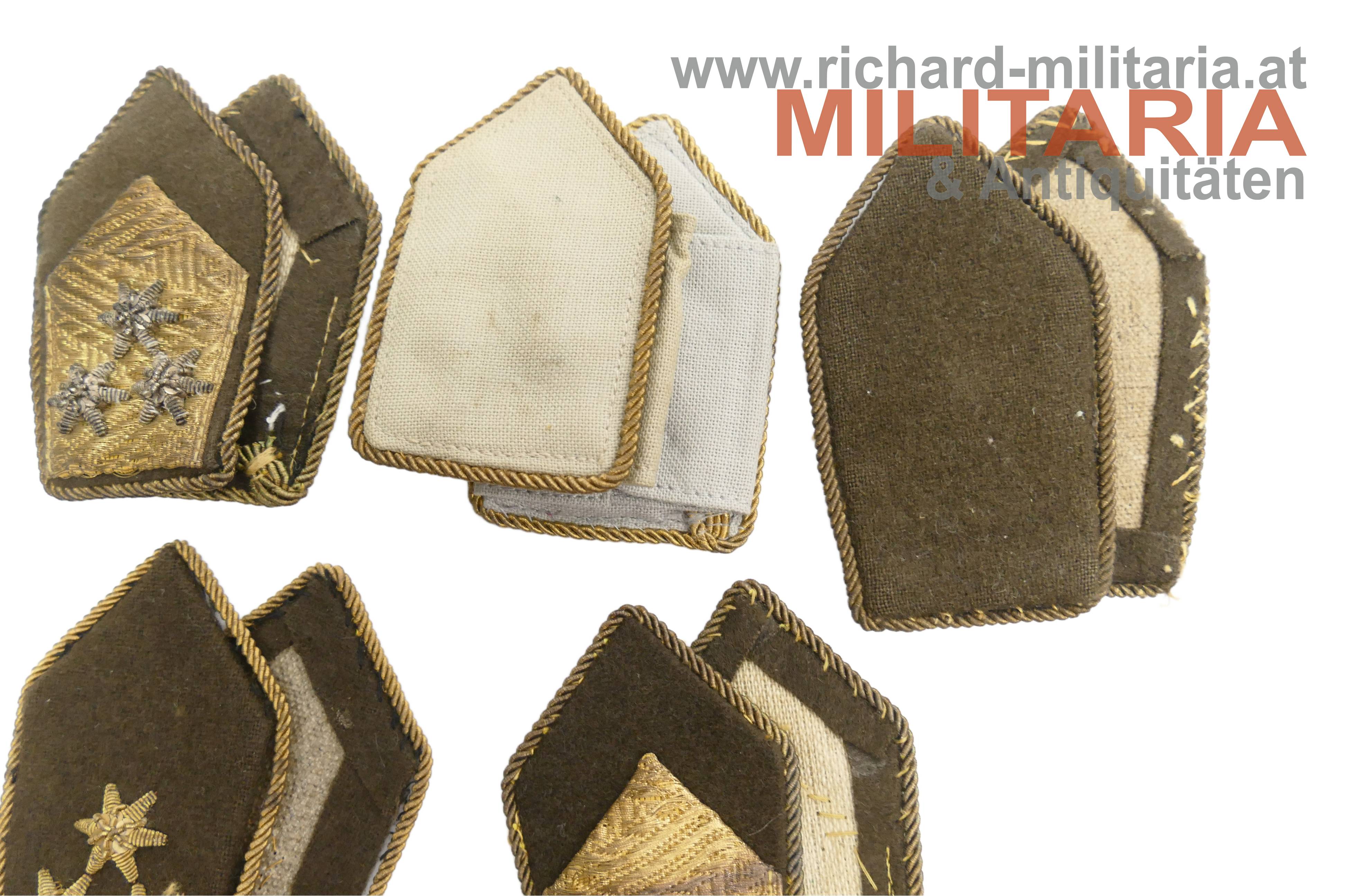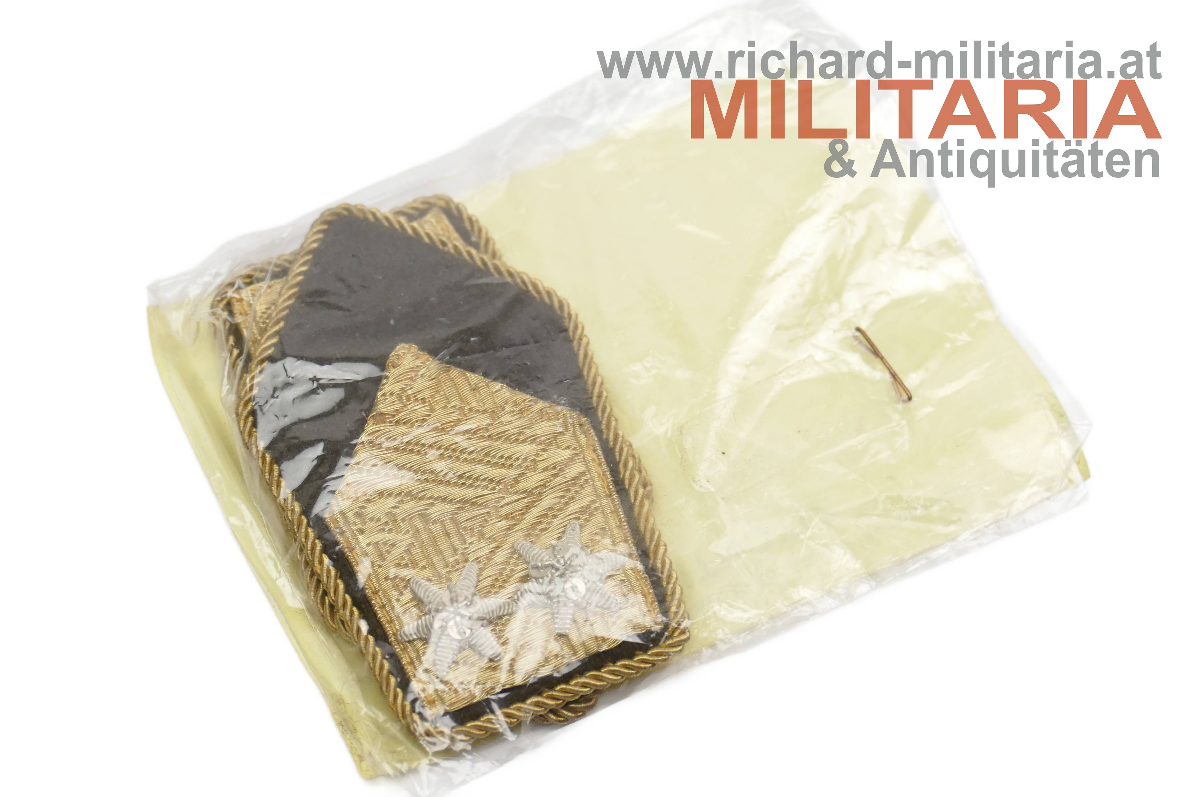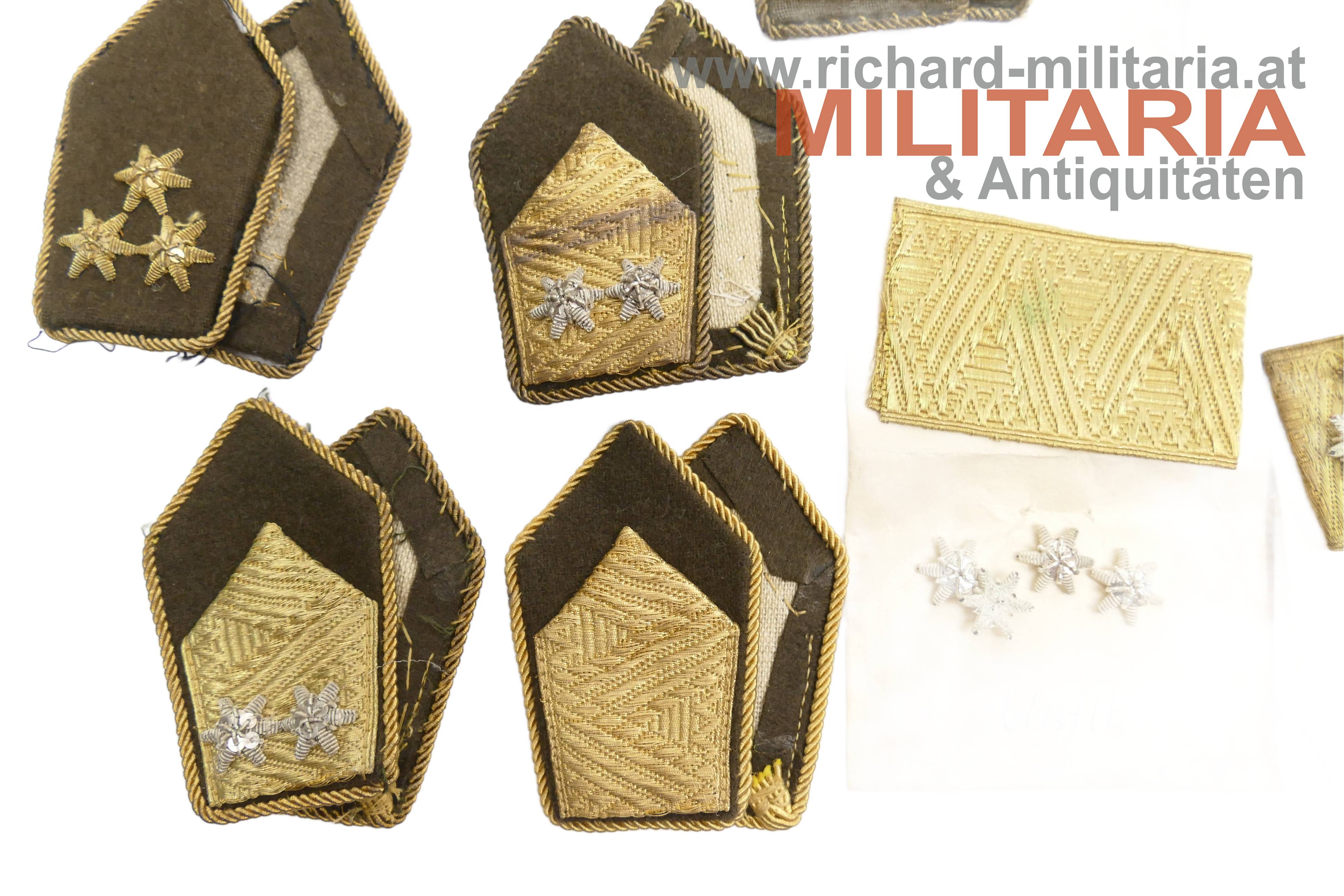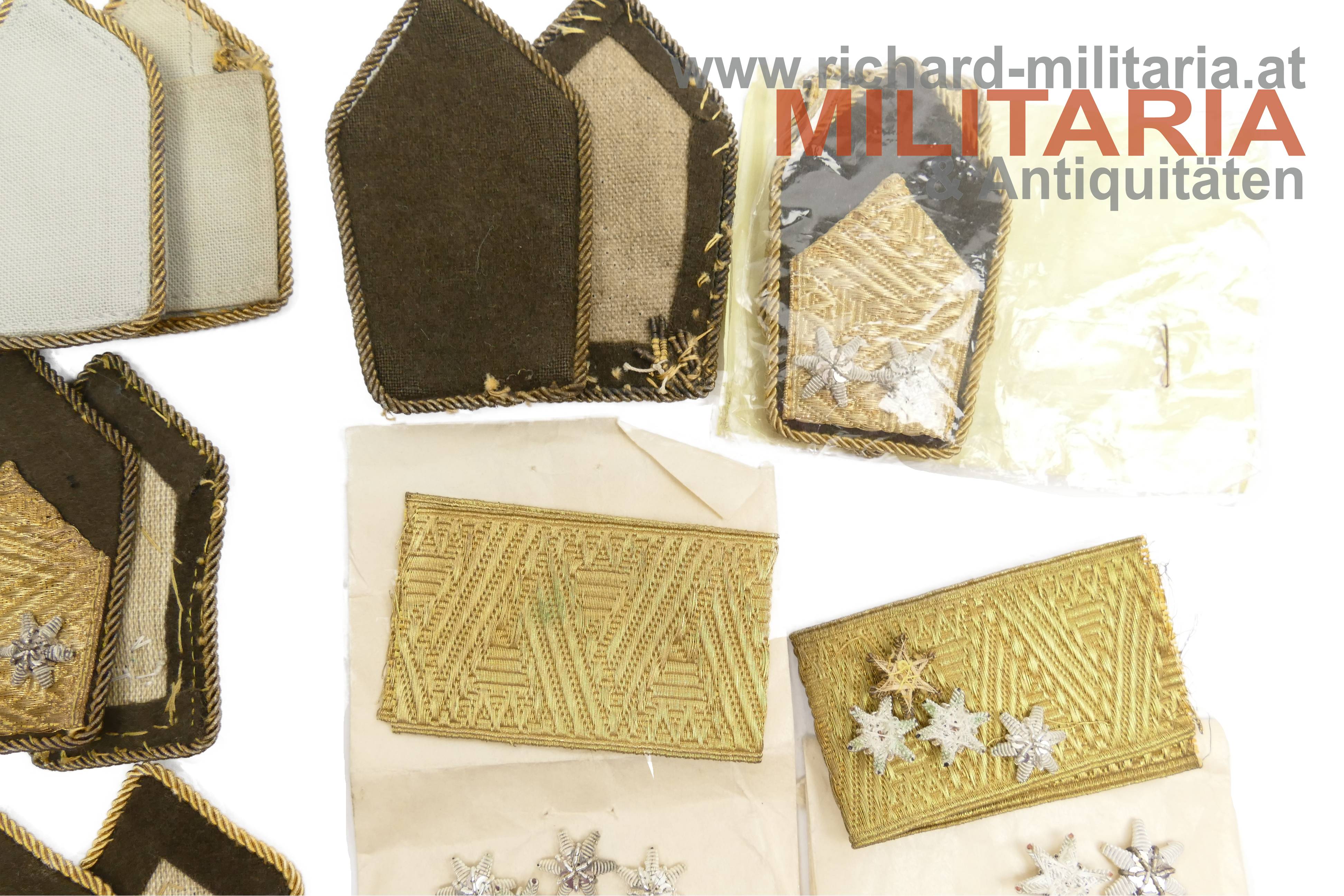 ÖBH-Konvolut eines Technischer Dienst-Offiziers; 8 Paar Schulterklappen unterschiedlicher Ränge; ein Paar in einem Plastiksack mit Begleitnotiz; zwei goldene Rangborten und 13 Rangsterne; einer der Rangsterne aus Goldfaden der Rest aus Silberfaden;