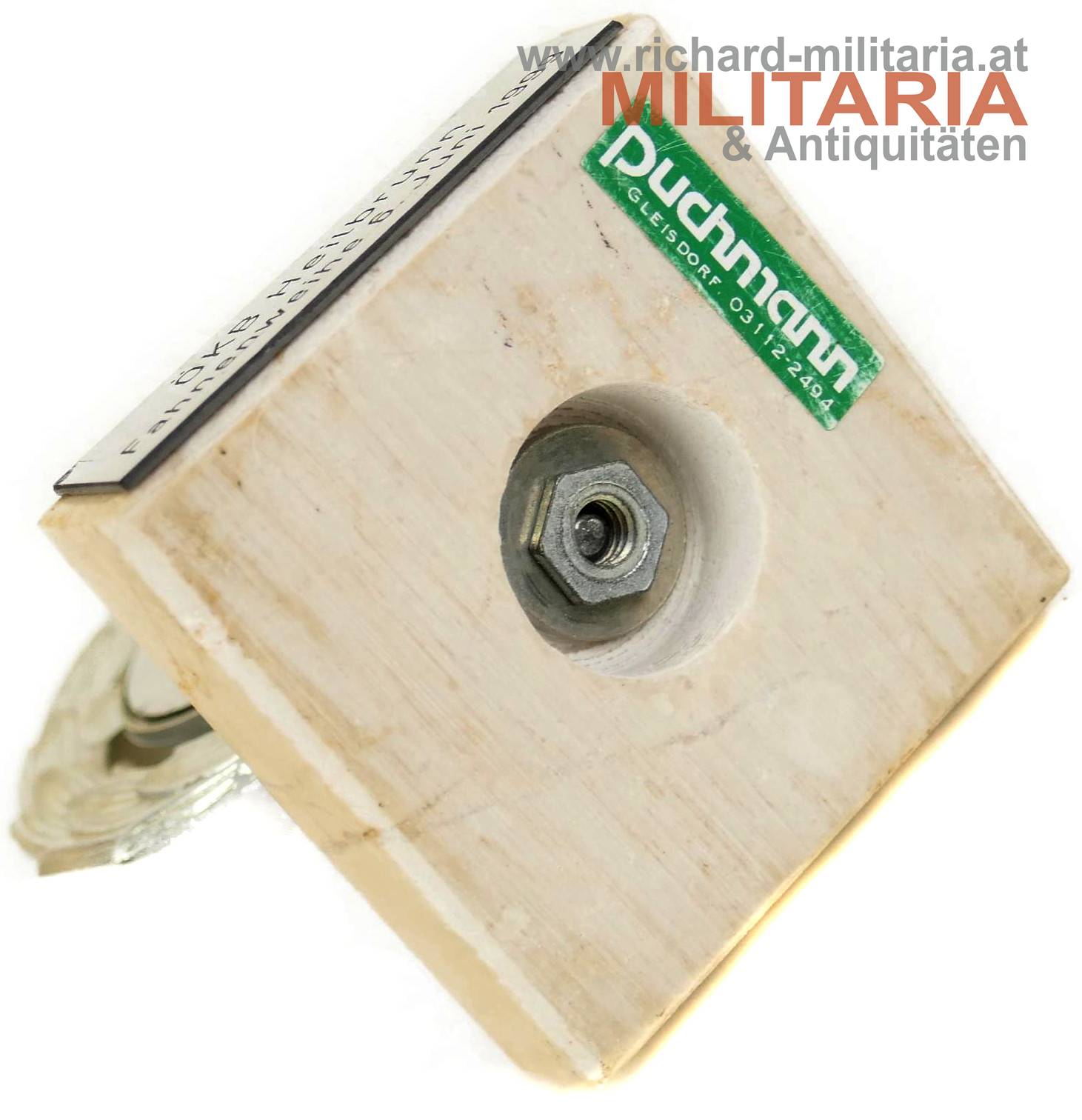 ÖKB Heilbrunn - Fahnenweihe 6. Juni 1999 - Tischdekoration, quadratischer Sockel aus Marmor - aufgeschraubter Eichenlaubkranz mittig angebrachtes steirisches ÖKB-Zeichen - teilweise mit Farbverlust, am Sockel angebrachte Plakette: "ÖKB Heilbrunn - Fahnenweihe 6. Juni 1999"; Händleretikett am Boden: "Puchmann, Weiz"