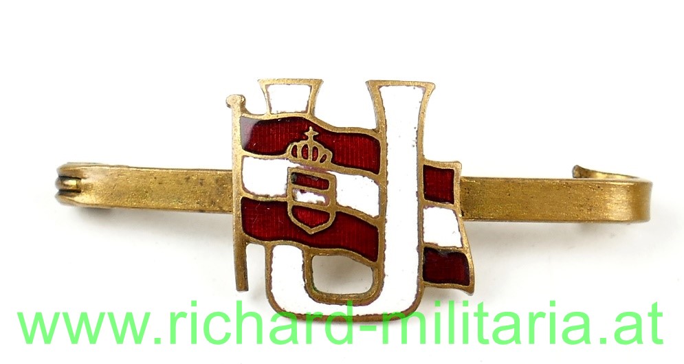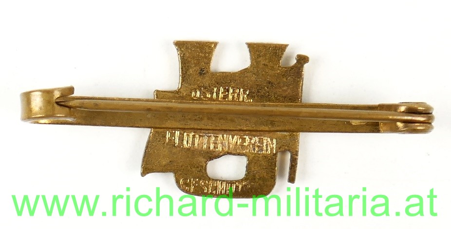 Spendenabzeichen des österreichischen Flottenvereines für die U-Boote der kuk. Kriegsmarine aus dem 1. Weltkrieg; VARIANTE mit dem unten spitzen Wappenschild; Tombak vergoldet und emailliert, auf der Rückseite originale Nadel und Hersteller Österr. Flottenverein unter dem Nadelblättchen, dazu "ges.gesch." - sehr guter Zustand ohne Beschädigungen