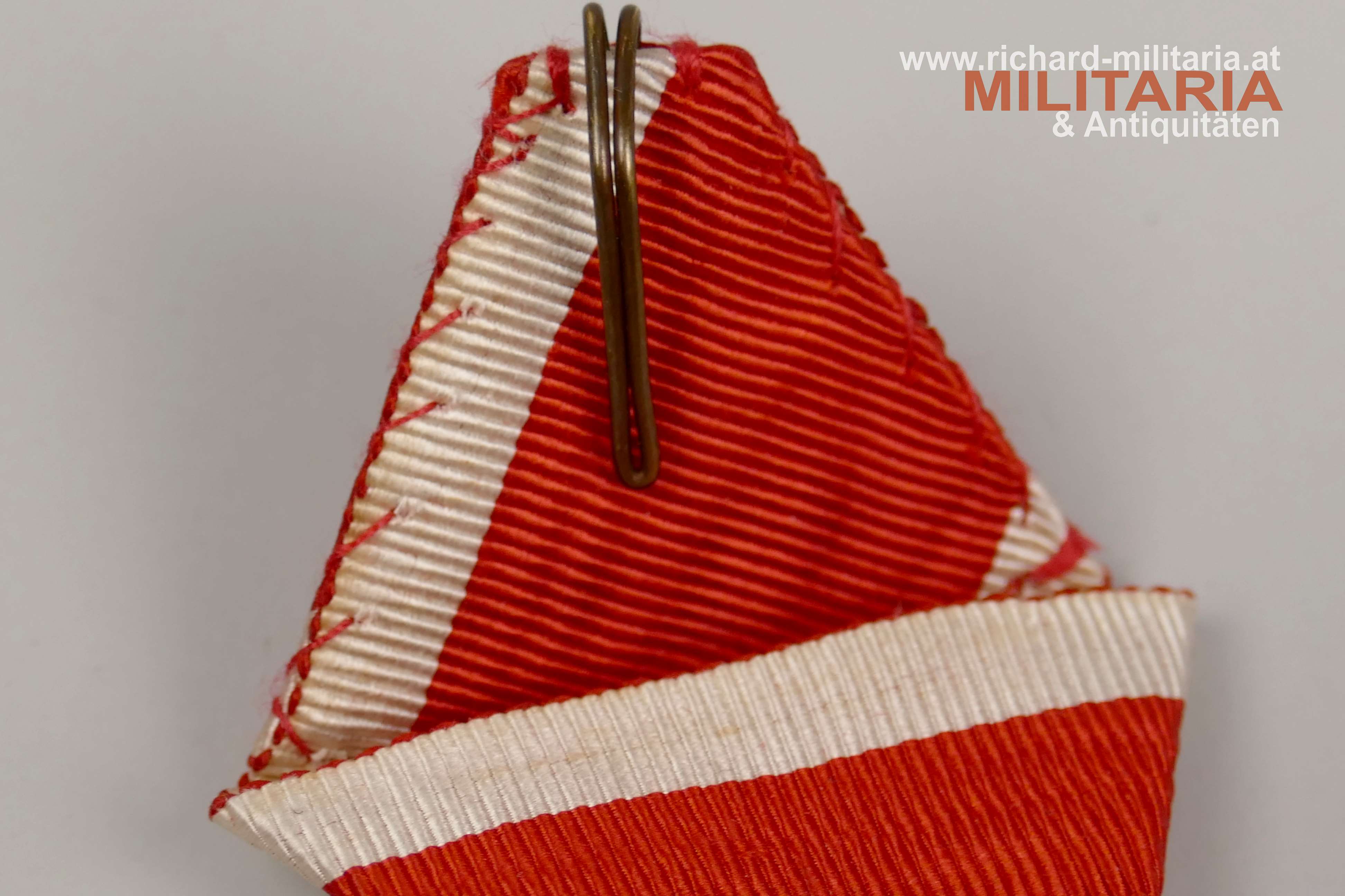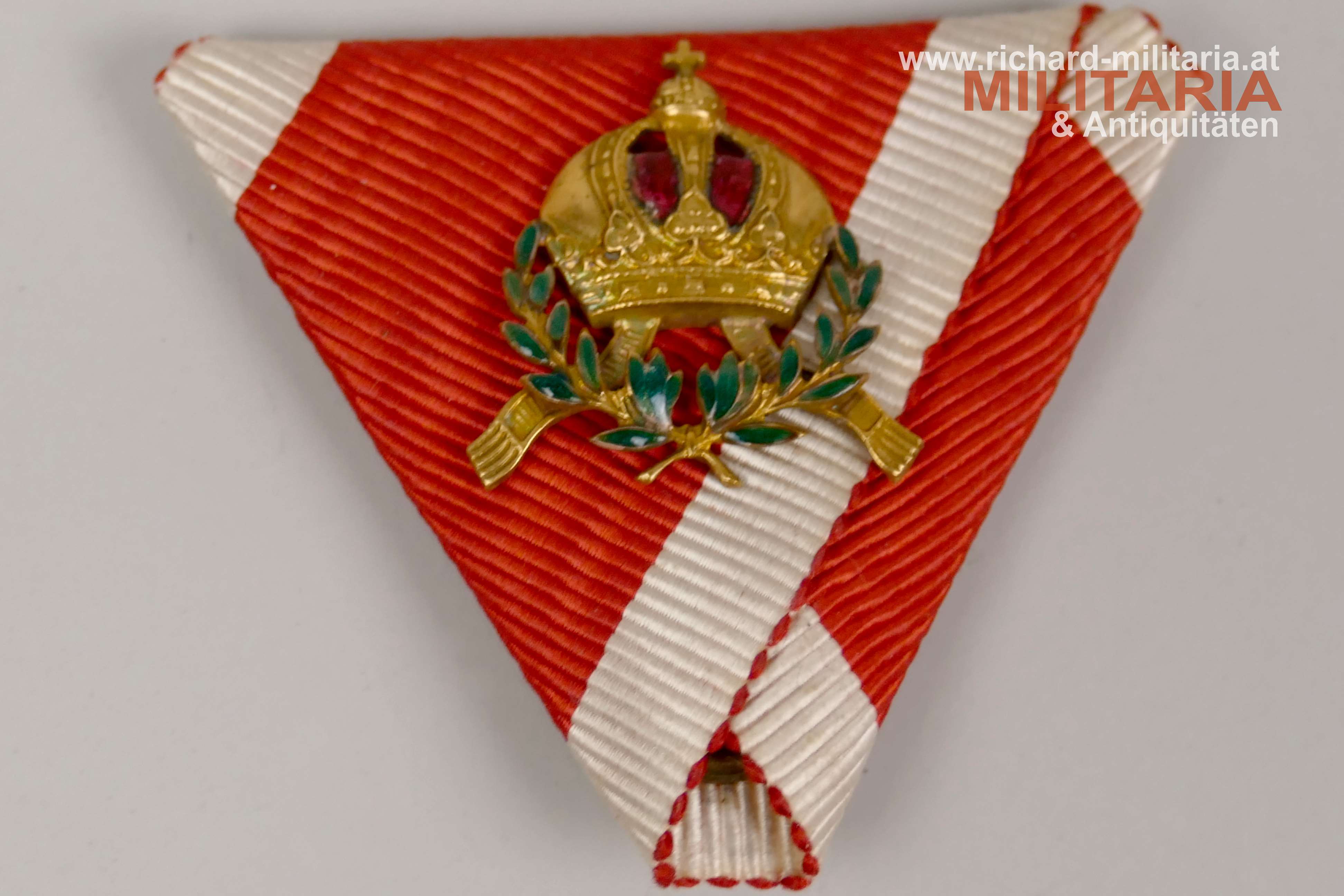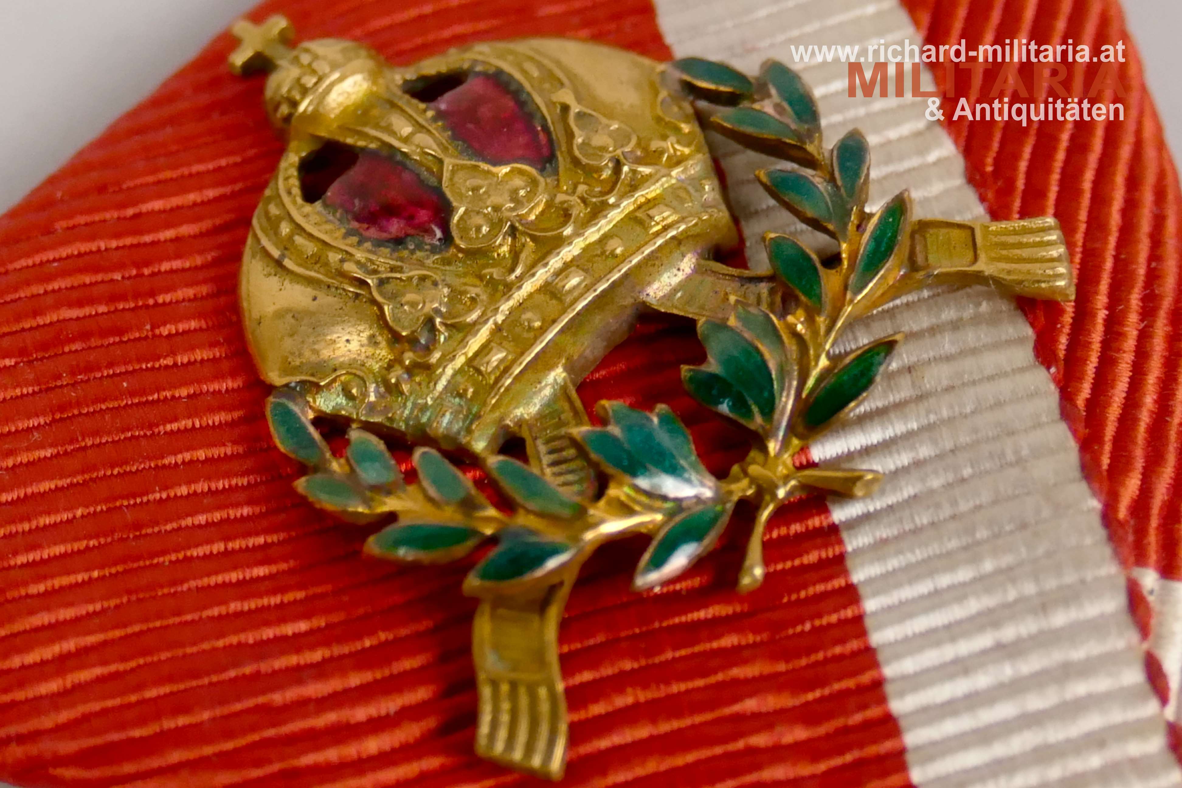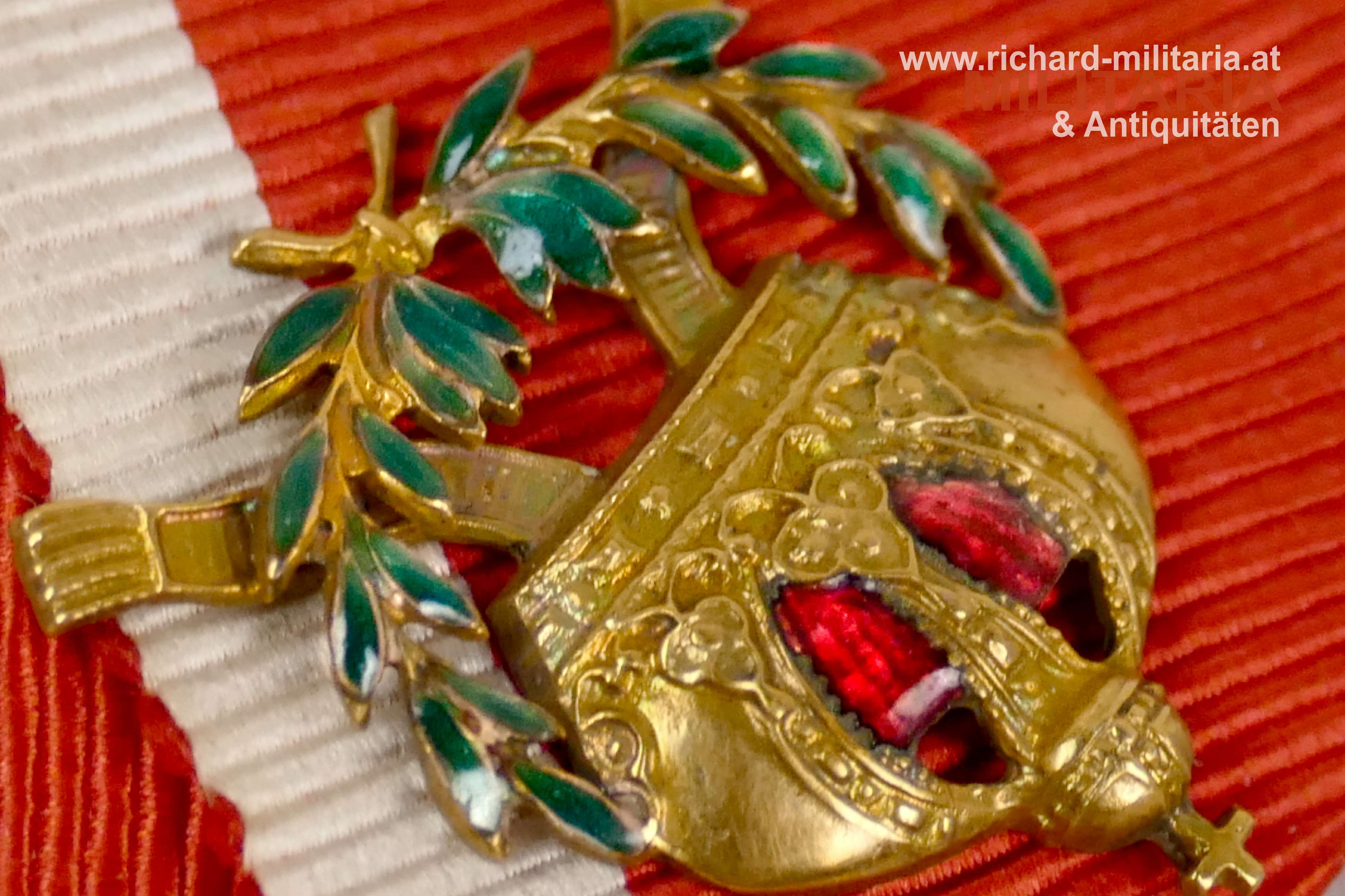 österreichisch kaiserlicher Leopold Orden - Kleindekoration des Kommandeurkreuzes mit Kriegsdekoration; schönes fein gearbeitetes Original aus der Zeit vor 1918; Bronze vergoldet und emailliert; minimale Fehlstelle am Lorbeerkranz - mit freiem Auge kaum zu erkennen; aufgesplintet auf das originale, schön erhaltene Band;