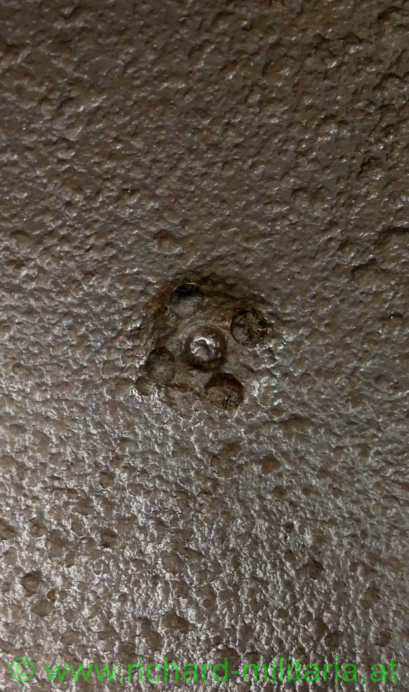 Österreichischer Stahlhelm System Berndorf BODENFUND, unberührter Fundzustand; Glocke in der typischen Form des System Berndorf mit der markanten Lüftungsöse am Scheitel, ohne Innenfutter und ohne Farbe; gebördelter Rand; eine Schraube für den Innenhelm noch vorhanden, stärker rostig, an einigen Stellen durchgerostet, im Stirnbereich eingerissen - gereinigt;
