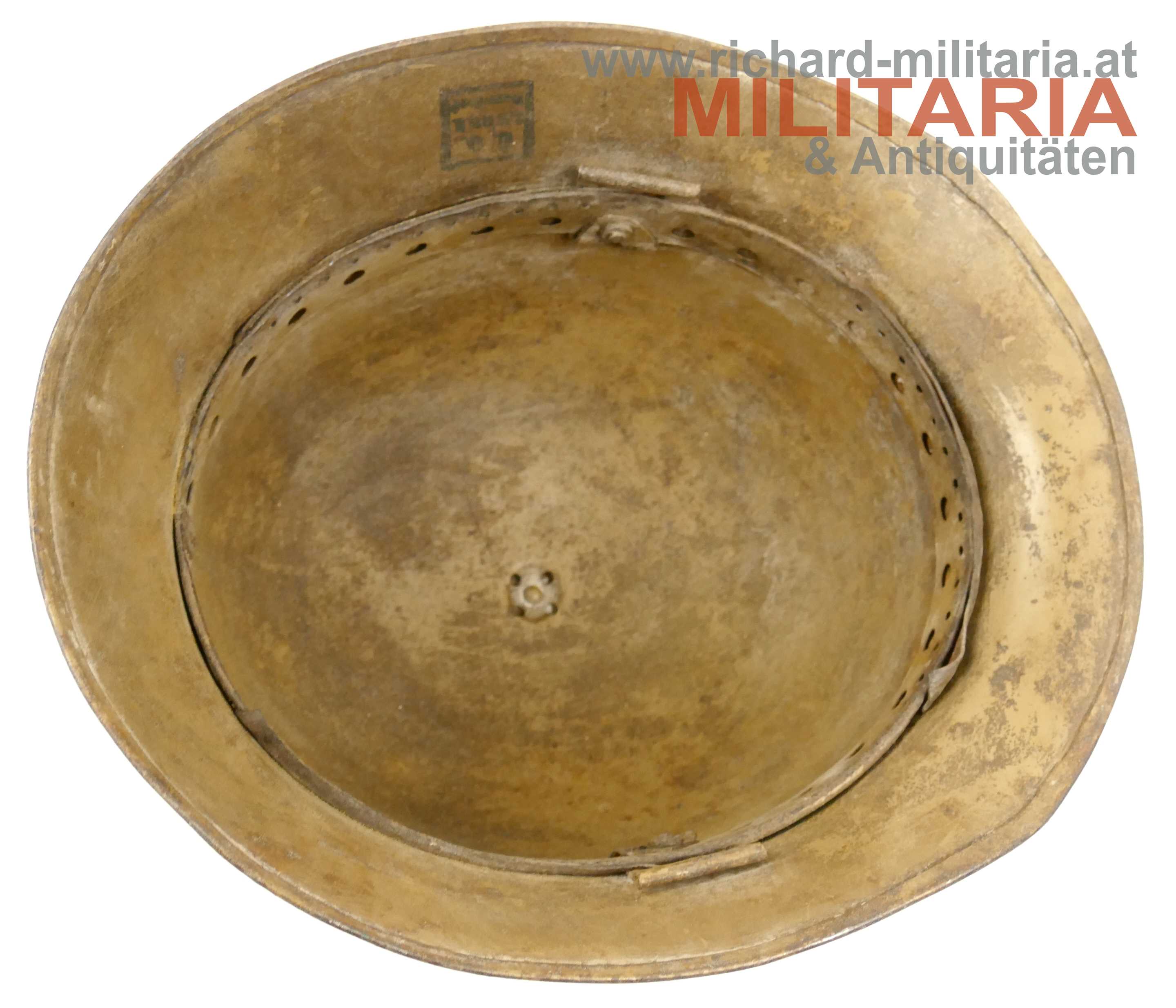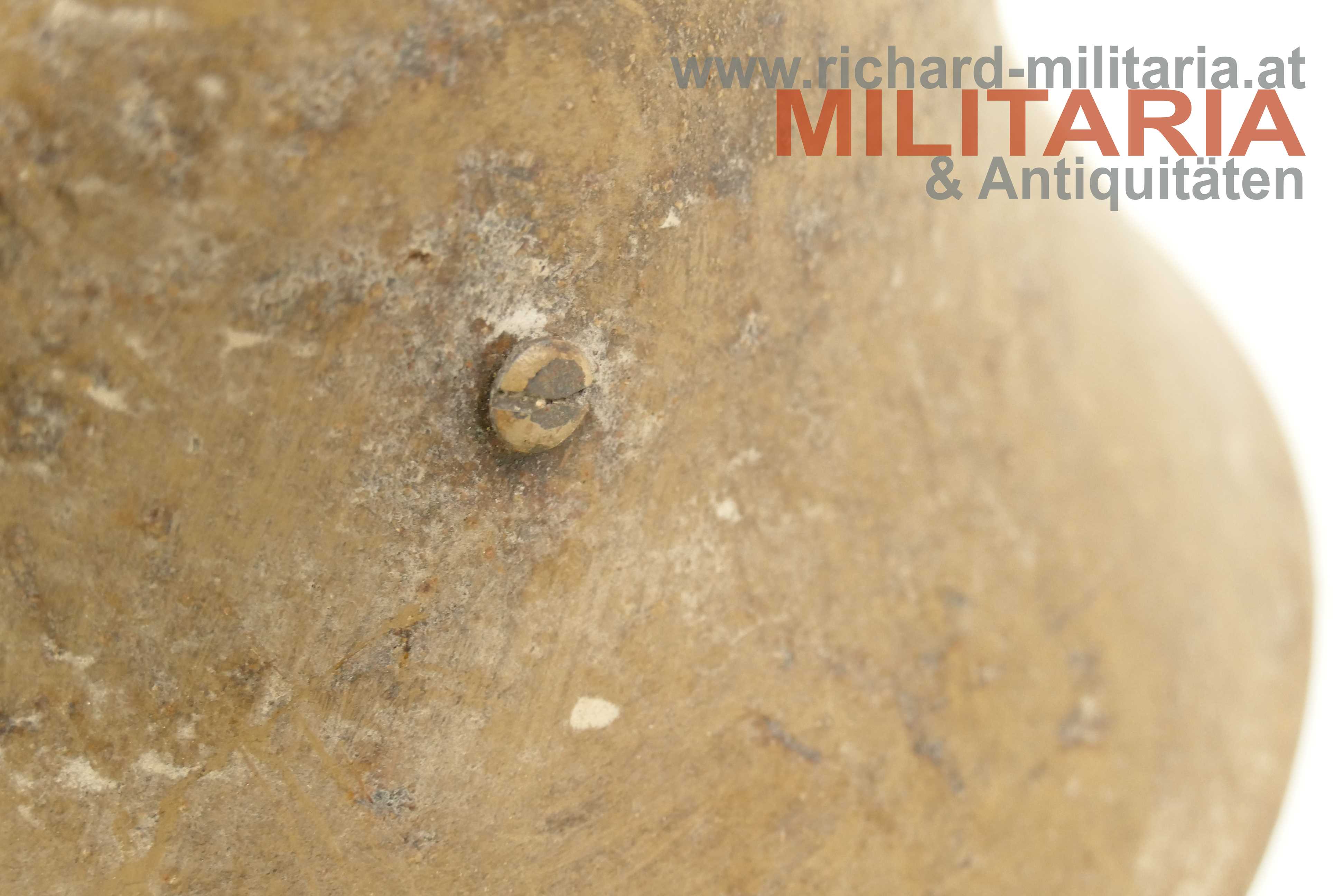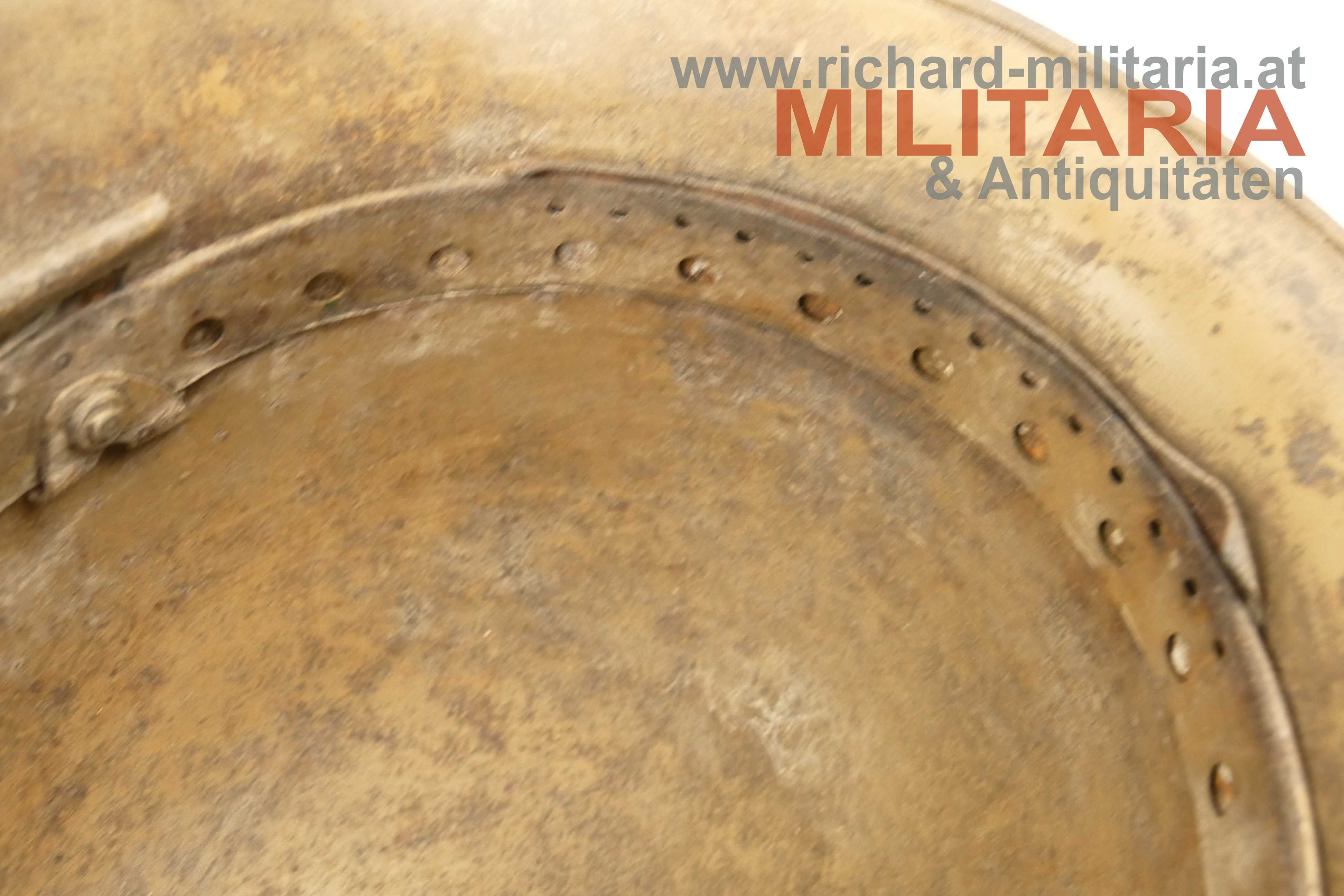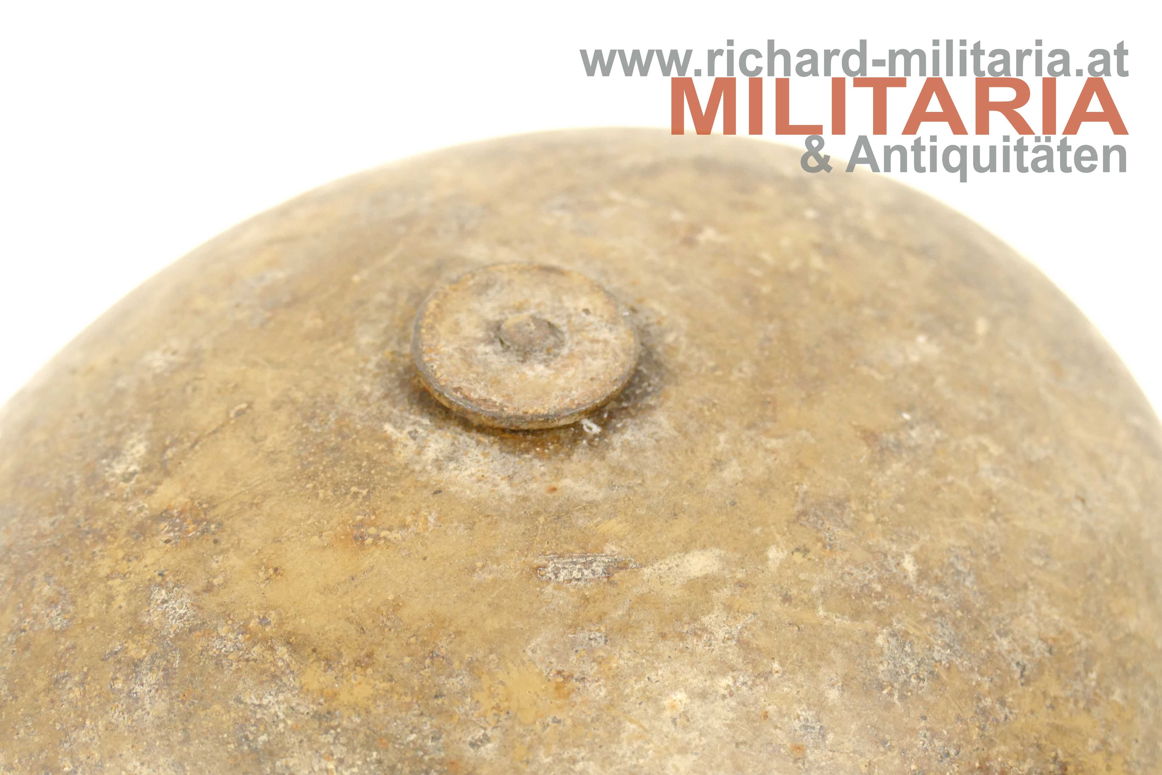 Österreichischer Stahlhelm System Berndorf (Österreichisches Muster), unberührter Fundzustand! Originale sandbraun lackierte Glocke in der typischen Form des System Berndorf mit der markanten Lüftungsöse am Scheitel; im Nacken eingeschlagener Berndorfer Bär und Größe "66"; Futterring aus Metall mit eingehängter Halterung für den Leinenkinnriemen; am Futterring noch Reste des Lederfutters; dieses wurde - warum auch immer - sauber mit einem glatten Schnitt herausgetrennt; innen auf der rechten Seite sehr schön der Stempel des Übernahme-Organs des k.u.k. Kriegsministeriums (!); umgebördelter Rand, Variante mit verschraubtem Futterring;