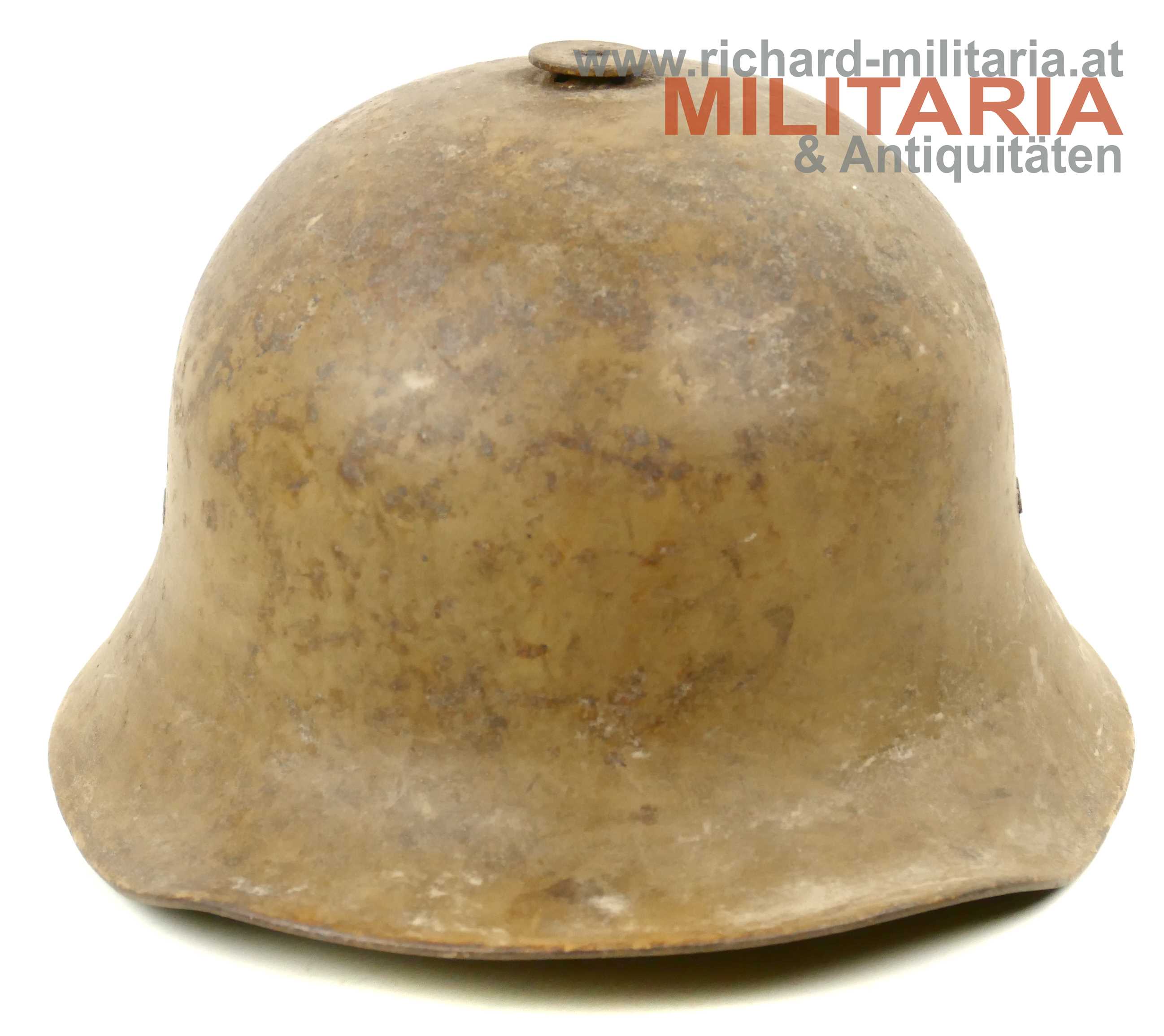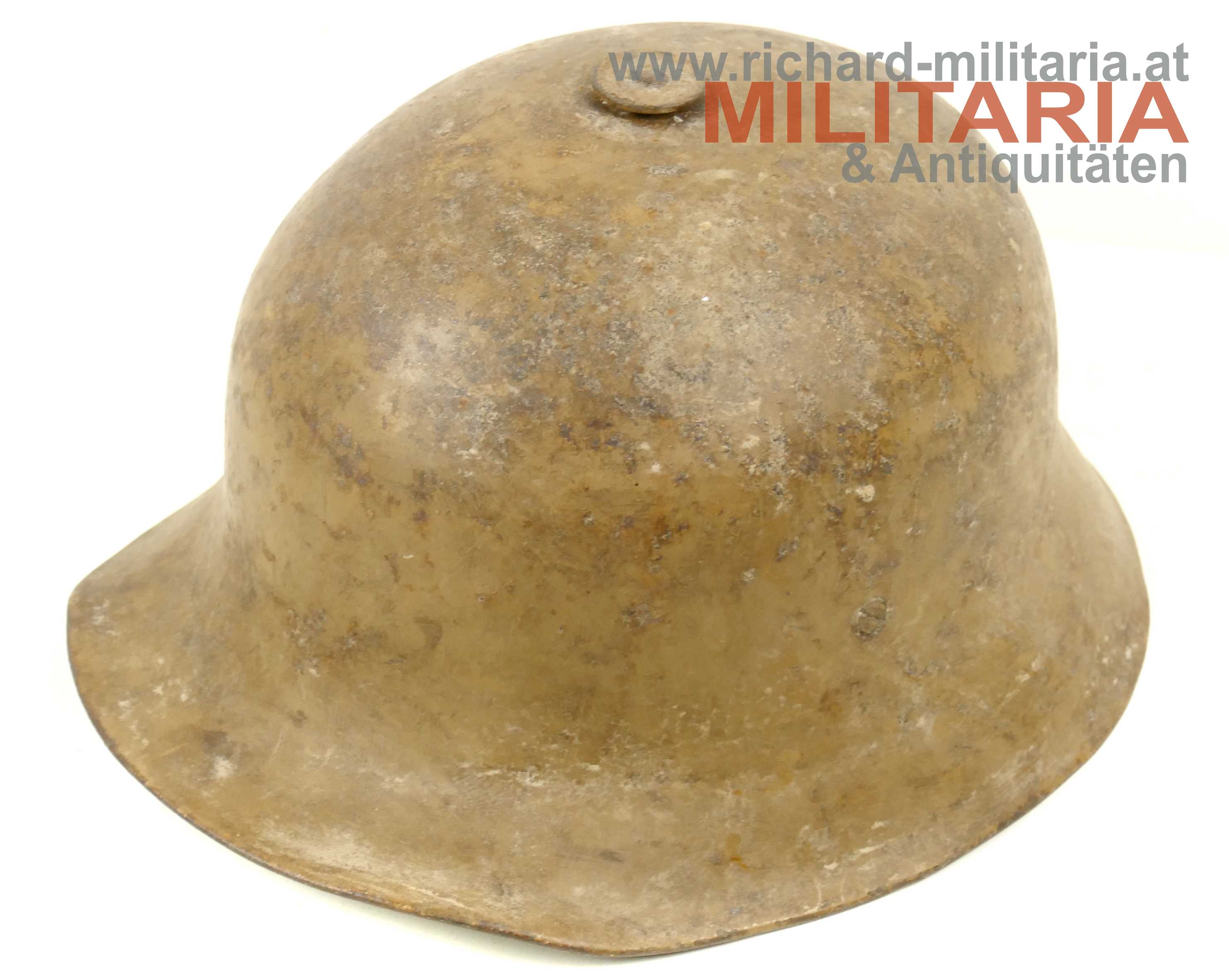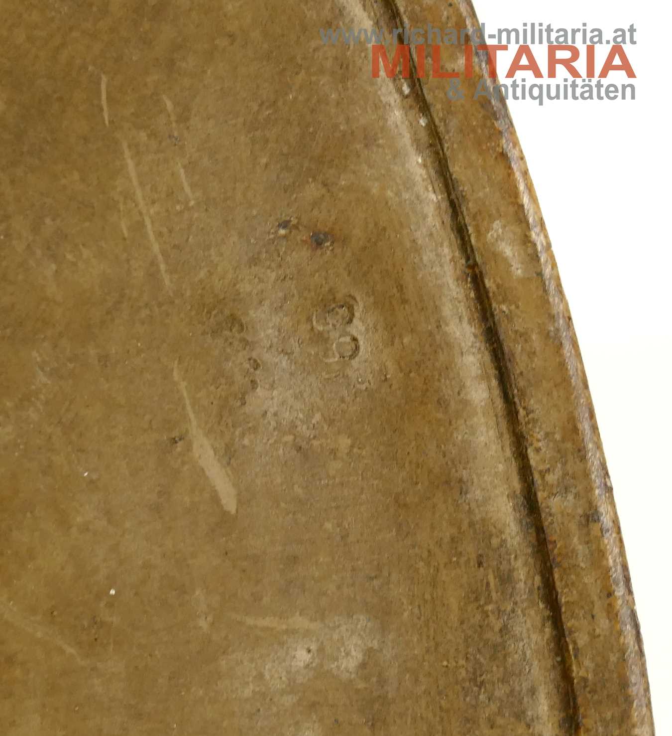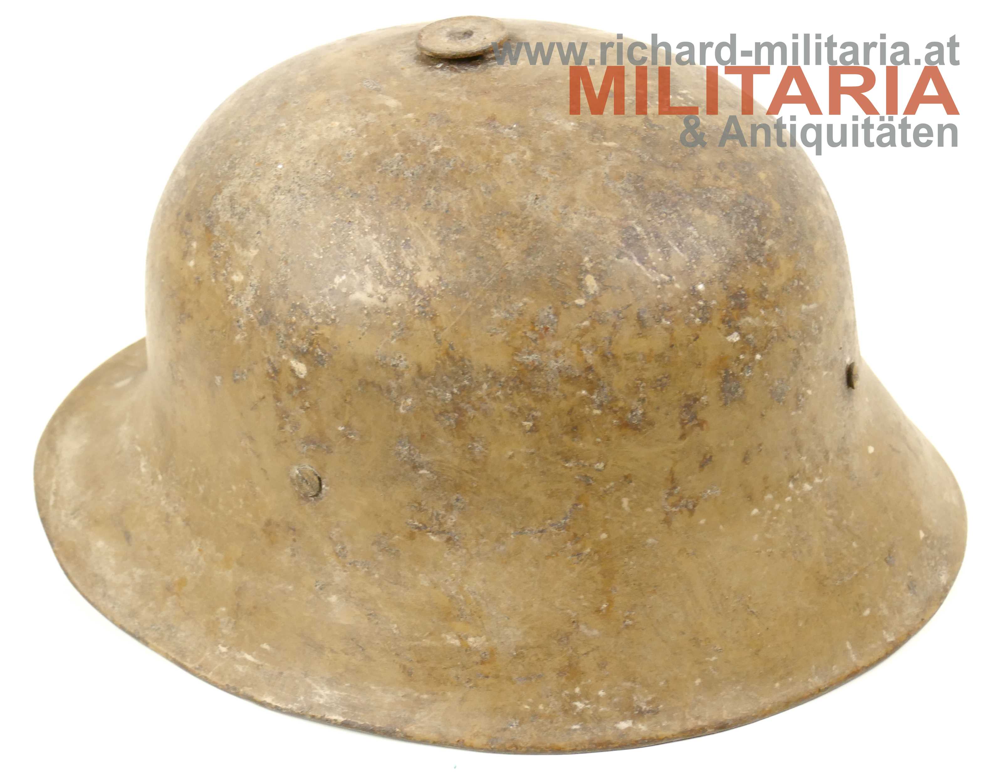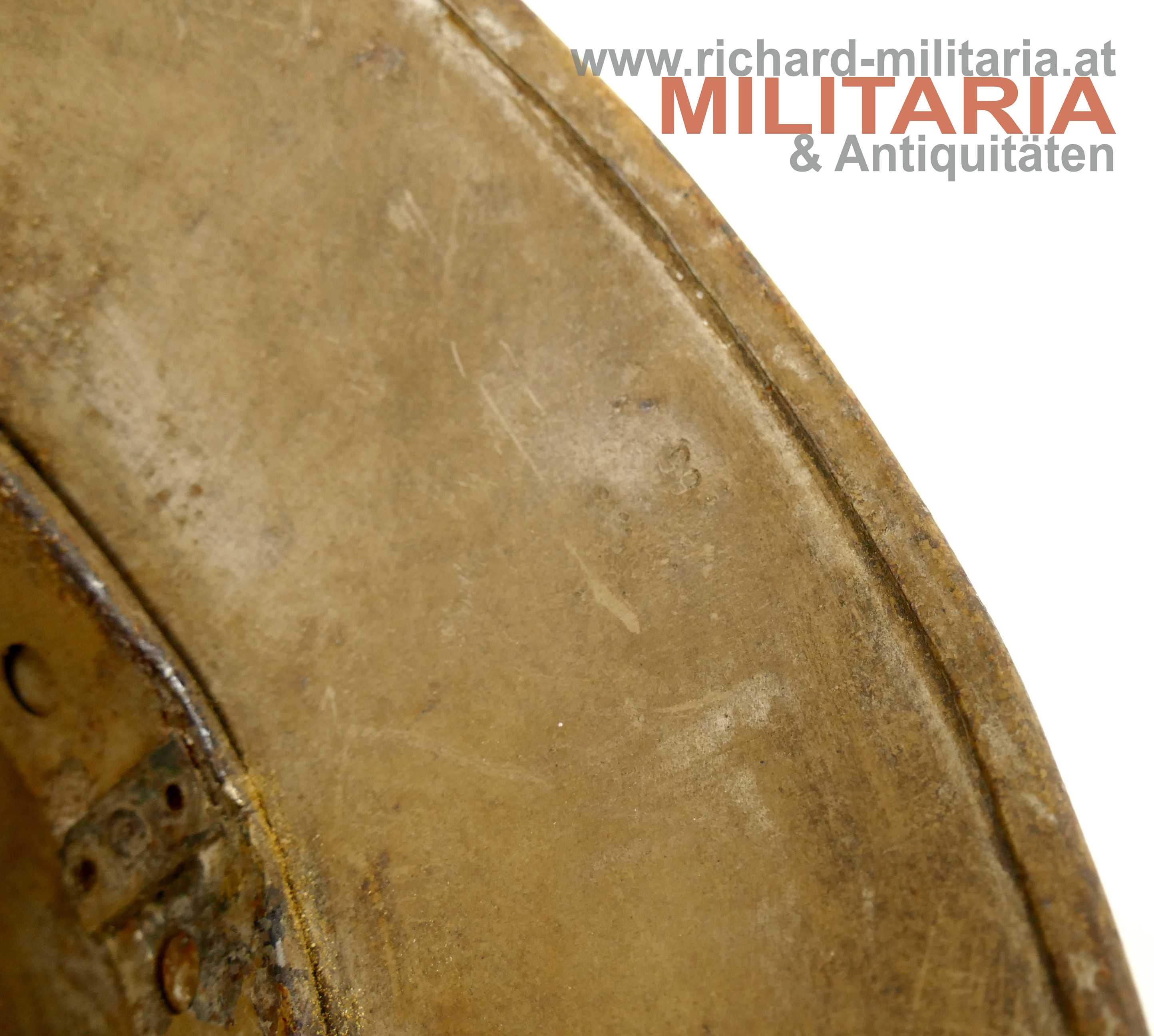 Österreichischer Stahlhelm System Berndorf (Österreichisches Muster), unberührter Fundzustand! Originale sandbraun lackierte Glocke in der typischen Form des System Berndorf mit der markanten Lüftungsöse am Scheitel; im Nacken eingeschlagener Berndorfer Bär und Größe "66"; Futterring aus Metall mit eingehängter Halterung für den Leinenkinnriemen; am Futterring noch Reste des Lederfutters; dieses wurde - warum auch immer - sauber mit einem glatten Schnitt herausgetrennt; innen auf der rechten Seite sehr schön der Stempel des Übernahme-Organs des k.u.k. Kriegsministeriums (!); umgebördelter Rand, Variante mit verschraubtem Futterring;