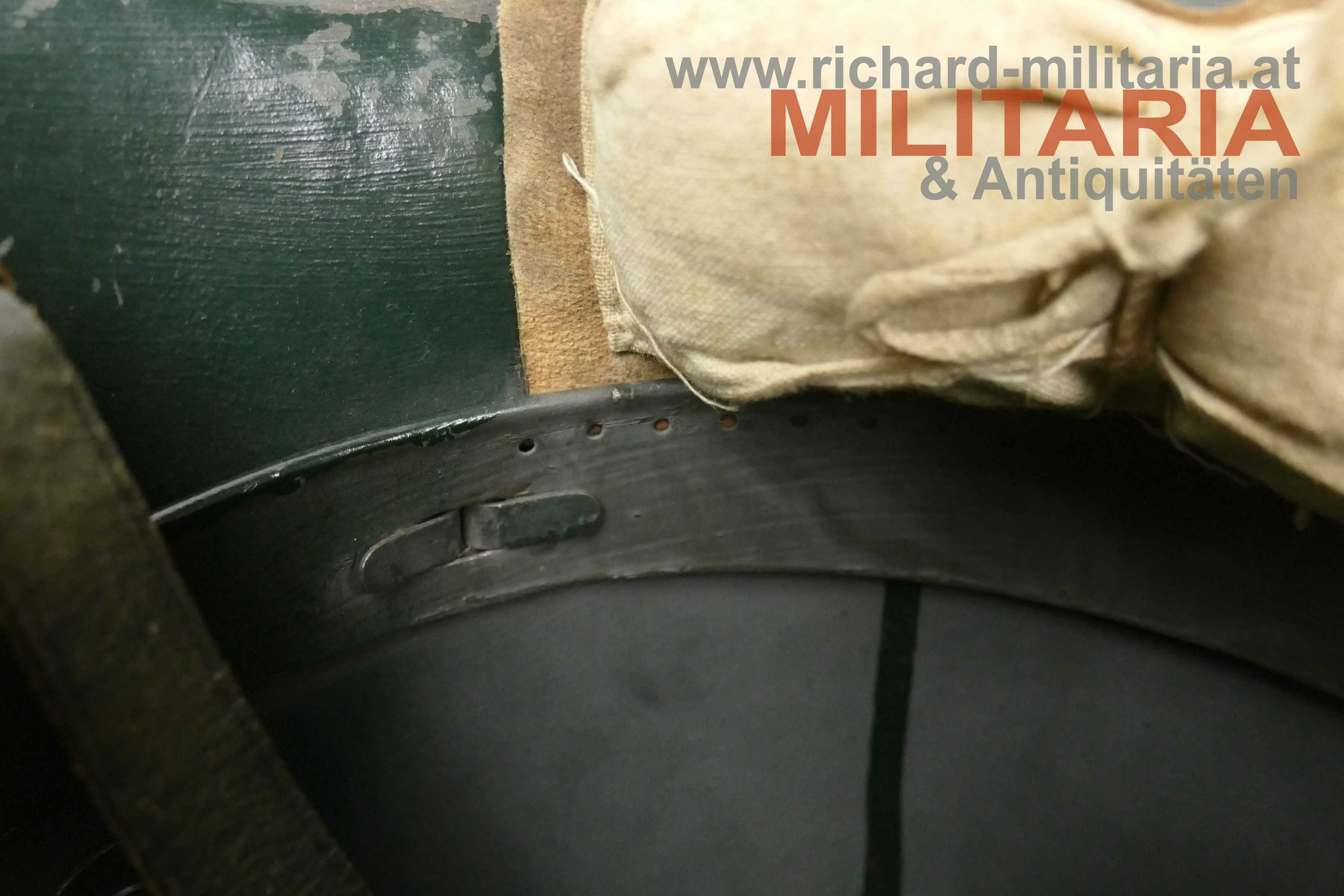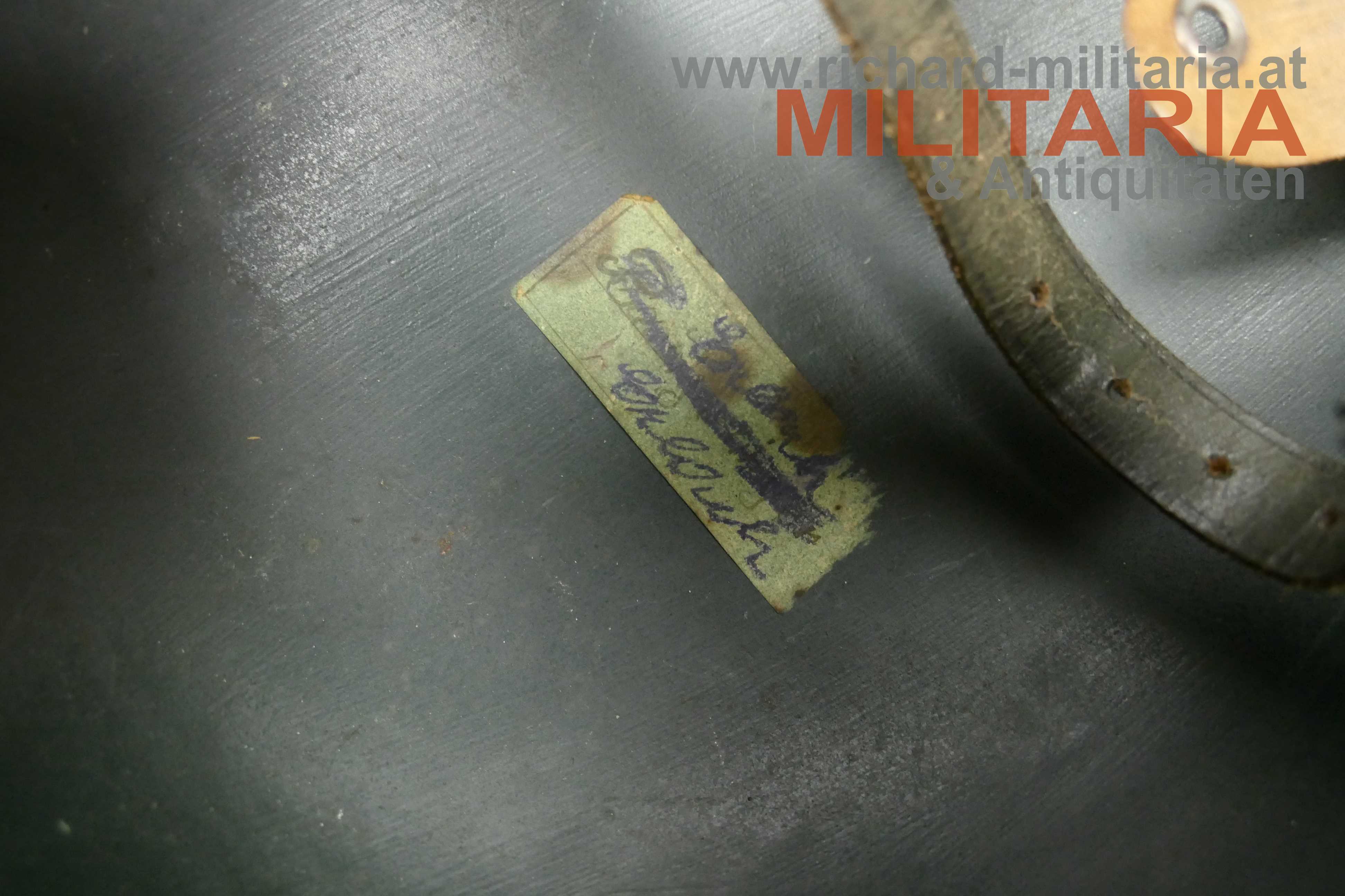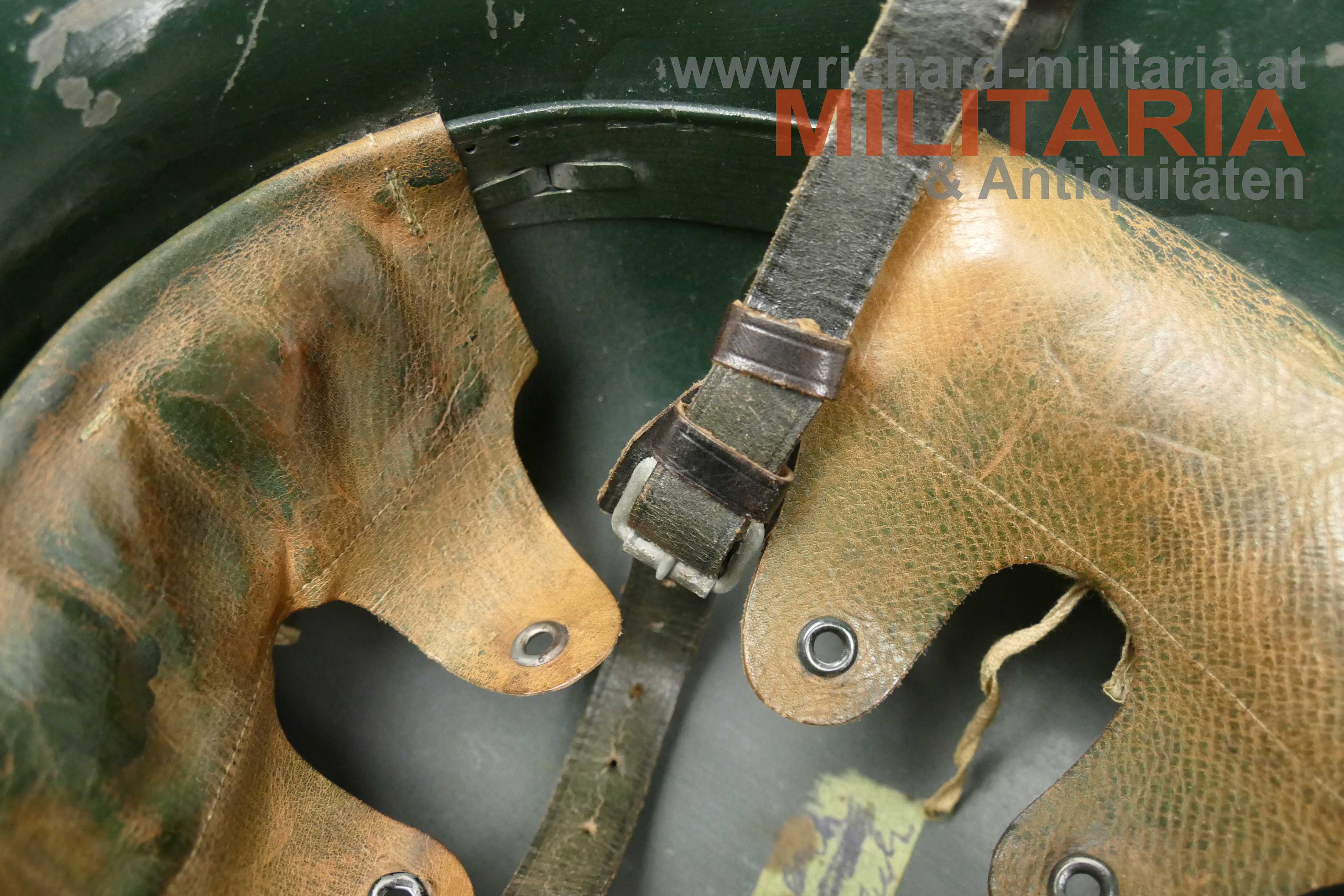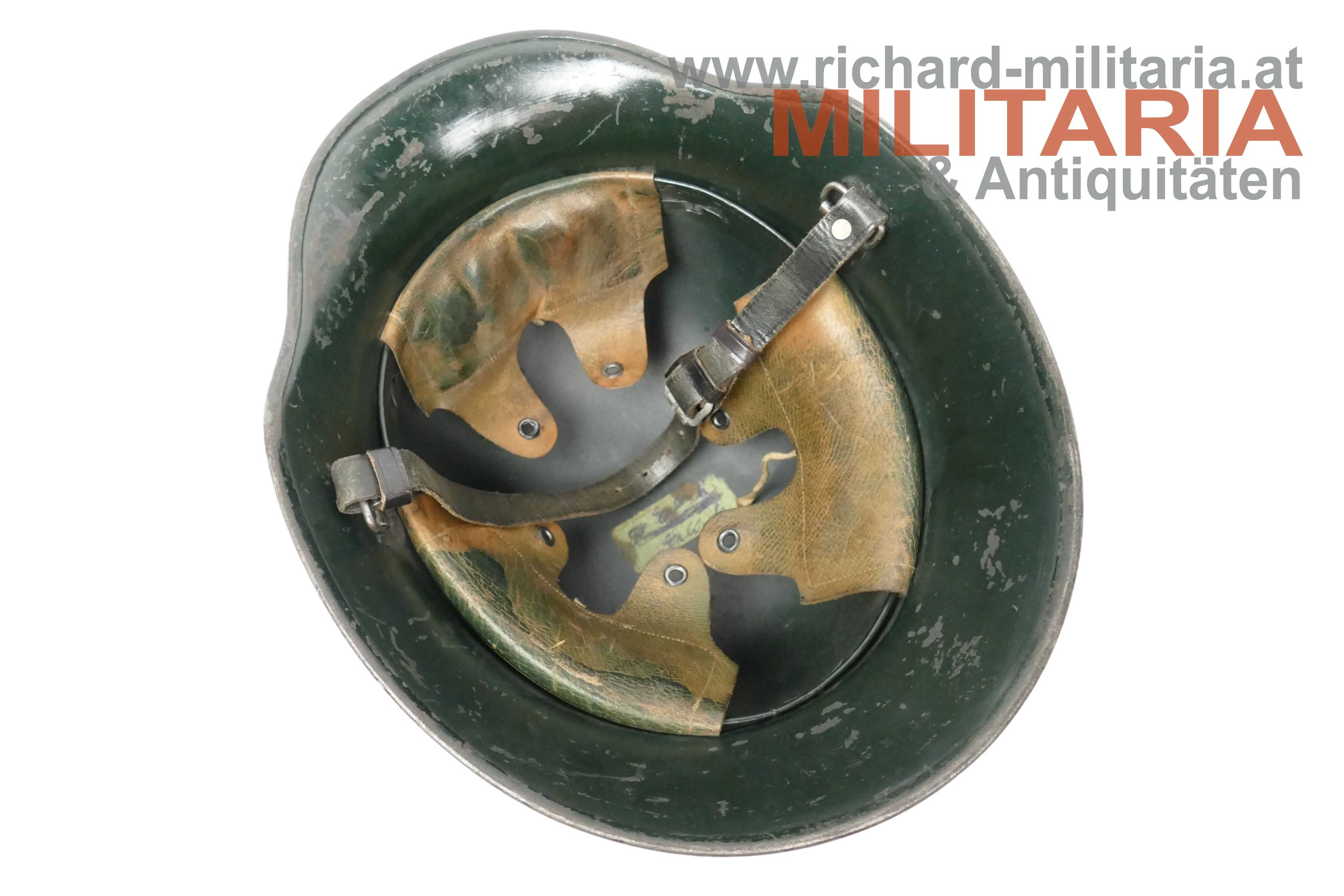 Stahlhelm M17 österreichisches Muster - weiterverwendet bei der Alarmabteilung der Sicherheitswache in Österreich in der 1. Republik; Helmglock außen graugrün lackiert; innen im Nackenbereich mit "LG K St" (Landesgendarmerie Kommando Steiermark) markiert; bis zum Helminnenring innen mit dunkelgrüner Farbe bemalt; dreiteiliges Lederinnenfutter mit Rosshaarpolsterung vorhanden; Lederkinnriemen aus der 1. Republik; innen in der Helmglocke ein eingeklebtes Etikett mit leider unleserlichem Namen;