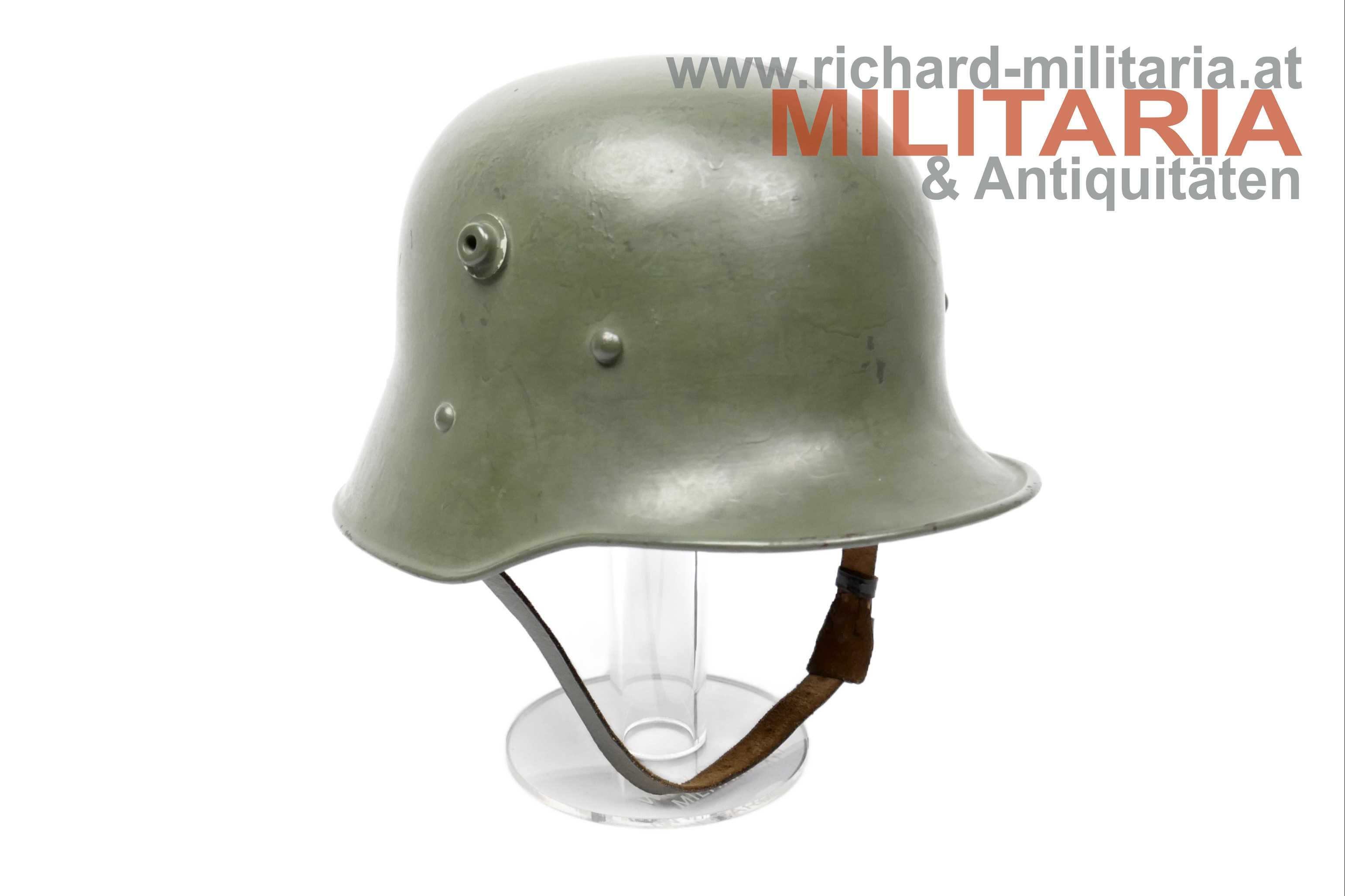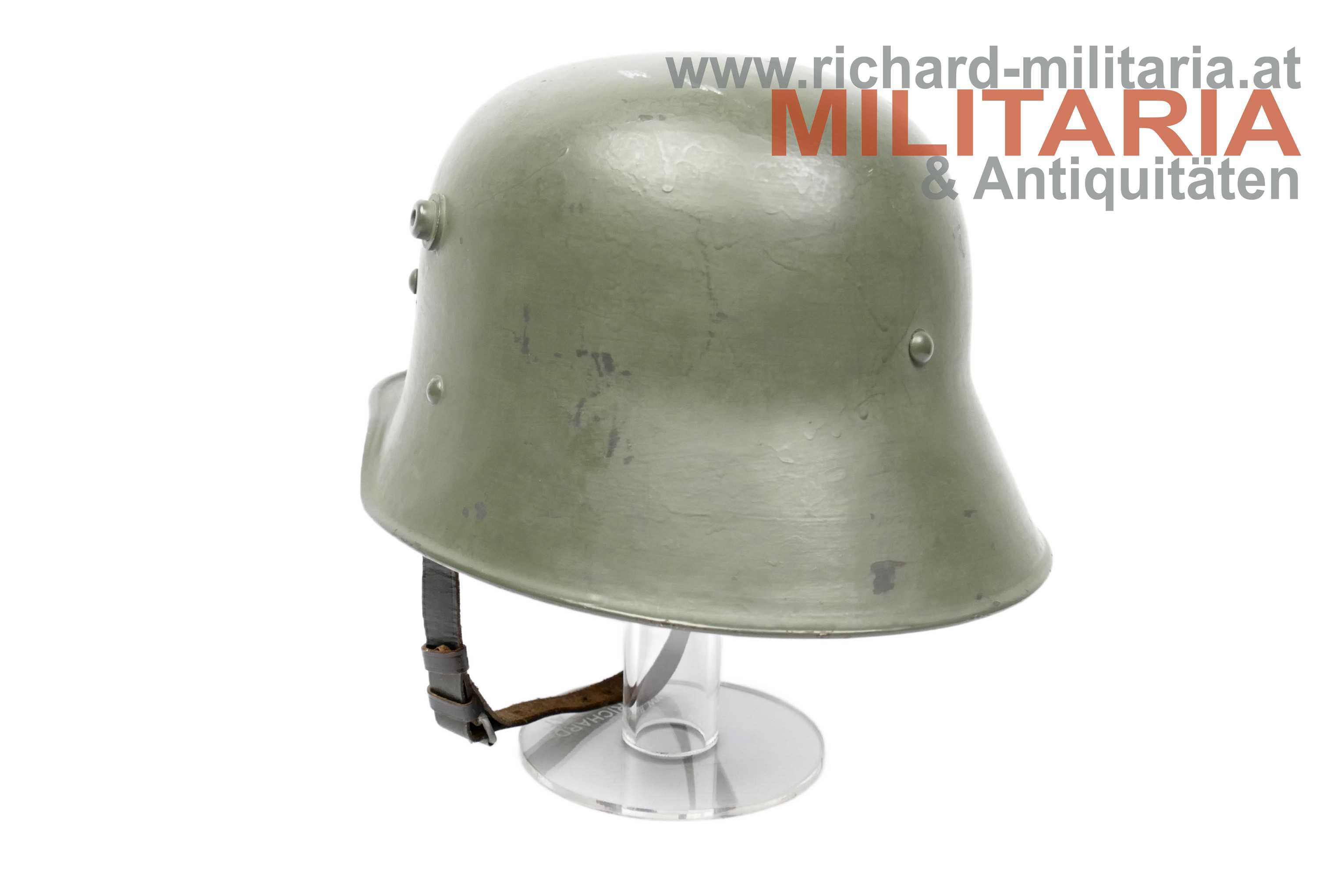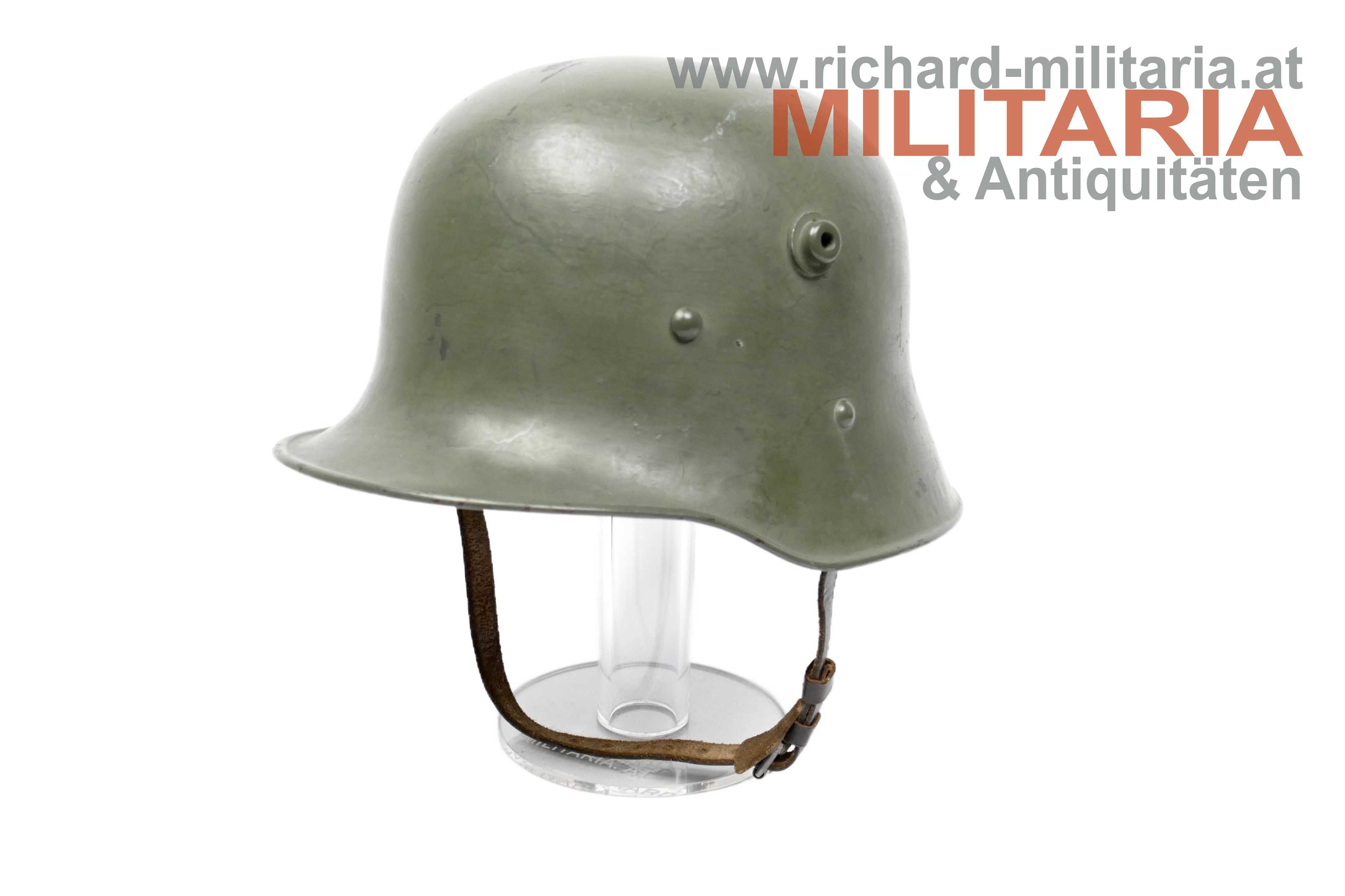 Stahlhelm M17 österreichisches Muster - weiterverwendet bei der Alarmabteilung der Sicherheitswache in Österreich in der 1. Republik; Helmglock außen graugrün lackiert; innen im Nackenbereich mit "LG K St" (Landesgendarmerie Kommando Steiermark) markiert; bis zum Helminnenring innen mit dunkelgrüner Farbe bemalt; dreiteiliges Lederinnenfutter mit Rosshaarpolsterung vorhanden; Lederkinnriemen aus der 1. Republik; innen in der Helmglocke ein eingeklebtes Etikett mit leider unleserlichem Namen;
