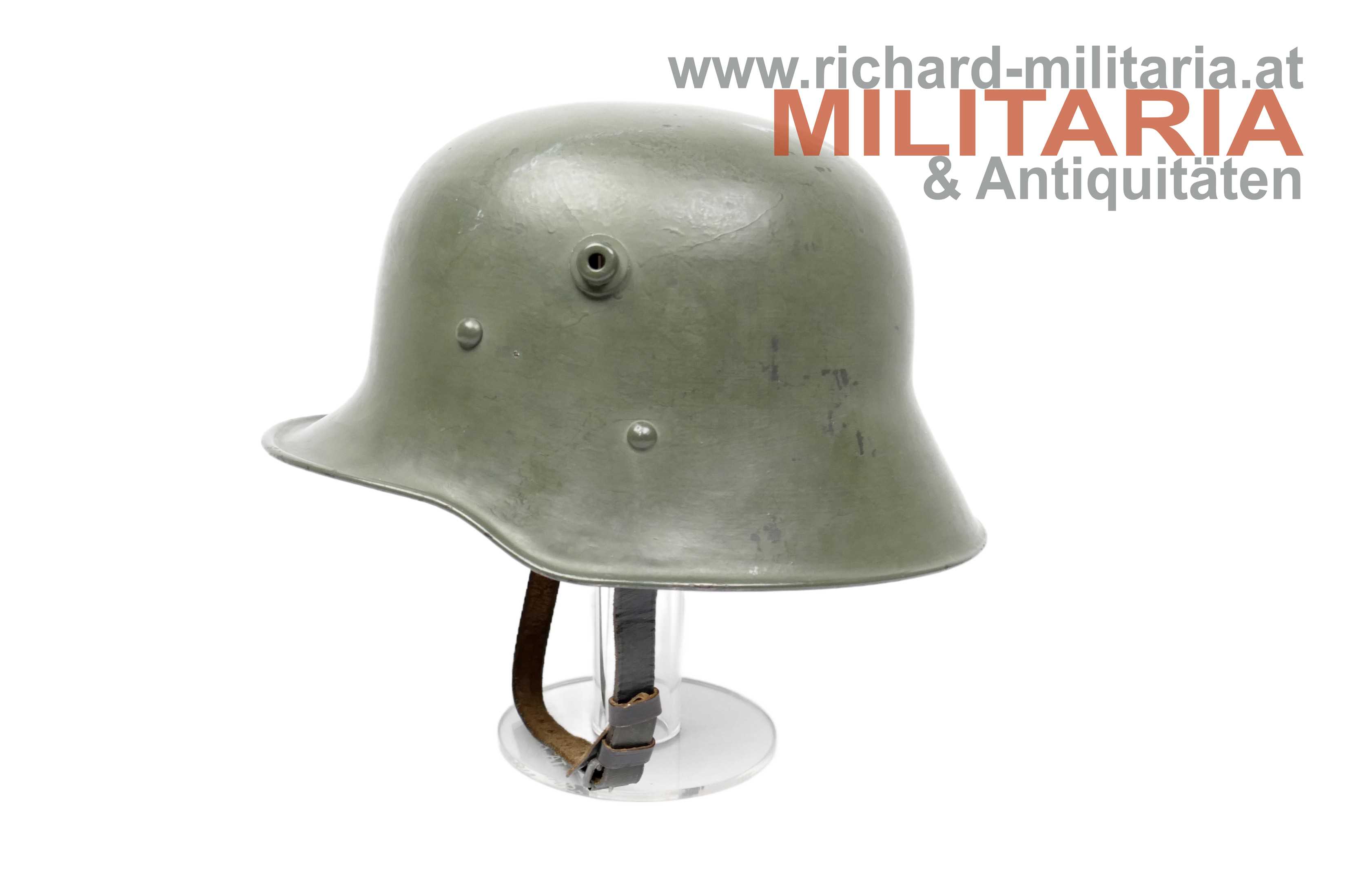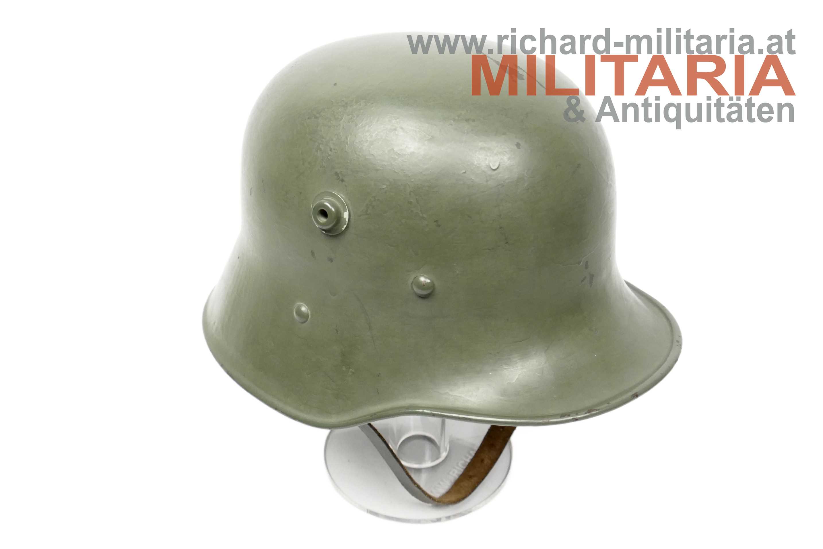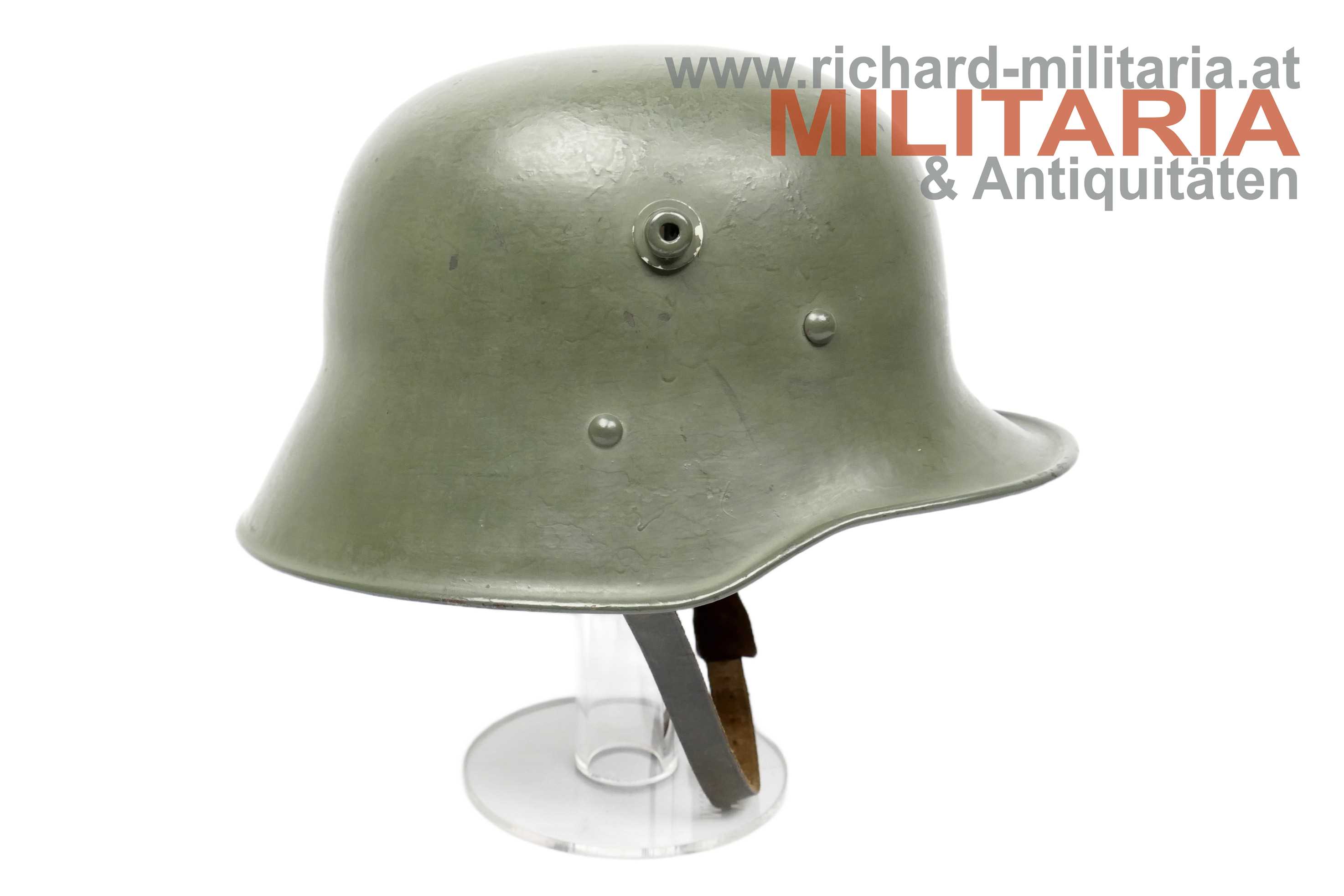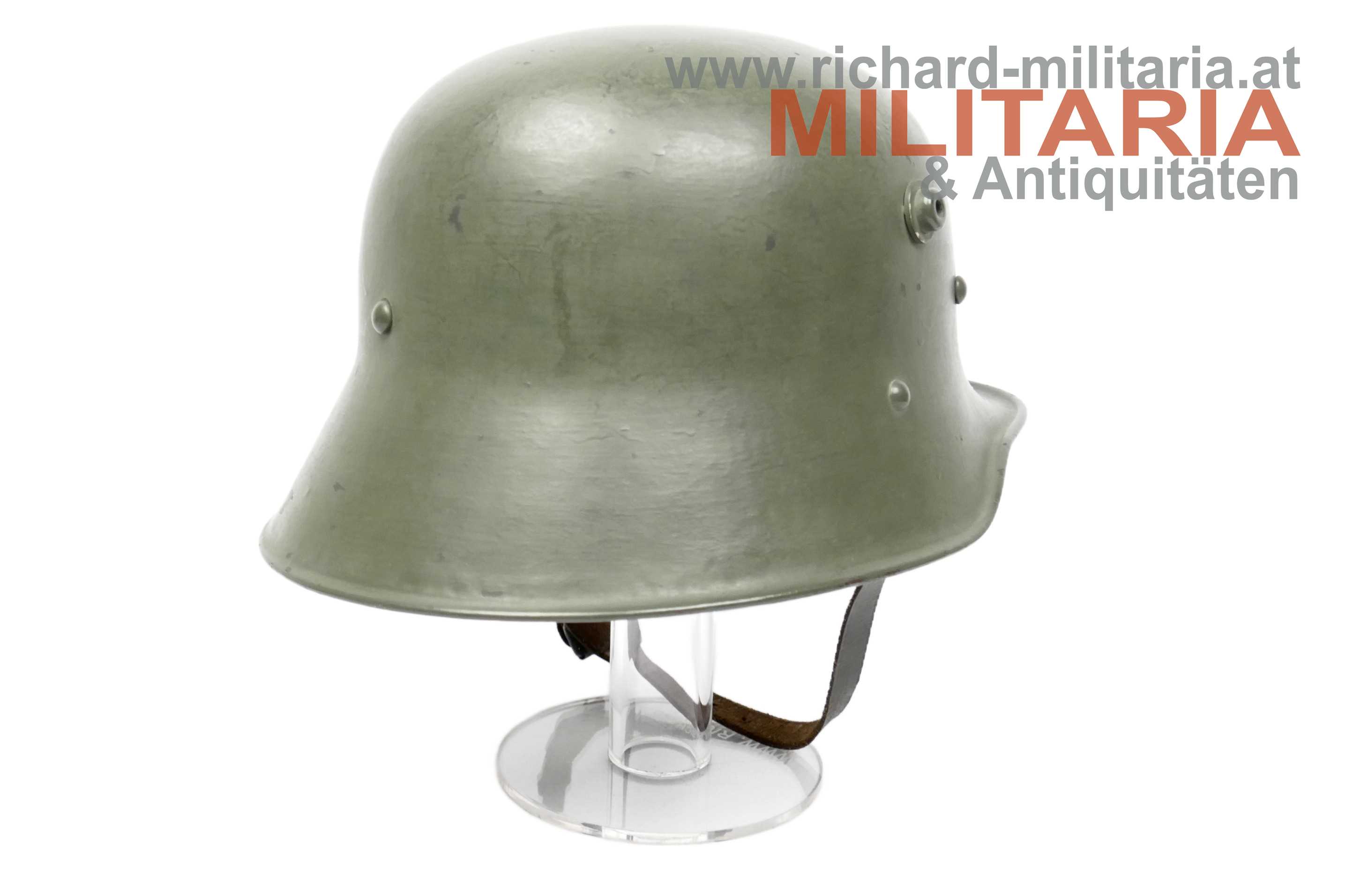 Stahlhelm M17 österreichisches Muster - weiterverwendet bei der Alarmabteilung der Sicherheitswache in Österreich in der 1. Republik; Helmglock außen graugrün lackiert; innen im Nackenbereich mit "LG K St" (Landesgendarmerie Kommando Steiermark) markiert; bis zum Helminnenring innen mit dunkelgrüner Farbe bemalt; dreiteiliges Lederinnenfutter mit Rosshaarpolsterung vorhanden; Lederkinnriemen aus der 1. Republik; innen in der Helmglocke ein eingeklebtes Etikett mit leider unleserlichem Namen;