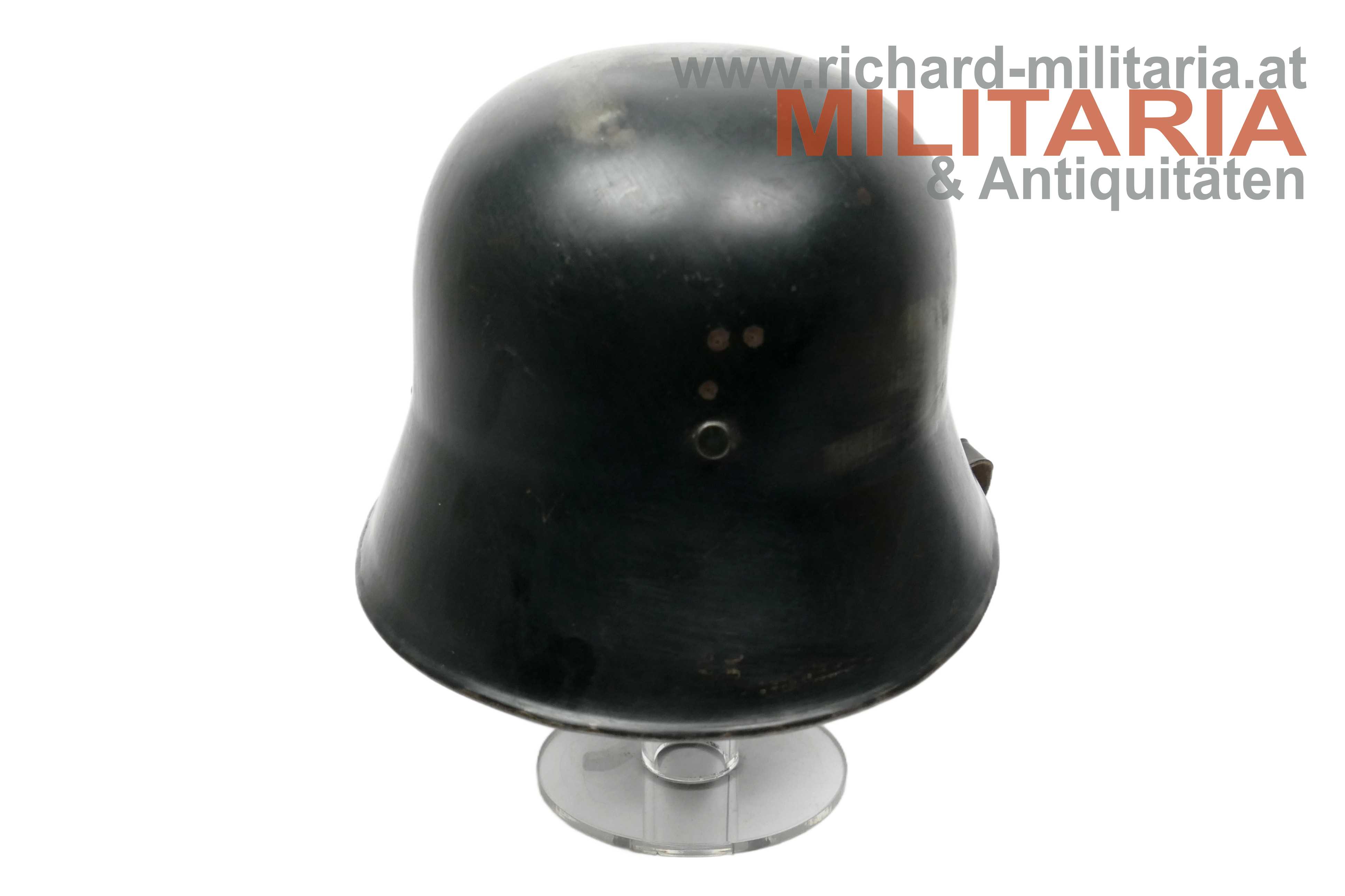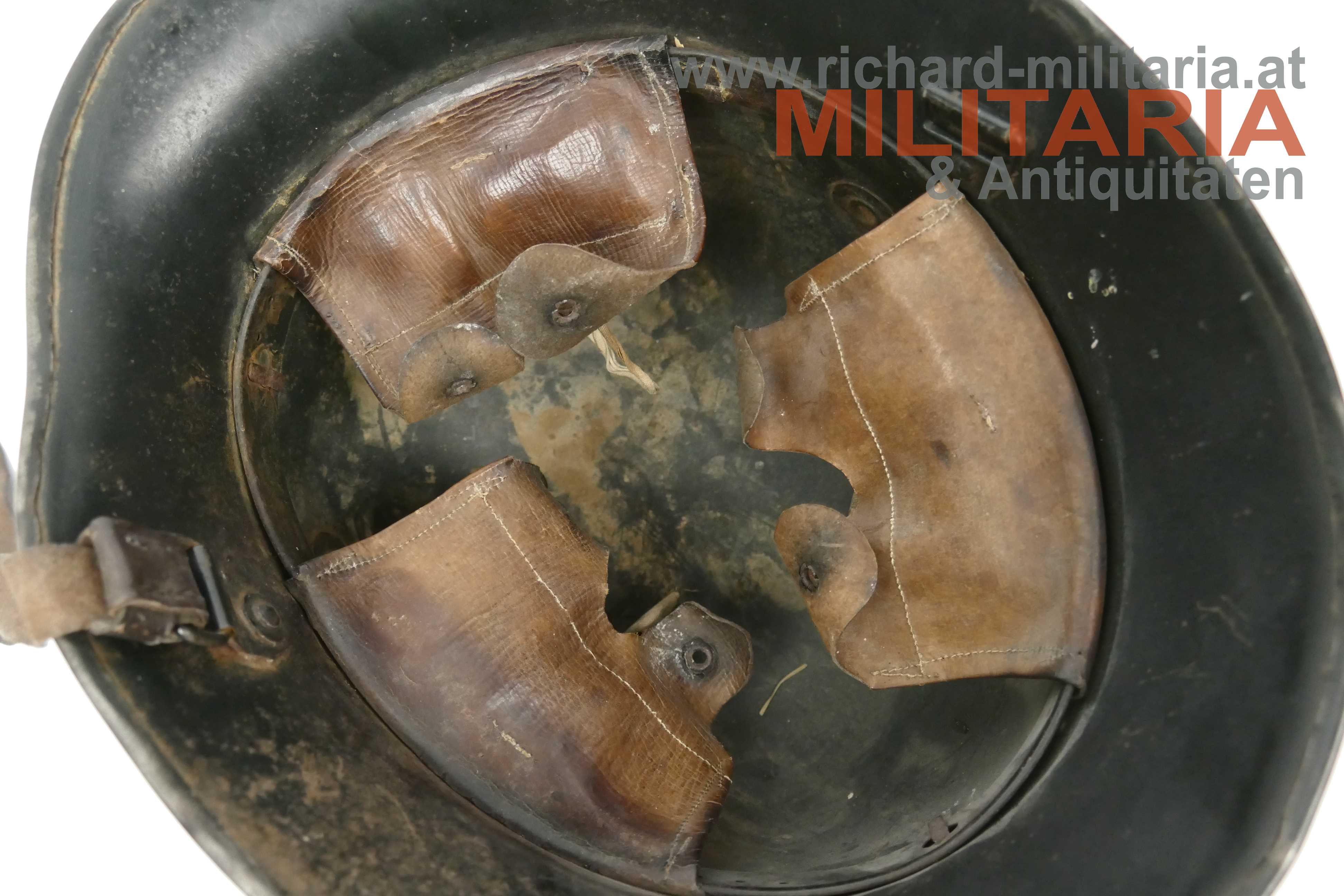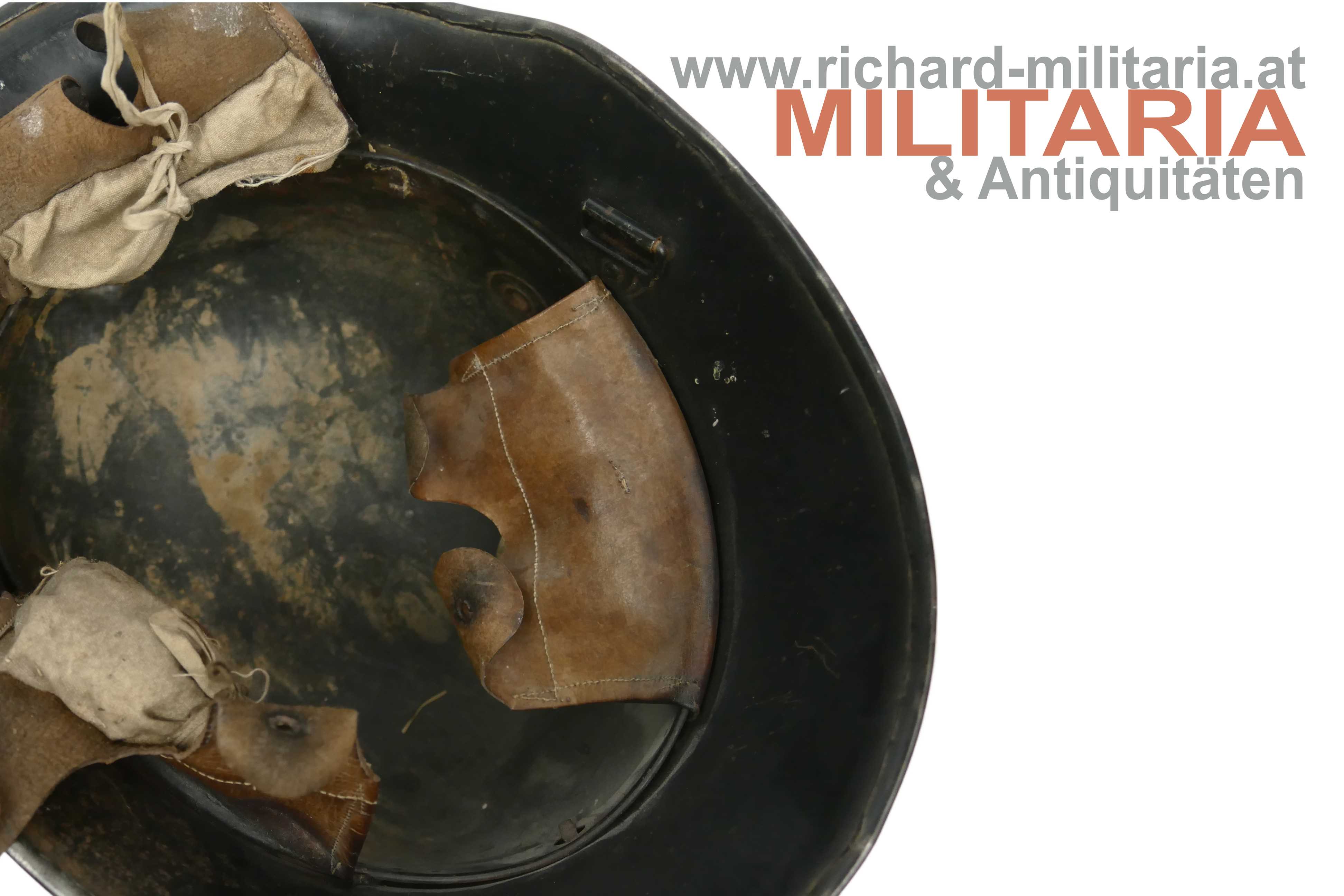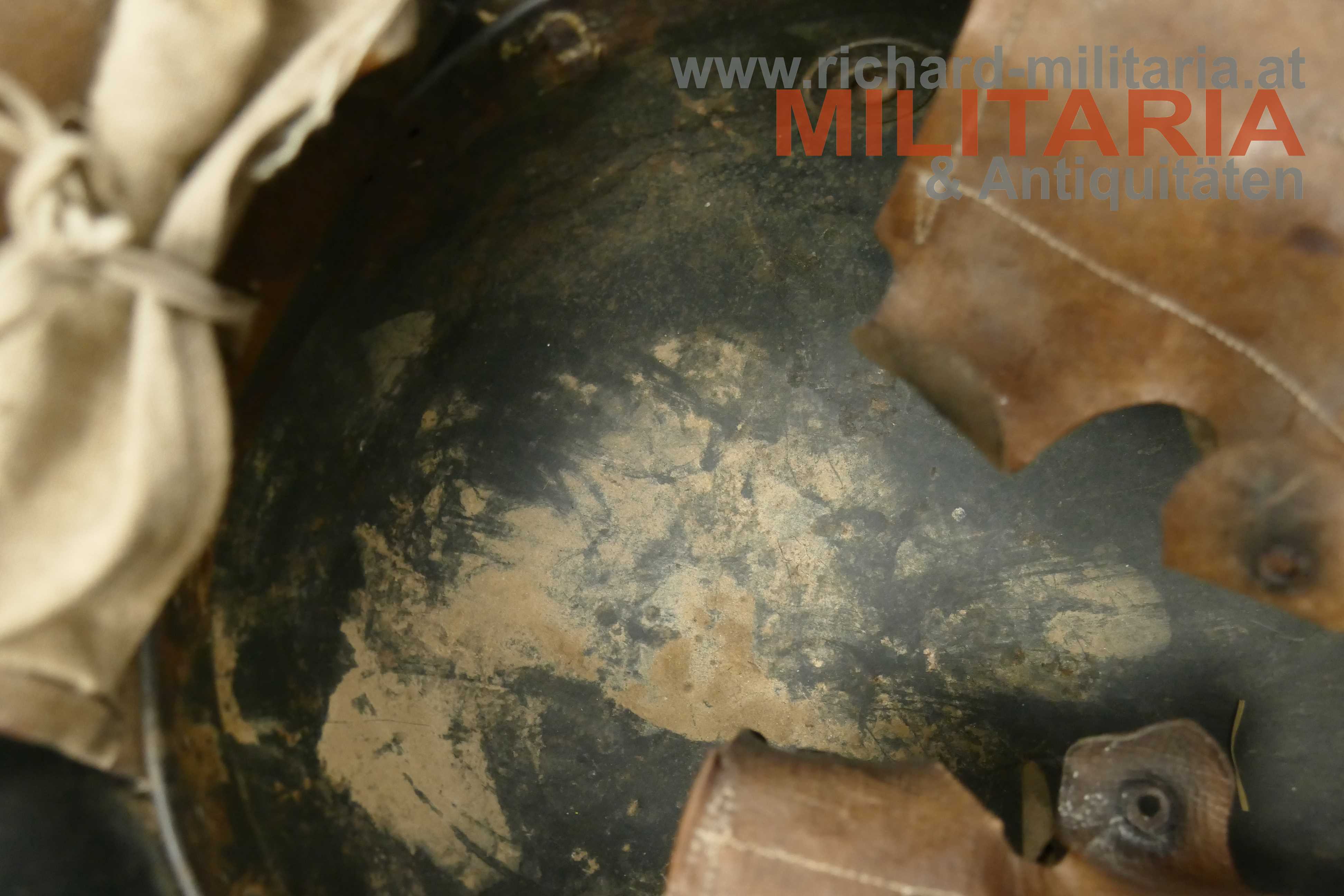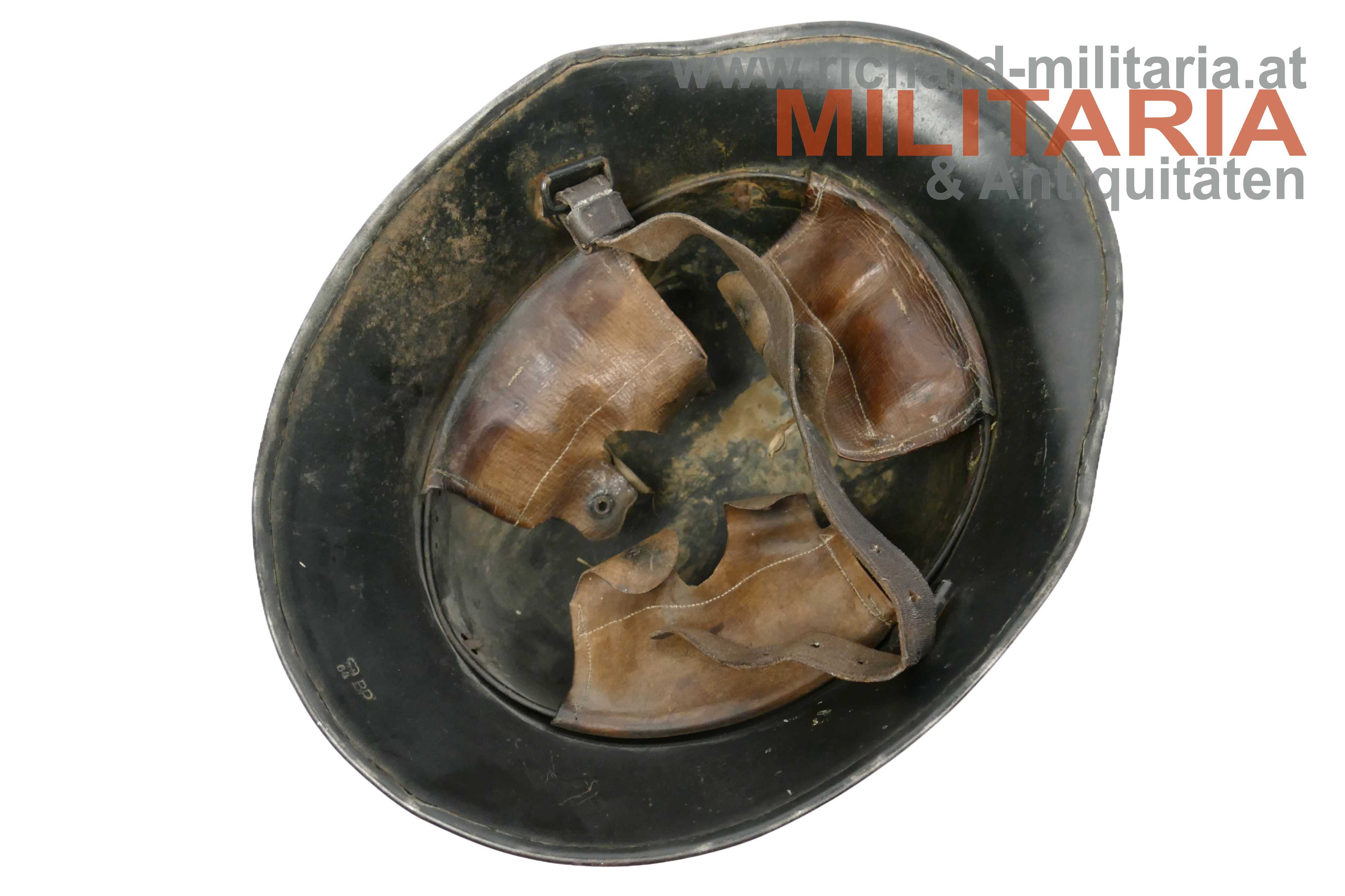 Stahlhelm M17 österreichisches Muster - weiterverwendet bei der Bundespolizei in Österreich in der 1. Republik/ Ständestaat bzw. frühen Nachkriegszeit; Helmglock außen und innen schwarz brüniert (!); innen im Nackenbereich mit dem Berndorfer-Bär, der Größe 64 und "BP" (Bundespolizei) gestempelt; originales dreiteiliges Lederinnenfutter mit Rosshaarpolsterung vorhanden; der lange Teil des Lederkinnriemens vorhanden - kurze Gegenschließe fehlt; innen verschmutzt. Außen die Brünierung teilweise durch Reinigen entfernt und ein paar kleine Dellen.