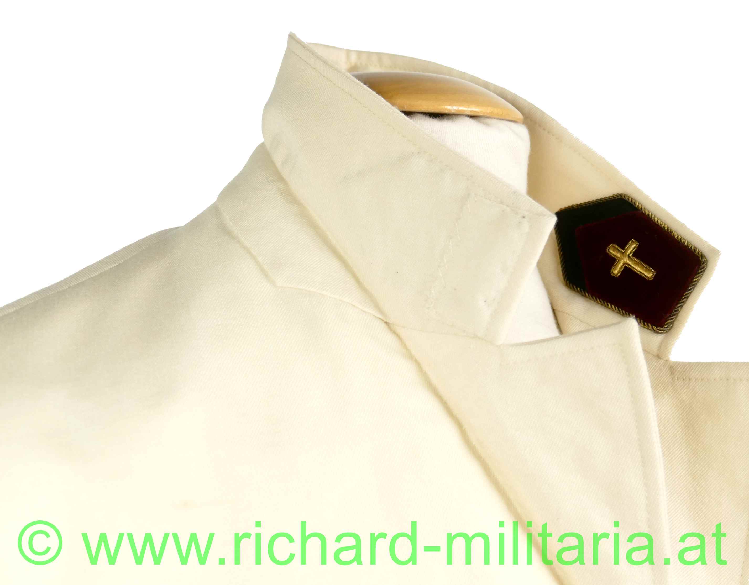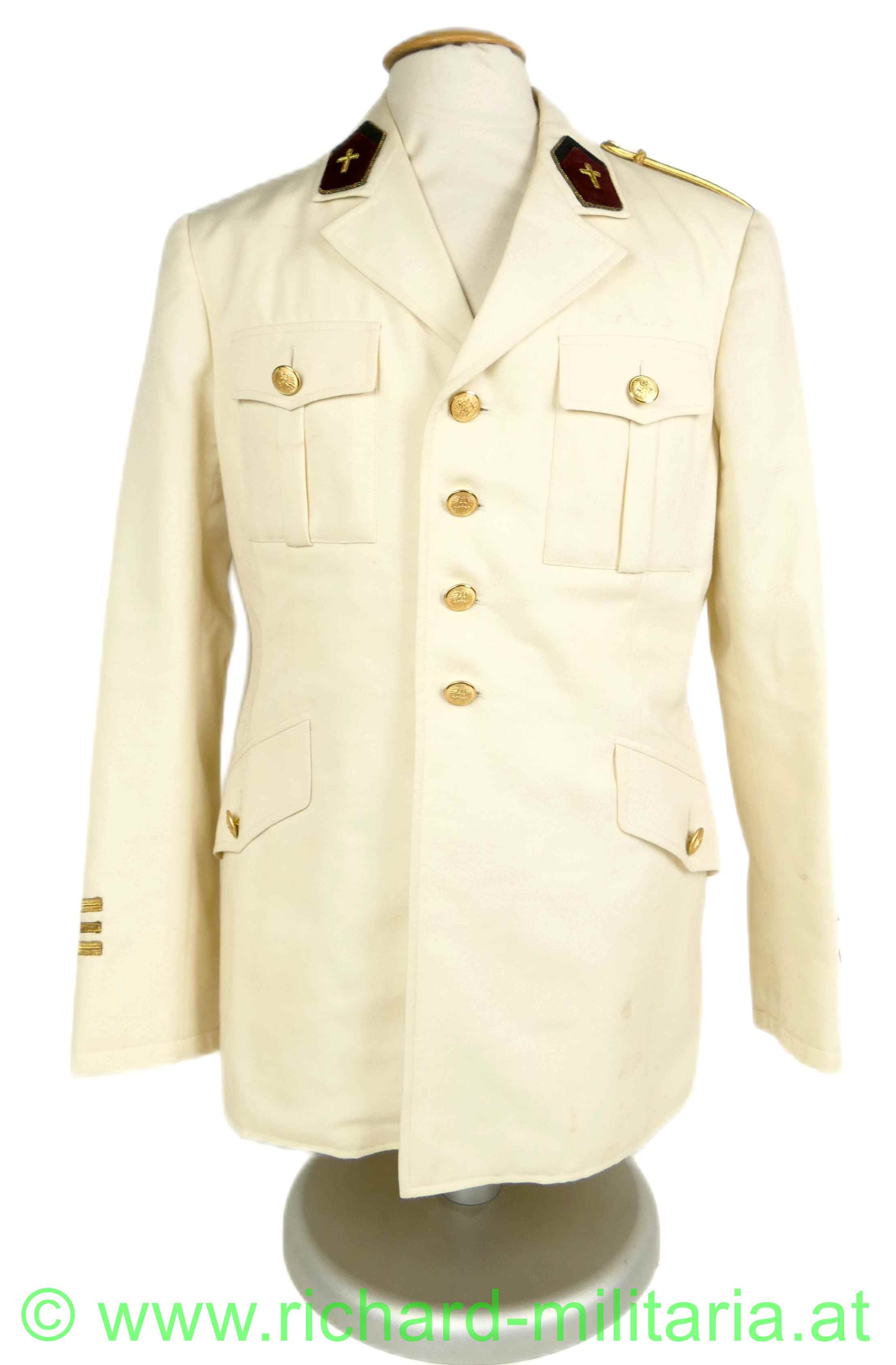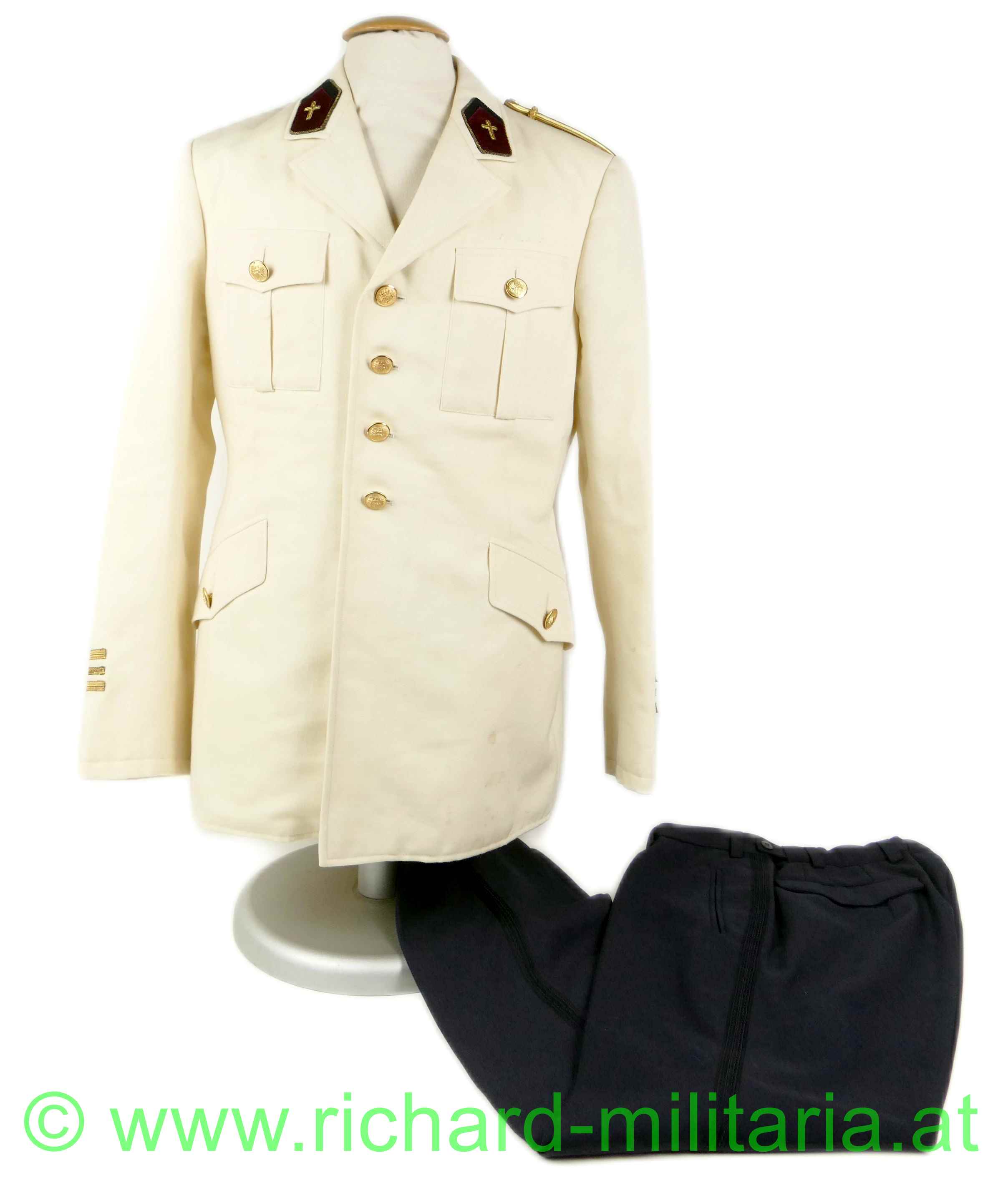 Gesellschaftsanzug (weiße Uniform) eines Offiziers der Militärseelsorge im Intendanzdienst (weinrot/schwarz); weiße Uniformjacke mit goldener Achselspange, schwarze Hose mit schwarzer Paspelierung; Schneideretikett im Inneren der Jacke;