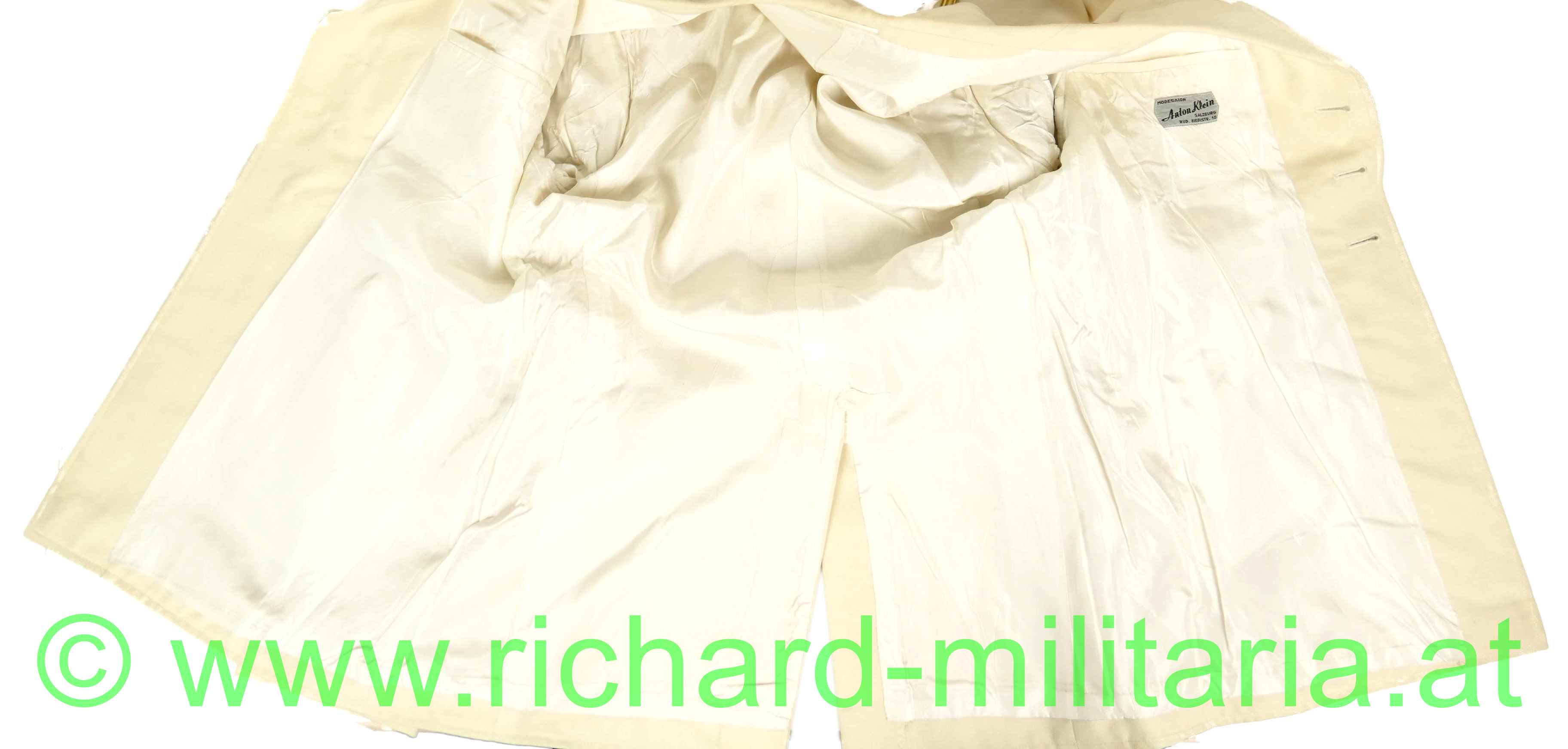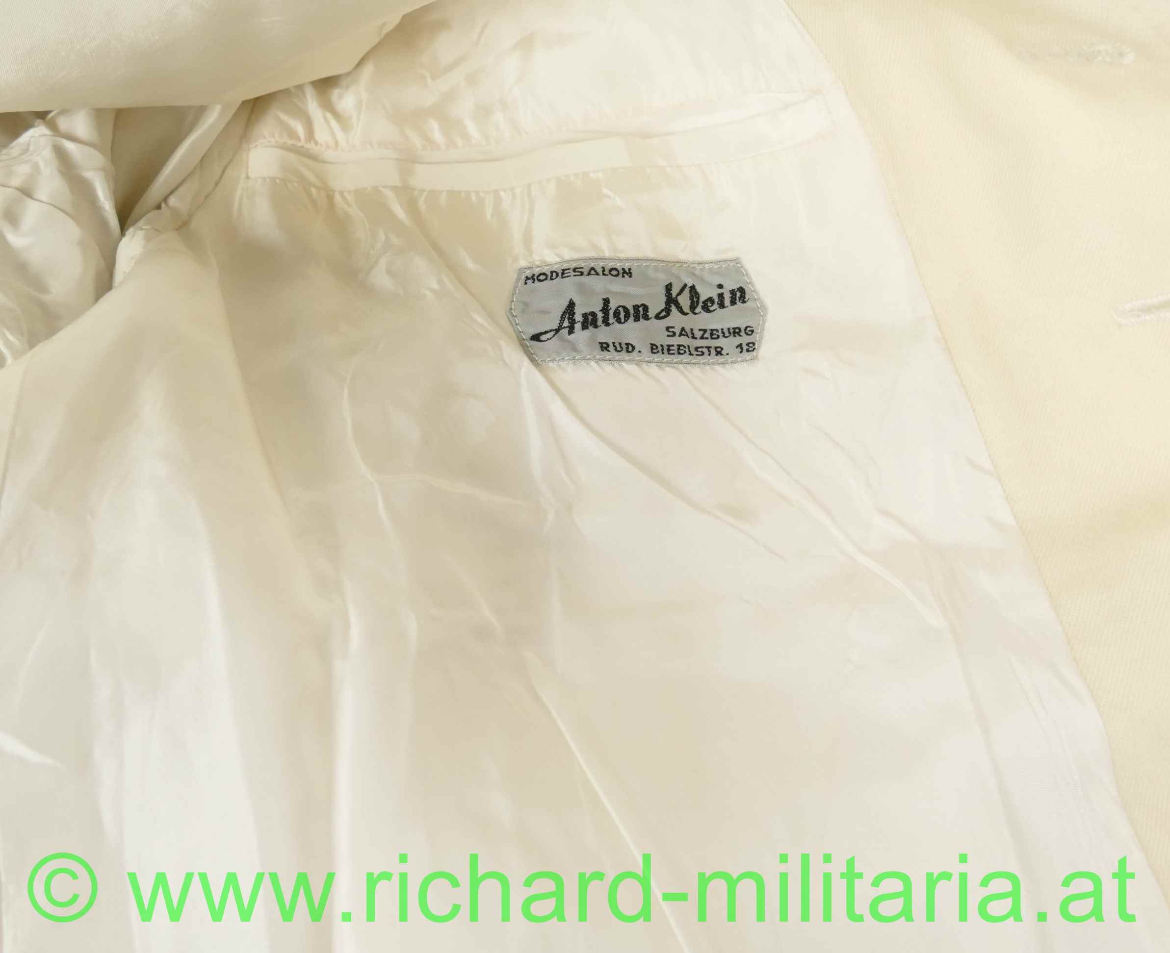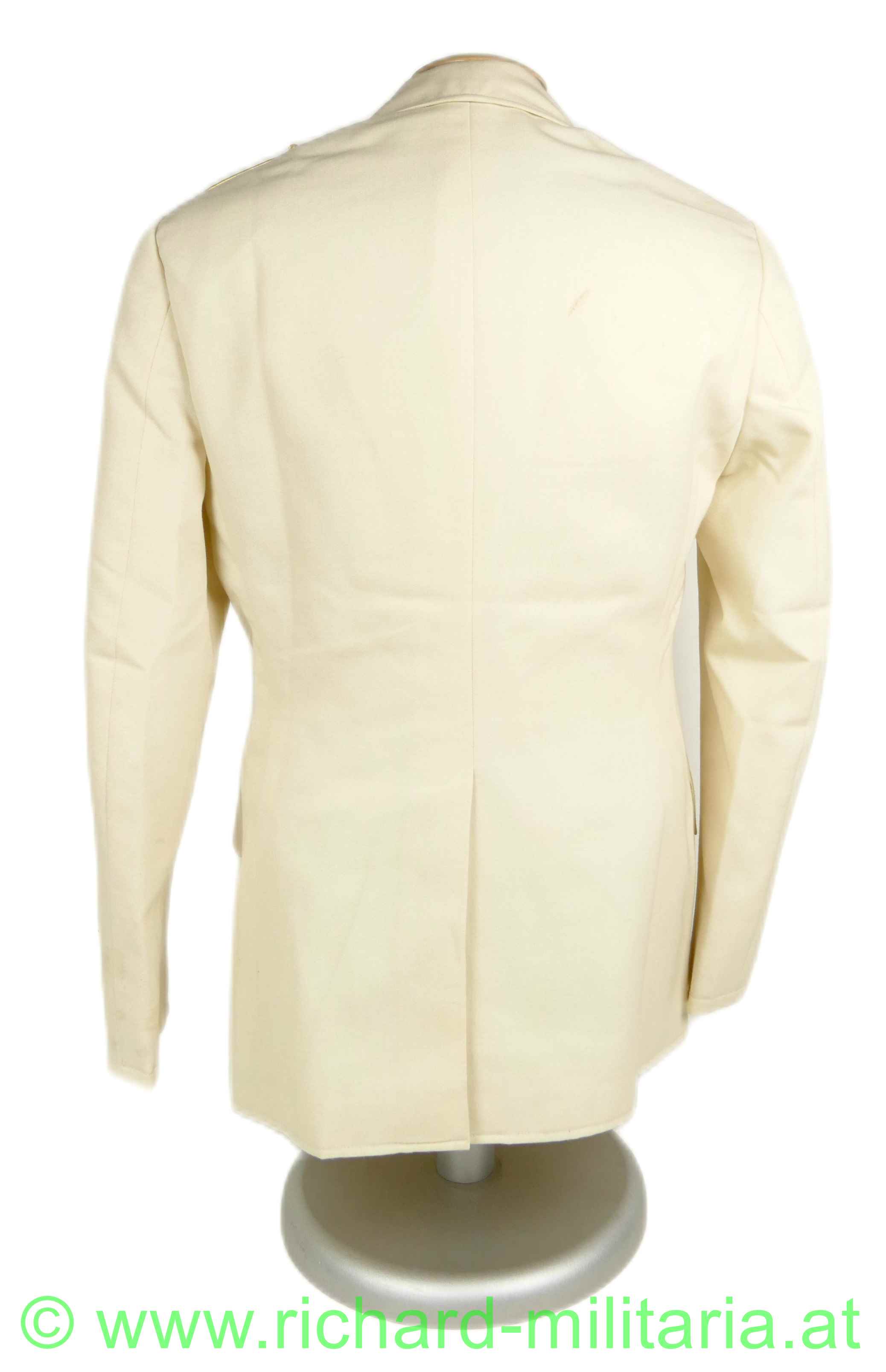 Gesellschaftsanzug (weiße Uniform) eines Offiziers der Militärseelsorge im Intendanzdienst (weinrot/schwarz); weiße Uniformjacke mit goldener Achselspange, schwarze Hose mit schwarzer Paspelierung; Schneideretikett im Inneren der Jacke;