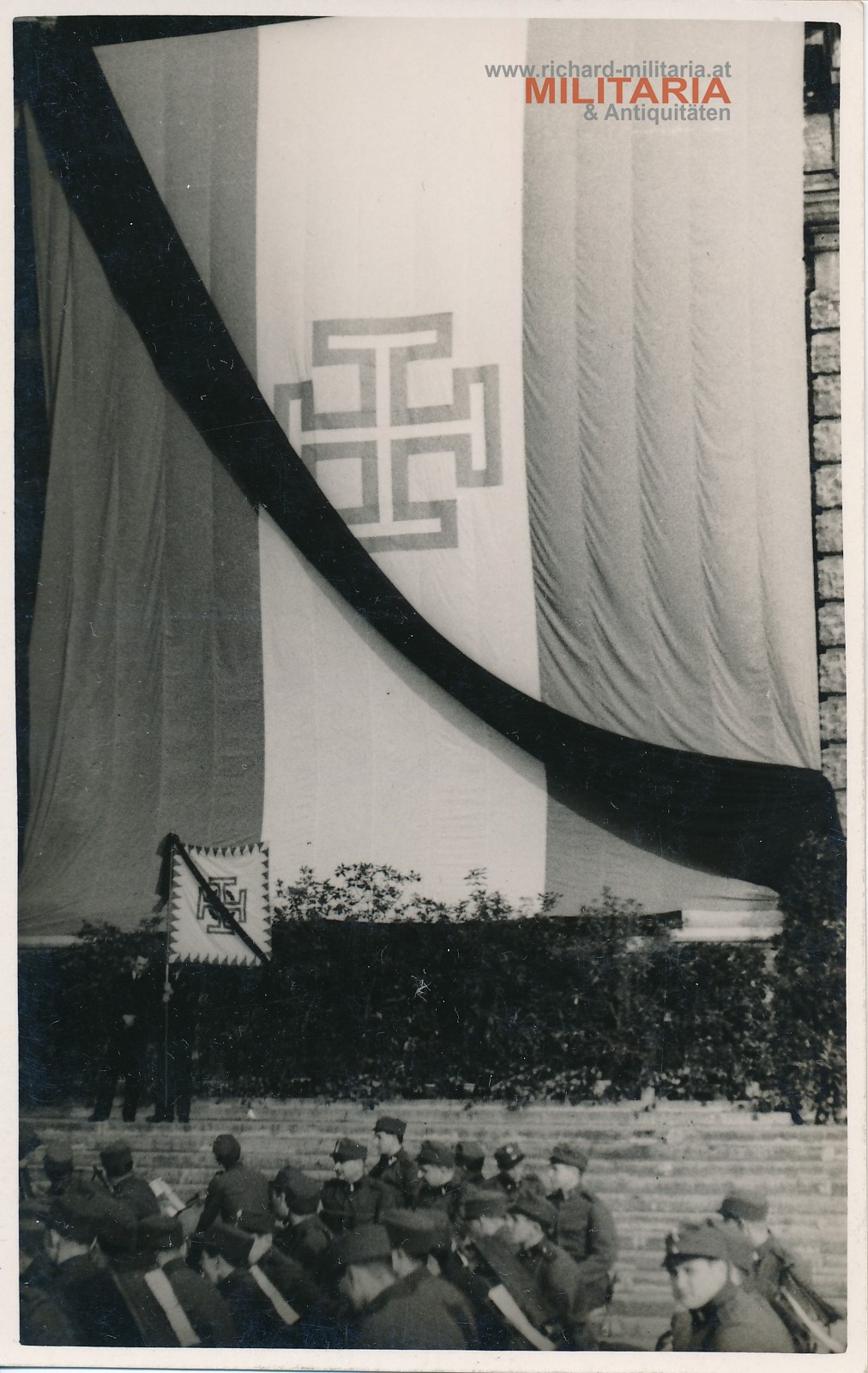 Foto einer Gruppe Soldaten vor einer riesigen Krukkenkreuzfahne - diese mit schwarzem Querband (Begräbnis Engelbert Dollfuss), Photoaris; Wien; Postkartenformat