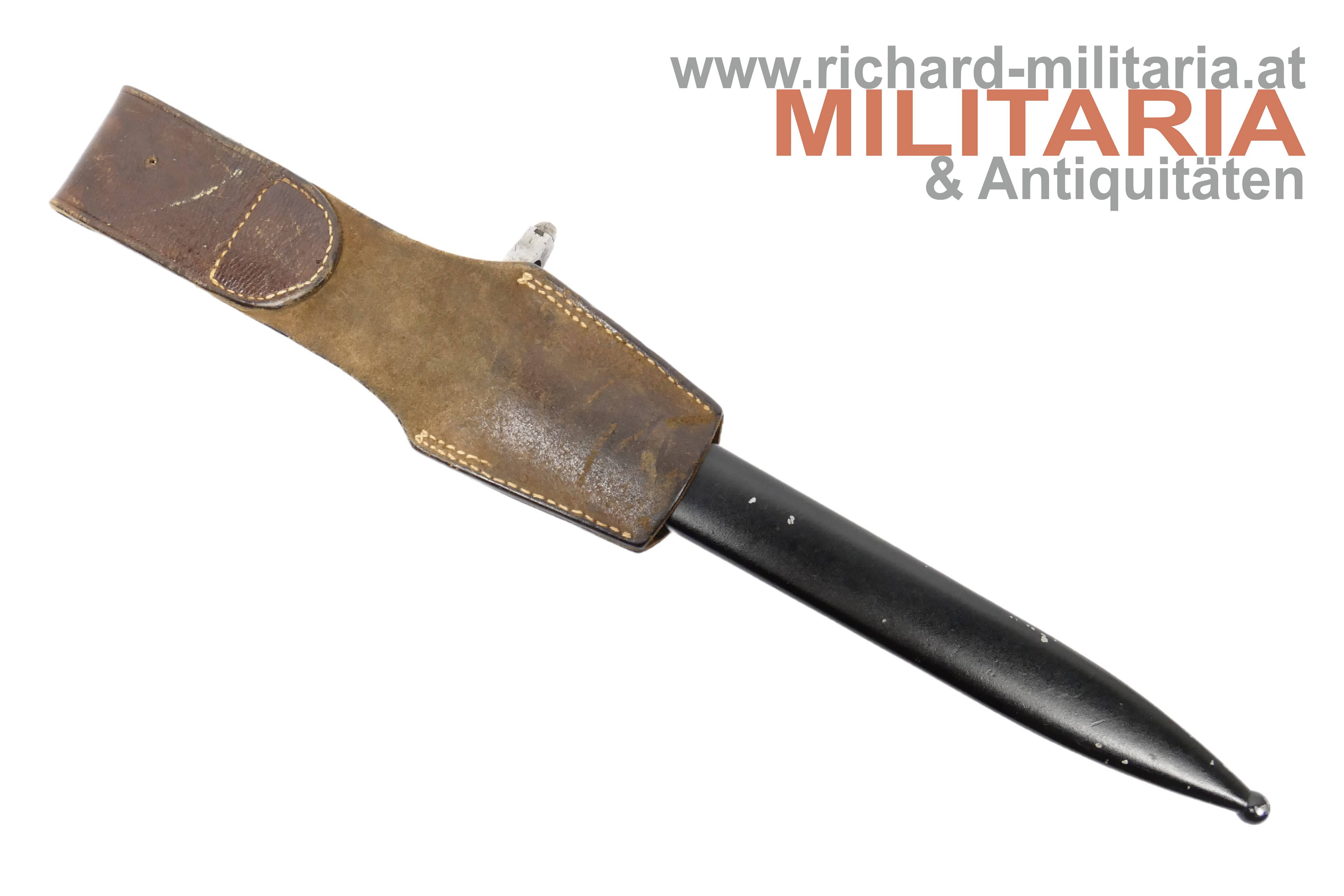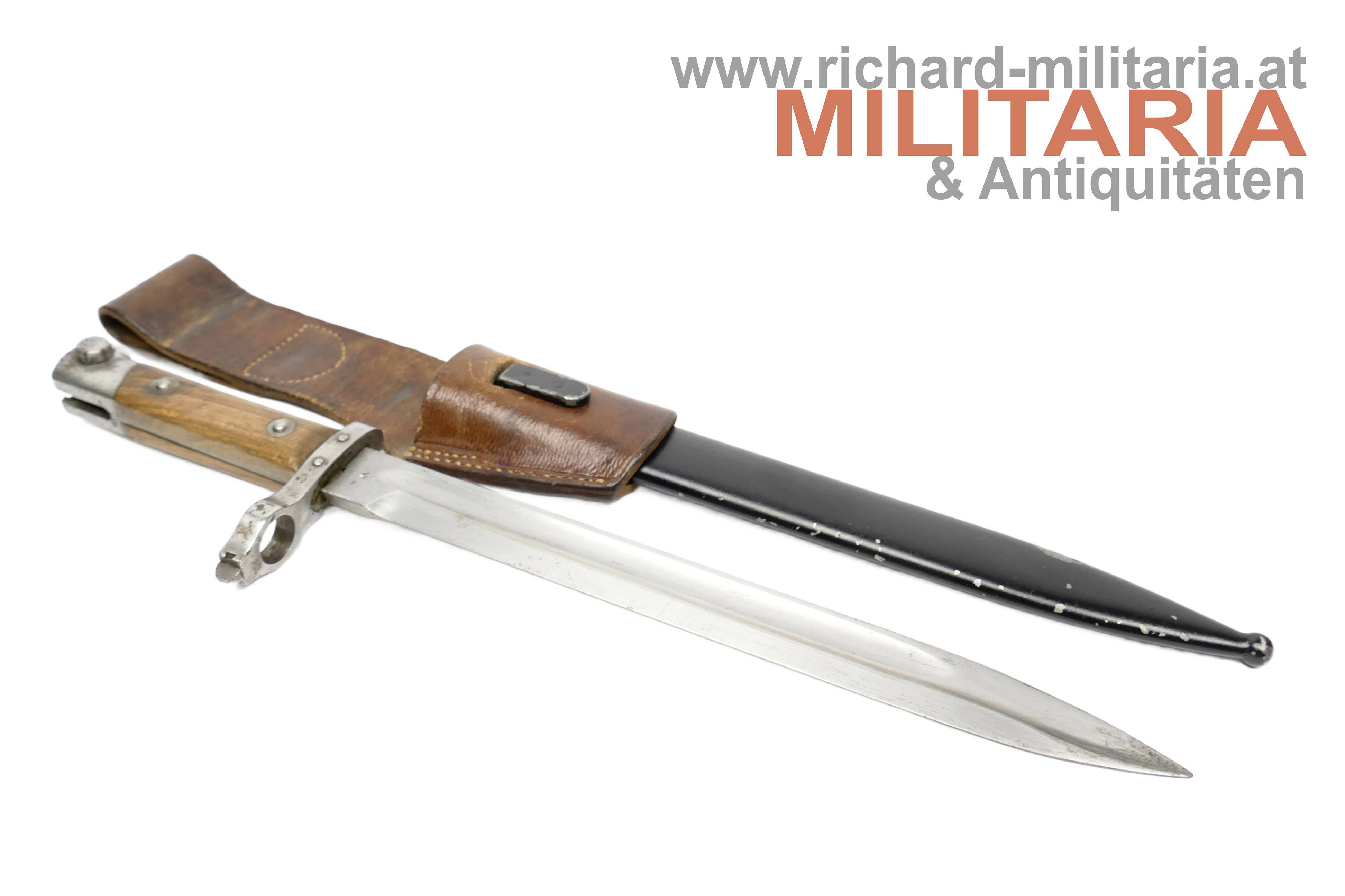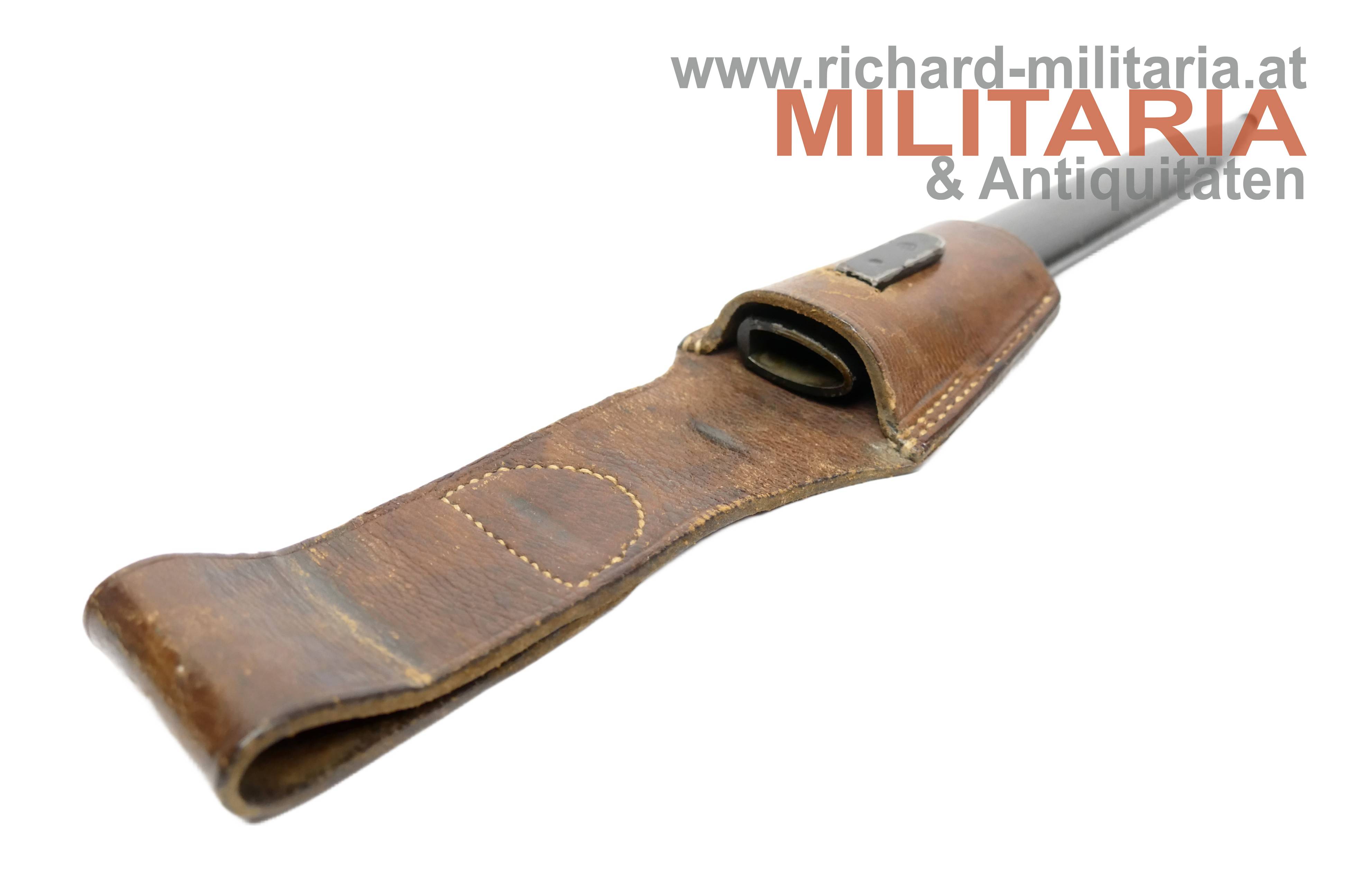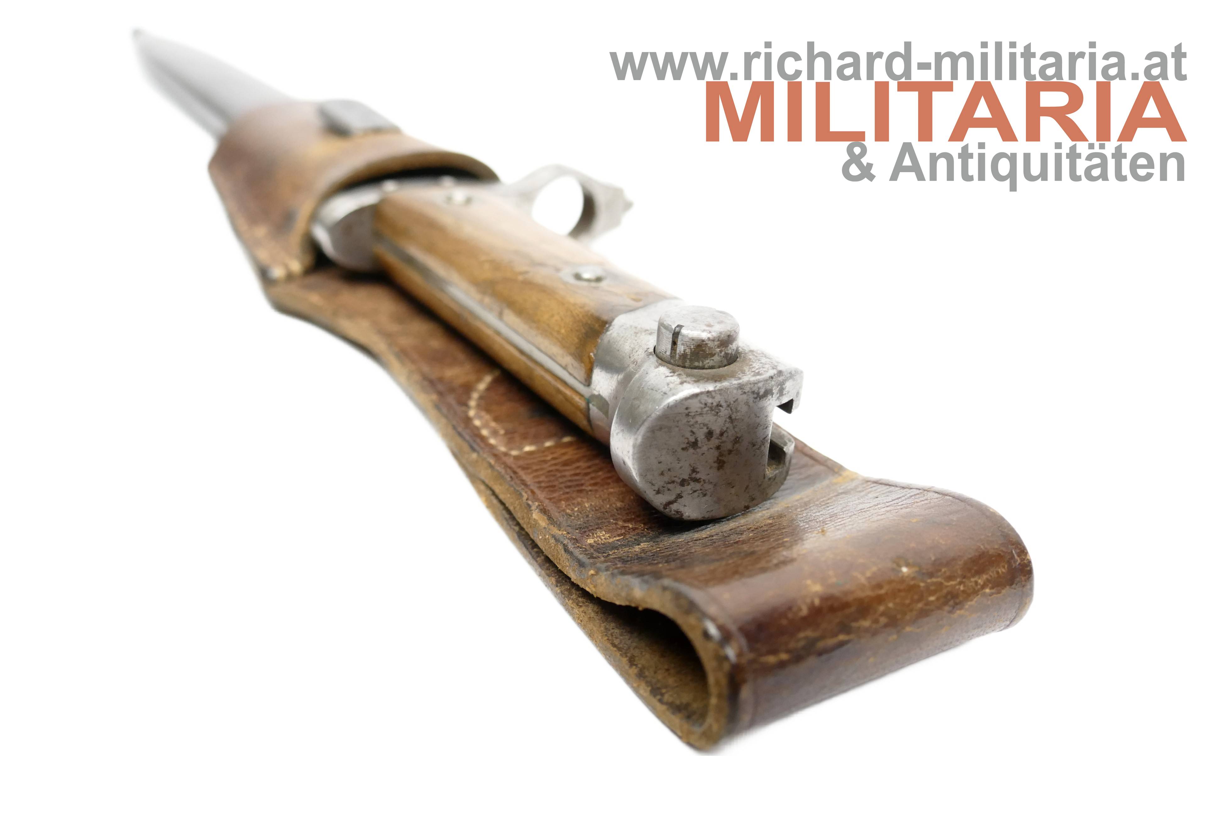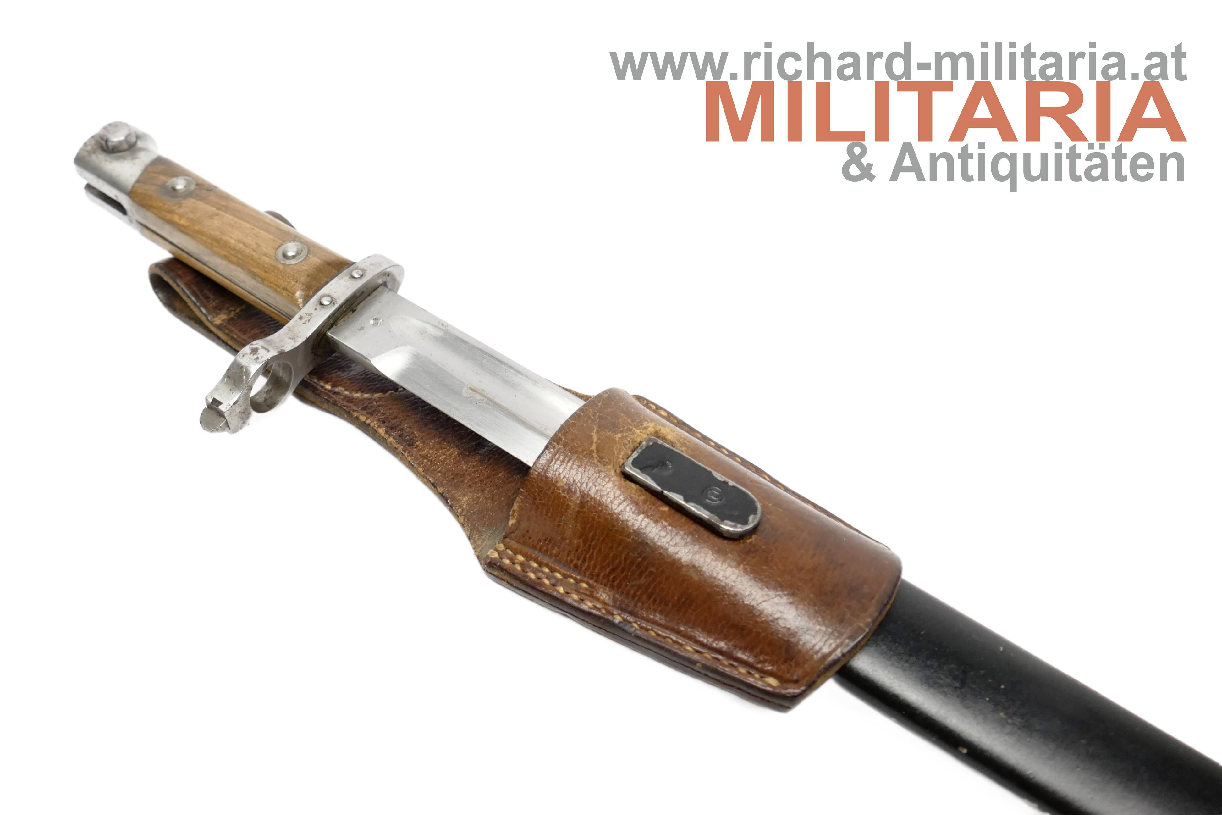 Österreich Bundesstaat - Messerbajonett M95 für Mannschaften & Unteroffiziere; gut erhaltene Klinge mit Bundesstaat-Abnahmestempel sowie Herstellerstempel "OeWG" auf der Fehlschärfe; Parierstange mit Scheibenkorn (!); zweifach vernietete Holzgriffschalen; Drücker gängig; schwarze nachlackierte Scheide - Lackierung leicht abgeblättert; am Tragehaken Bundesstaat-Abnahmestempel sowie ein Ü im Kreis (Kennzeichnung, dass eine Überarbeitung durchgeführt wurde); außerdem am Tragehaken ein schwach lesbarer Herstellerstempel von Steyr Daimler Puch Graz (!!!!) ab 1934; brauner Lederkoppelschuh mit leichteren Abnutzungsspuren; Bajonett sitzt etwas locker im Koppelschuh;