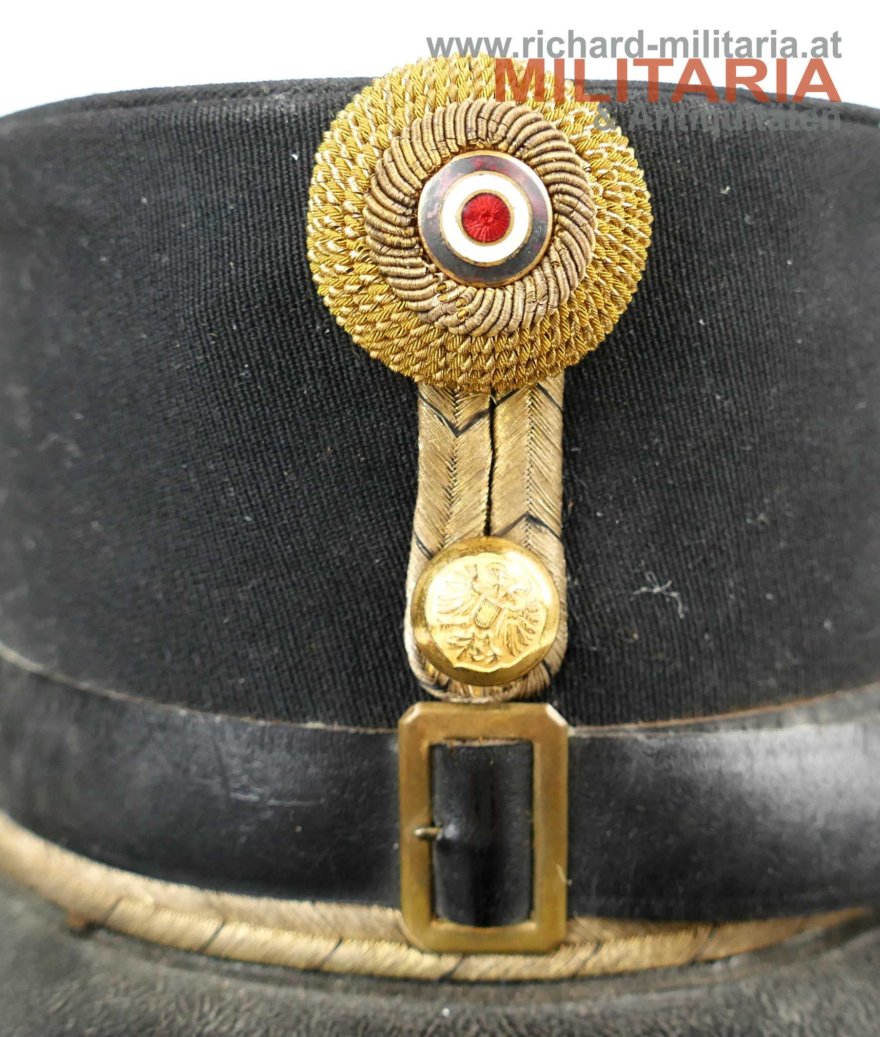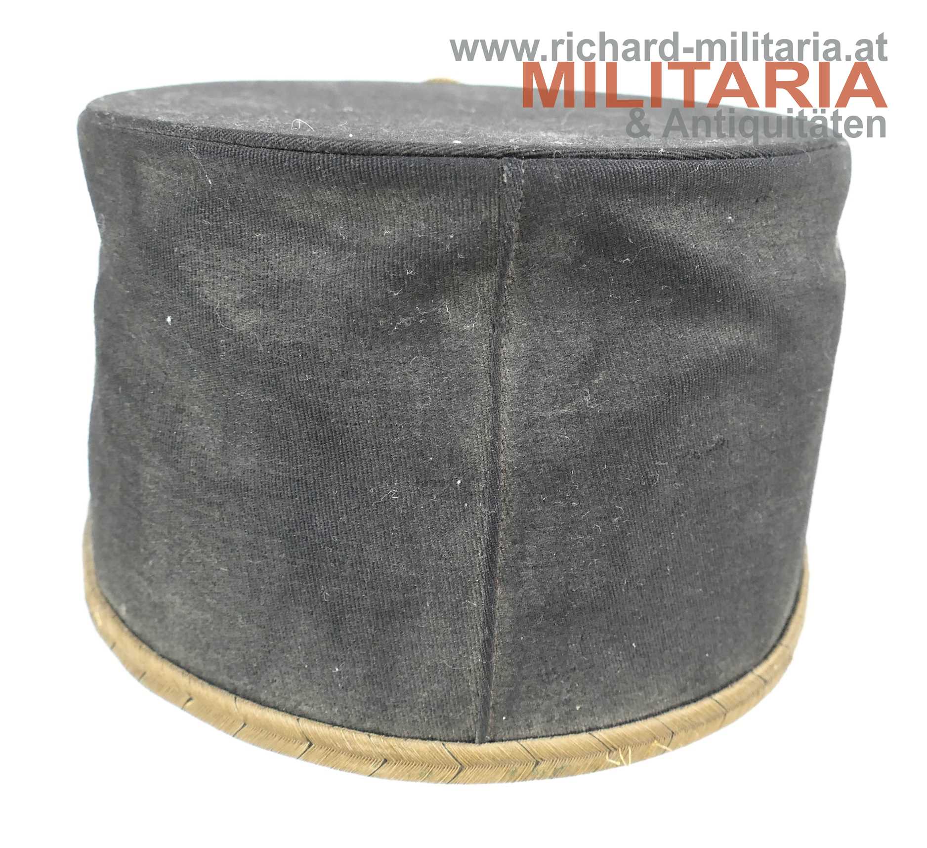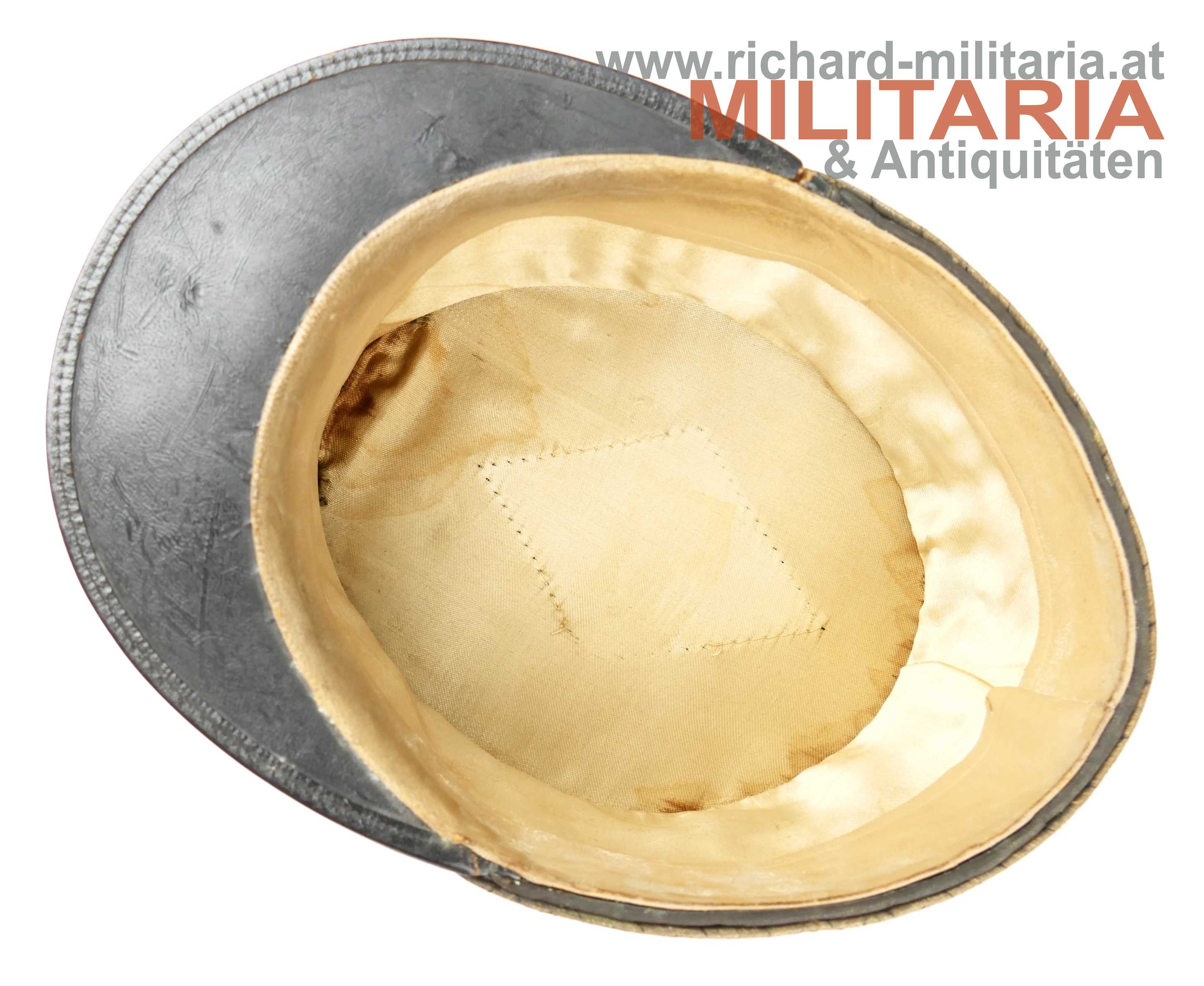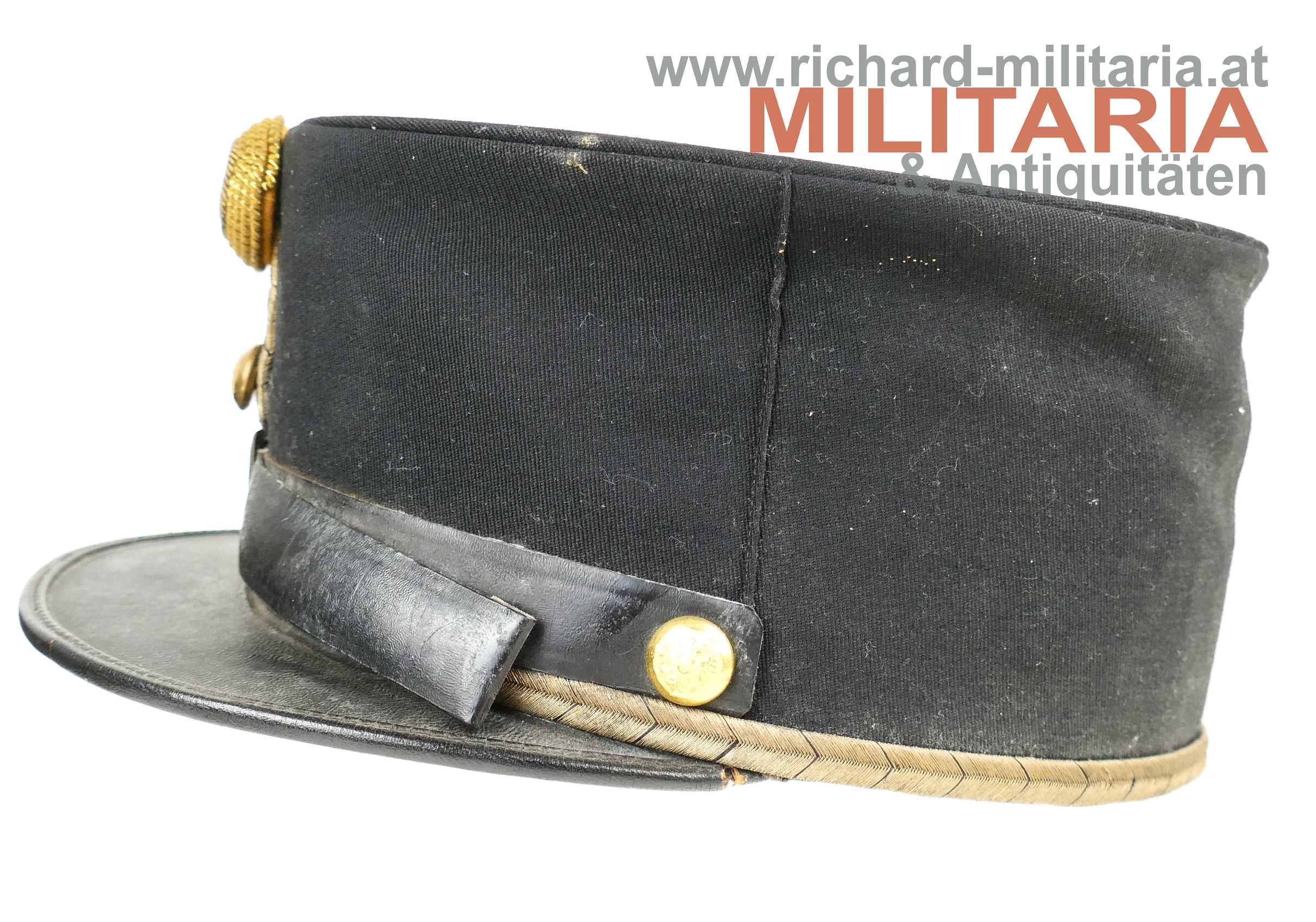 Österreich Bundesstaat - schwarze steife Kappe für Bundesbeamte; halbsteifer Korpus mit feinem schwarzen Tuch und mit schwarzem Lacklederschirm; umlaufende Borte aus Goldfäden mit schwarzen Durchzügen, goldener Knopf mit Bundesadler über schwarz durchwirkter goldener Hutschnur, schwarzer Sturmriemen, dieser wird von zwei vergoldeten Knöpfen mit Bundesadler gehalten; vorne mittig Goldfaden gestickte Kokarde mit rot weiß rotem emailliertem Mittelteil, hellbraunes weiches Schweißleder, Hersteller nicht ersichtlich, da das Herstellertrapez entfernt wurde; Größe ca. 54;