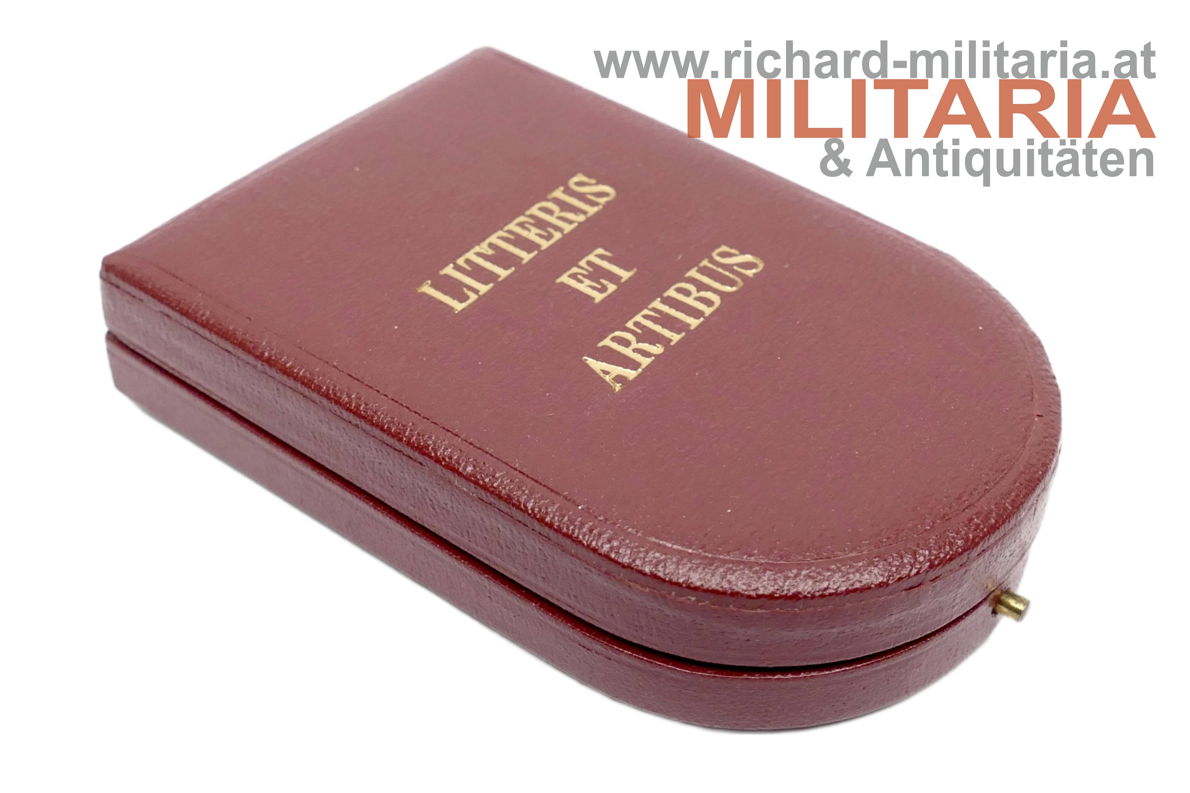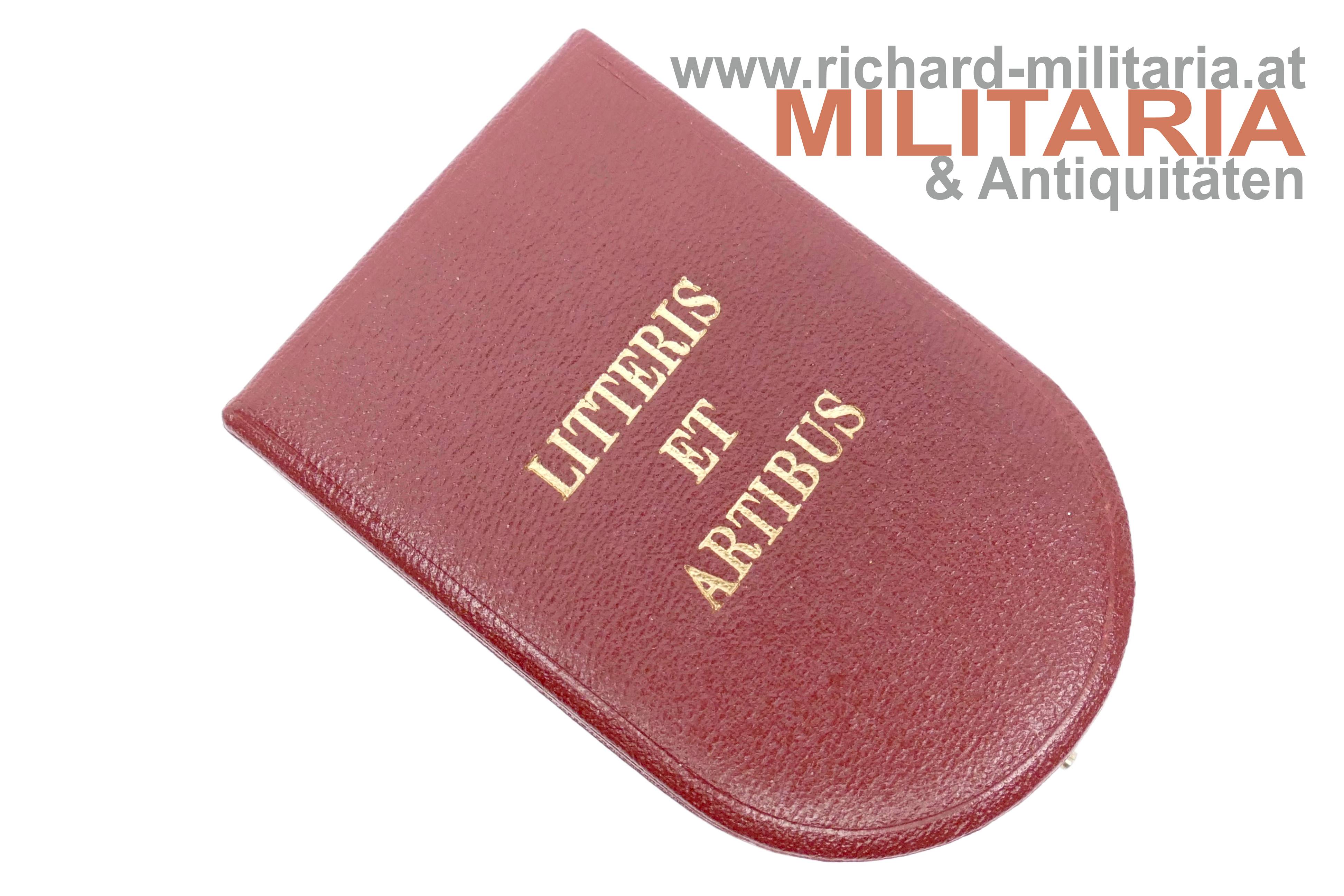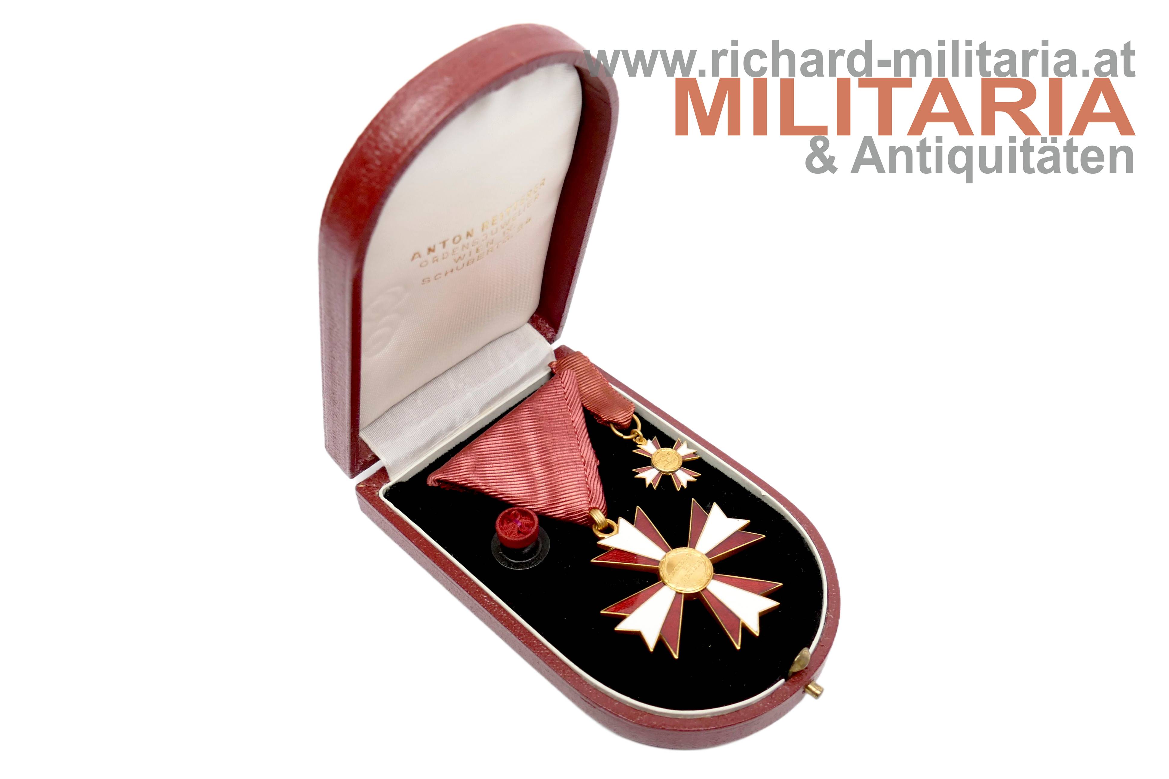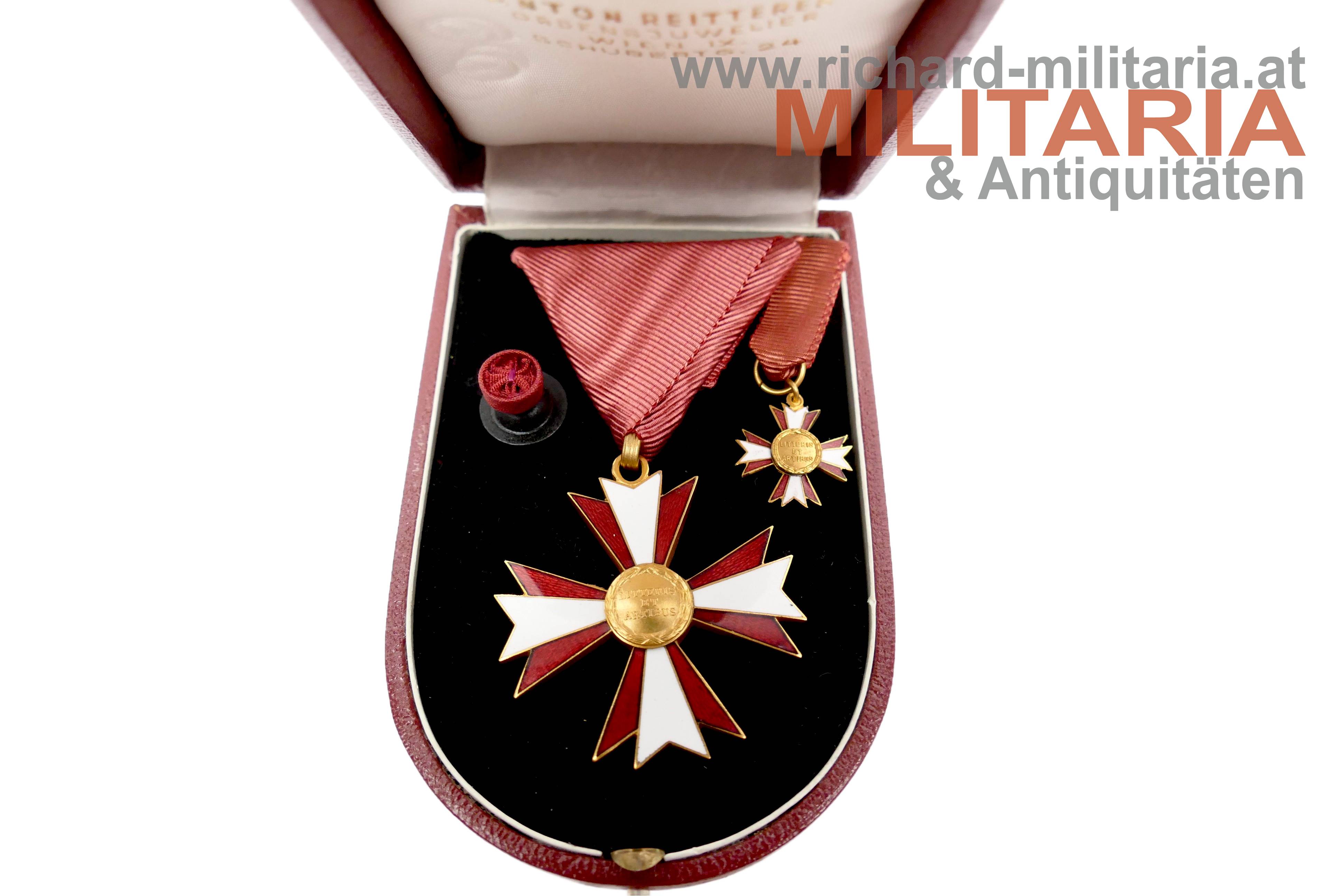 Österreich - Ehrenkreuz für Wissenschaft und Kunst (Litteris et Artibus) - komplettes Set mit Etui; Buntmetall vergoldet und emailliert; revers am Mittelmedaillon der Hersteller "A. Reitterer"; am passenden Dreiecksband; Miniatur und Rosette beiliegend; im roten Etui von Anton Reitterer;