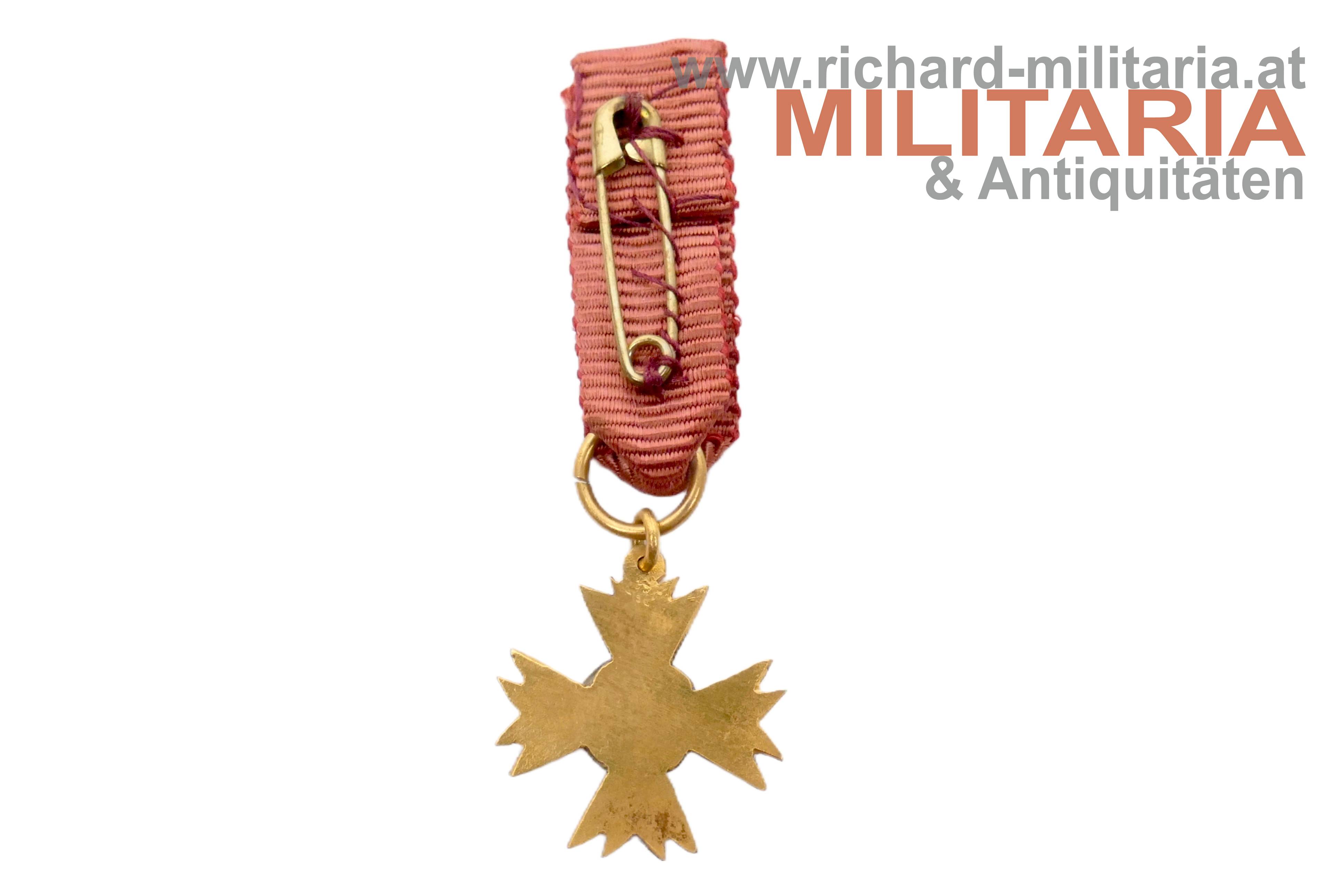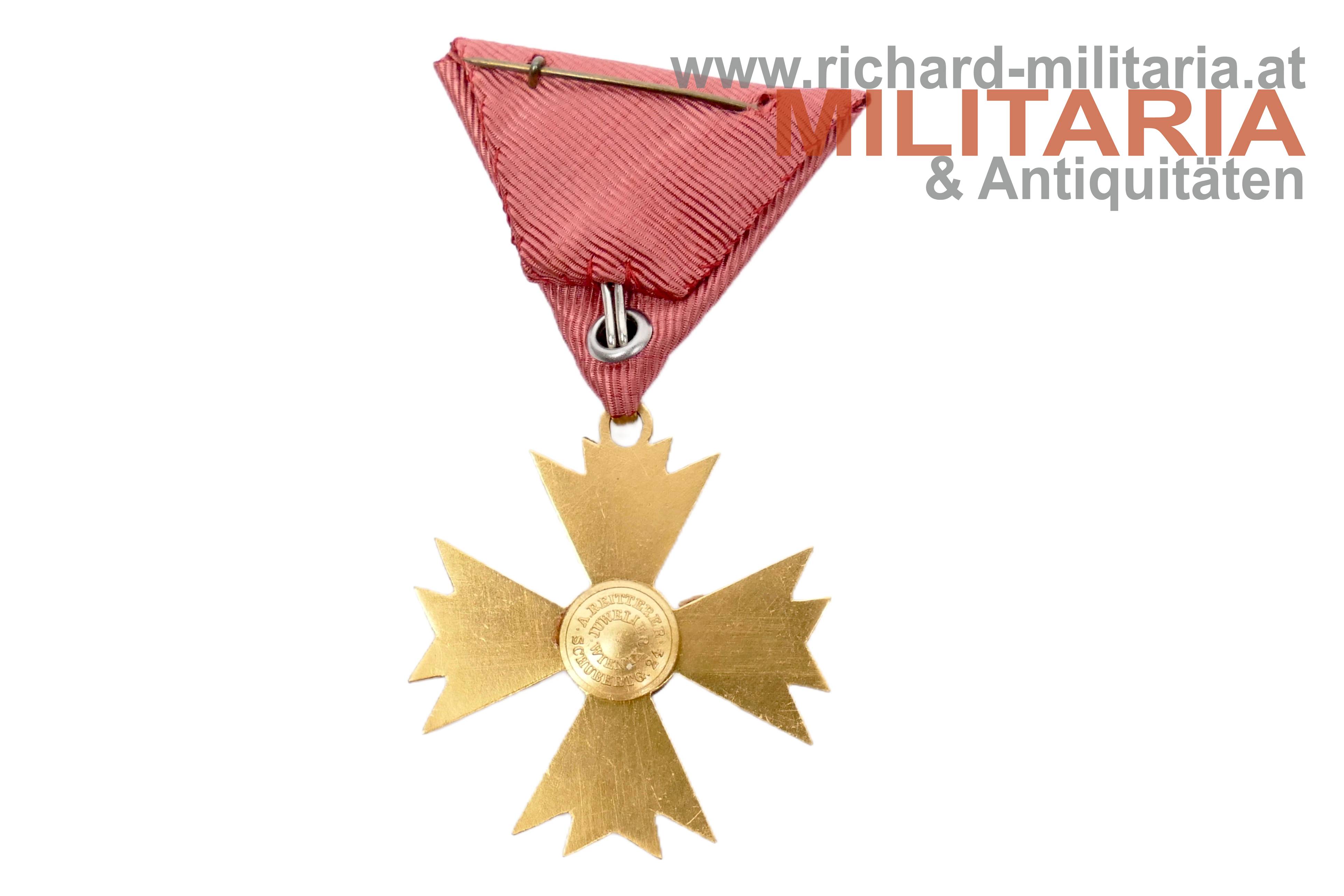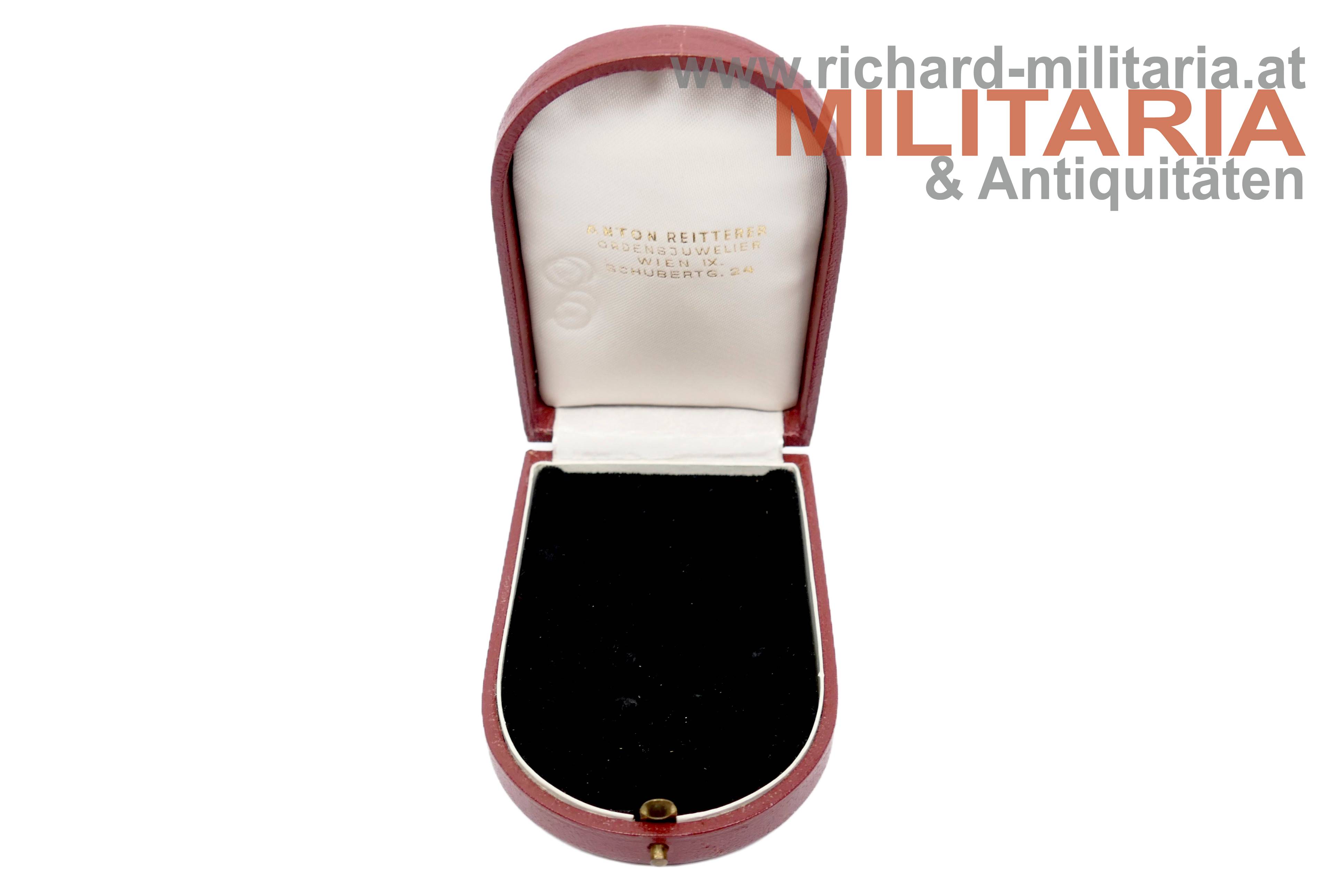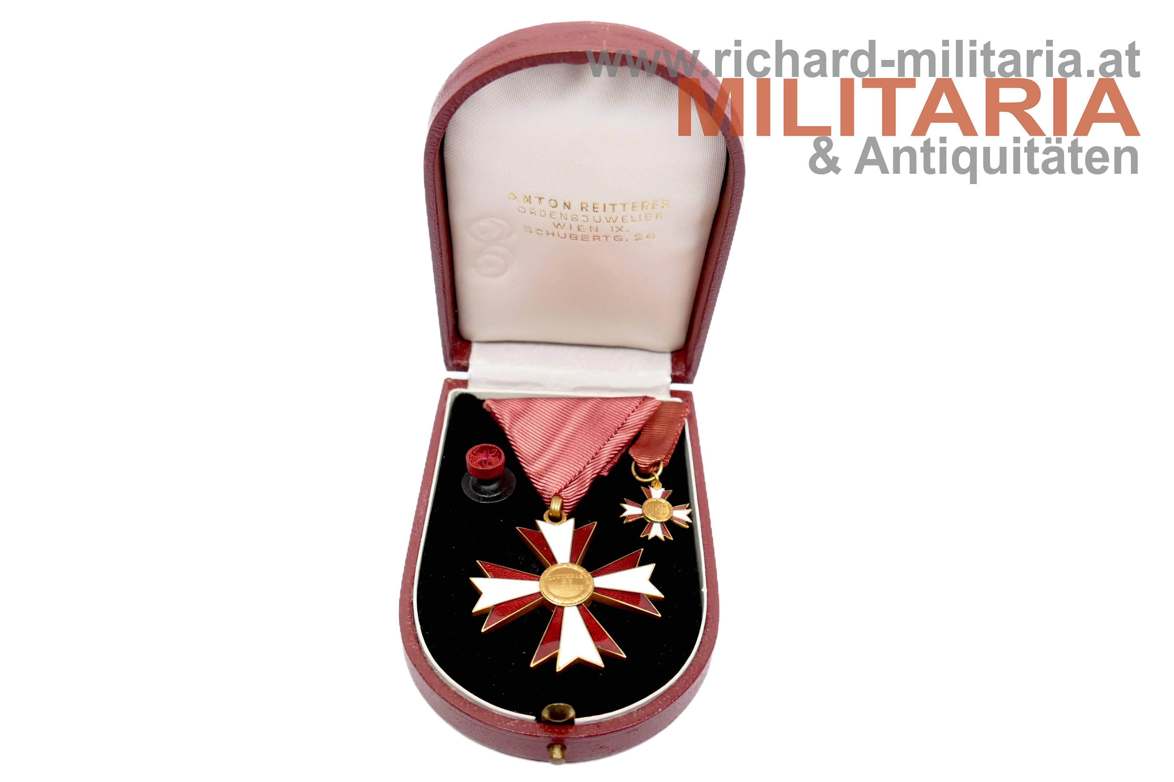 Österreich - Ehrenkreuz für Wissenschaft und Kunst (Litteris et Artibus) - komplettes Set mit Etui; Buntmetall vergoldet und emailliert; revers am Mittelmedaillon der Hersteller "A. Reitterer"; am passenden Dreiecksband; Miniatur und Rosette beiliegend; im roten Etui von Anton Reitterer;