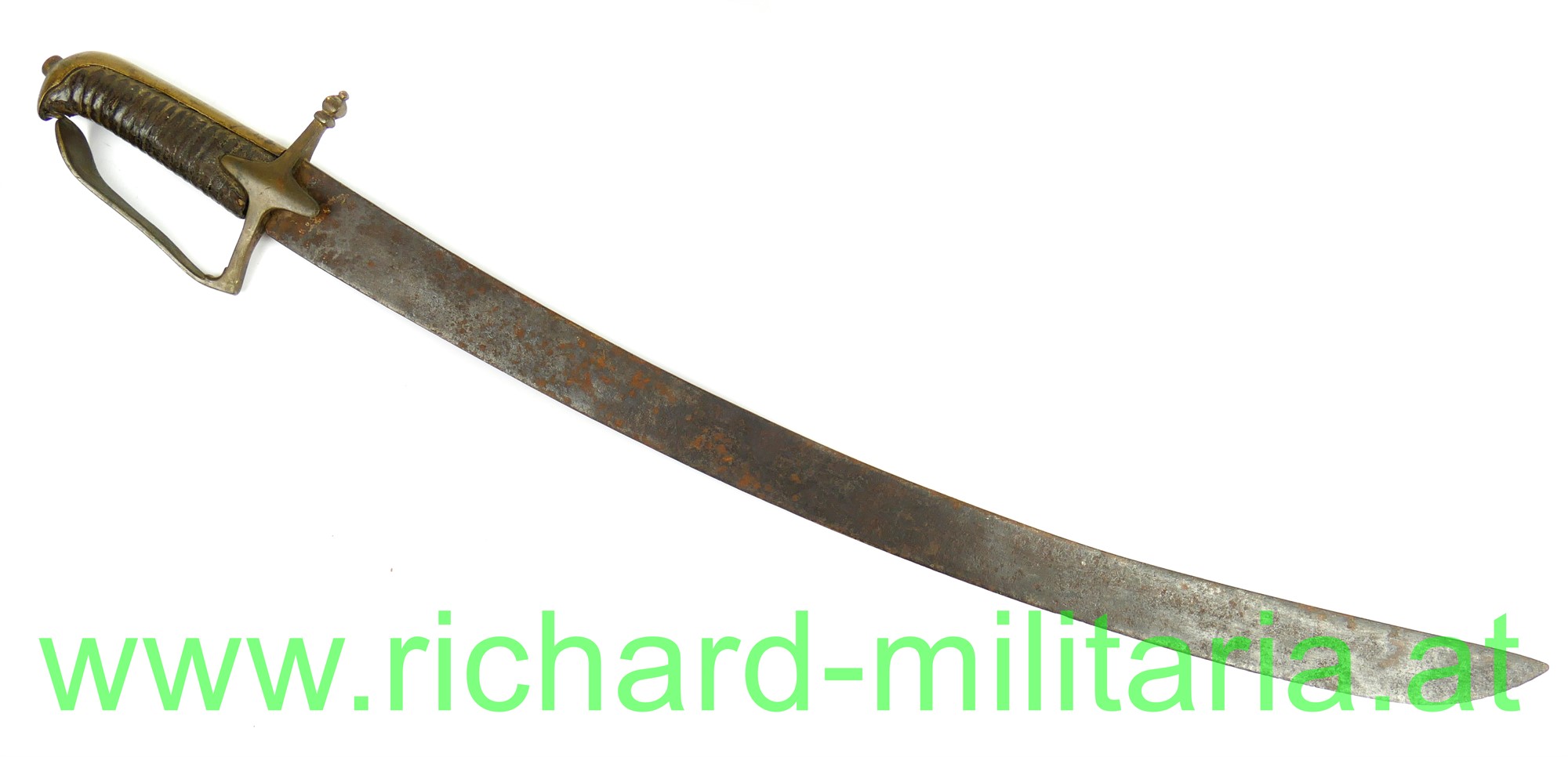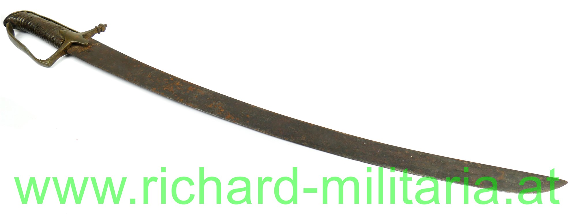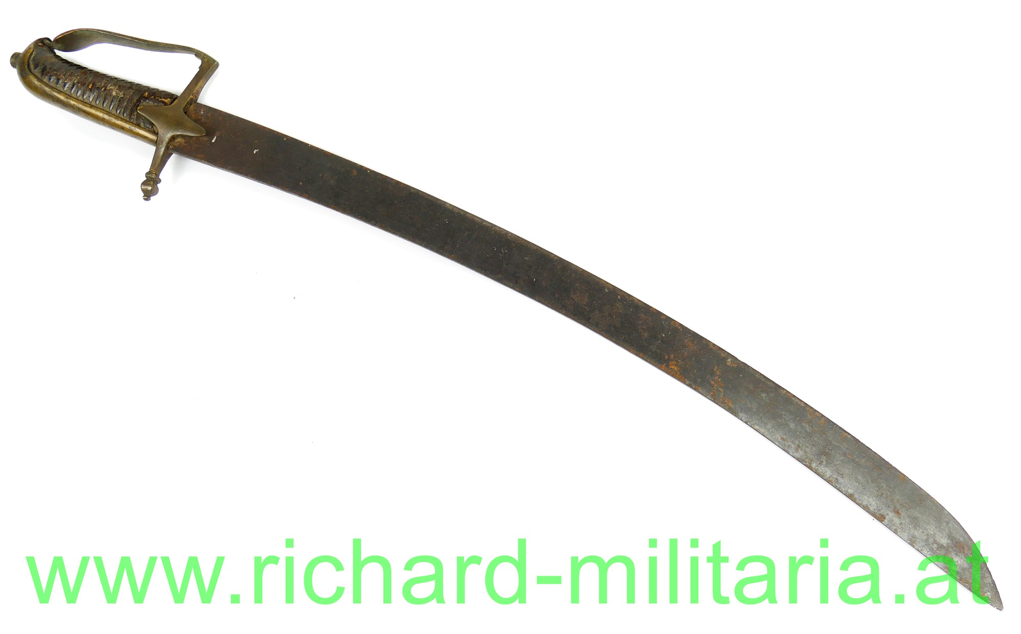 Österreich Grenadier-Säbel M1765, flache leicht gekrümmte Klinge ohne Hohlkehle, kein Hersteller ersichtlich, Klinge rostig und teilweise narbig; gegossenes Bügelgefäß aus Messing, einfacher gerillter Holzgriff, Klinge ist mit dem Griff noch fest verbunden;