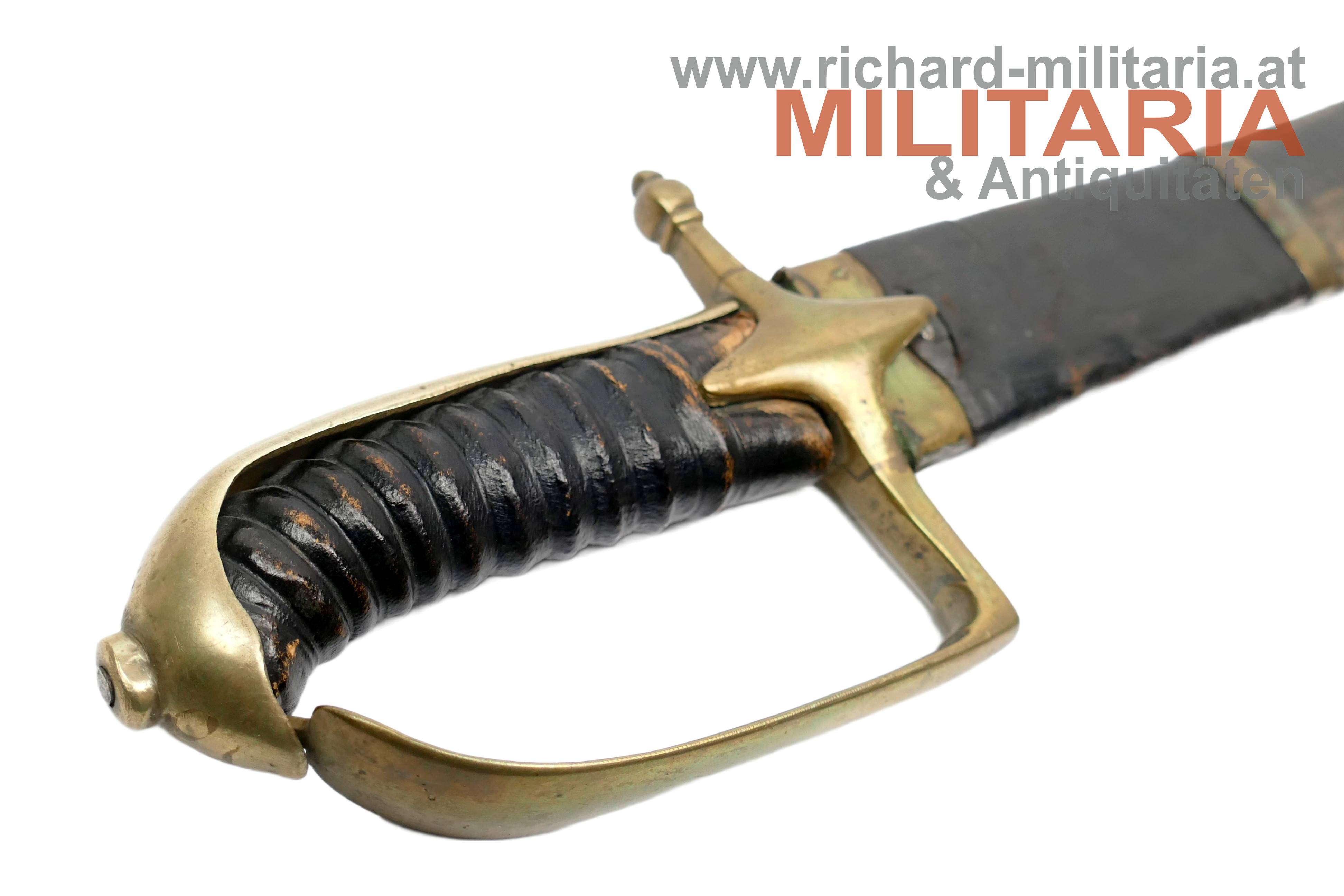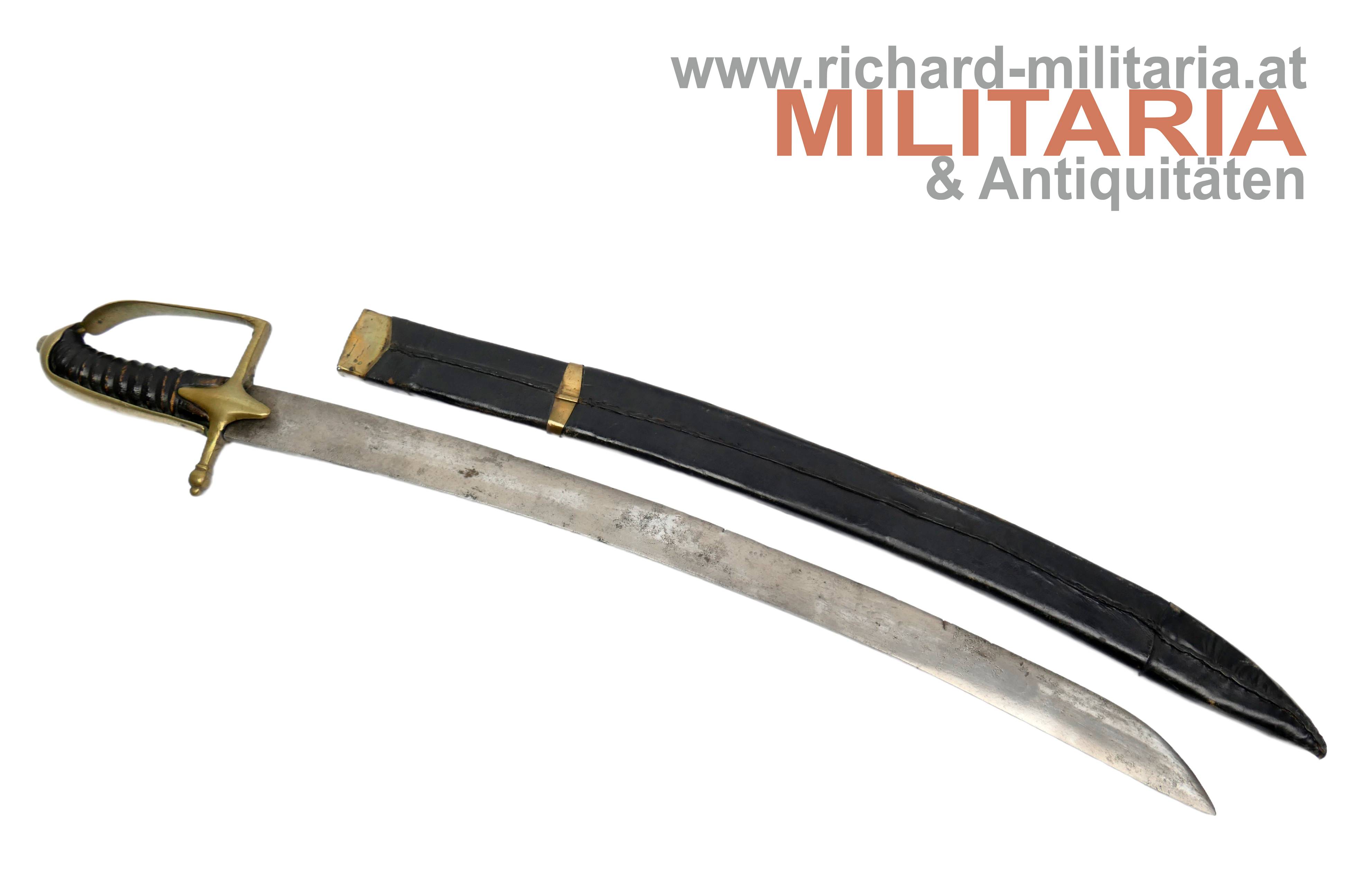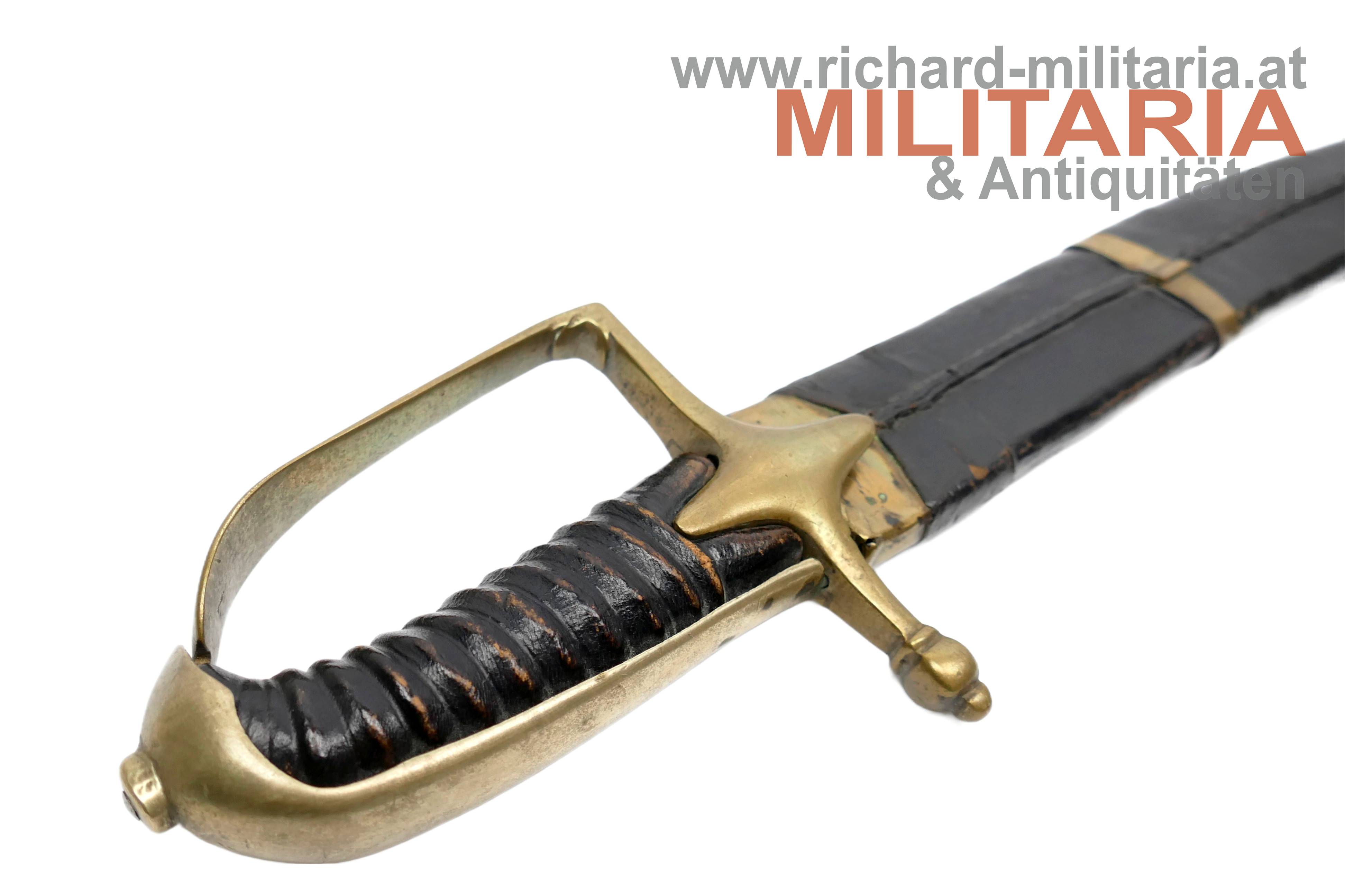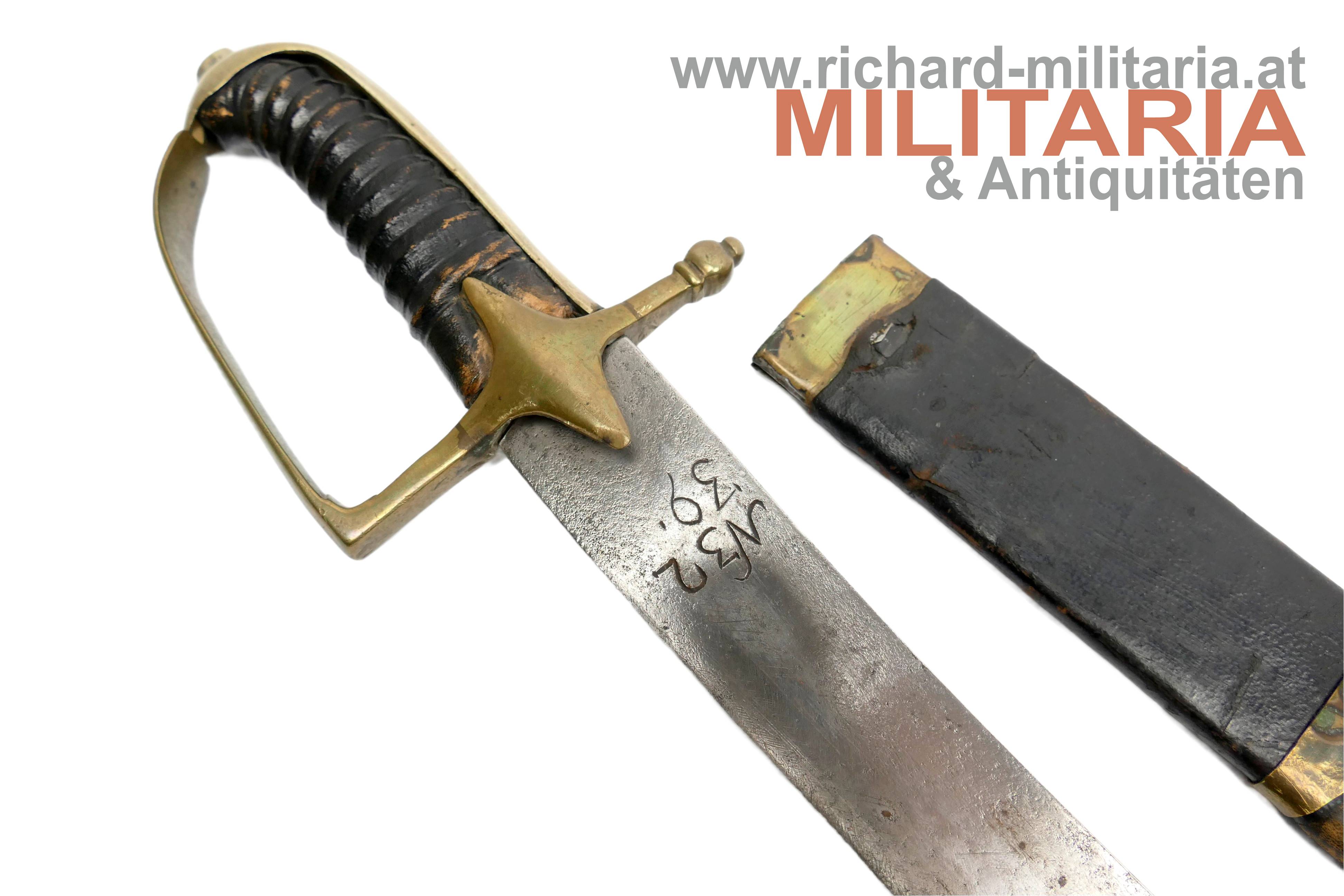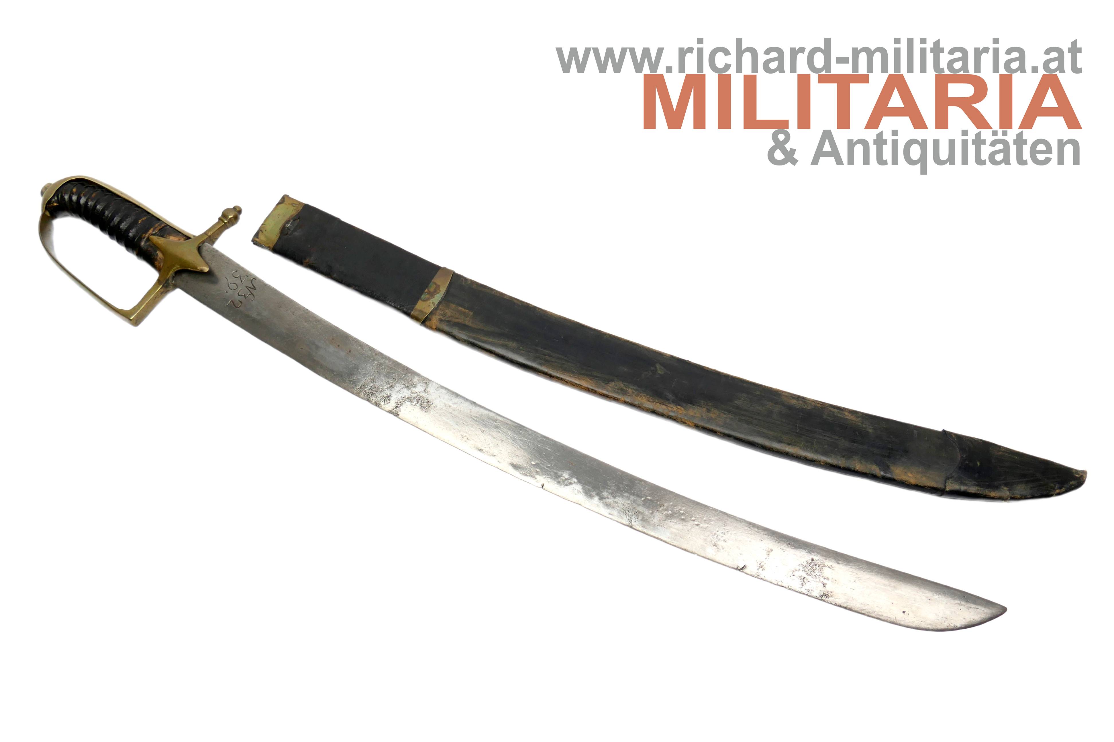 Österreich - Grenadiersäbel M1765 "N32 39."; etwas narbige gereinigte Klinge mit keilförmigen Querschnitt; am Klingenansatz "N32 39." in die Klinge graviert; leicht locker sitzendes Messingbügelgefäß; belderter Holzgriff in guter Erhaltung; Holzscheide mit schwarzem Leder überzogen und mit Messingbeschlägen verstärkt; Leder mit Abnutzungsspuren jedoch ohne Fehlstellen; unterer Messingbeschlag mit Leder überzogen; Tragehaken fehlt;