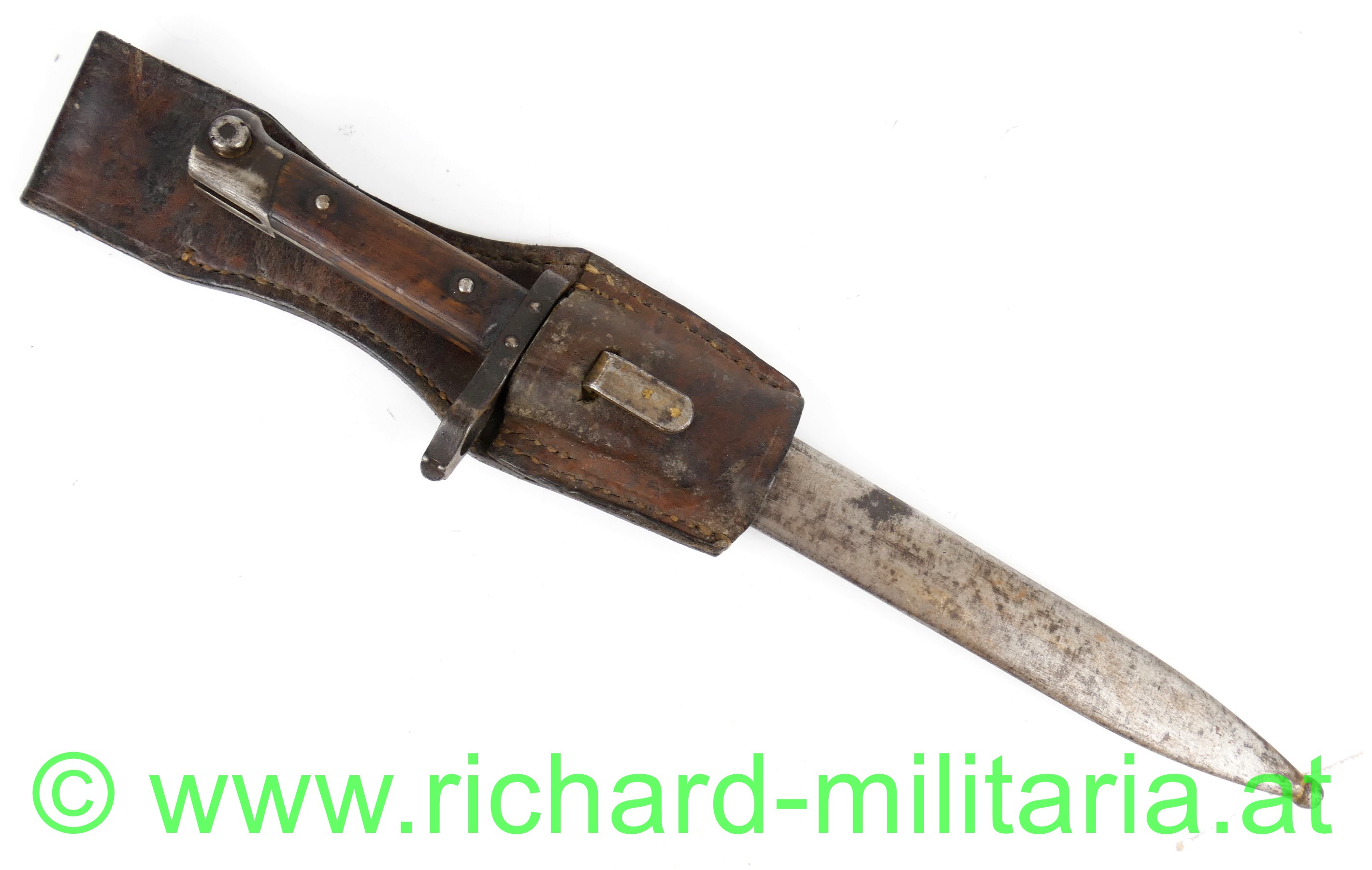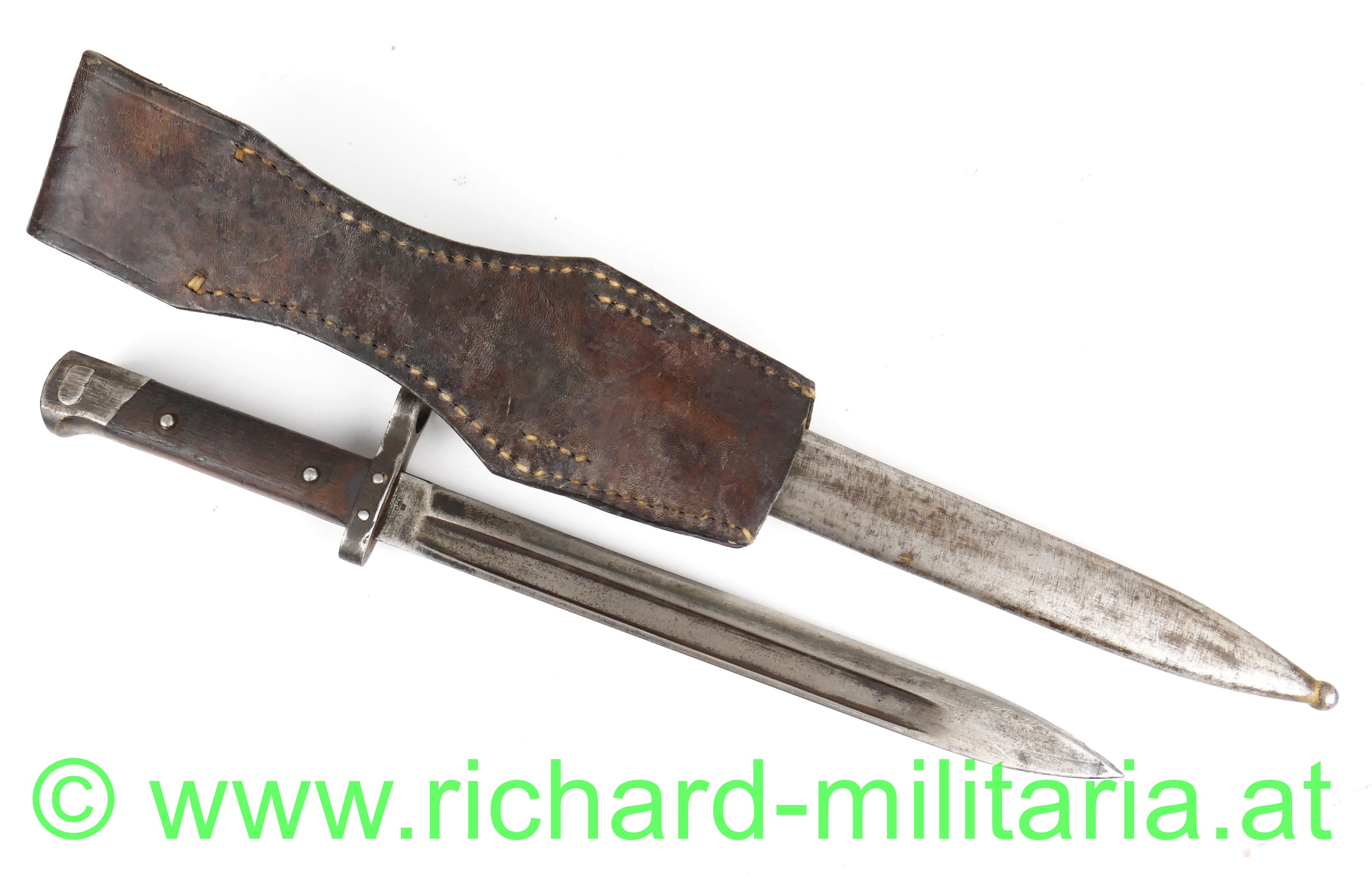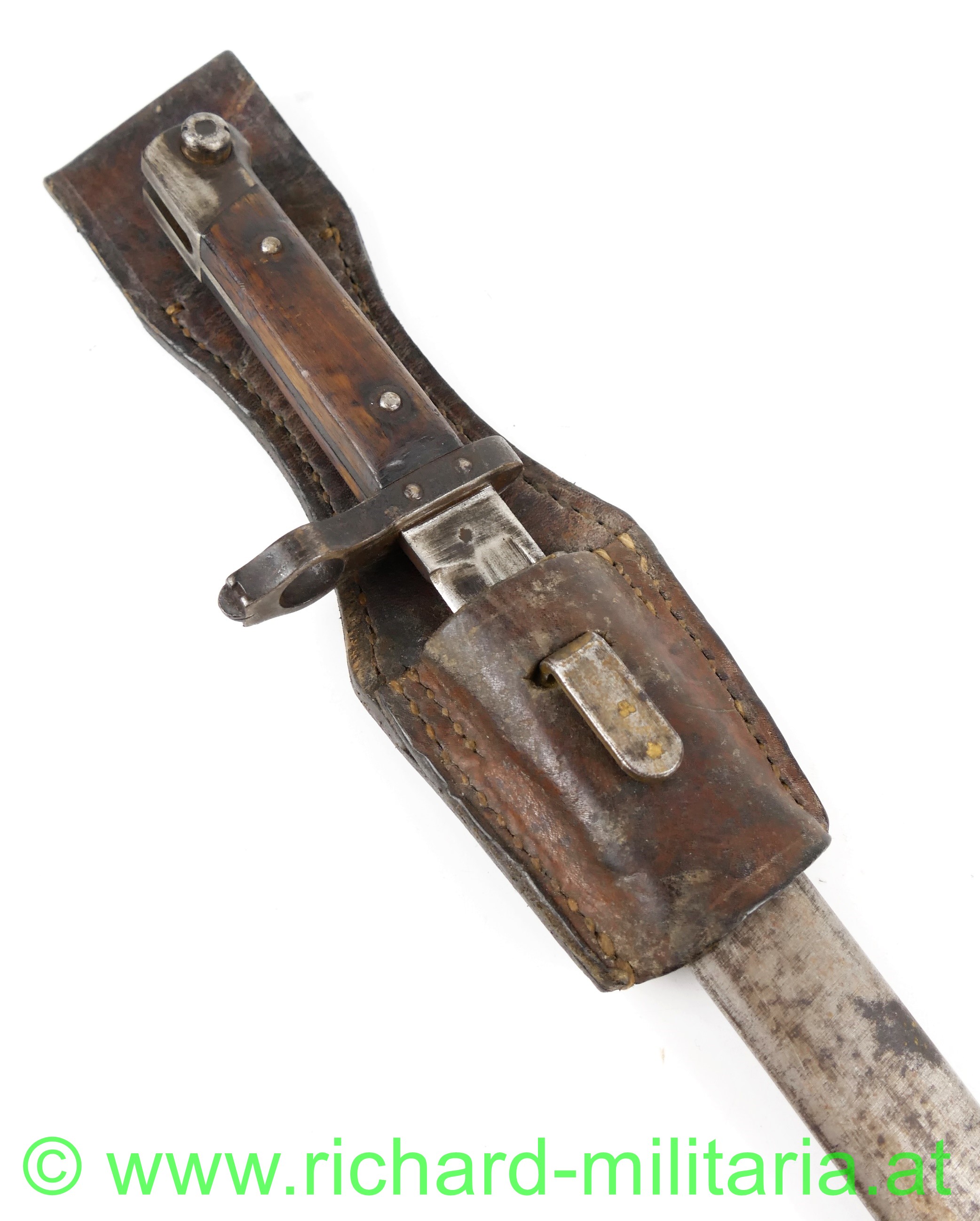 Österreich Messerbajonett M1895 für Mannschaften, Ausführung mit Visierkorn in Scheibenform, Klinge fleckig und leicht geschärft, Hersteller OeWG und k.u.k. Armeeabnahme auf der Klinge und Scheide; Griffkopf mit Resten einer Truppenkennung "30 S... 84", Griffkopf und Teile des Griffrückens sowie die Scheide maschinell gereinigt, originaler massiver Lederkoppelschuh;