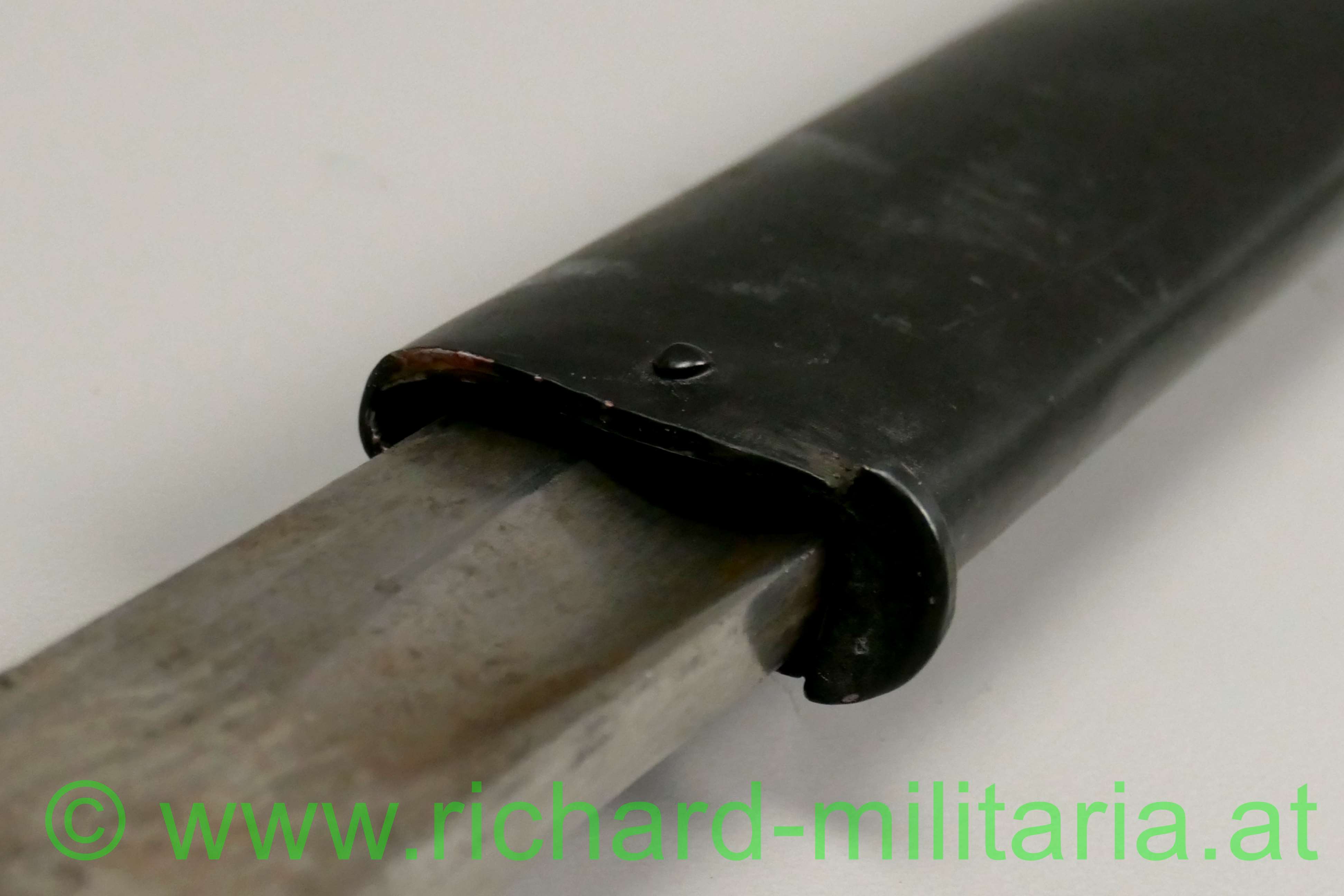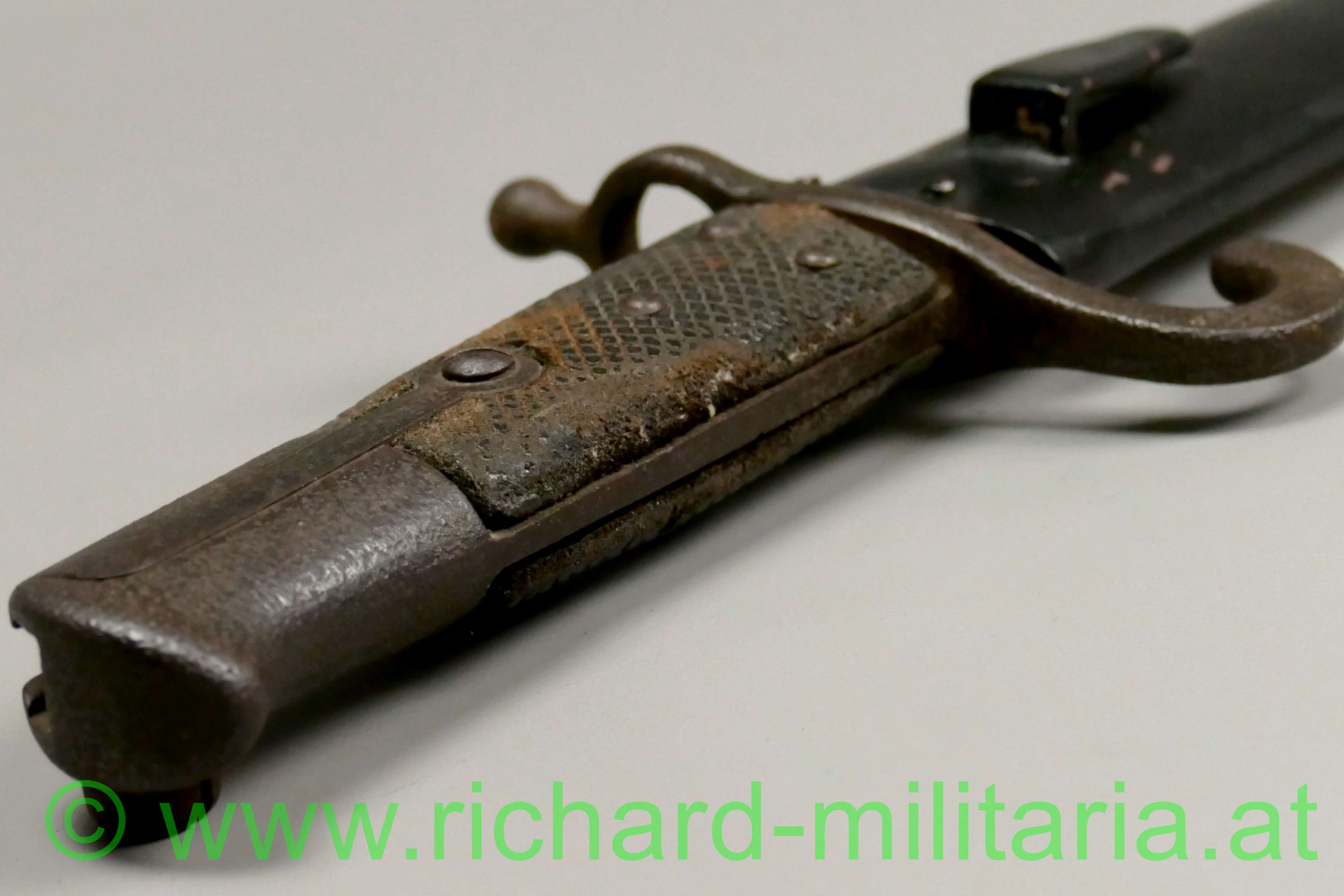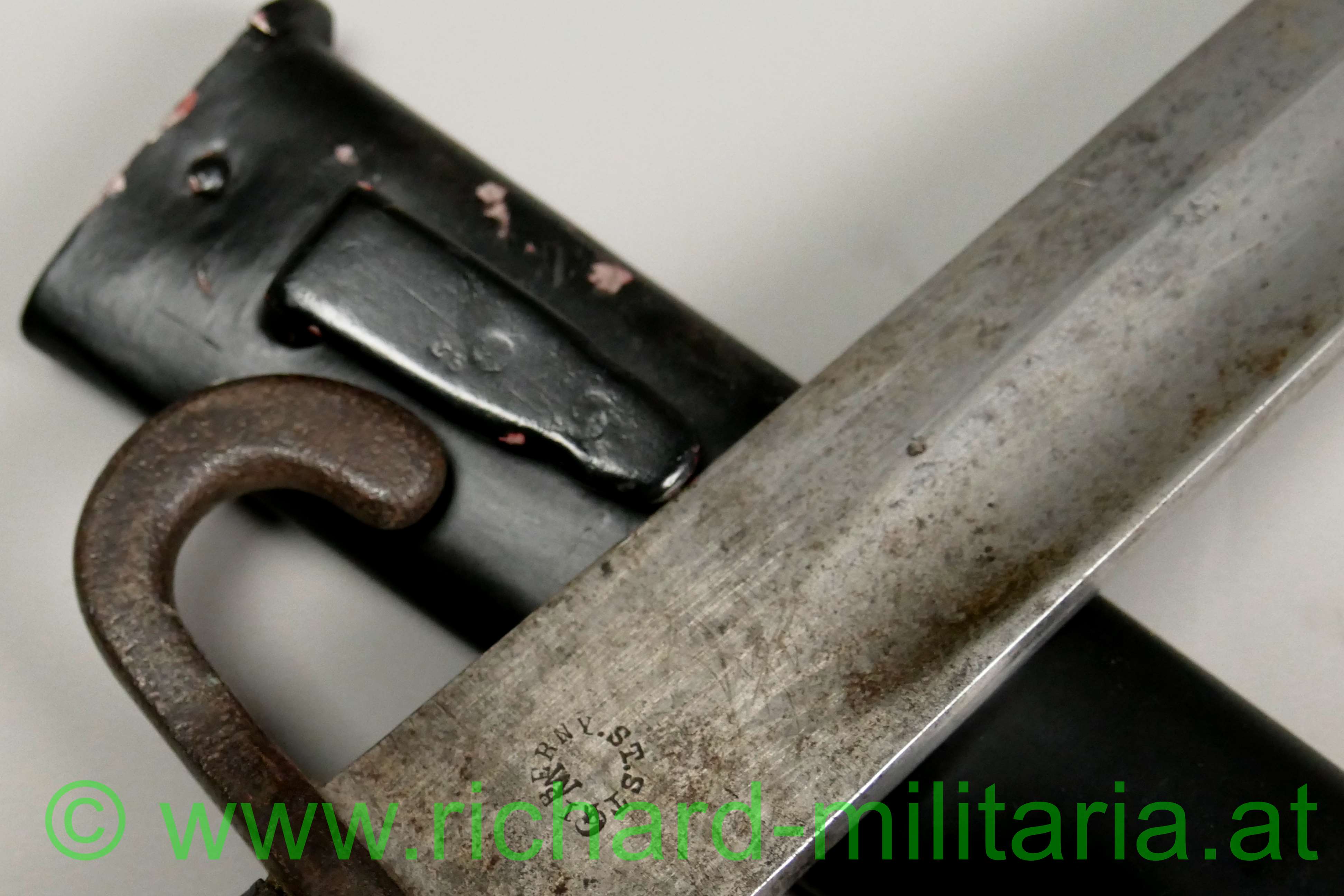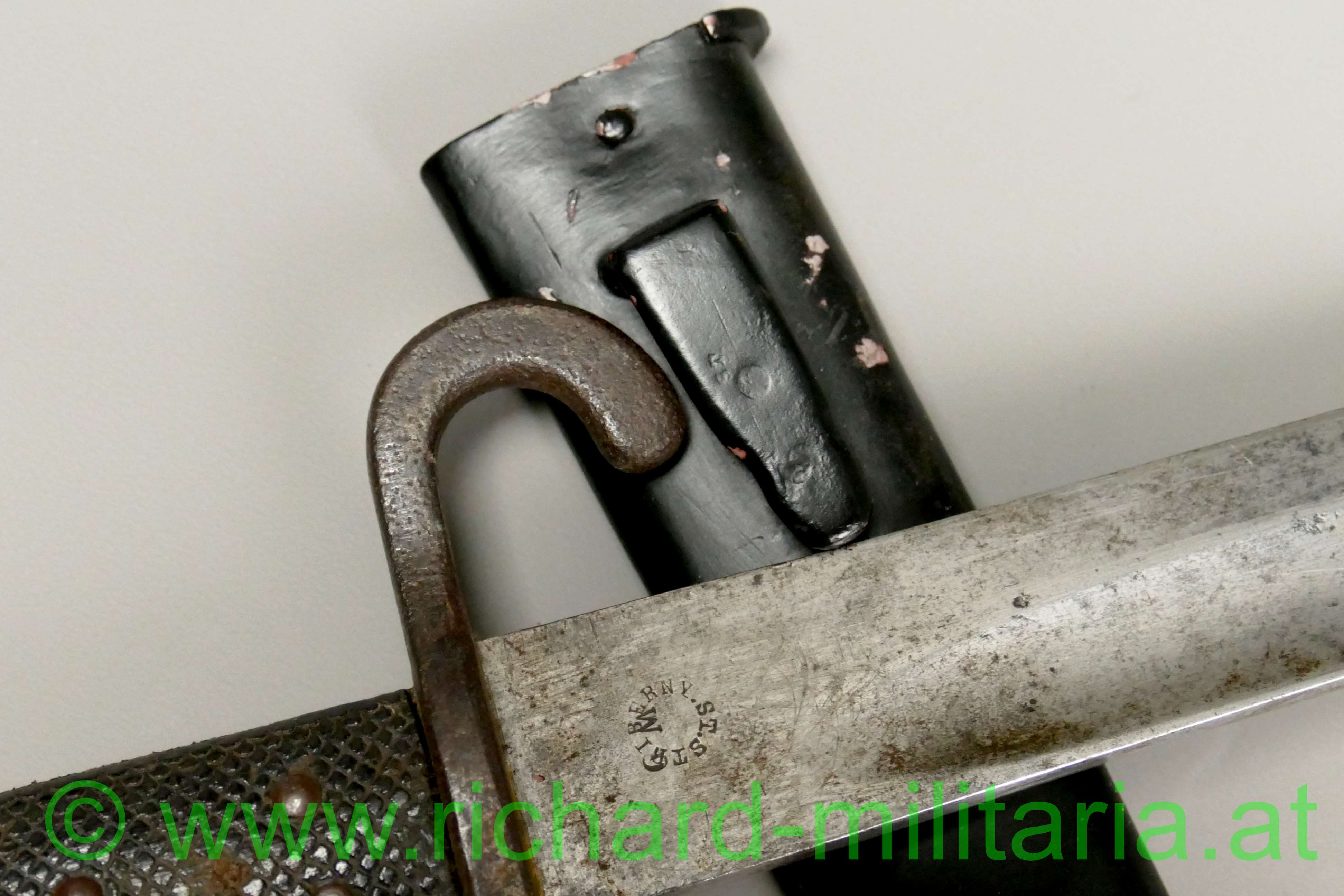 Österreich Säbelbajonett M1867 System Werndl; Klinge gereinigt und fleckig; am Klingenansatz ein Armeeabnahmestempel sowie zwei Stempelungen "GF" und "GM" und eine Herstellerstempelung "ST. Striberny"; Parierstange mit mehreren Markierungen; Parierstange flugrostig und etwas narbig; Griffschalen aus gepresstem Leder etwas abgewetzt; Klinge geht nicht ganz in die Scheide - Klingenlänge passend für die Scheide; Scheide neu lackiert mit unleserlichen Stempelungen am Tragehaken;