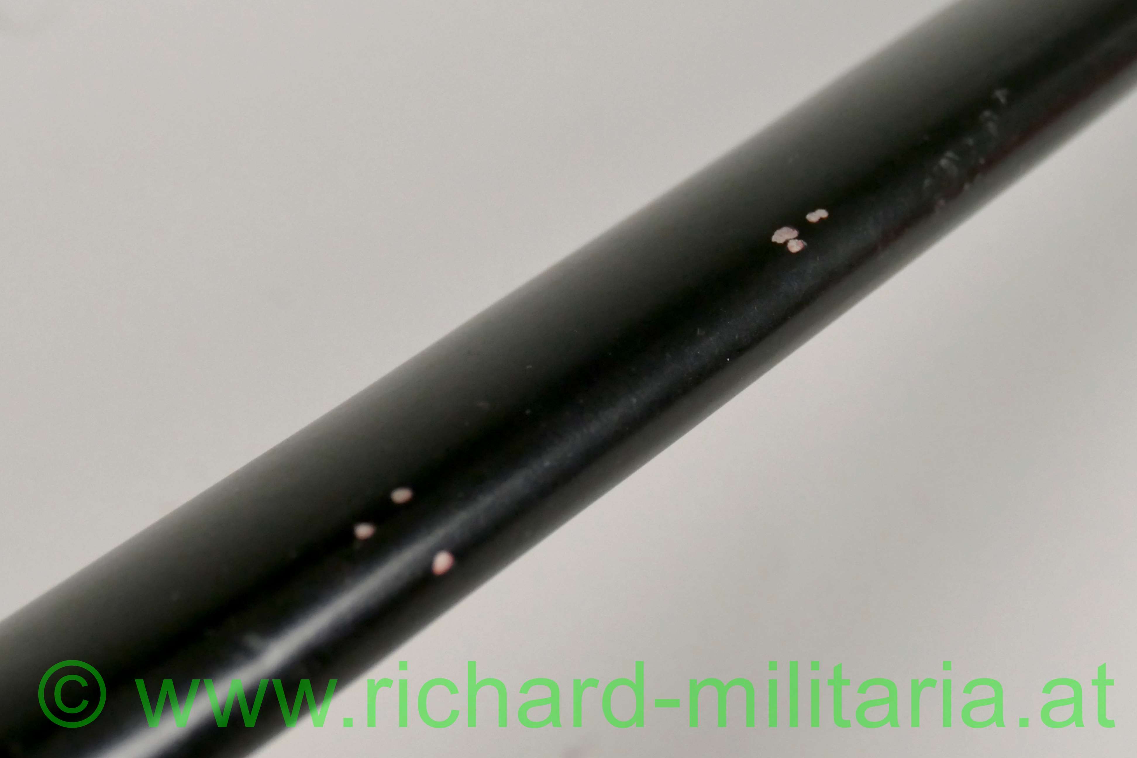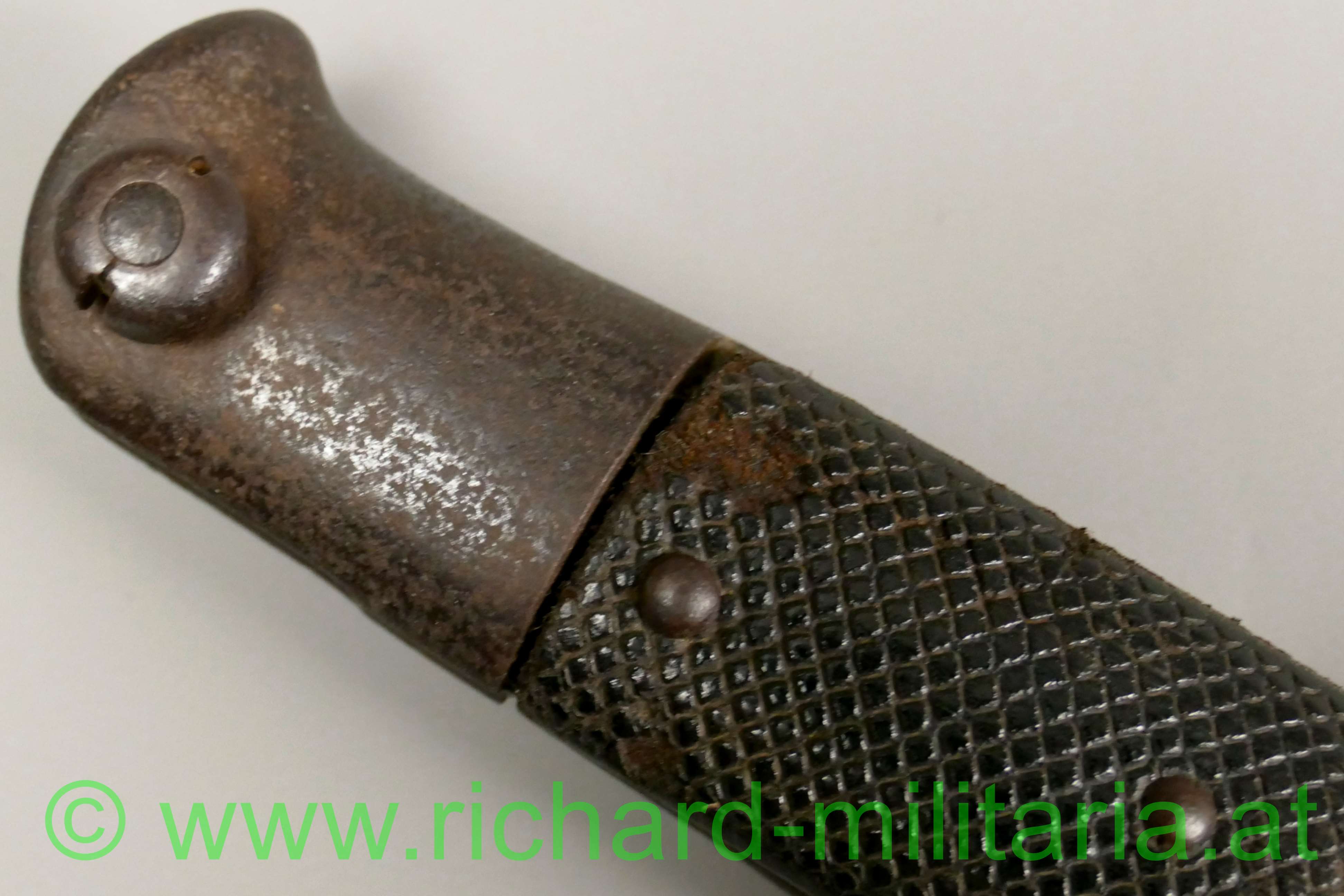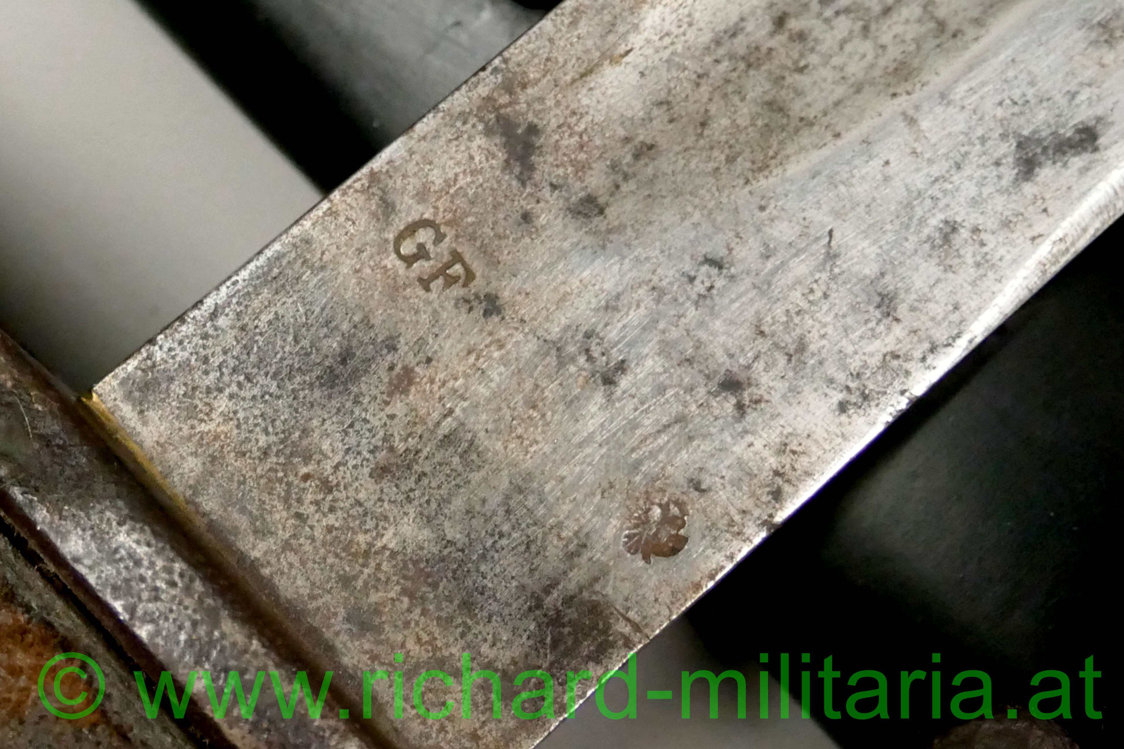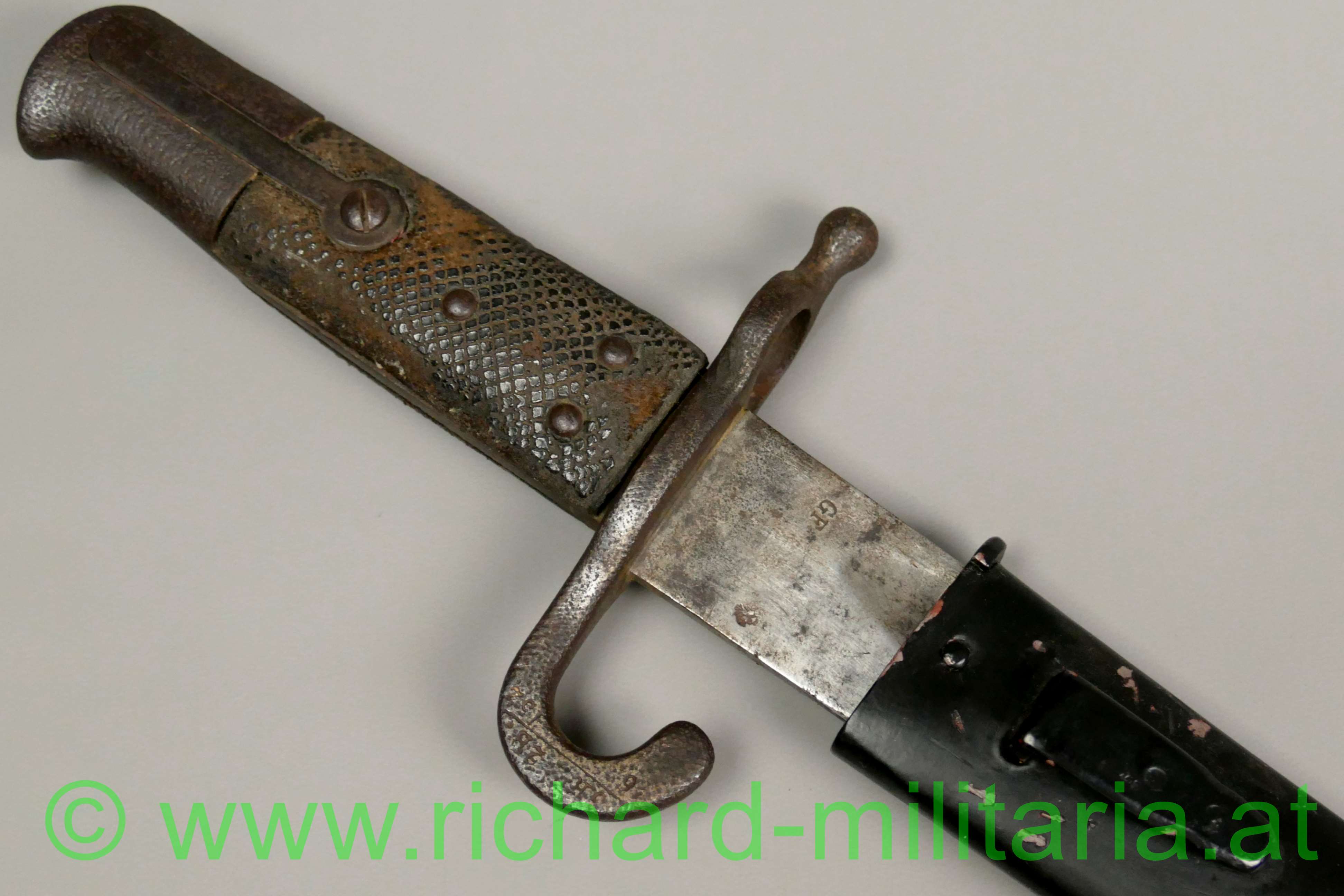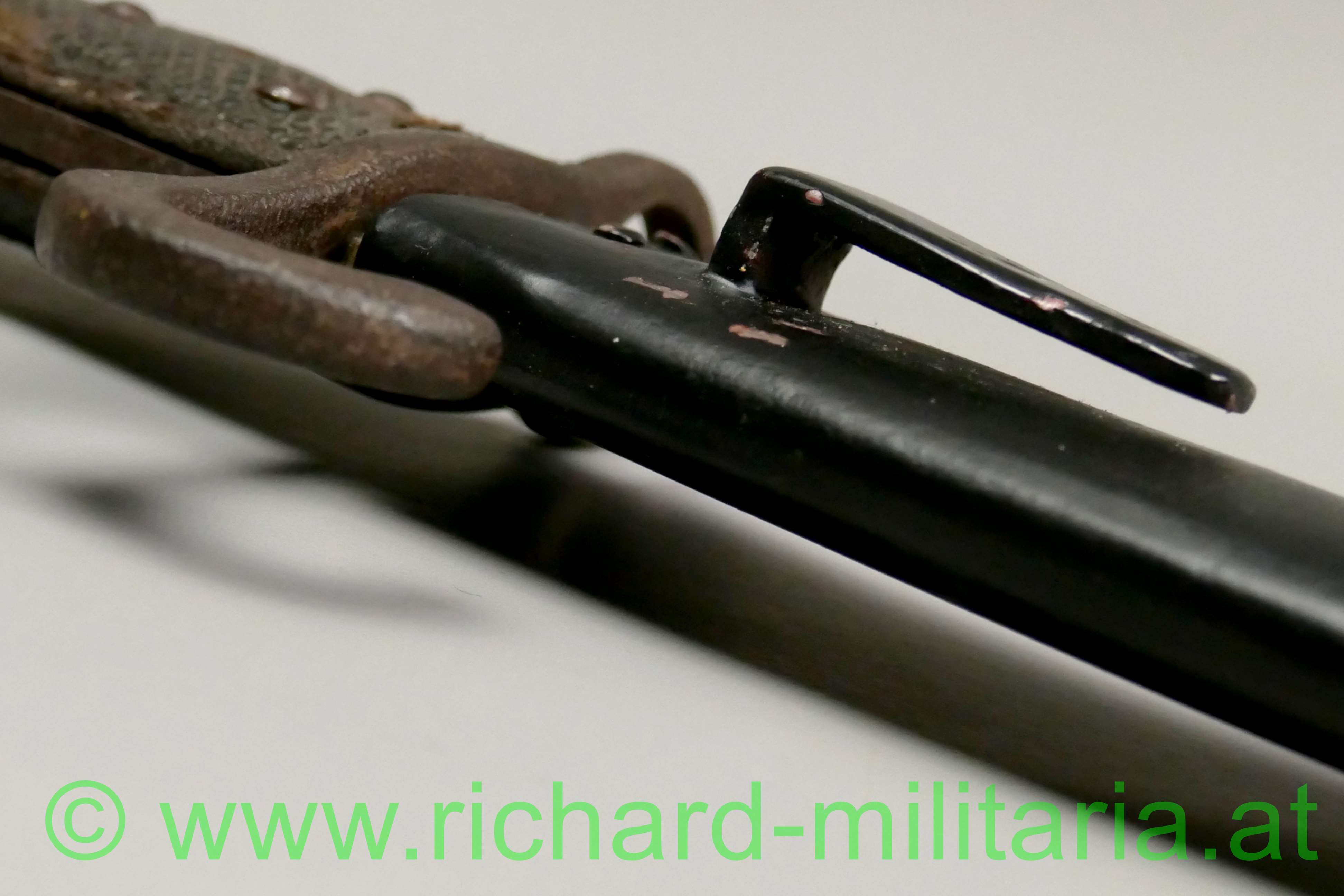 Österreich Säbelbajonett M1867 System Werndl; Klinge gereinigt und fleckig; am Klingenansatz ein Armeeabnahmestempel sowie zwei Stempelungen "GF" und "GM" und eine Herstellerstempelung "ST. Striberny"; Parierstange mit mehreren Markierungen; Parierstange flugrostig und etwas narbig; Griffschalen aus gepresstem Leder etwas abgewetzt; Klinge geht nicht ganz in die Scheide - Klingenlänge passend für die Scheide; Scheide neu lackiert mit unleserlichen Stempelungen am Tragehaken;