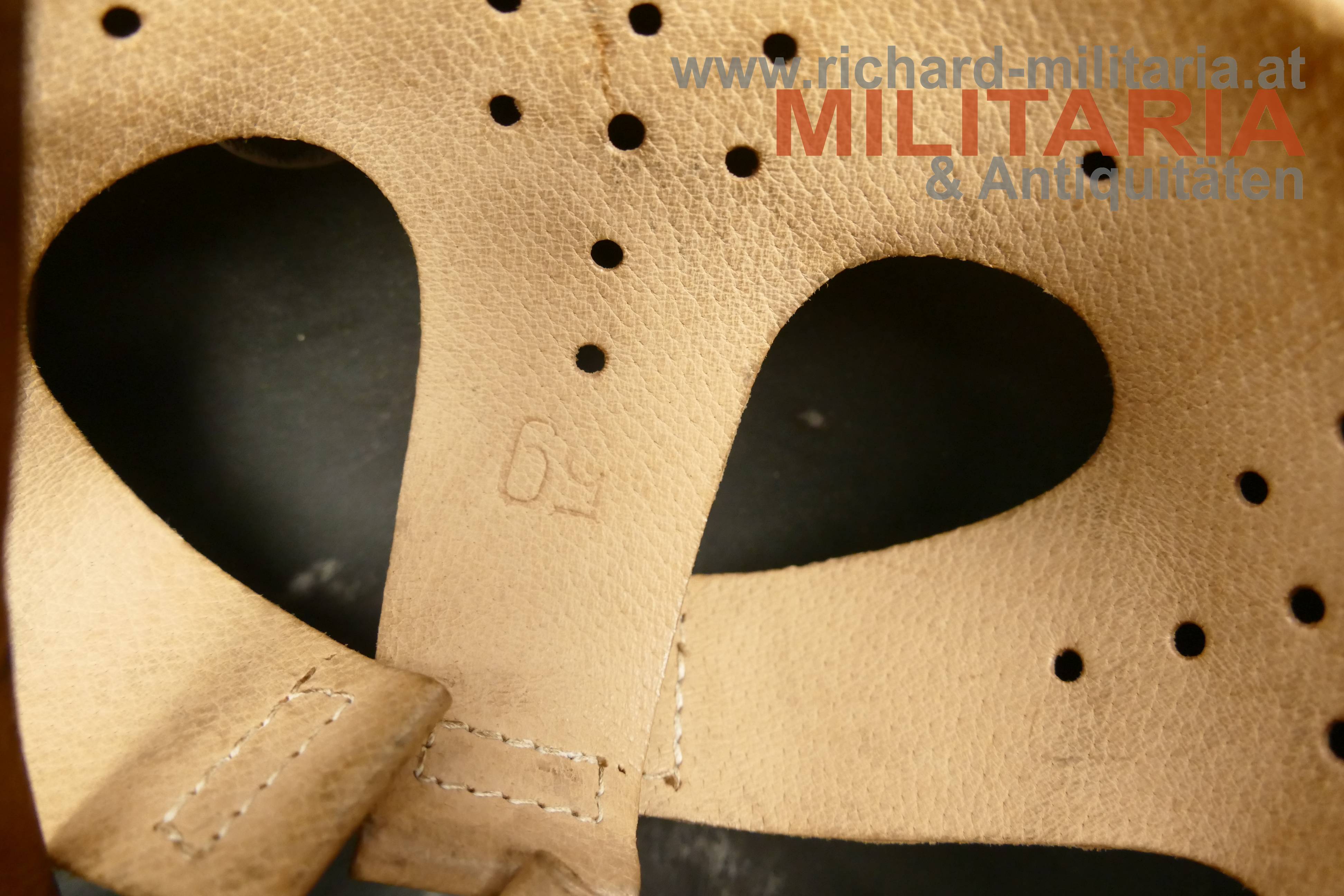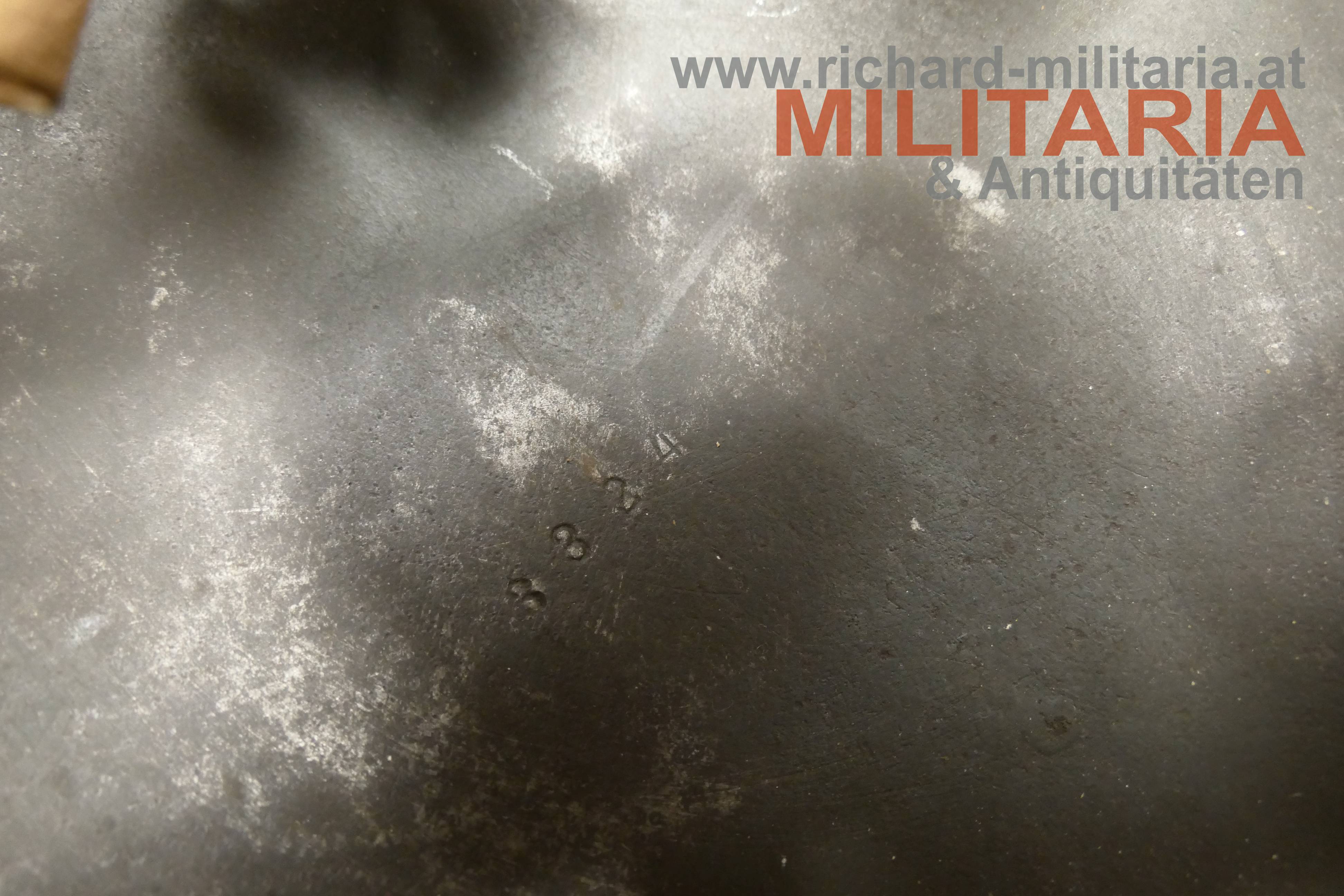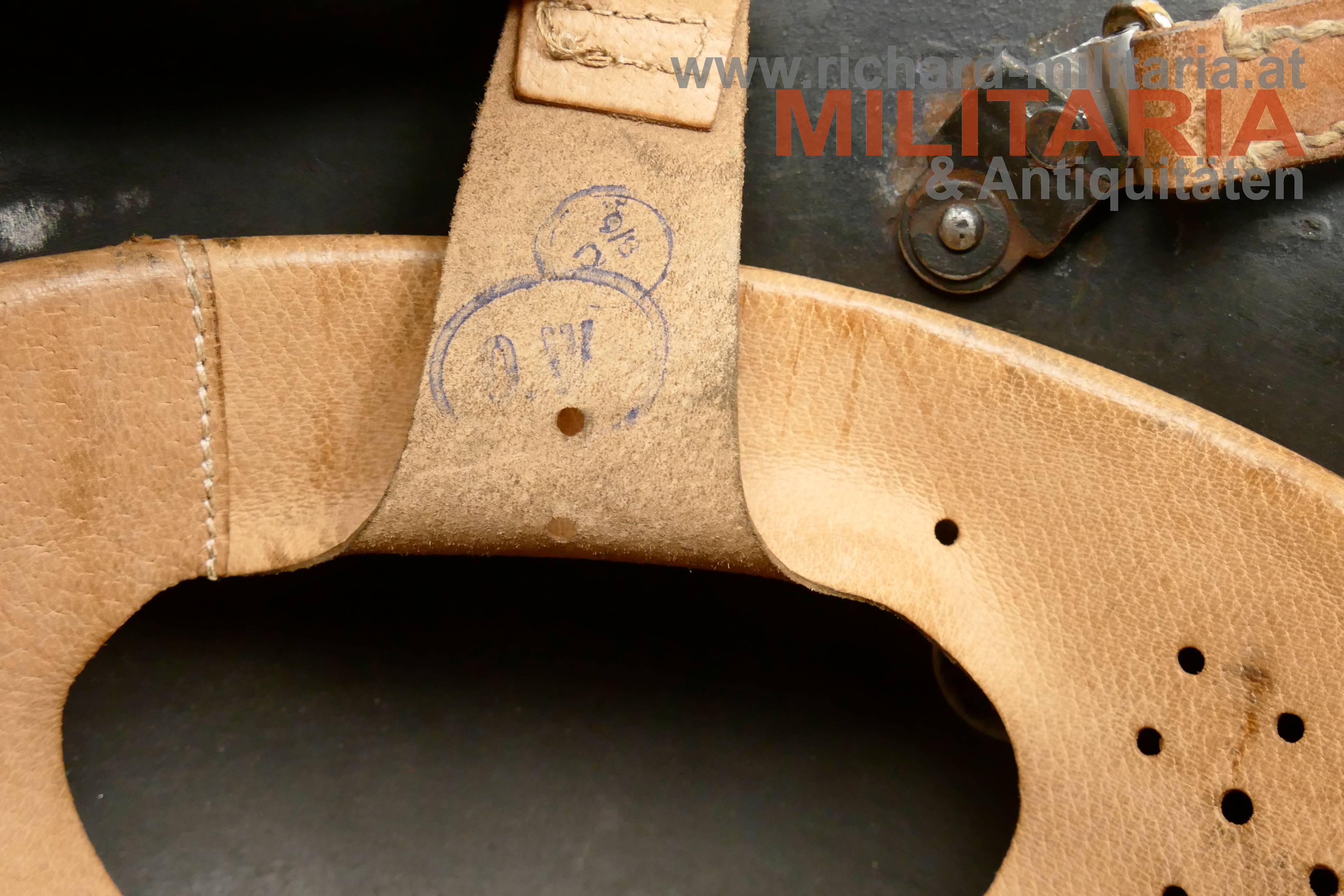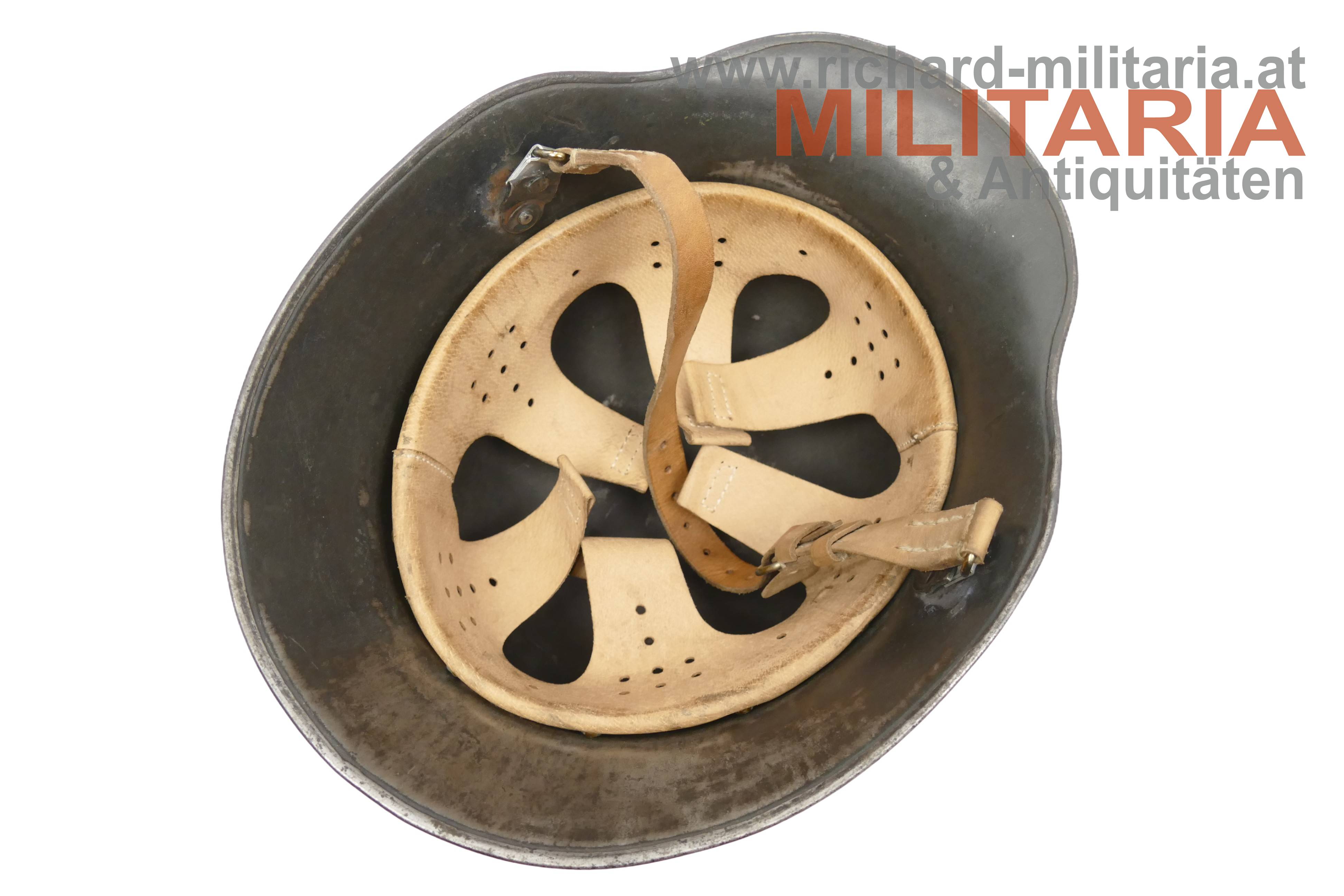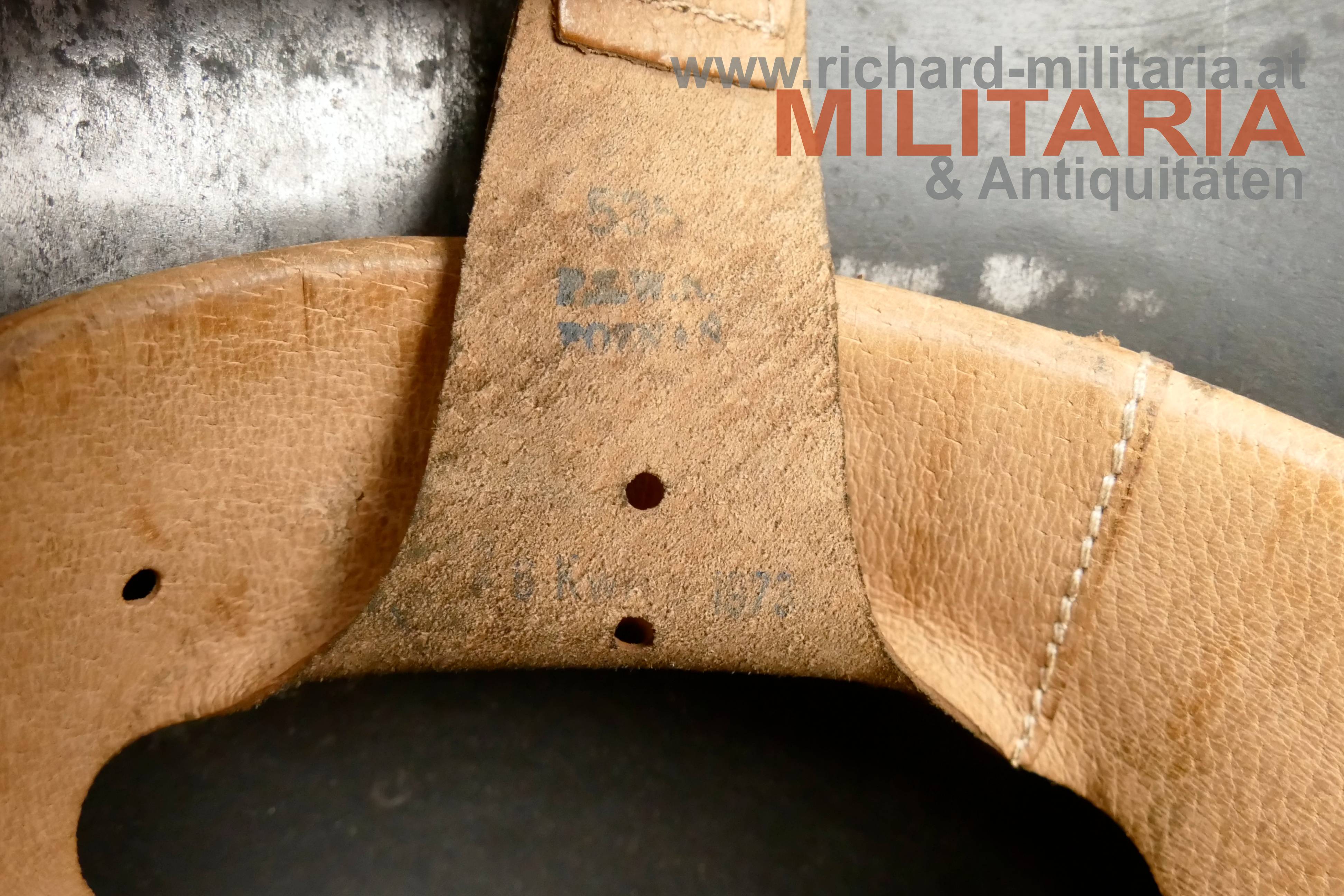 Österreich - Stahlhelm M17 - weiterverwendet; Helmglocke narbig und dunkelgrau nachlackiert; ausgetauschtes Helminnenfutter und Kinnriemen aus helbraunem Leder; Lederinnenfutter mit Größenstempel "59"; innen auf den Lederlaschen undeutlich gestempelt (u.a. "1973"); innen am Helmdom mit "3324" markiert;