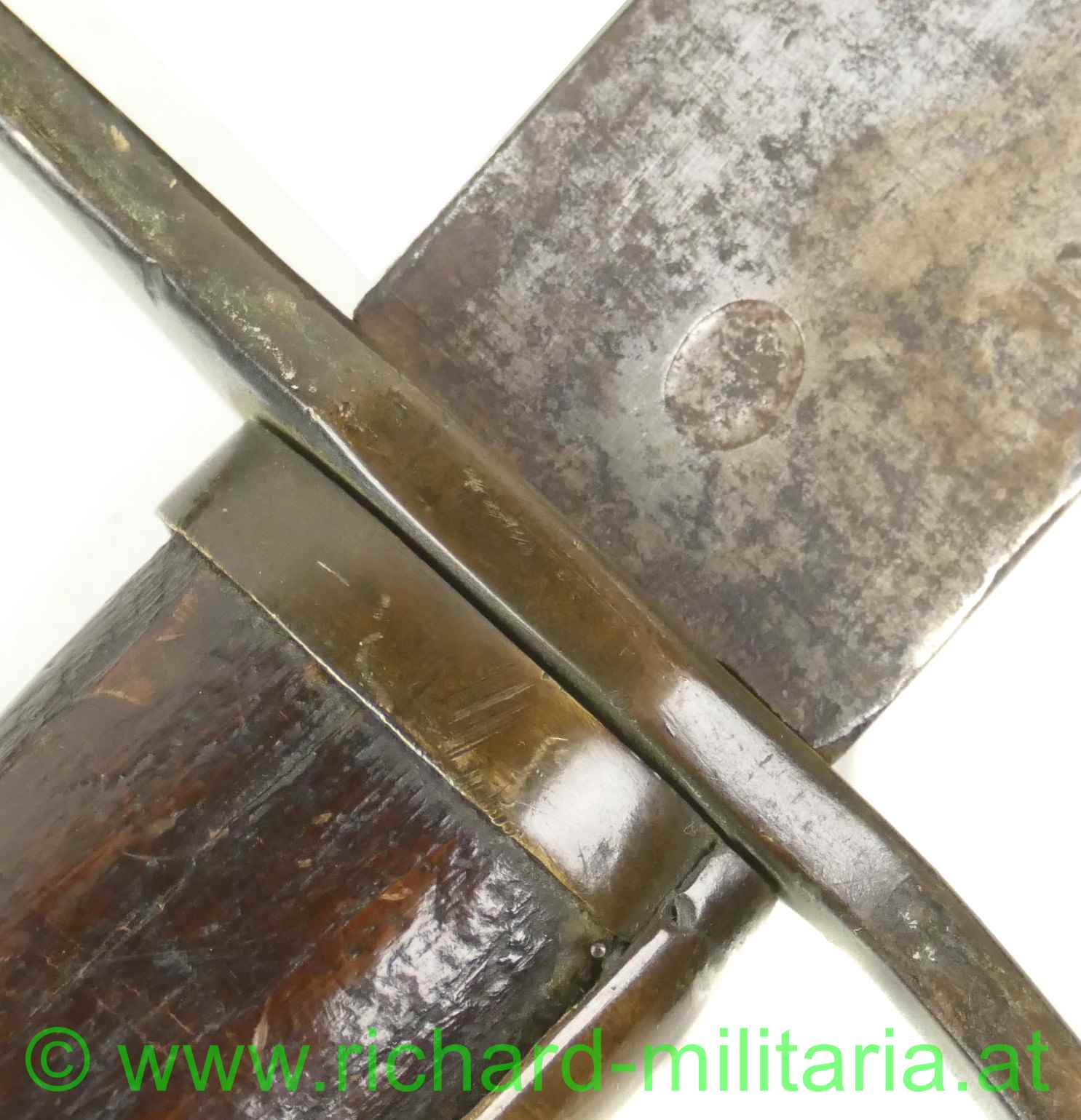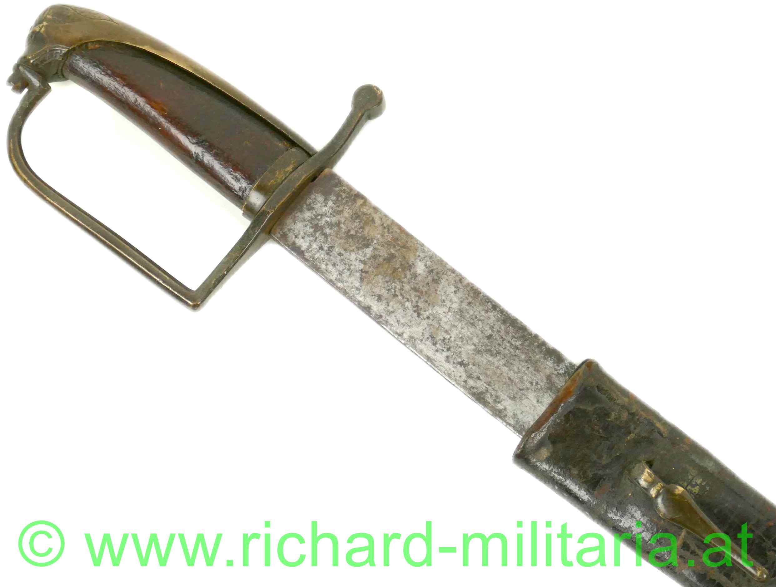 Österreich-Ungarn Löwenkopfsäbel; zwischen 1725 - 1780; Griff aus Messing mit Löwenkopf; Holzgriff, schwere massive Klinge mit ovalem Herstellerabzeichen; Klinge fleckig und leicht narbig; einige Scharten; schwarze Lederscheide mit Messingbeschlägen und Tragehaken;