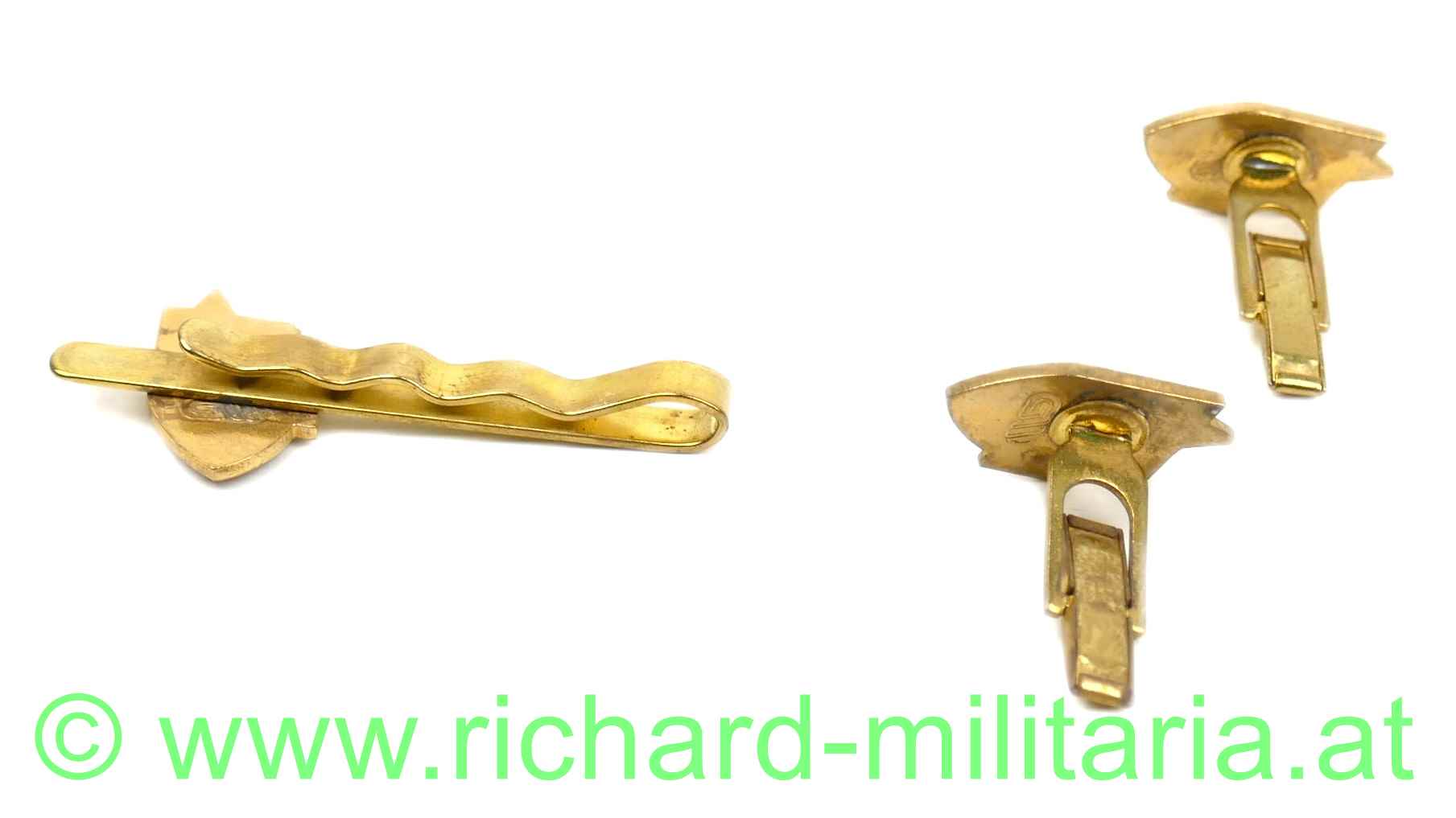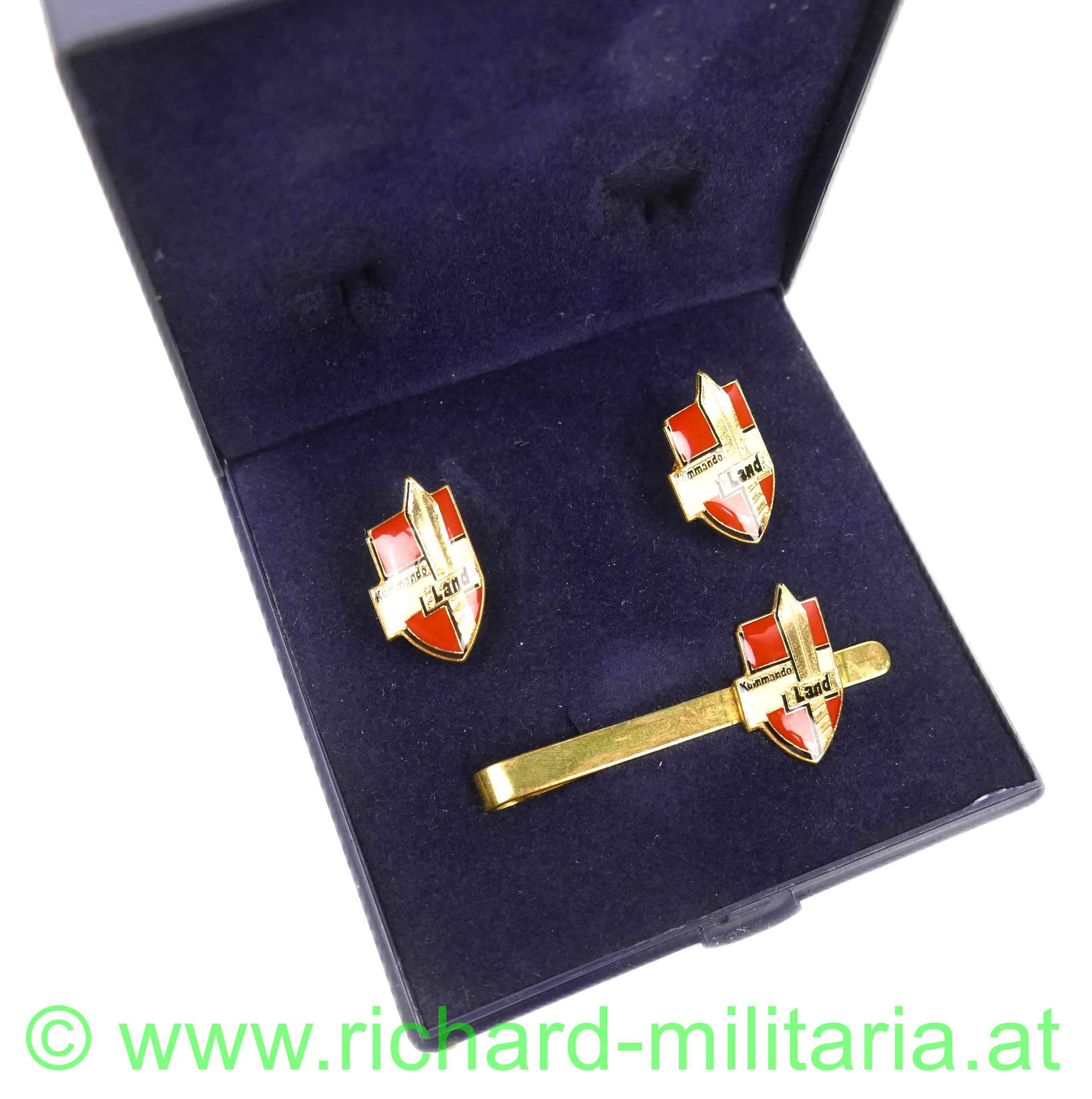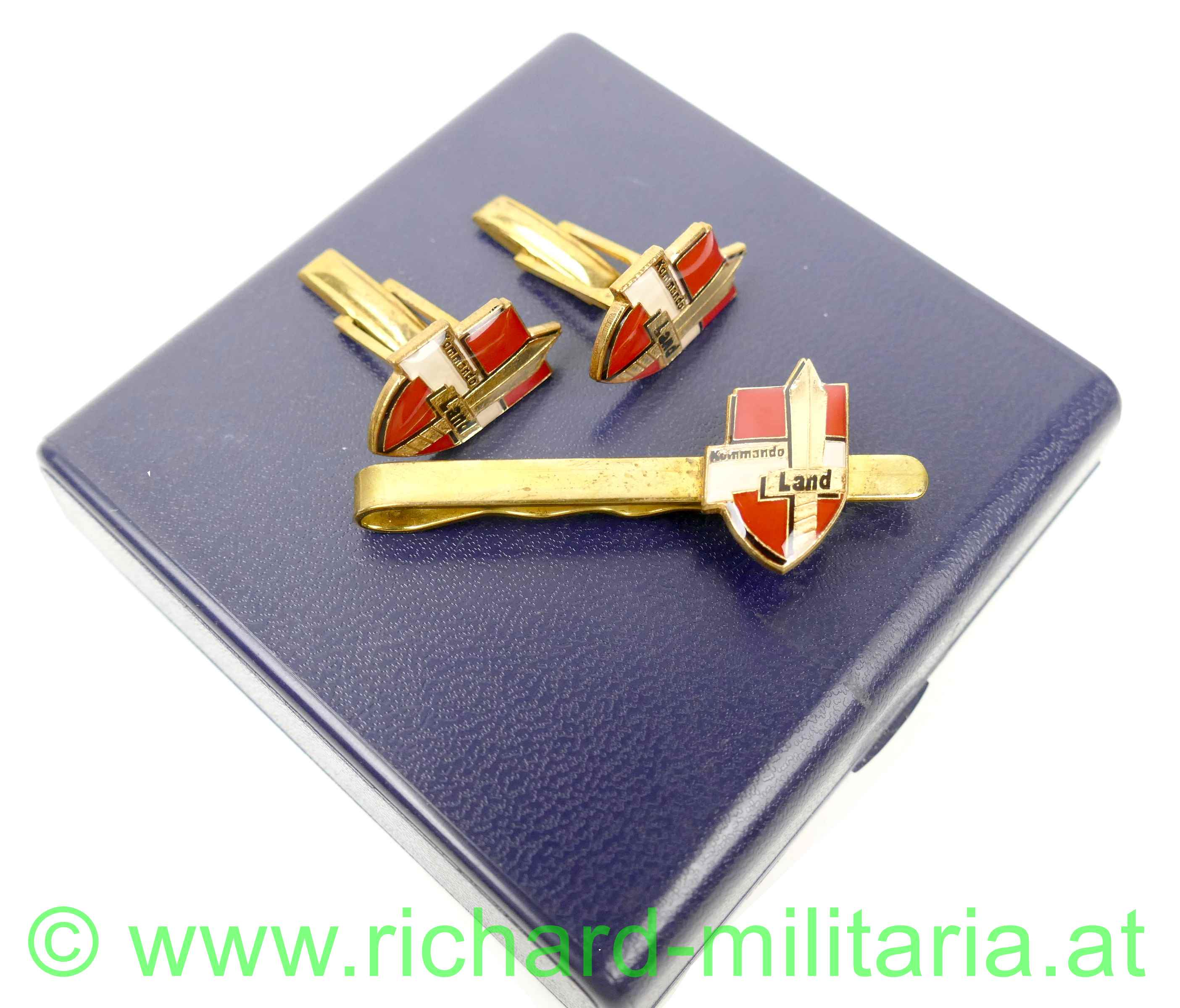 Österreichisches Bundesheer - Kommando Land - Manschettenknöpfe u. Krawattennadel, Tombak vergoldet Kunstharz versiegelt; im blauen Kunststoffetui