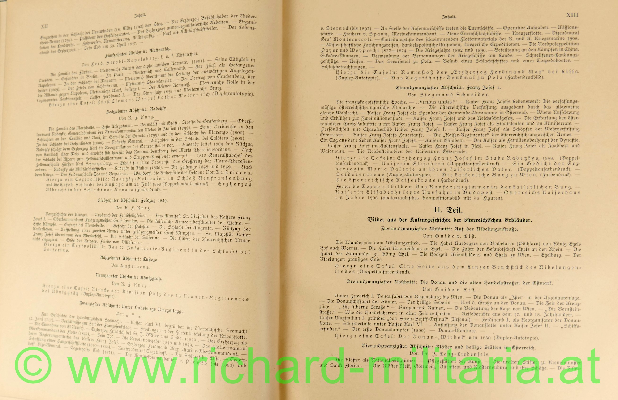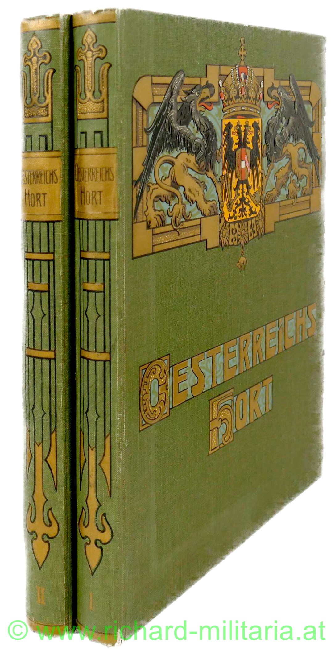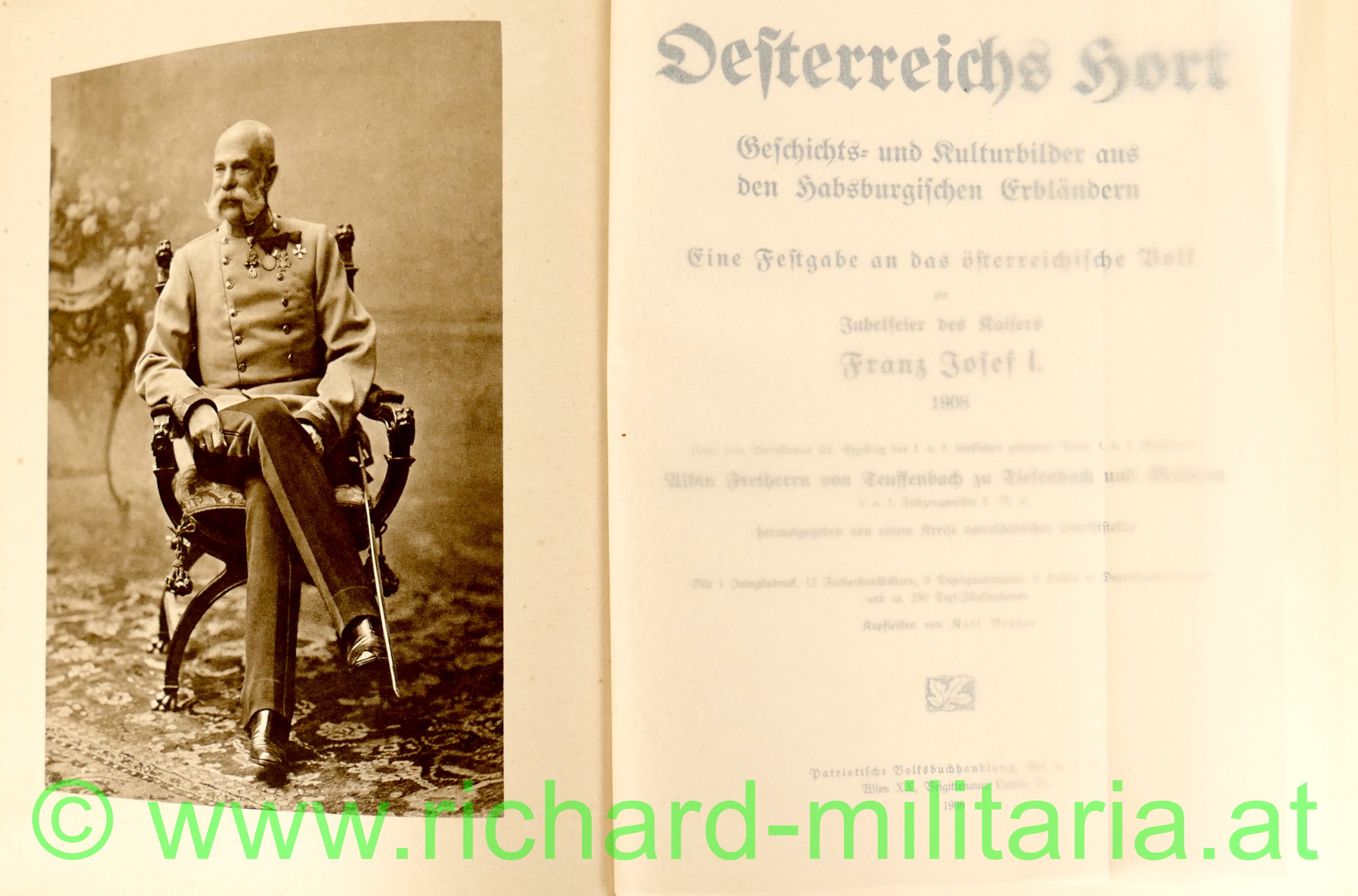 Österreichs Hort - 2 Bände, Geschichts- und Kulturbilder aus den Habsburgischen Erbländern, eine Festausgabe an das österreichische Volk zur Jubelfeier des Kaisers Franz Josef I., hrsg. v. einem Kreise vaterländischer Schriftsteller; Verlag Wien patriotische Volksbuchhandlung 1908, vollständig alle Seiten vorhanden, farbig bedruckter Glanzleineneinband,