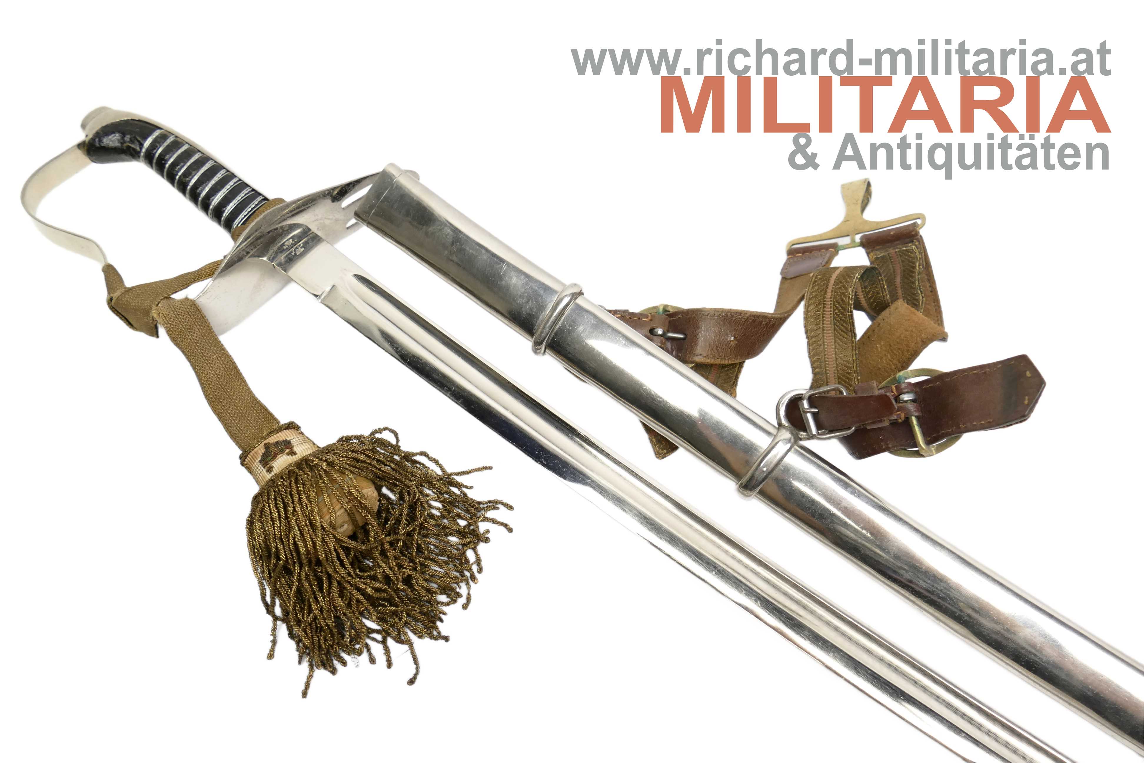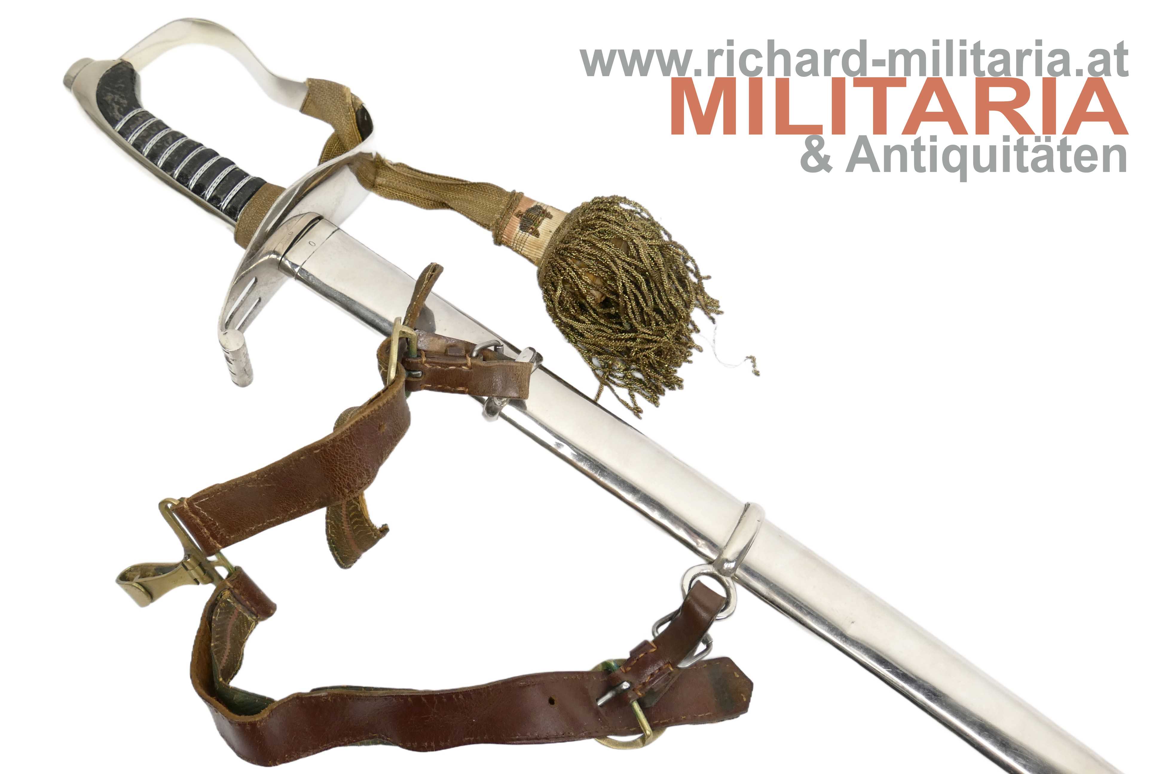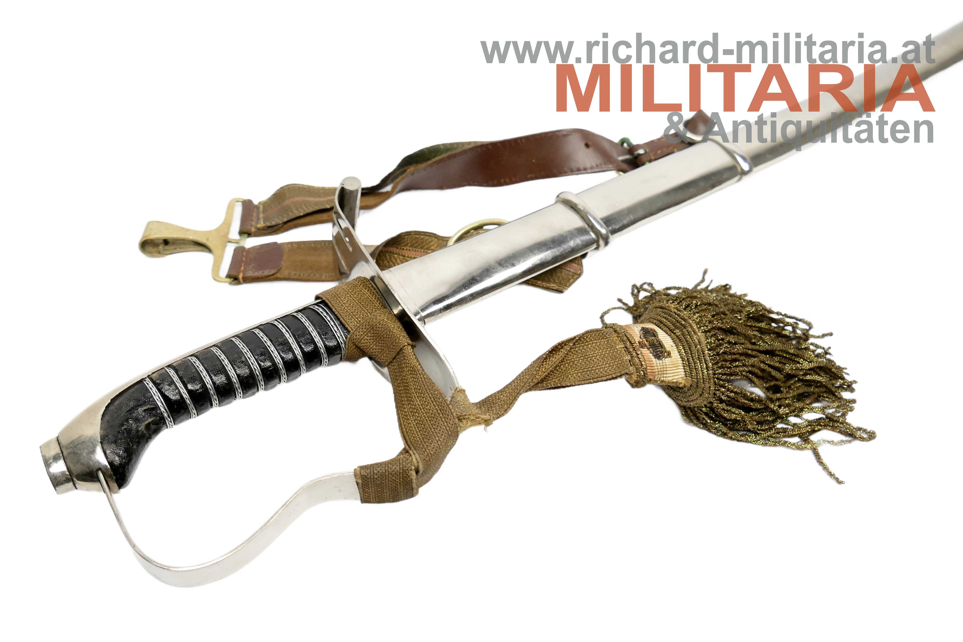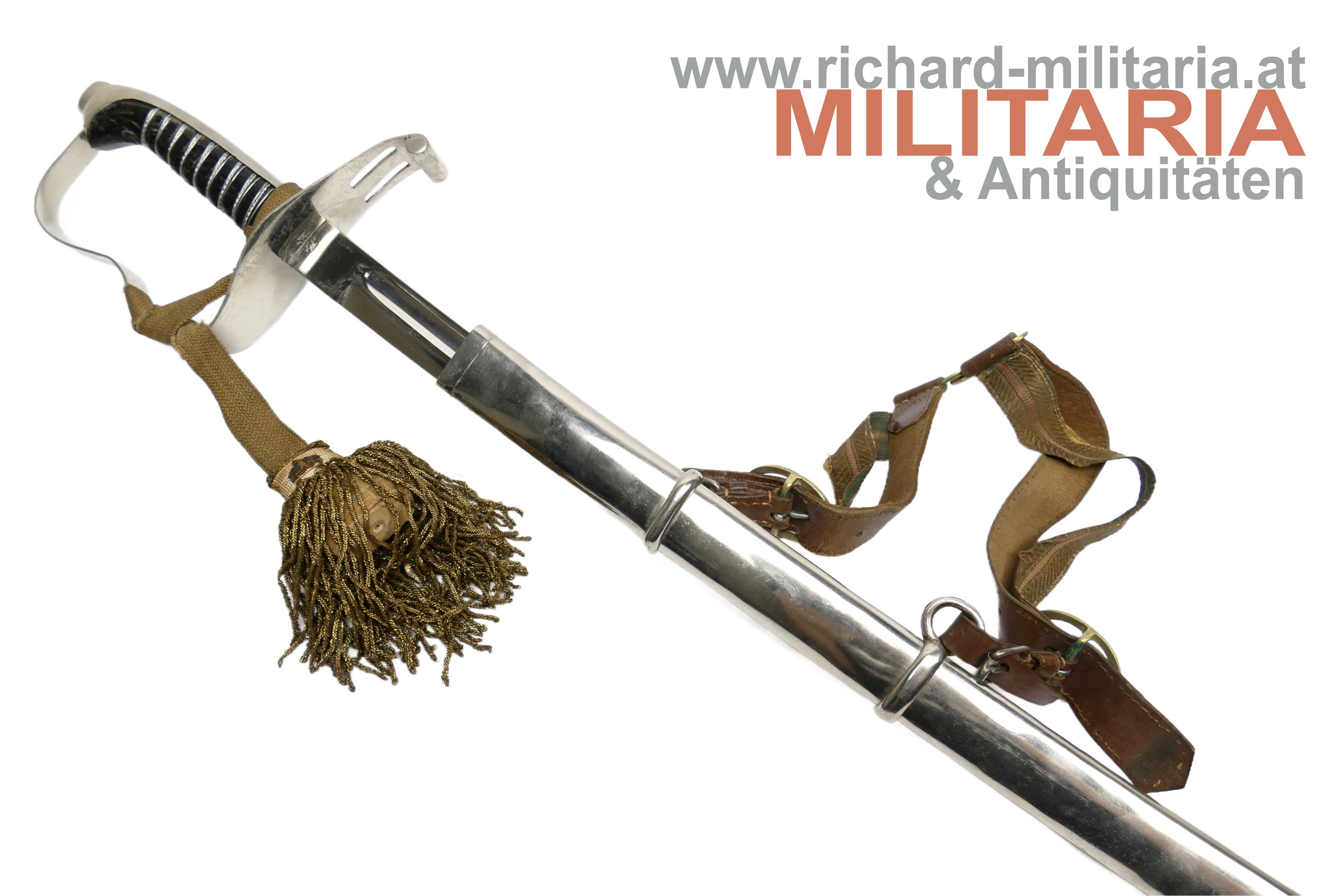 Offizierssäbel M1861 in Verwendung bei den ungarischen Streitkräften oder der Polizei/Gendarmerie aus der Zwischenkriegszeit; vernickelte Ausführung mit undeutlichem Herstellerlogo (Kronenwappen) auf der sehr schönen Klinge; Griff mit Fischhaut (geschwärzt) und Drahtwicklung; gebundenes ungarischen Offiziers-Portepee mit plastisch eingestickter Stephanskrone; Tragespuren und Beschädigungen; vernickelte Scheide mit ungarischem Säbelgehänge; goldene Borte mit einem roten Mittelstreifen; ausgeblichen und die Borte hat sich großteils vom Leder gelöst. Auf der Rückseite der Scheide am Mundblech eine eingeschlagene "0" und 2 Buchstaben "F Z" eingeritzt. Scheide am unteren Ende gereinigt.