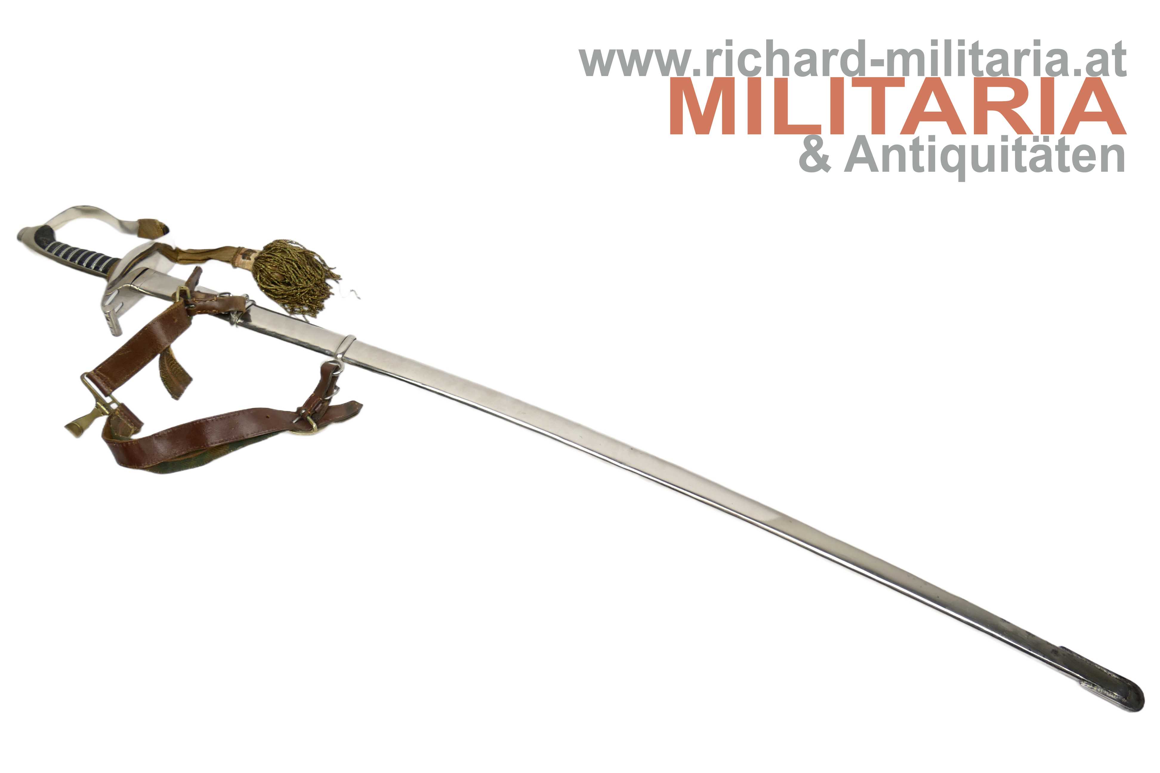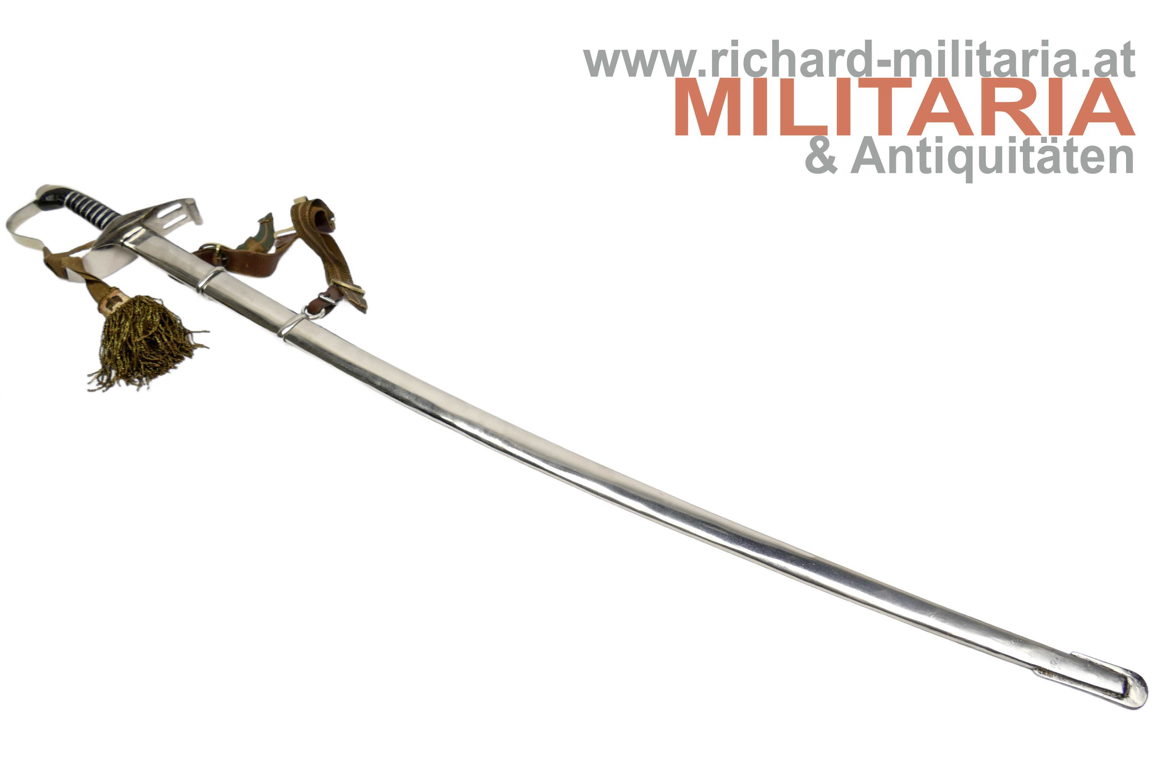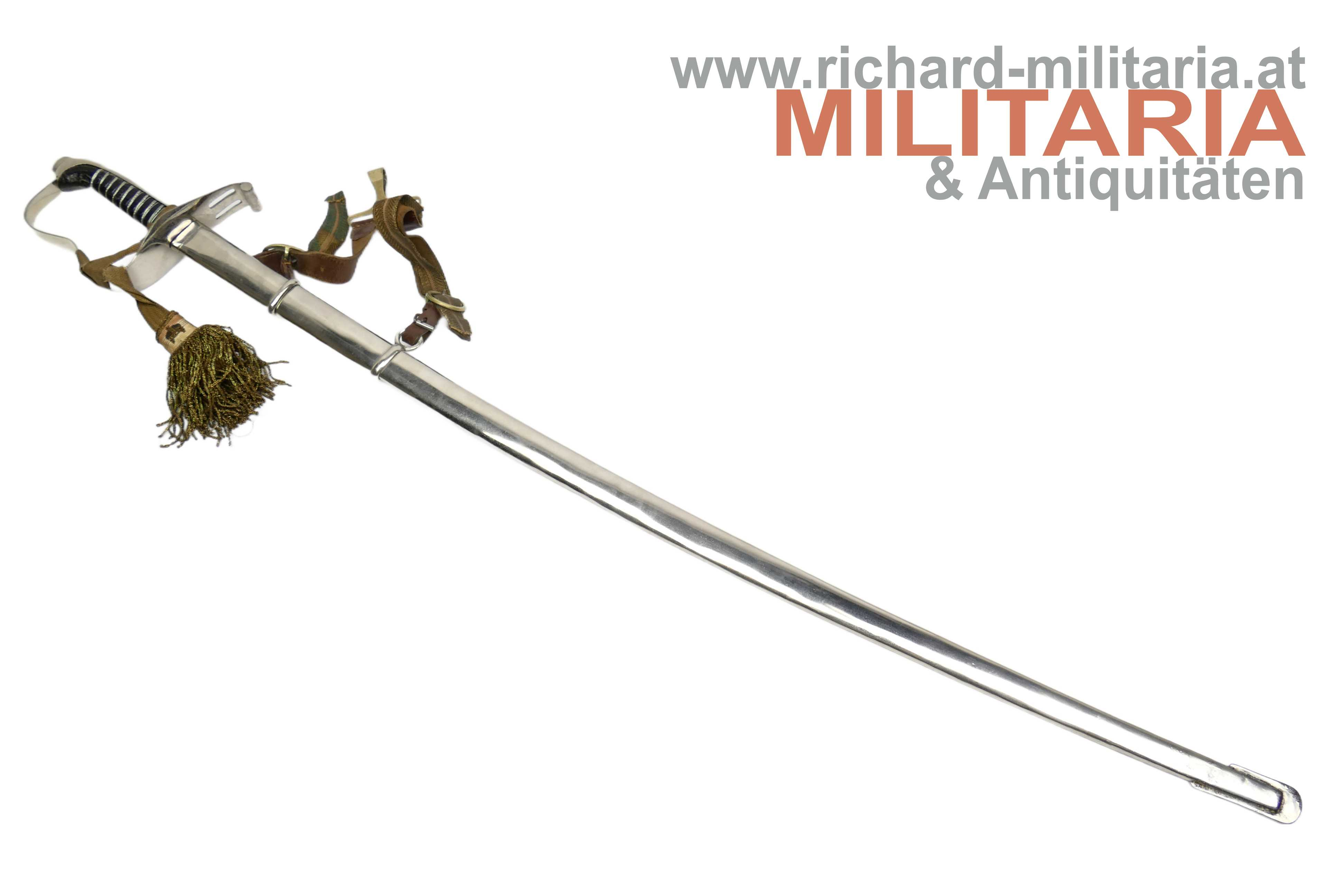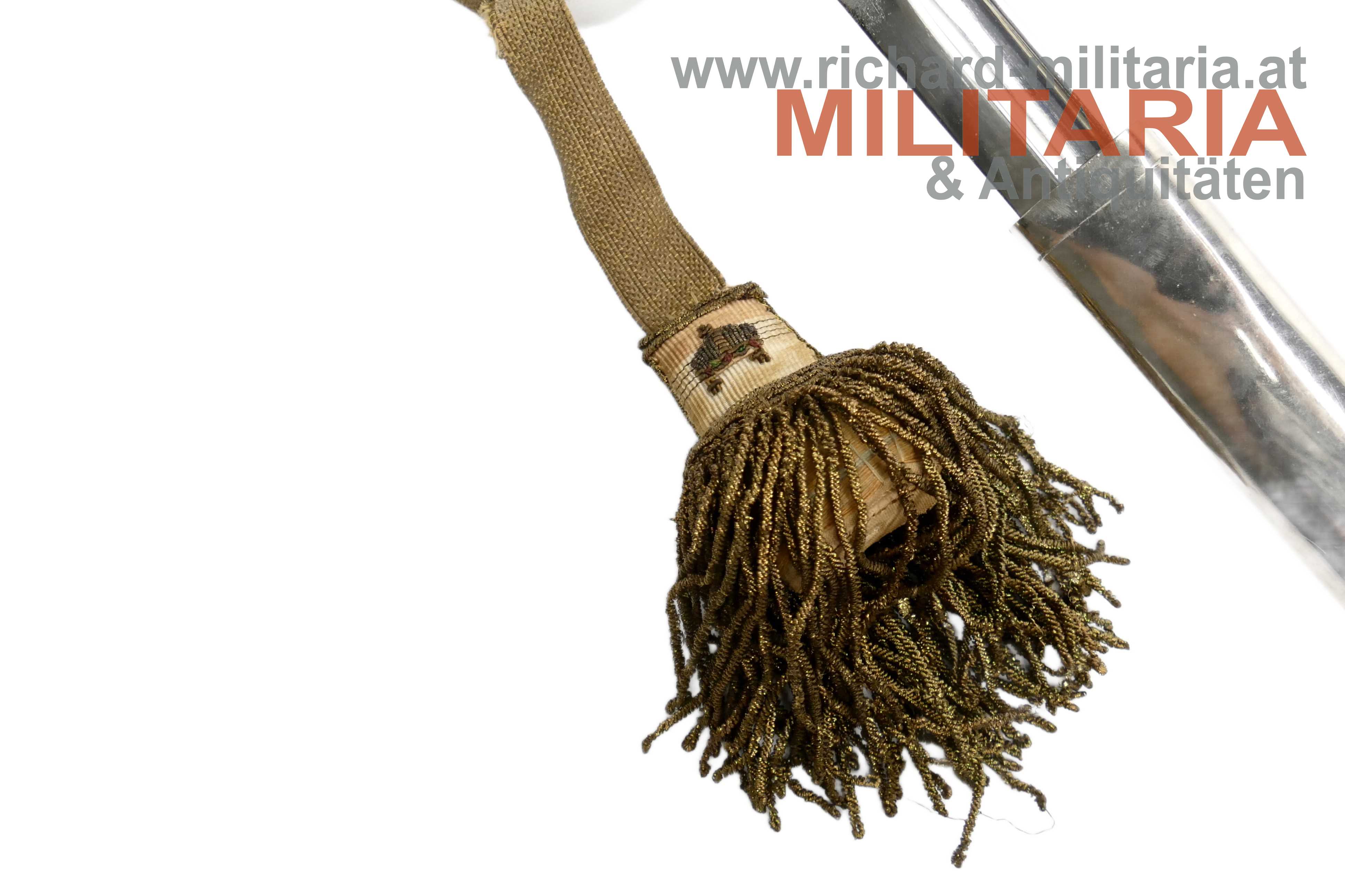Offizierssäbel M1861 in Verwendung bei den ungarischen Streitkräften oder der Polizei/Gendarmerie aus der Zwischenkriegszeit; vernickelte Ausführung mit undeutlichem Herstellerlogo (Kronenwappen) auf der sehr schönen Klinge; Griff mit Fischhaut (geschwärzt) und Drahtwicklung; gebundenes ungarischen Offiziers-Portepee mit plastisch eingestickter Stephanskrone; Tragespuren und Beschädigungen; vernickelte Scheide mit ungarischem Säbelgehänge; goldene Borte mit einem roten Mittelstreifen; ausgeblichen und die Borte hat sich großteils vom Leder gelöst. Auf der Rückseite der Scheide am Mundblech eine eingeschlagene "0" und 2 Buchstaben "F Z" eingeritzt. Scheide am unteren Ende gereinigt.