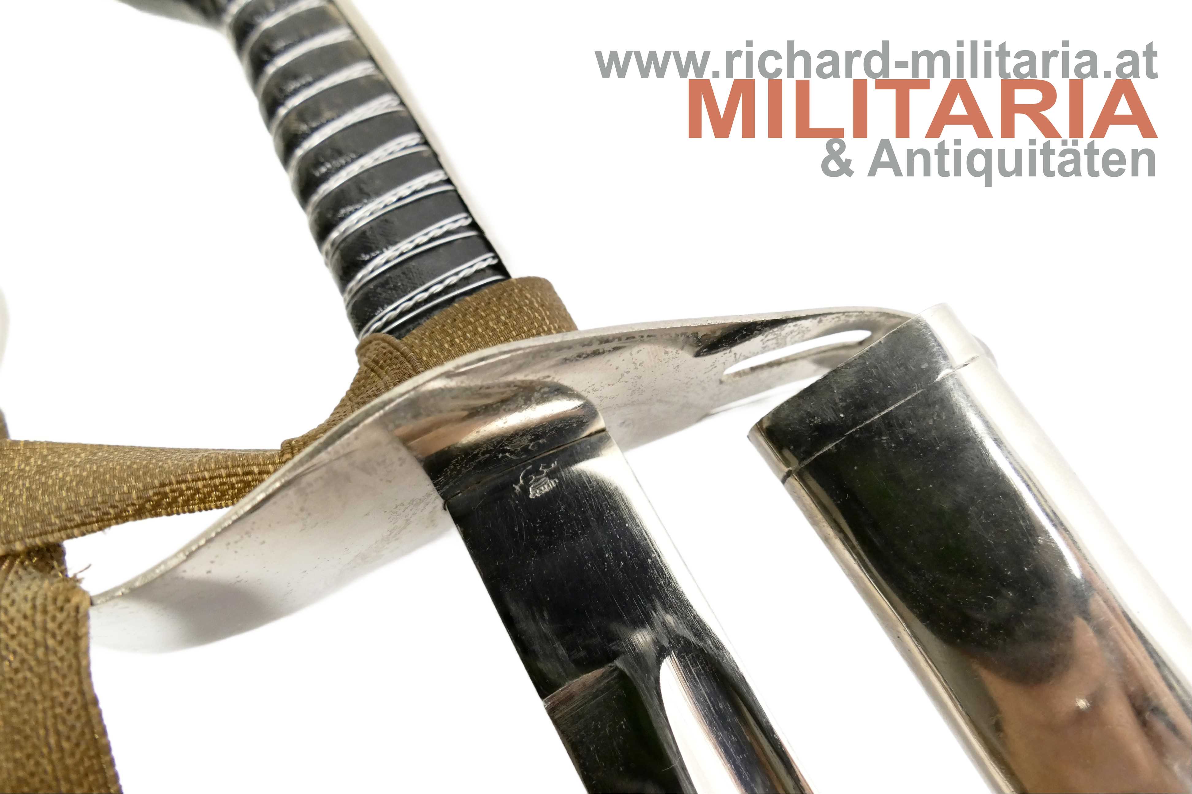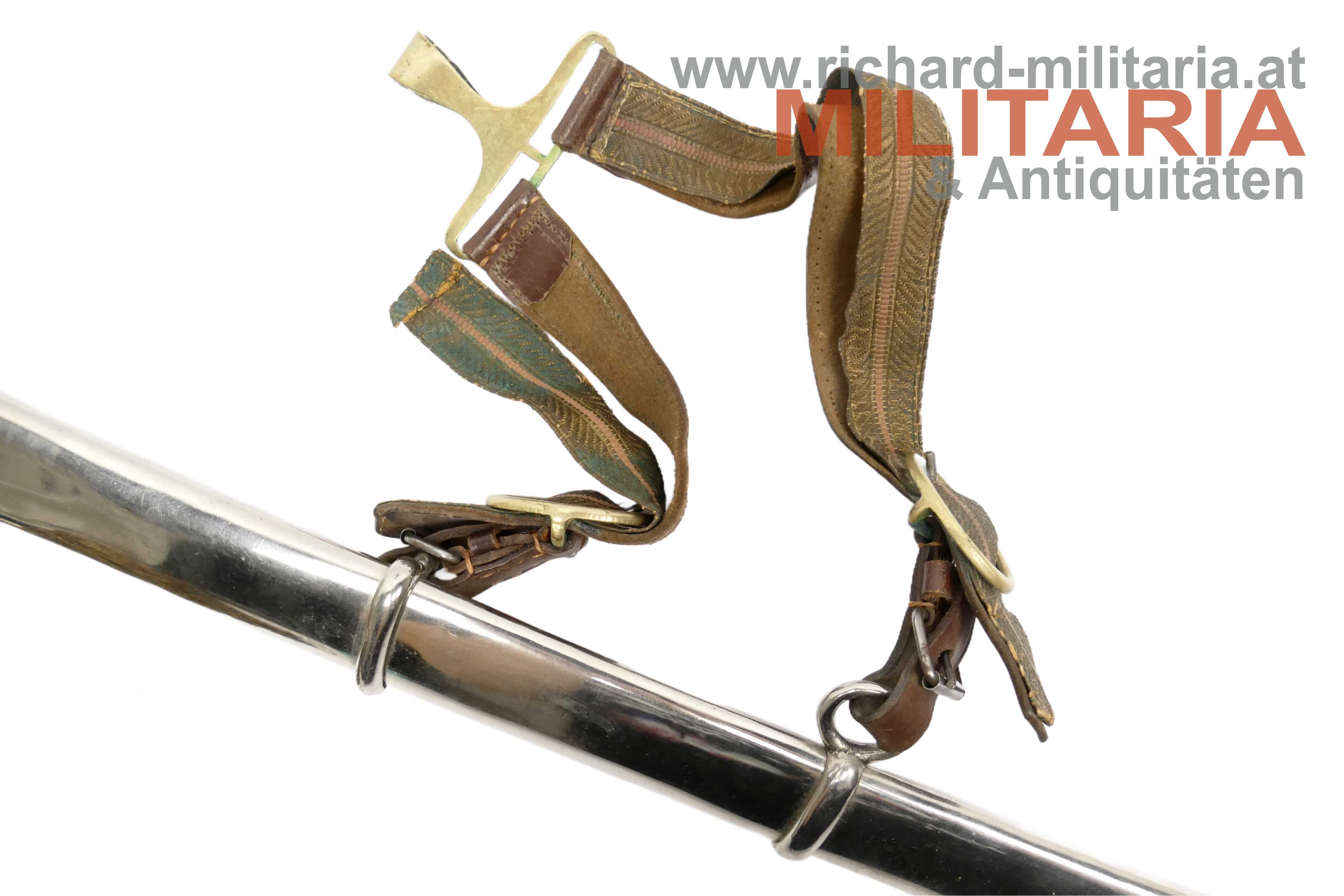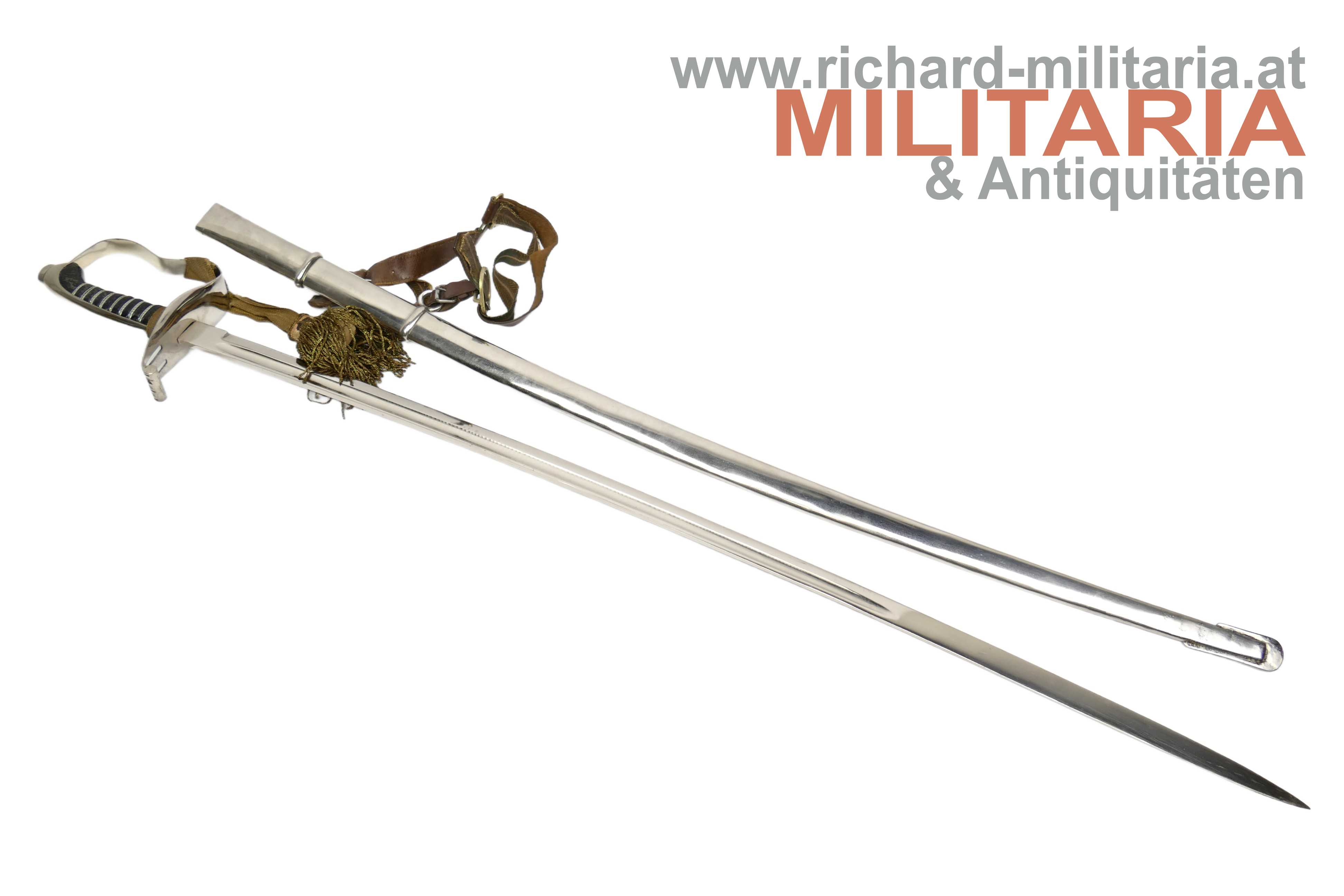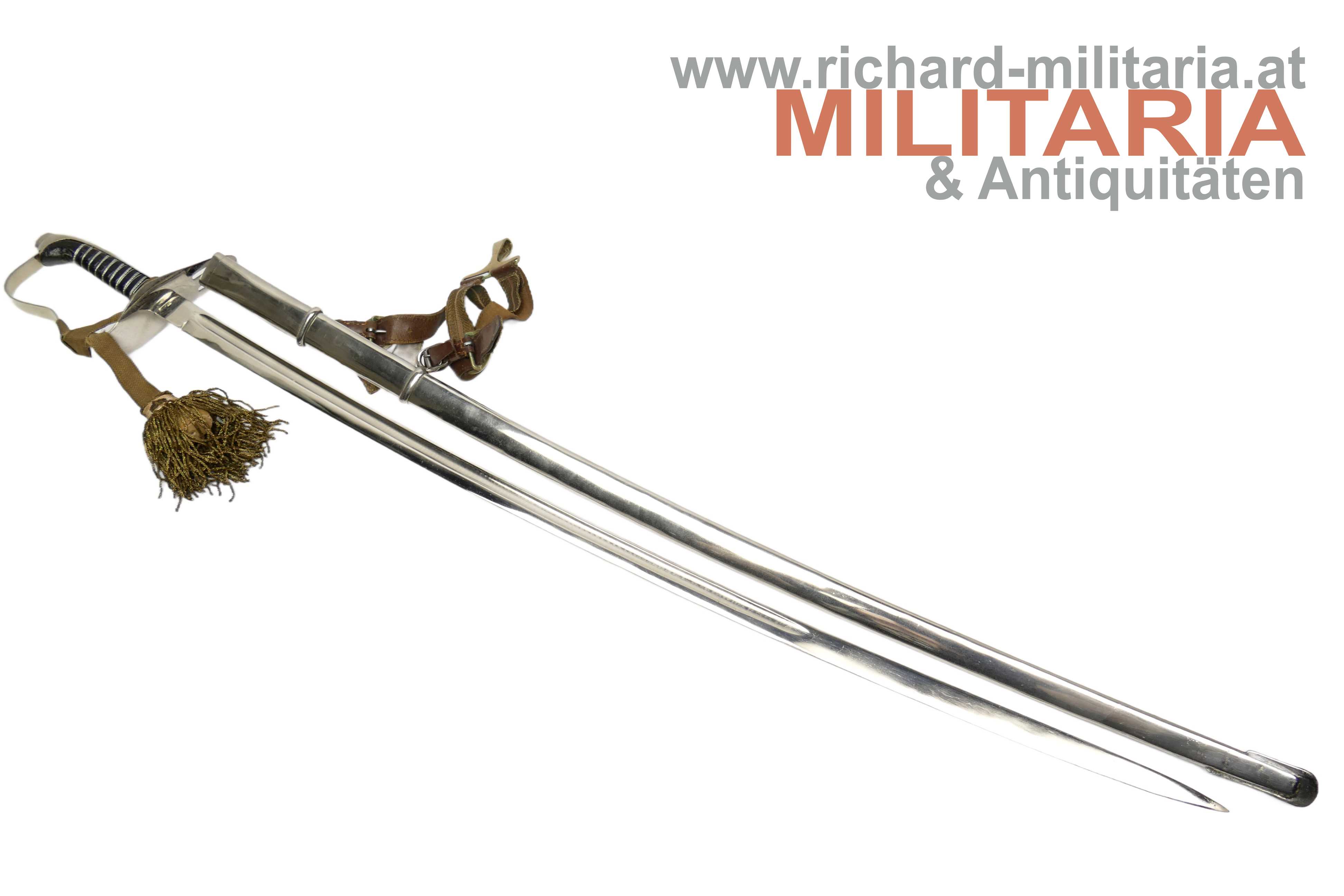 Offizierssäbel M1861 in Verwendung bei den ungarischen Streitkräften oder der Polizei/Gendarmerie aus der Zwischenkriegszeit; vernickelte Ausführung mit undeutlichem Herstellerlogo (Kronenwappen) auf der sehr schönen Klinge; Griff mit Fischhaut (geschwärzt) und Drahtwicklung; gebundenes ungarischen Offiziers-Portepee mit plastisch eingestickter Stephanskrone; Tragespuren und Beschädigungen; vernickelte Scheide mit ungarischem Säbelgehänge; goldene Borte mit einem roten Mittelstreifen; ausgeblichen und die Borte hat sich großteils vom Leder gelöst. Auf der Rückseite der Scheide am Mundblech eine eingeschlagene "0" und 2 Buchstaben "F Z" eingeritzt. Scheide am unteren Ende gereinigt.