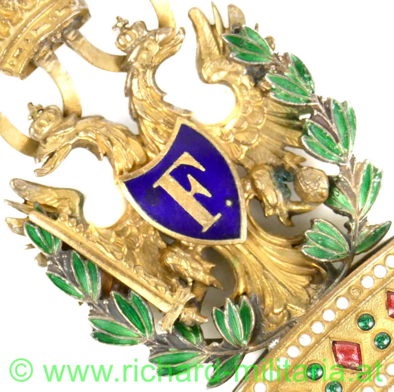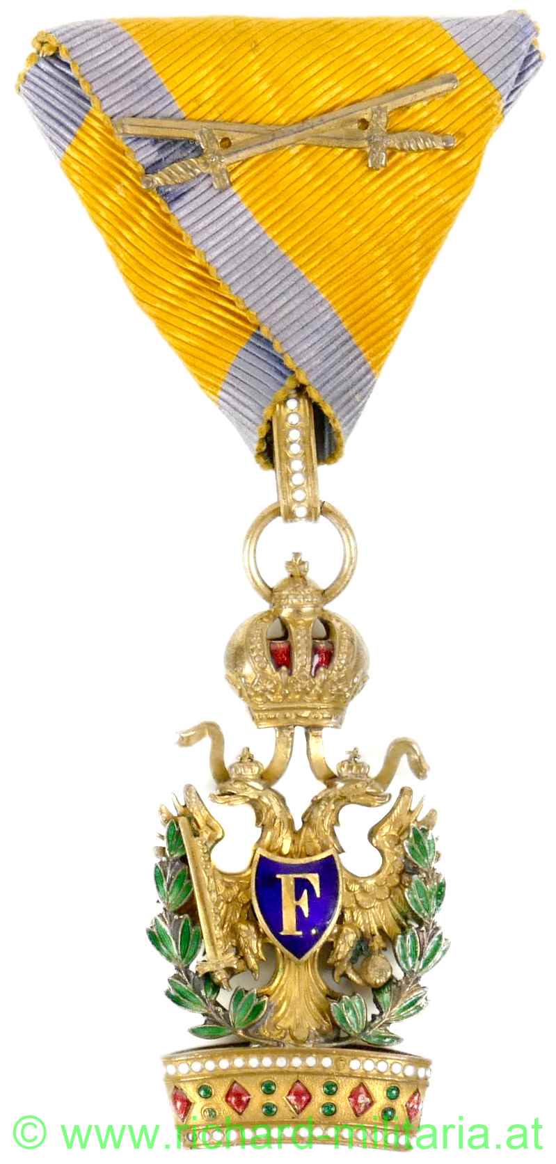 Orden der Eisernen Krone III. Klasse mit Kriegsdekoration und Schwertern, Bronze feuervergoldet und teilweise emailliert; leichte Tragespuren; Krone ohne Eiseneinlage; originales Band mit aufgelegten Schwertern;
