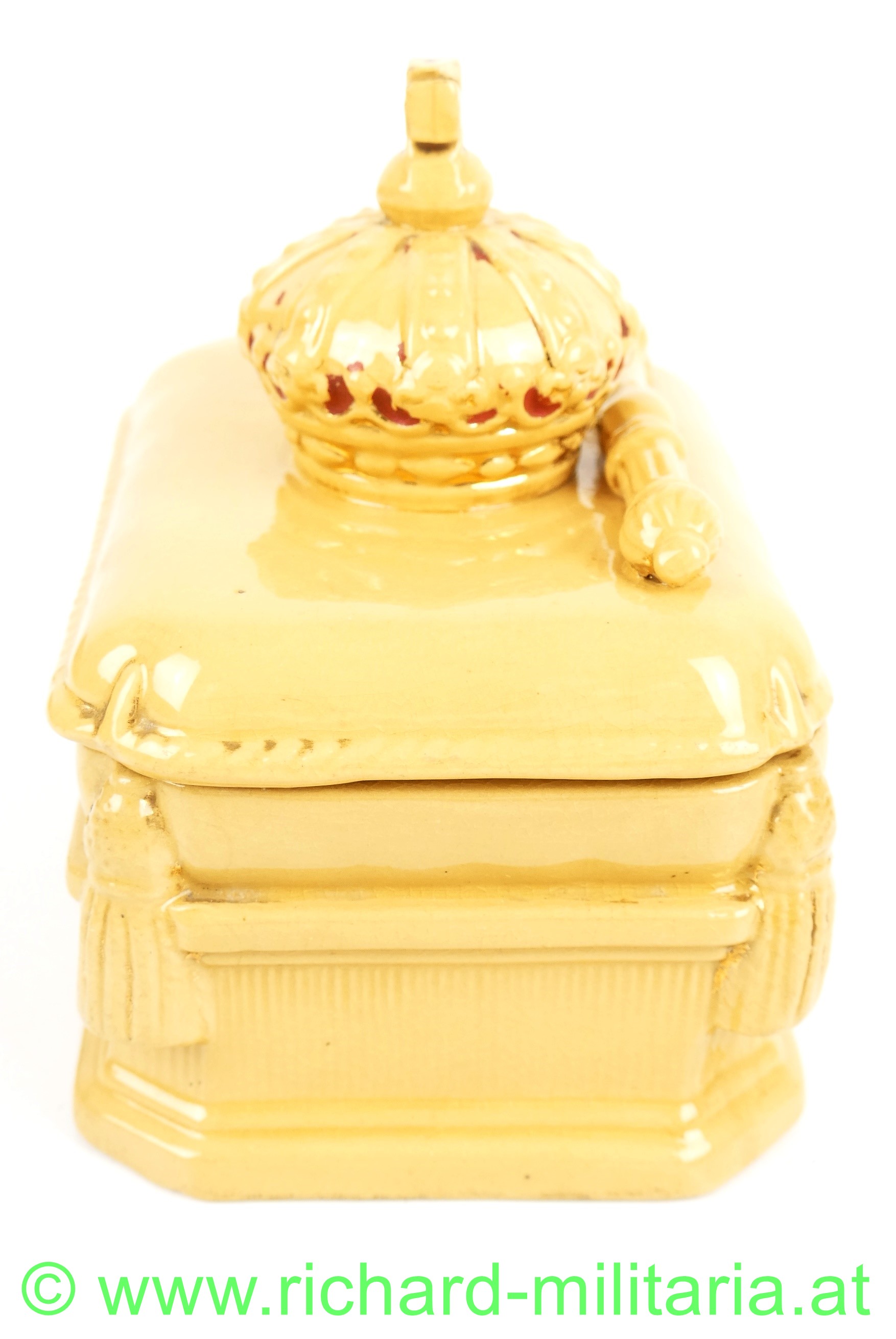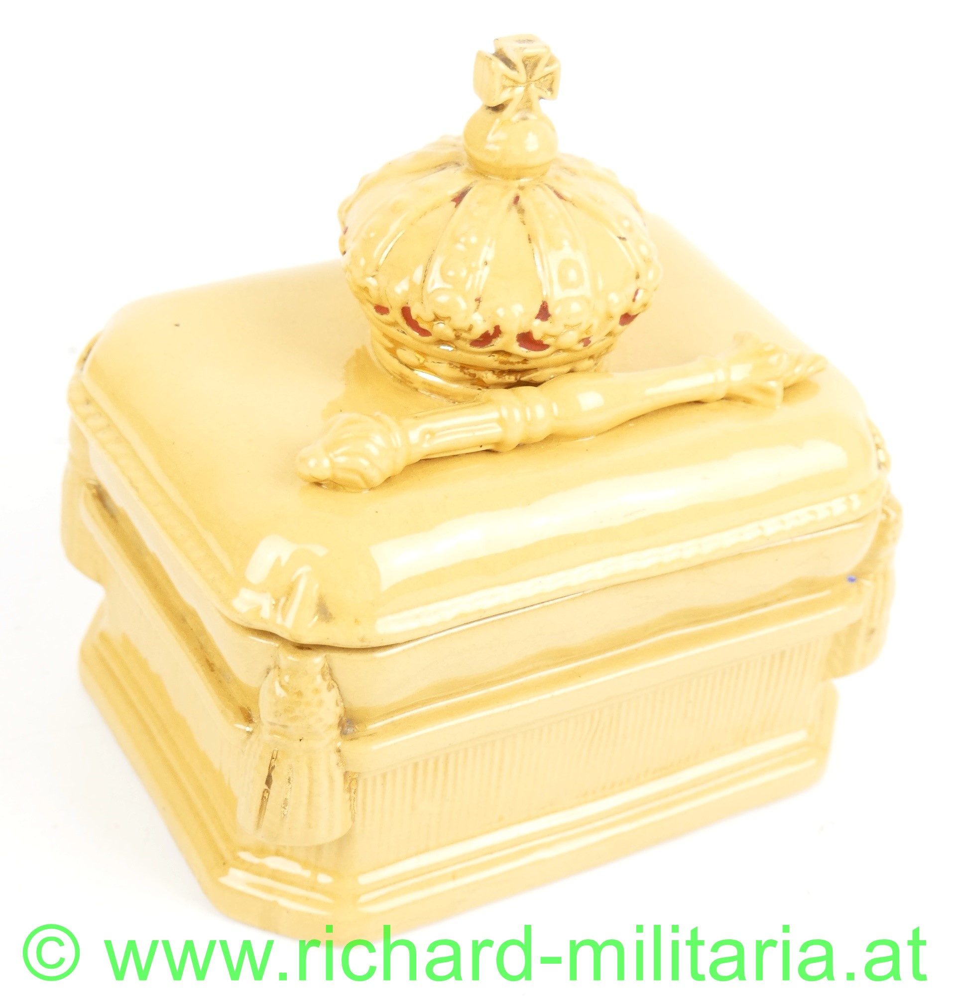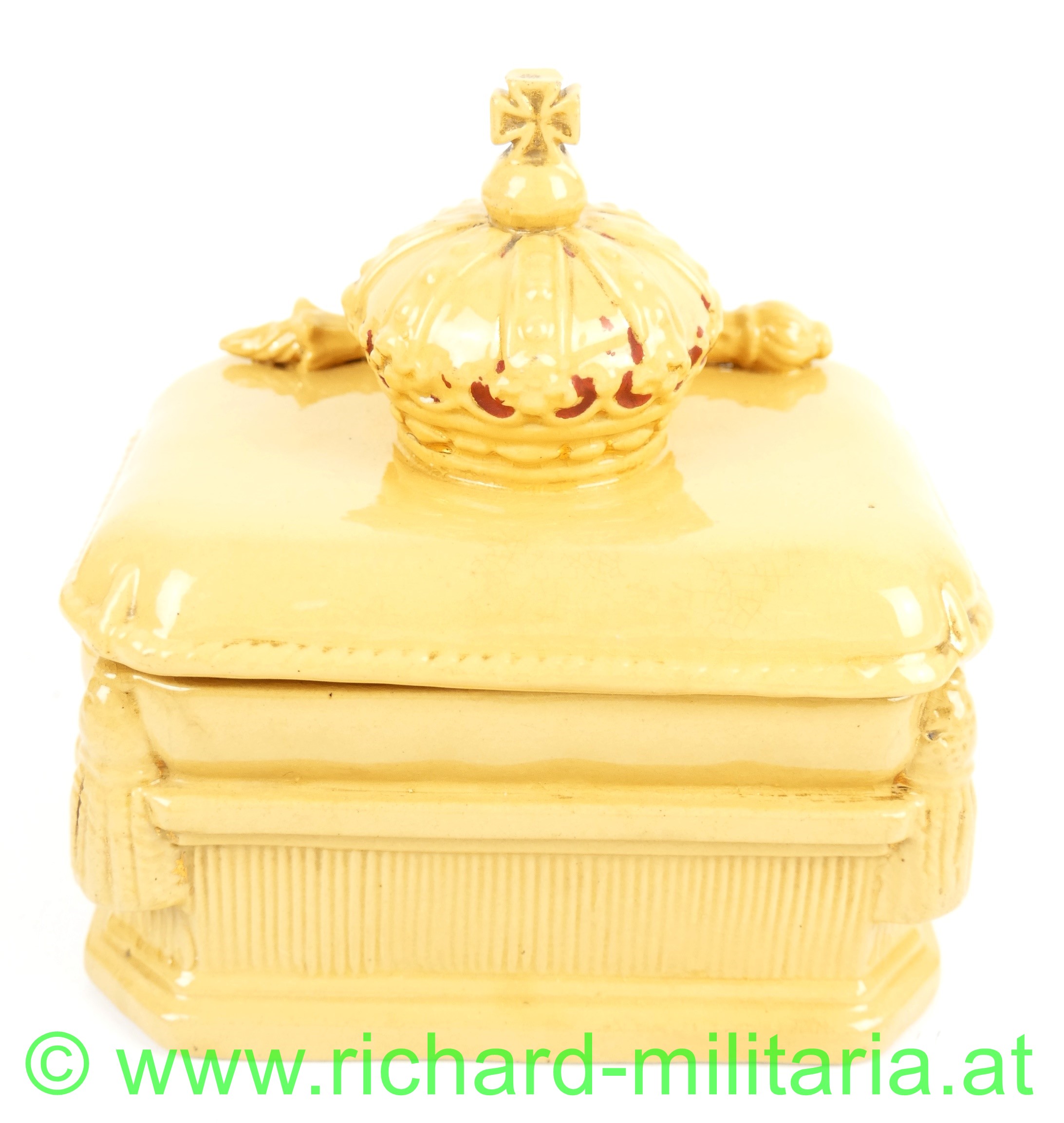 patriotische Porzellan-Dose mit Darstellung der Reichsinsignien - Krone und Zepter - am Deckel, gelblich-beige lasiert, auf der Krone noch Reste einer ehemals roten Färbung erkennbar, Deckel zum Abheben; am Boden Prägekennung "AT 43"; Format des Bodens 12,7 x 9,9 cm