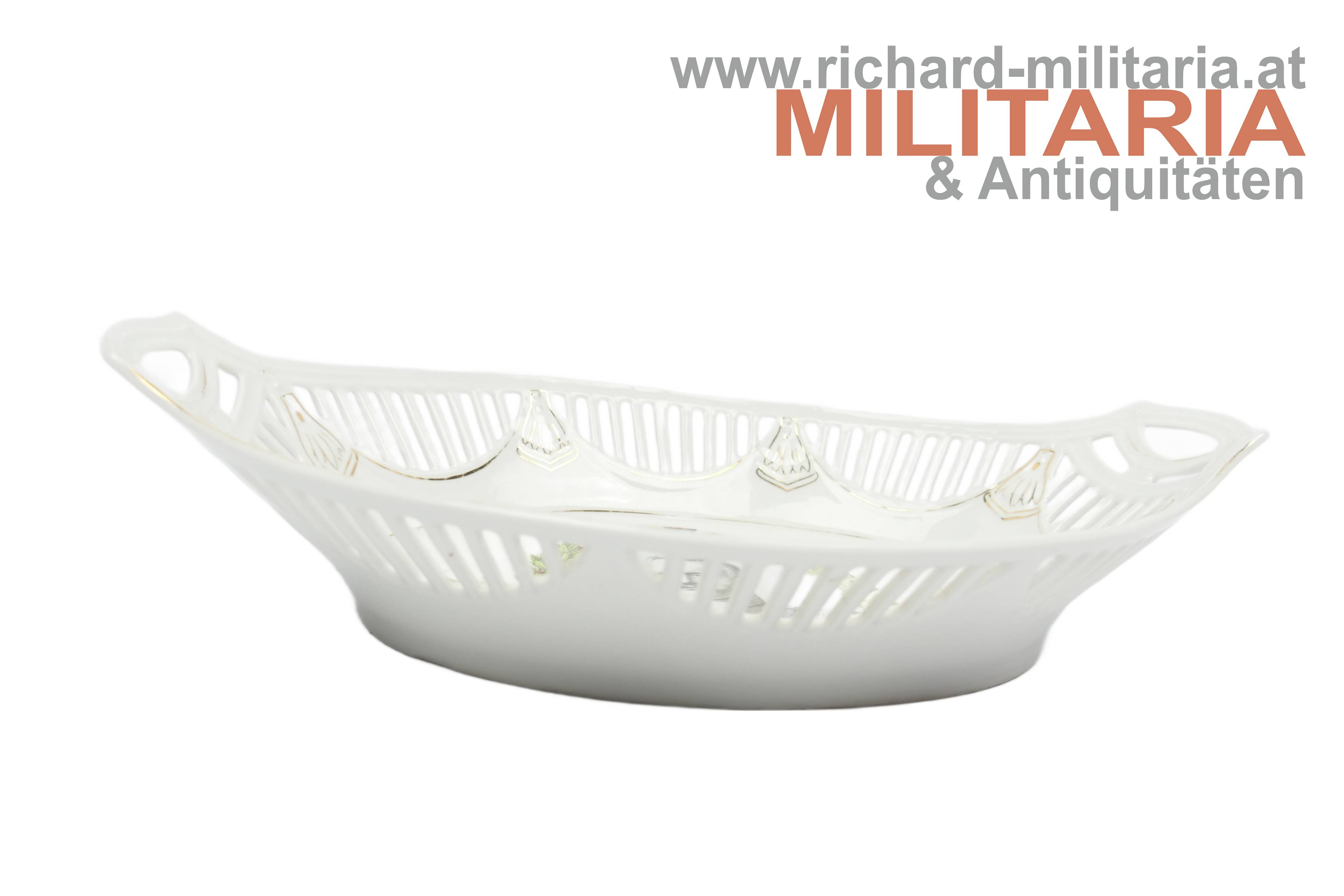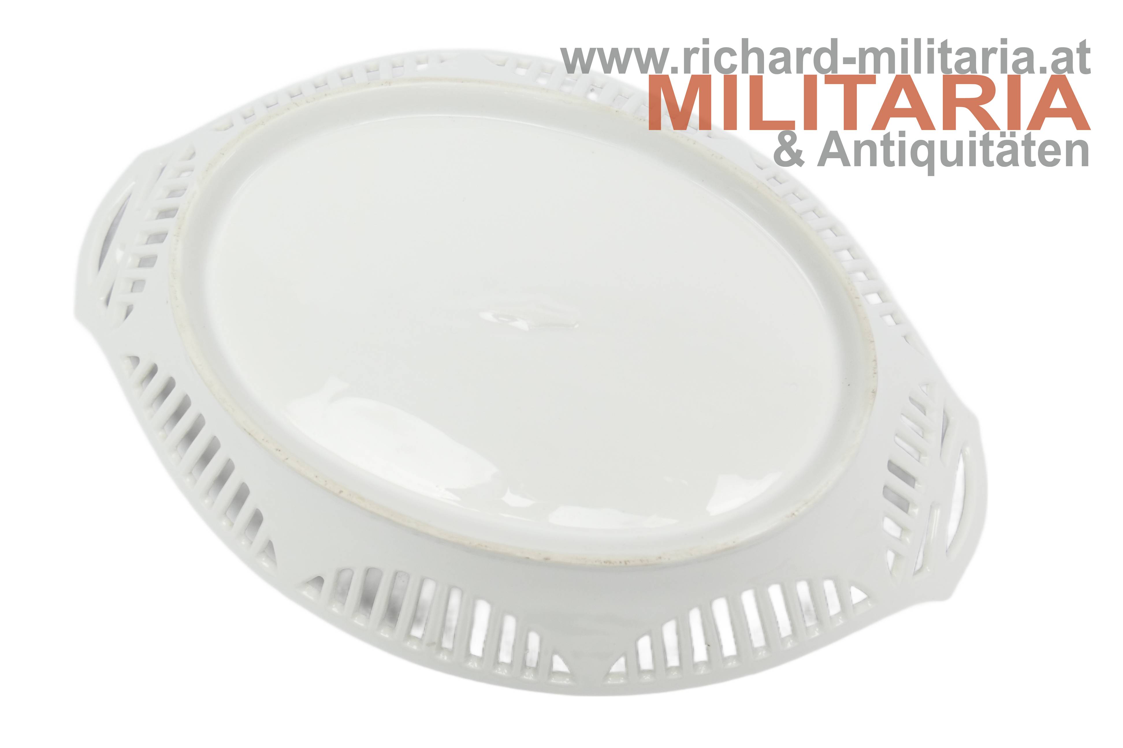 Patriotische Porzellan Schale - Hindenburg, ovale Porzellanschale Abbild von Hindenburg umrankt mit einem Eichenlaubkranz - als Abschluss wird ein Eisernes Kreuz dargestellt, teilweise sind die Ränder mit Gold verziert, Ränder der Schale sind filigran ausgeführt - durchbrochen, ohne Hersteller