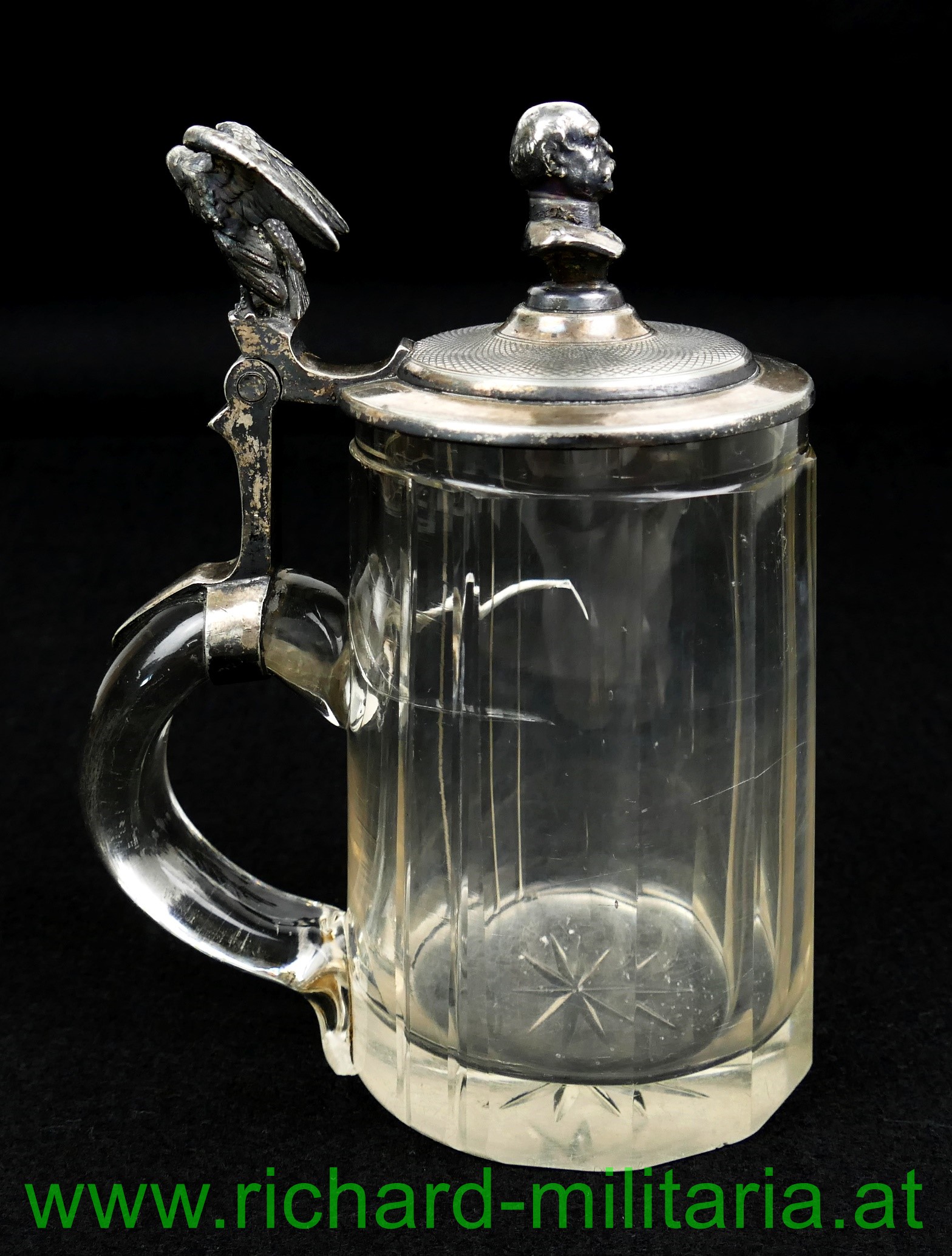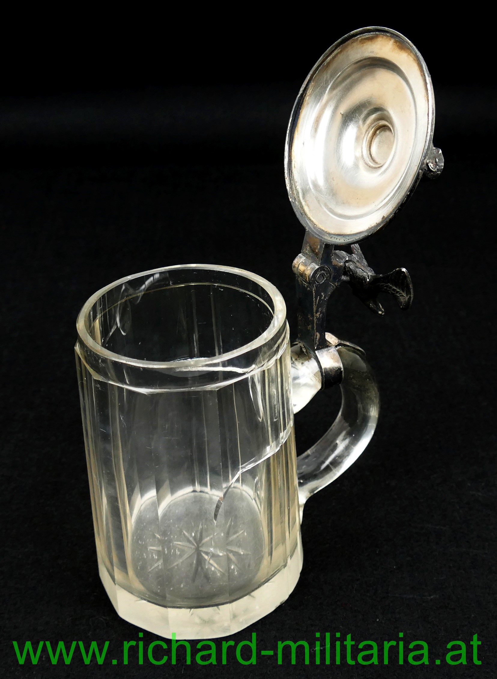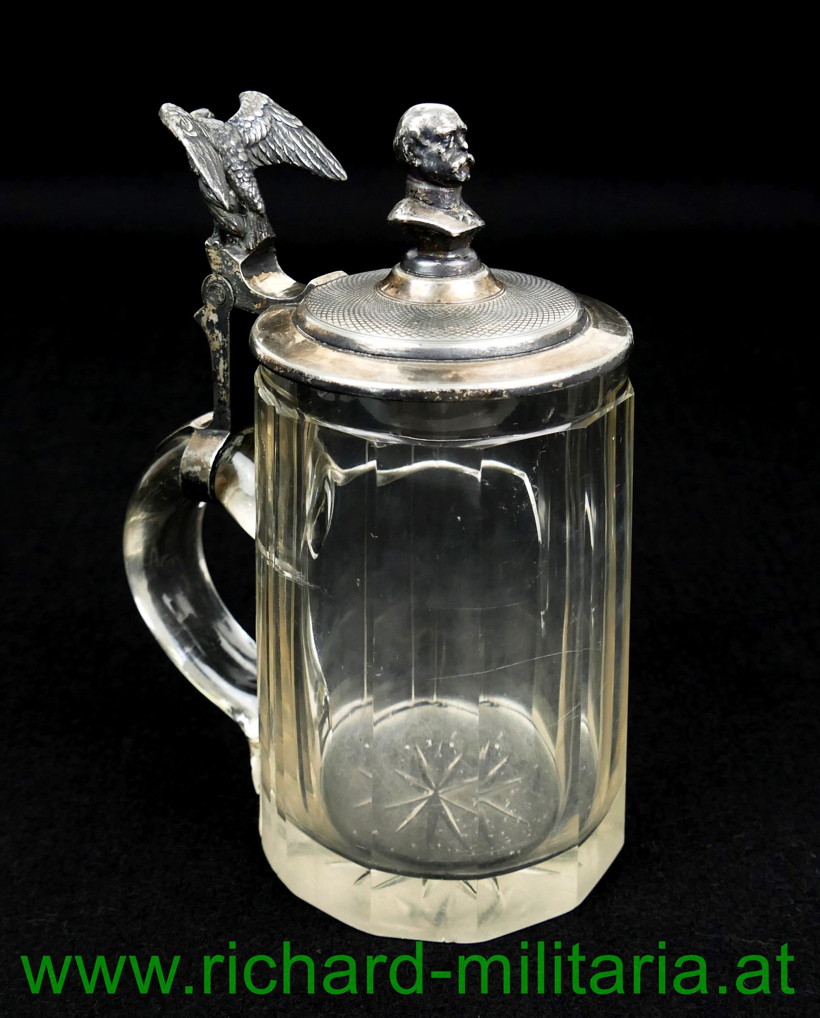 Patriotischer Bierkrug - mit Bismarckdarstellung am Deckel, kantig geschliffener Bierkrug mit Inhaltsmarkierung 0,5 l; wuchtiger Glashenkel, Deckel aus Buntmetall - versilbert - mit Bismarckdarstellung und Reichsadler als "Öffner"; feiner Sprung im Bereich Henkels