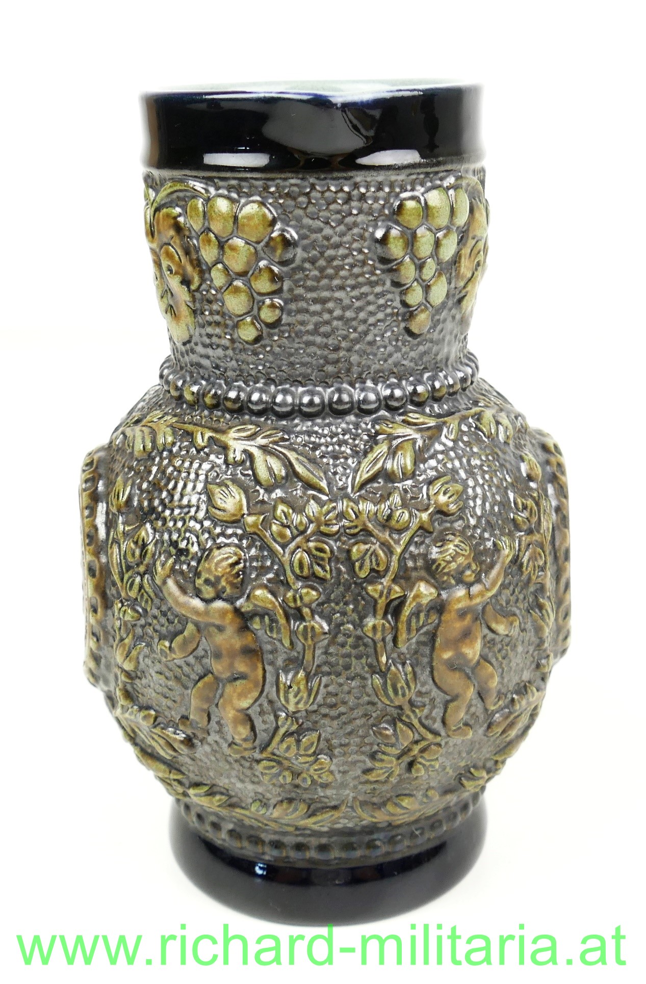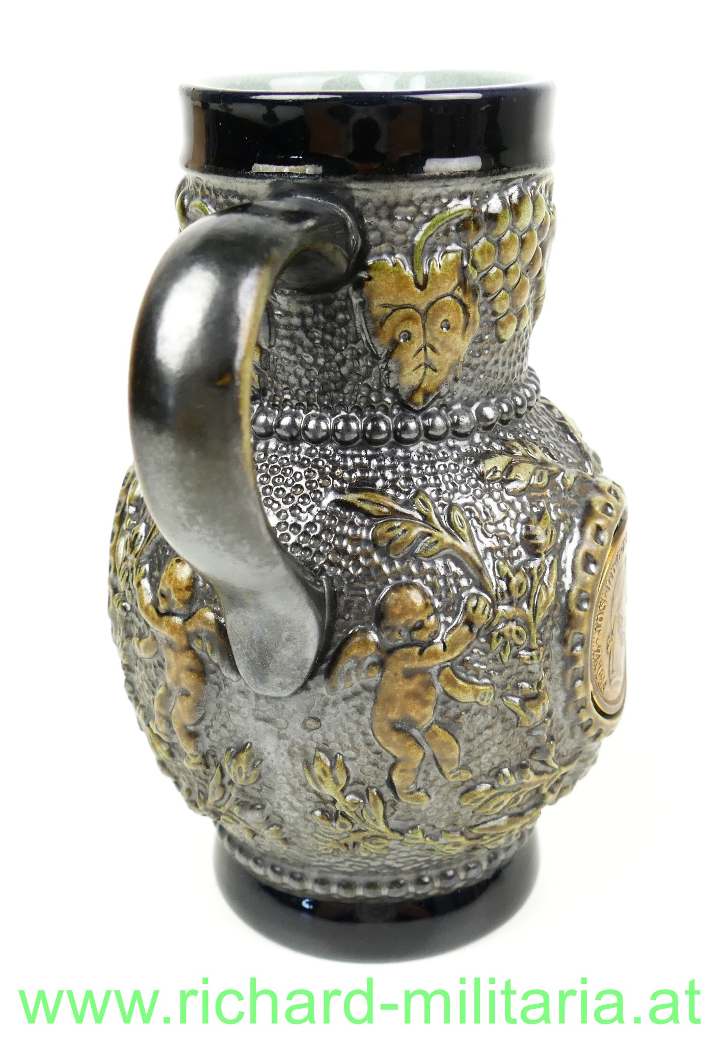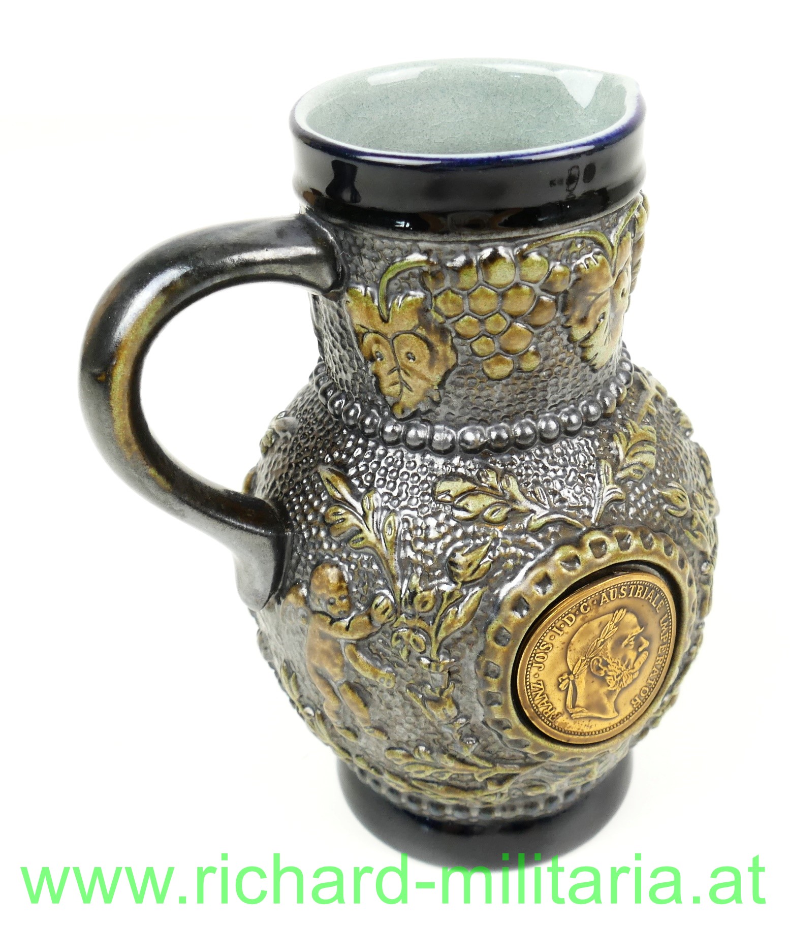 patriotischer Weinkrug, Keramik, innen grau, außen blau und grün glasiert, links u. rechts eingelegte Medaillen mit dem Bildnis von Maria Theresia und Kaiser Franz Josef, Krug ist mit Weinranken und fliegenden Engeln plastisch verziert; am Boden findet sich eine Modellnummer: "2005"; Fassungsvermögen ca. 1/2 l; 1920/30er Jahre