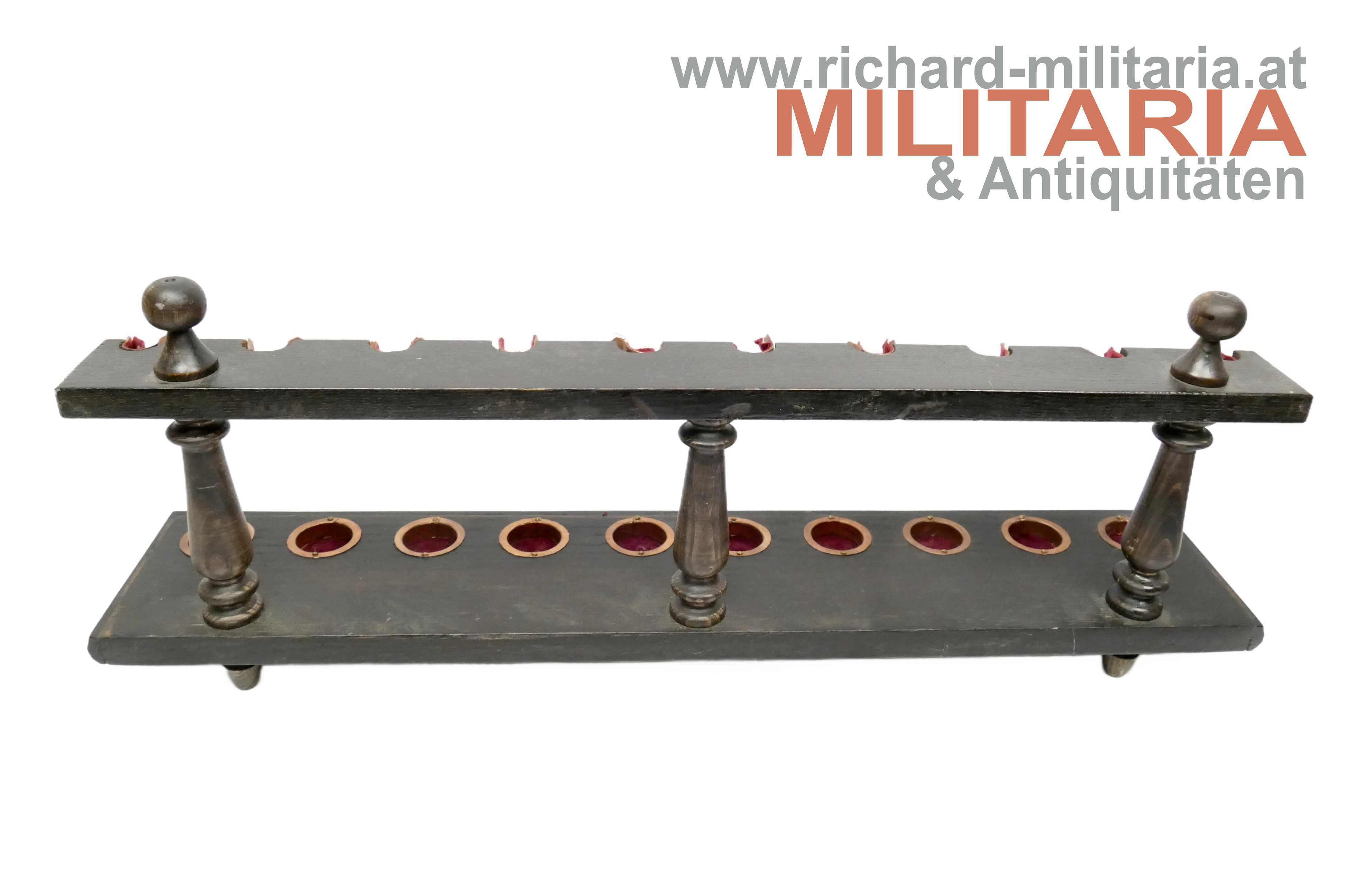 Pfeifenständer für Regimentspfeifen; dunkel eingelassenes Holz; Platz für 10 Pfeifen; in den Mulden biegbare aufgenagelte Messingeinlagen mit roten Stoffbezügen; ein Stoffstück fehlt; leichtere Abnutzungsspuren;