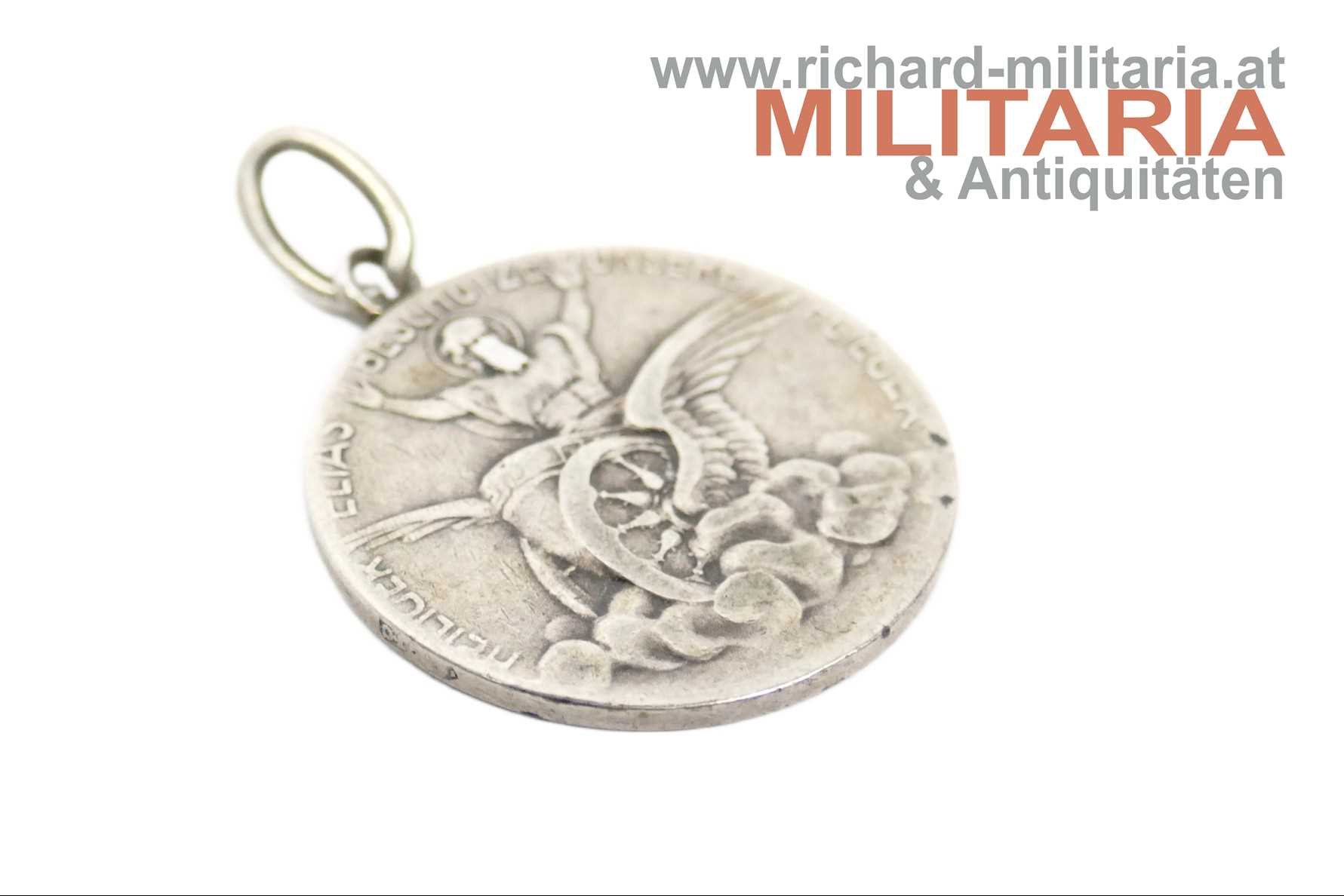 Phönix Flugzeugwerke AG; kleiner Silberanhänger "Zur Erinnerung an das 1000. Flugzeug"; auf der Vorderseite "Flieger-Elias beschütze unsere Flieger" mit dem Schutzgott in beflügelten Streitwagen; RS mit Gravur "Zur Erinnerung an das 1000. Flugzeug" mit Logo und Schriftzug der Phönix Flugzeugwerke AG; Silber mit undeutlicher Randpunzierung.