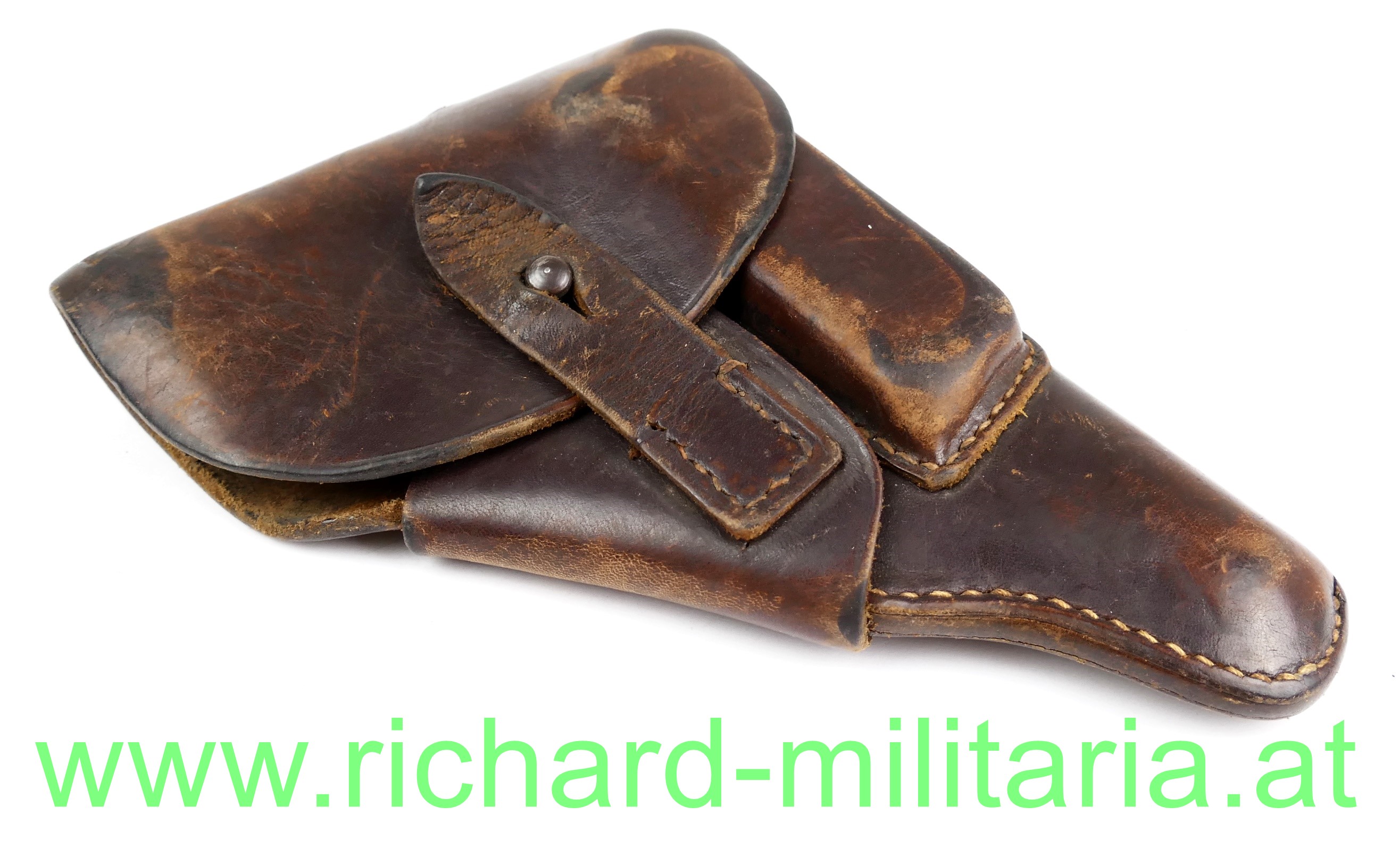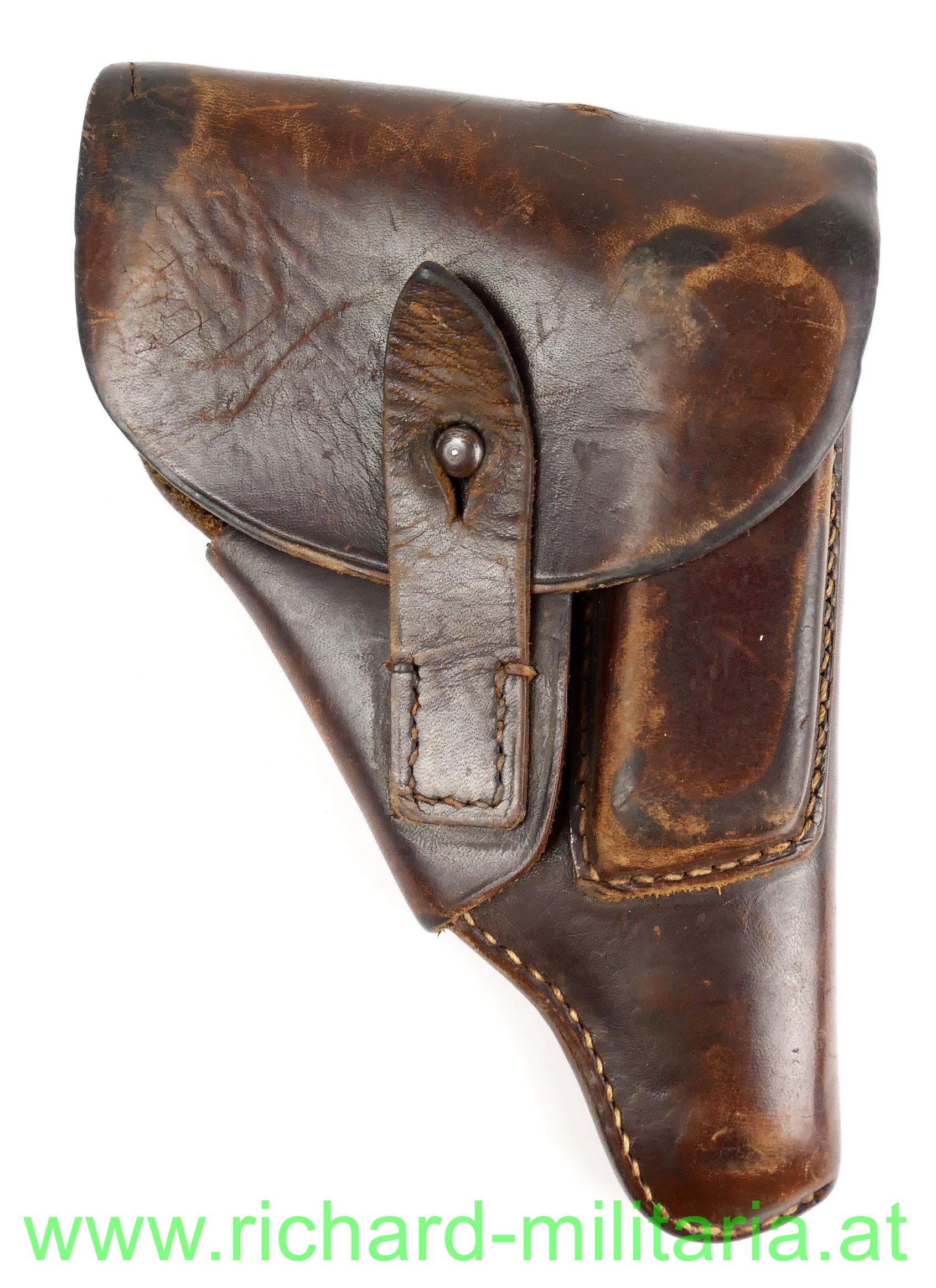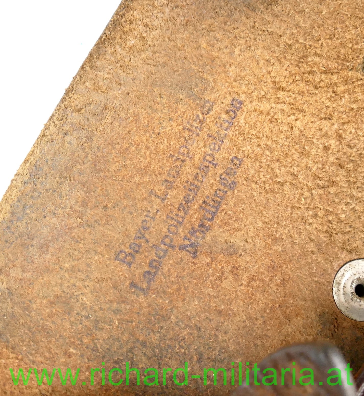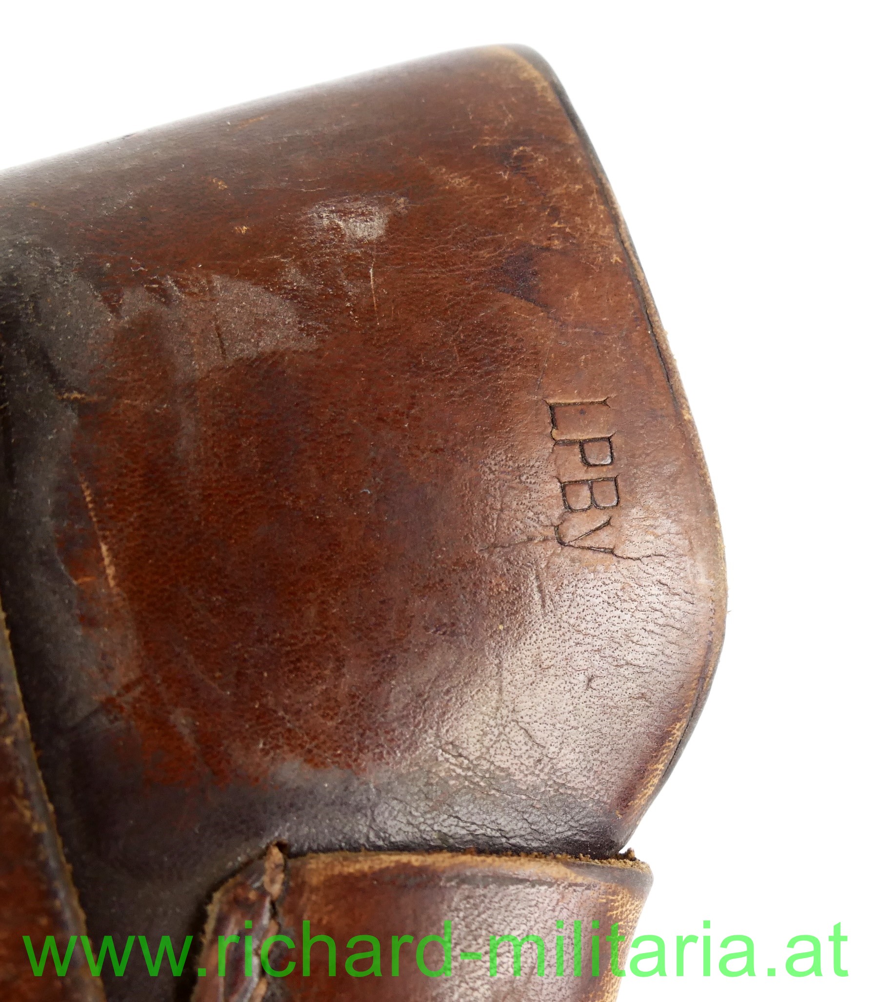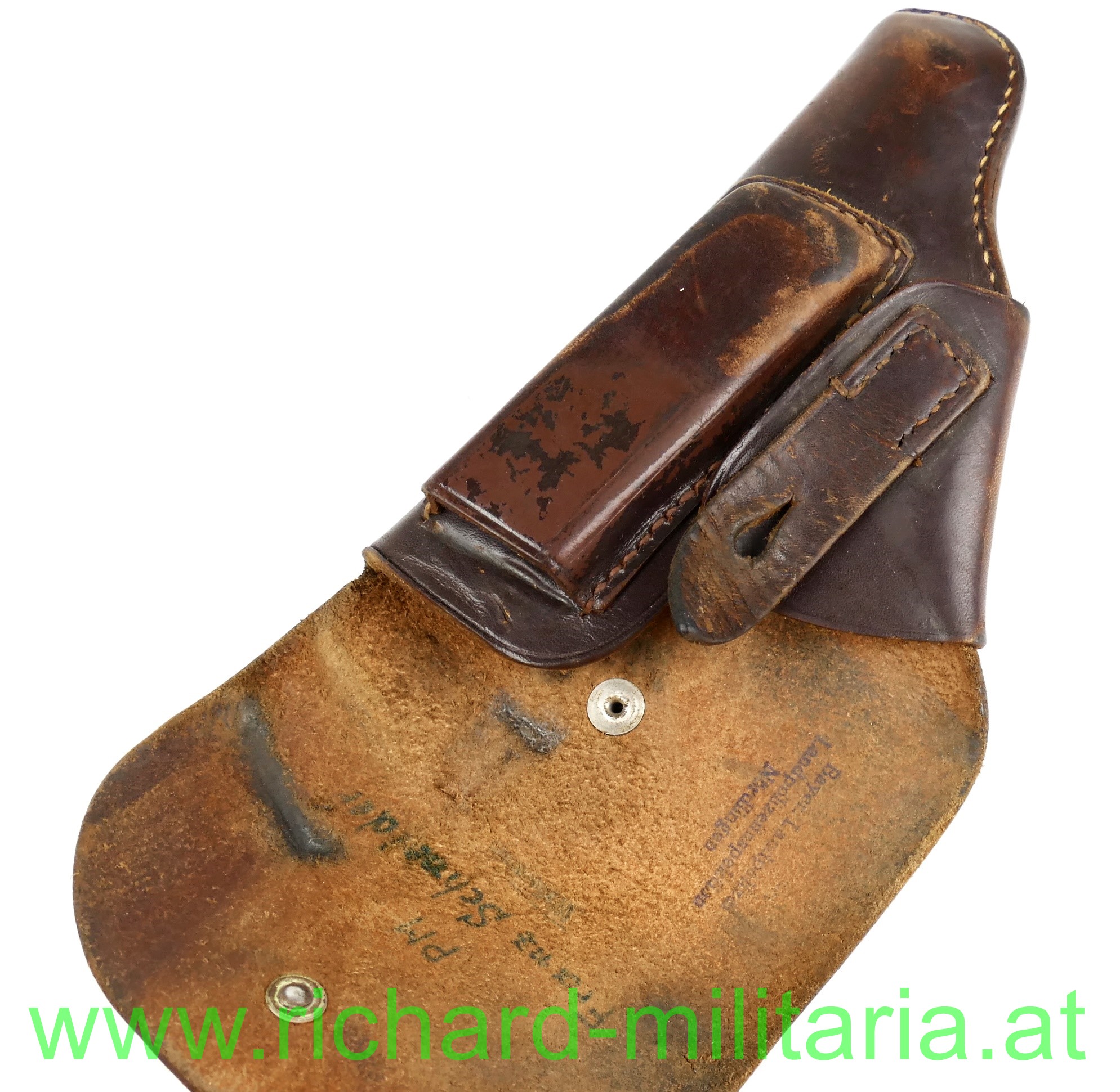 Pistolentasche - Leder f. Pistole Kal. 7,65mm, braunes starkes Leder, alle Nieten und Nähte fest, auf der Innenseite Tintenstempel: "Bayr. Landespolizei Landespolizeiinspektion Nördlingen", Name des Trägers ebenfalls vorhanden, auf der Rückseite Prägestemel: "LBy",