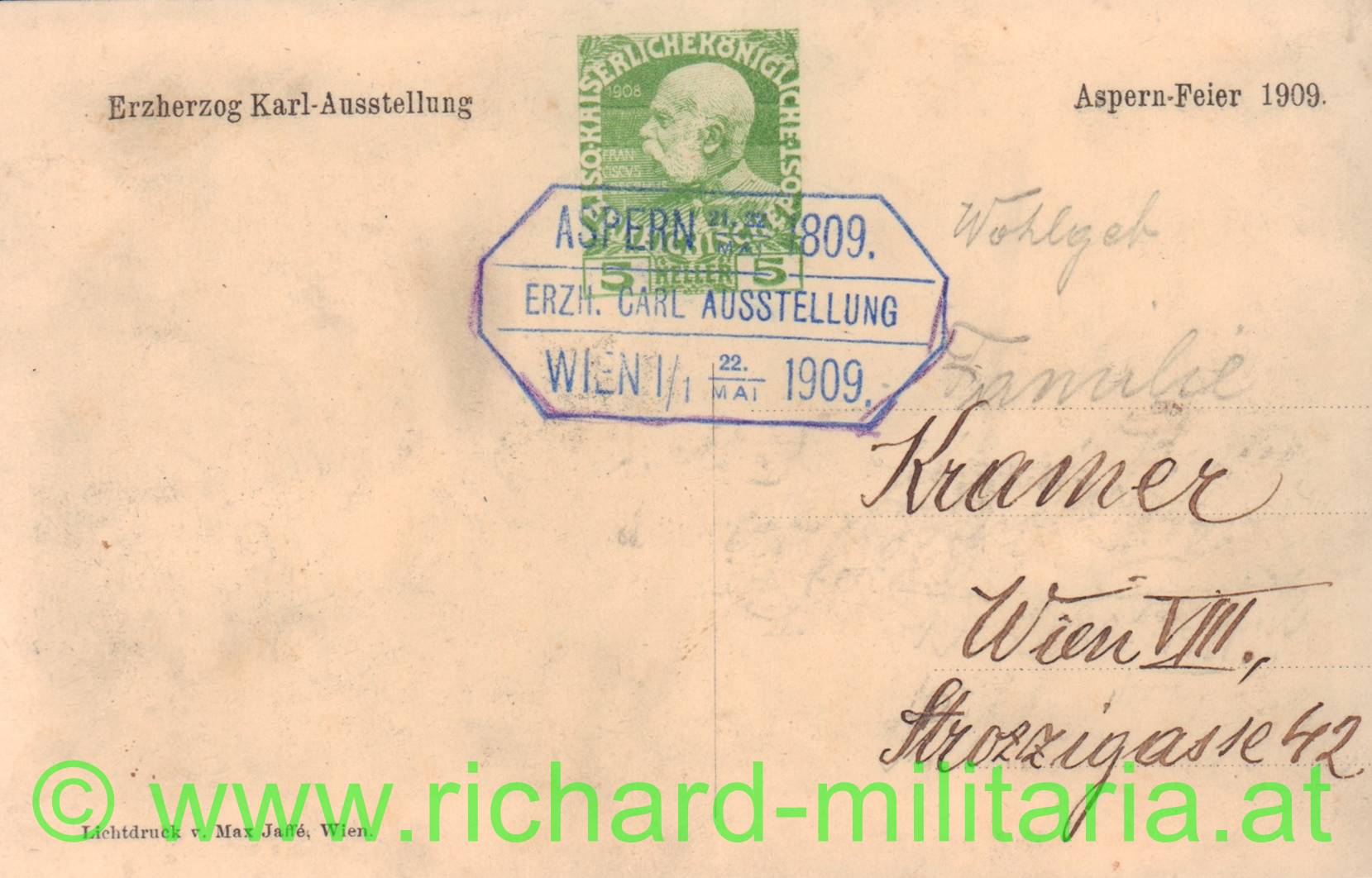 PK Erzherzog Karl in der Schlacht bei Aspern - 100 Jahre, rückseitig Ausstellungsstempel;