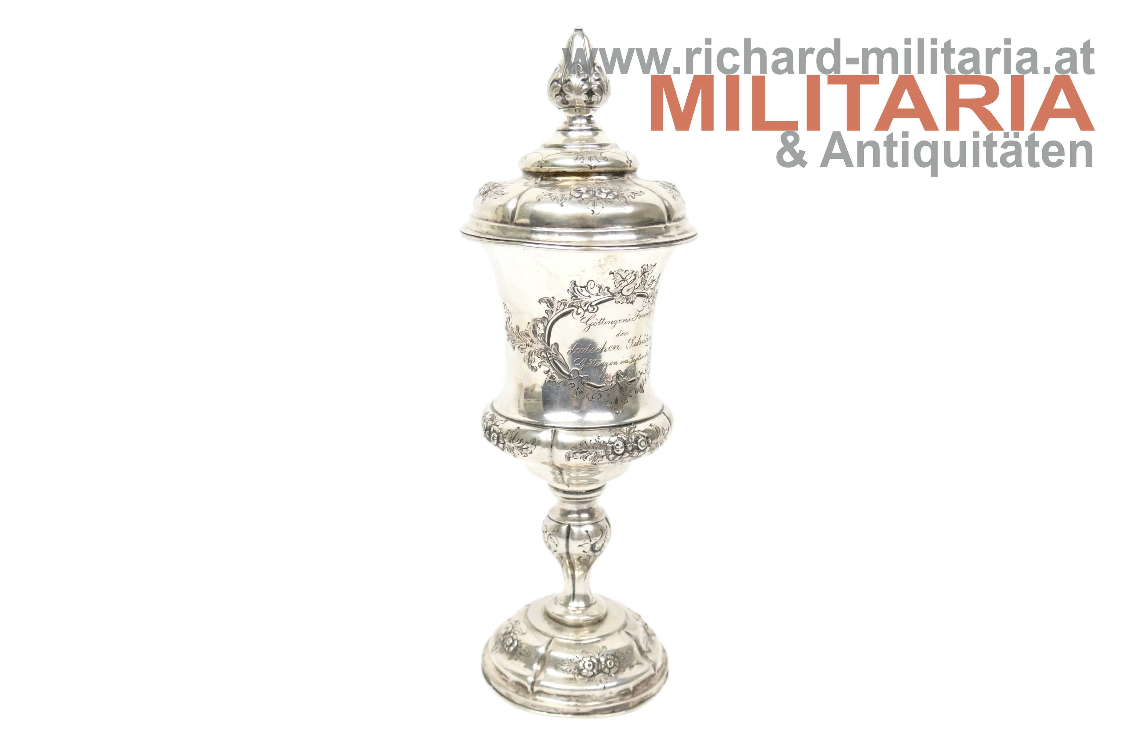 Pokal - "Den deutschen Schützen Göttingen - 1863"; Silber - punziert am Sockel mit "750"; Pokal mit floralen Verzierungen sowie der Aufschrift "Göttingen's Frauen den deutschen Schützen Göttingen im September 1863"; Sockel mit einer Art Wachsausfüllung; sehr dekorativ;