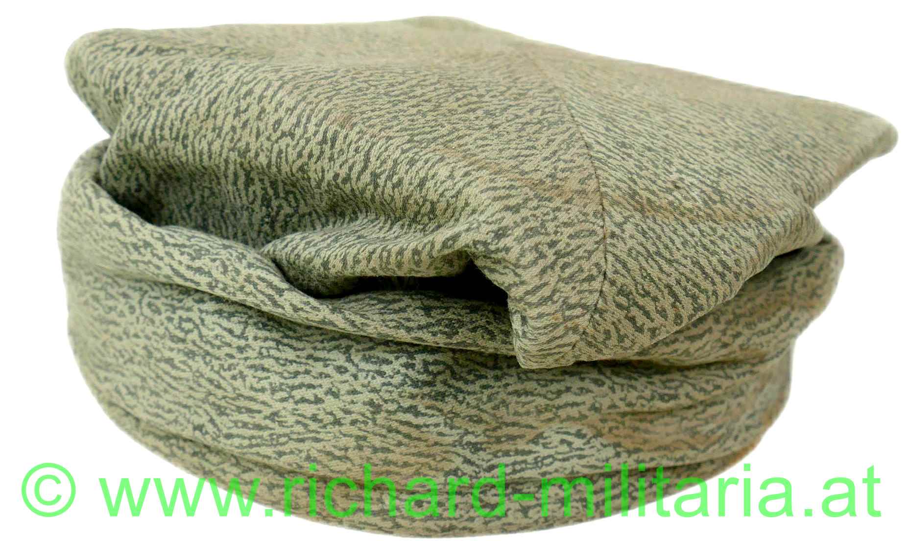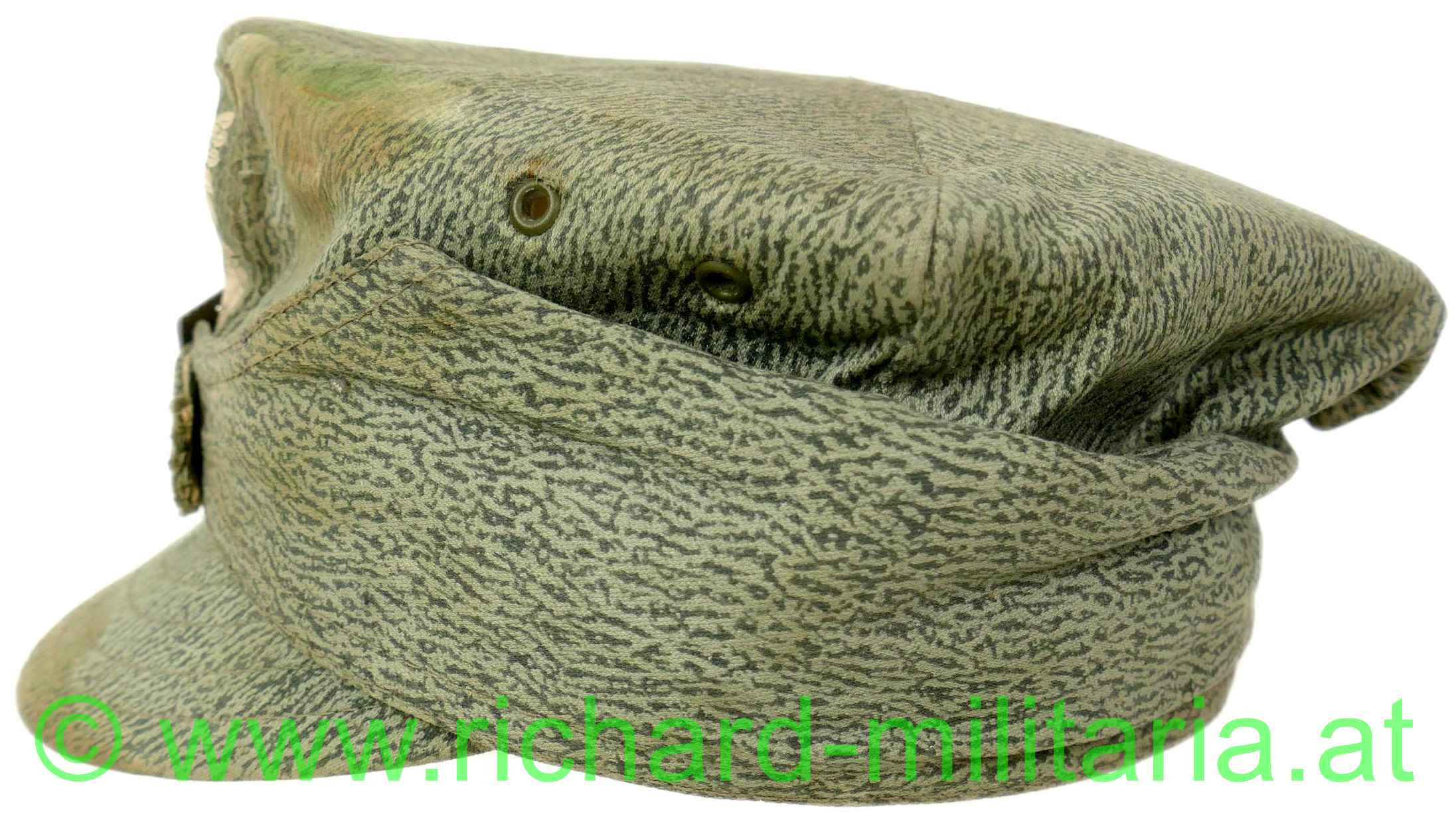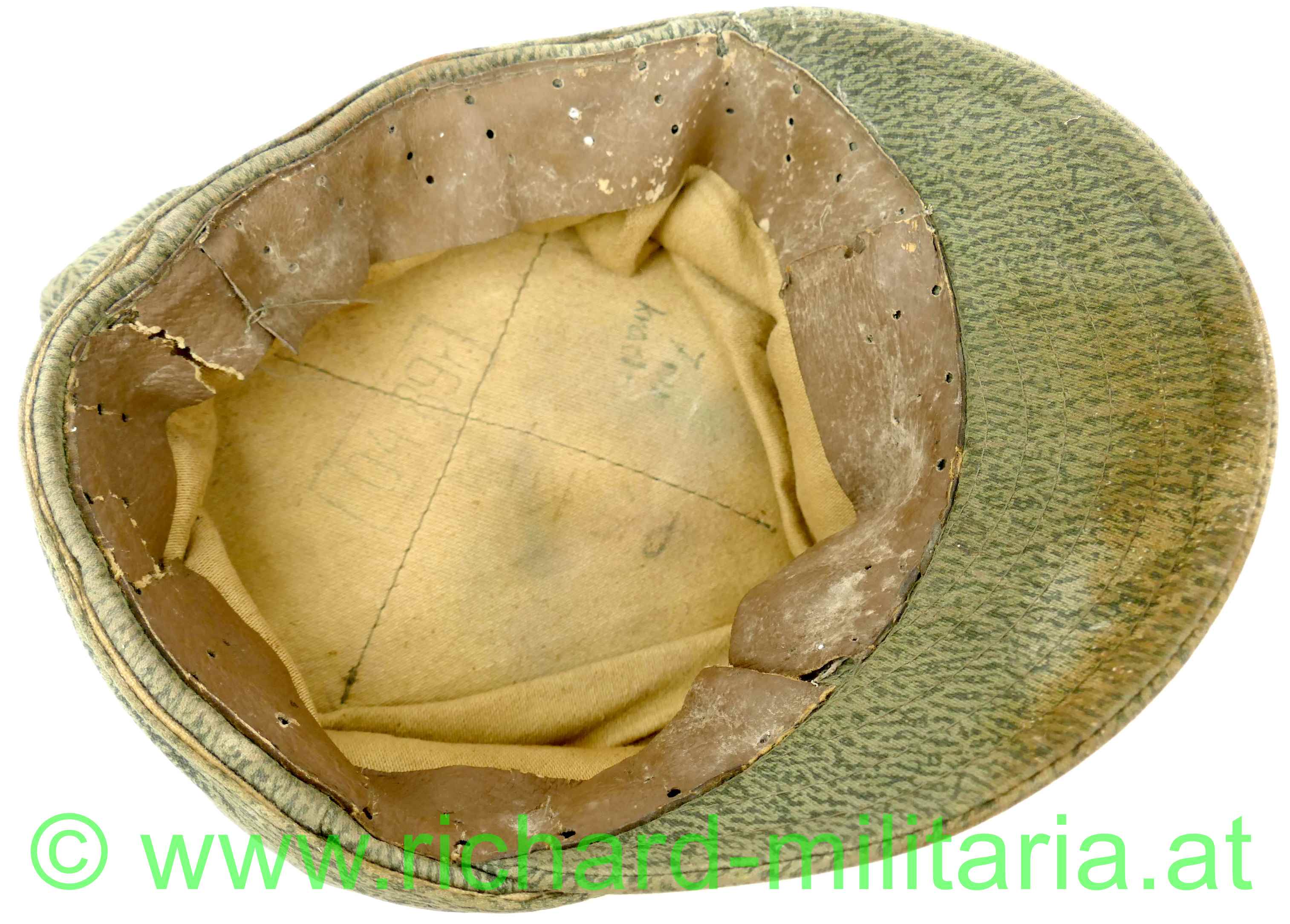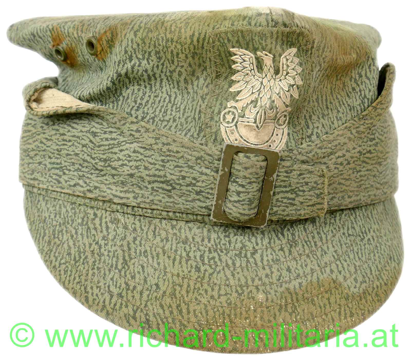 Originale Feldmütze der polnischen Volksarmee; grüne Kappe mit Tarnmuster und aufgenähten polnischen Adler; Kappenschirm teilweise fleckig; Verfärbungen entlang der Oberseite der Kappe; braunes, stark abgenutztes Stirnleder; mehrere unleserliche Stempel auf der Innenseite der Kappe;
